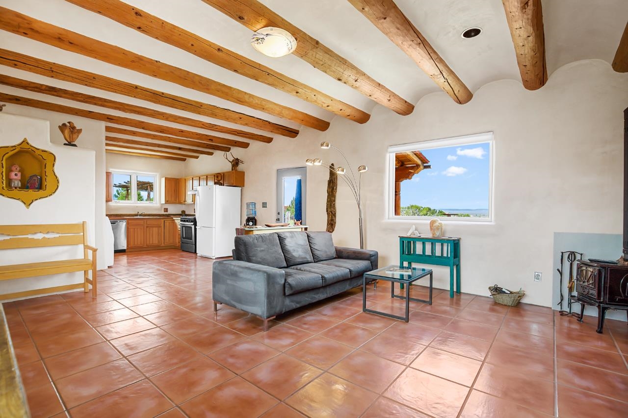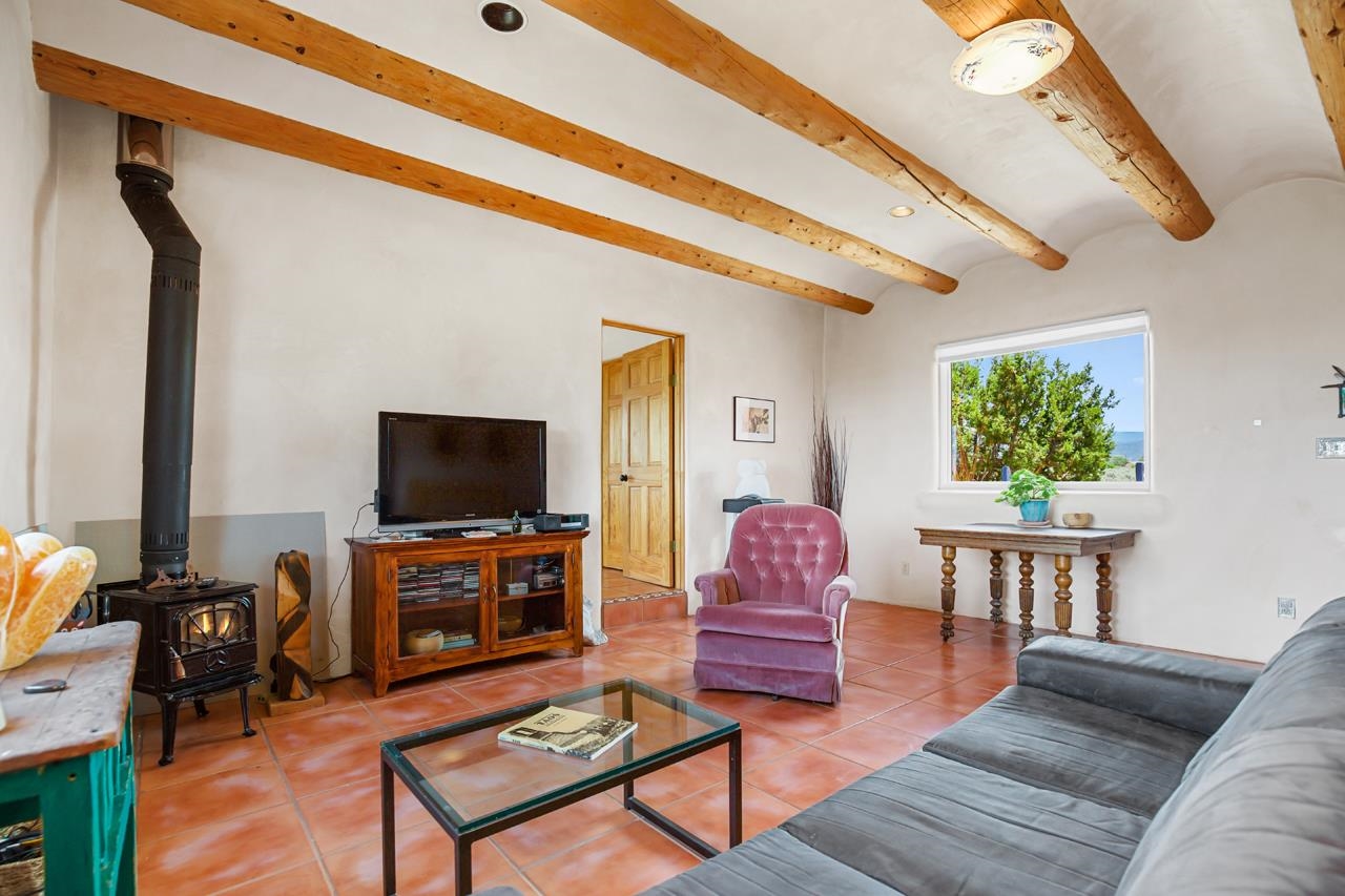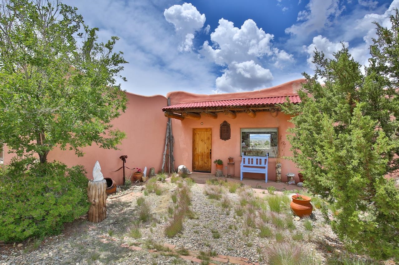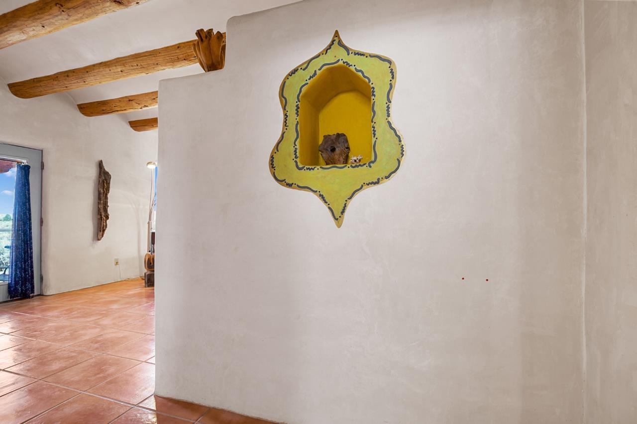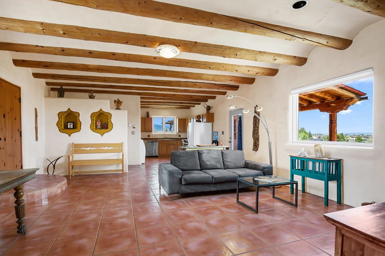 Authentic Adobe - Experience the charm and craftsmanship of true adobe construction in this thoughtfully designed 1,256 sq ft 2BR/2BA home on 1.145 acres in the desirable Vista Linda subdivision. Crafted with timeless Southwestern details, this home features coved viga ceilings, nichos, hand-painted accents, diamond finish plaster walls, and warm ceramic tile flooring throughout. The open-concept layout offers a spacious feel, enhanced by abundant natural light and a smart split-bedroom floor plan for added privacy. The talavera-tiled kitchen and bathrooms bring vibrant character and color, while modern comforts like in-floor radiant heating, an on-demand boiler, and a radon abatement system ensure year-round efficiency and peace of mind. A cozy woodstove adds warmth and ambiance during cooler months. Outdoors, soak in panoramic mountain views in every direction and enjoy breathtaking sunsets from your west-facing patio and portal--perfect for evening relaxation, dining outside, or entertaining under the expansive New Mexico sky. Mature landscaping with lilacs and aspens. Located near the end of a quiet dead-end road in nice subdivision with reasonable CC&R's and buried utilities. Detached 1-car carport and easy access to hiking, golf, and the vibrant Taos arts scene, this is traditional adobe living at its finest.