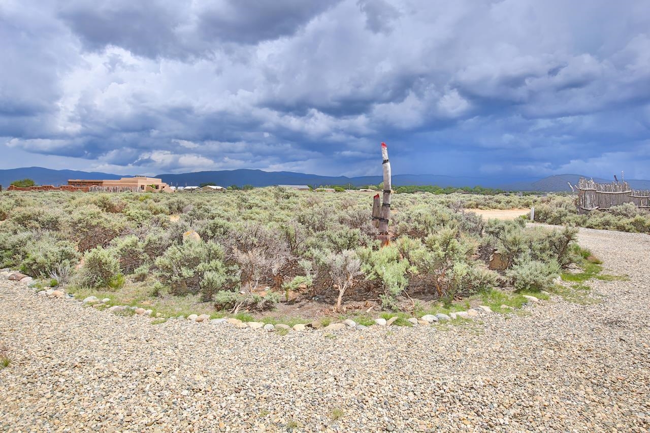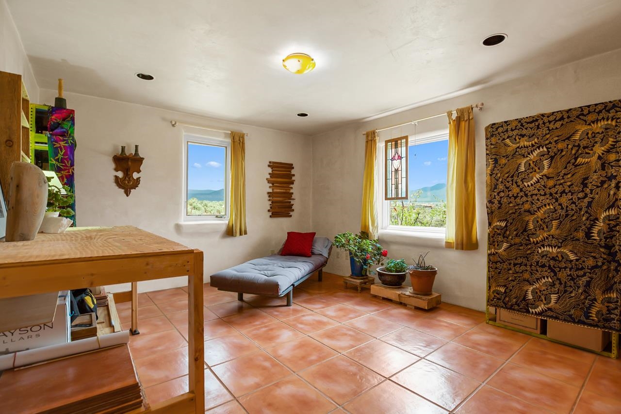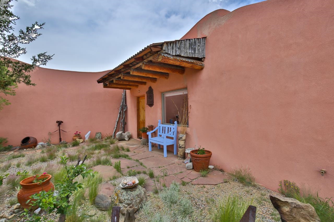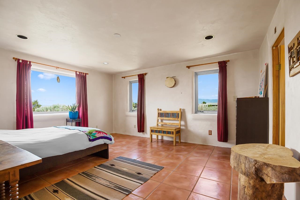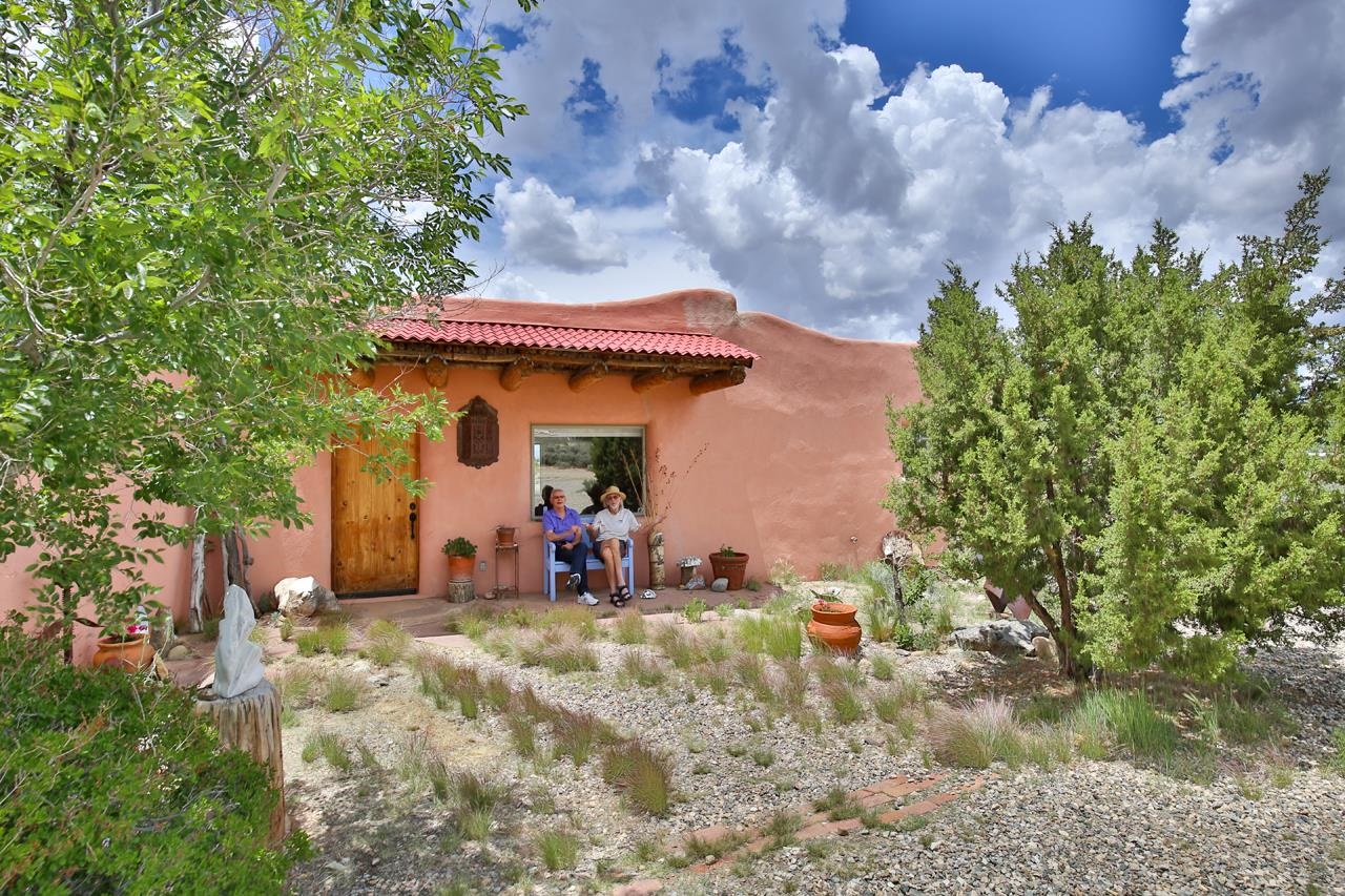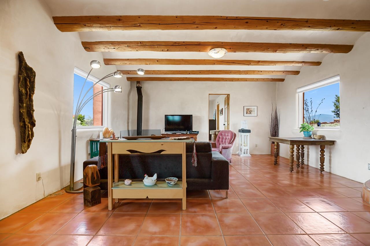 Authentic Adobe - Experience the charm and craftsmanship of true adobe construction in this thoughtfully designed 1,256 sq ft 2BR/2BA home on 1.145 acres in the desirable Vista Linda subdivision. Crafted with timeless Southwestern details, this home features coved viga ceilings, nichos, hand-painted accents, diamond finish plaster walls, and warm ceramic tile flooring throughout. The open-concept layout offers a spacious feel, enhanced by abundant natural light and a smart split-bedroom floor plan for added privacy. The talavera-tiled kitchen and bathrooms bring vibrant character and color, while modern comforts like in-floor radiant heating, an on-demand boiler, and a radon abatement system ensure year-round efficiency and peace of mind. A cozy woodstove adds warmth and ambiance during cooler months. Outdoors, soak in panoramic mountain views in every direction and enjoy breathtaking sunsets from your west-facing patio and portal--perfect for evening relaxation, dining outside, or entertaining under the expansive New Mexico sky. Mature landscaping with lilacs and aspens. Located near the end of a quiet dead-end road in nice subdivision with reasonable CC&R's and buried utilities. Detached 1-car carport and easy access to hiking, golf, and the vibrant Taos arts scene, this is traditional adobe living at its finest.