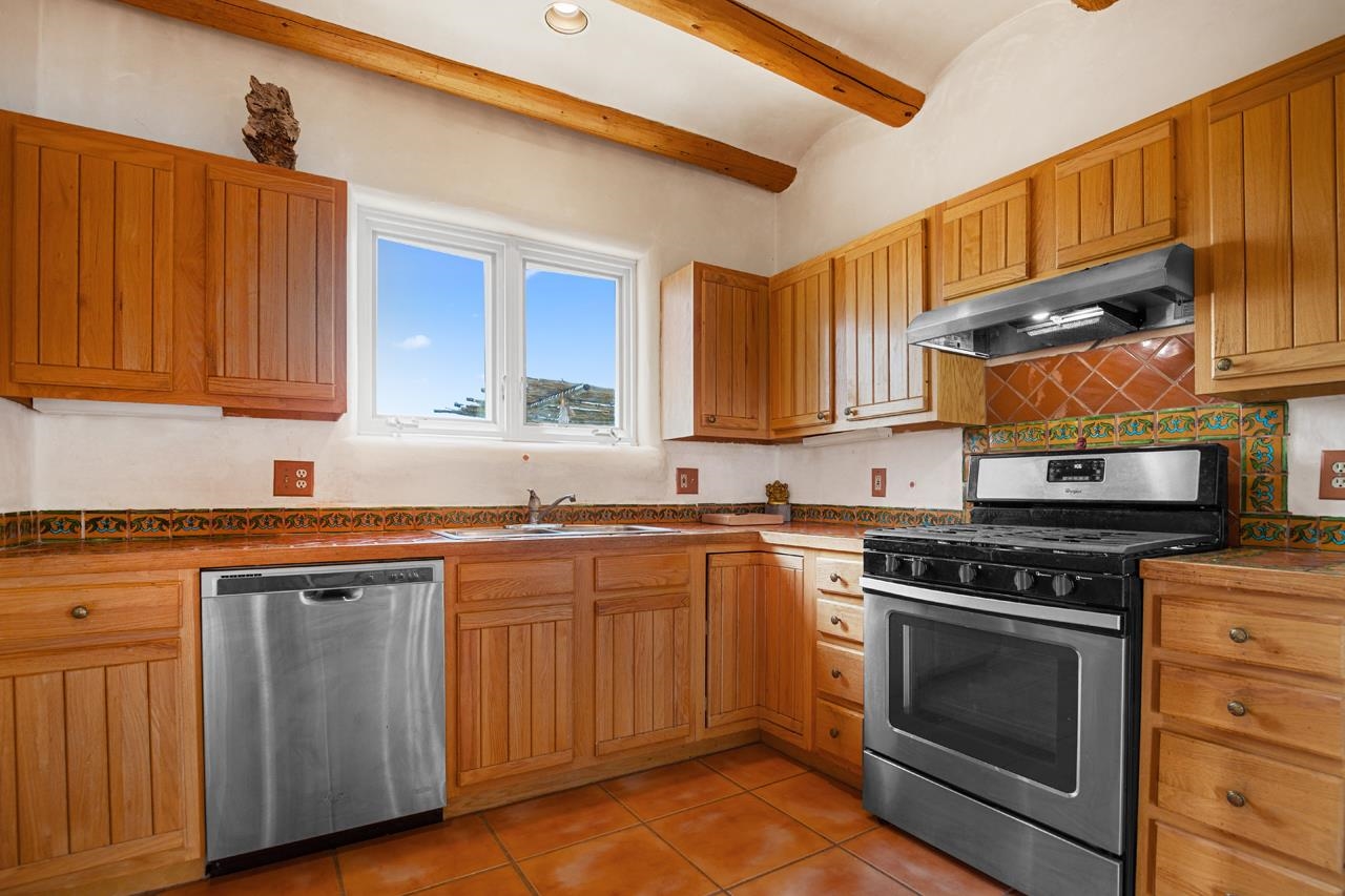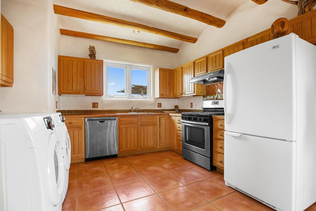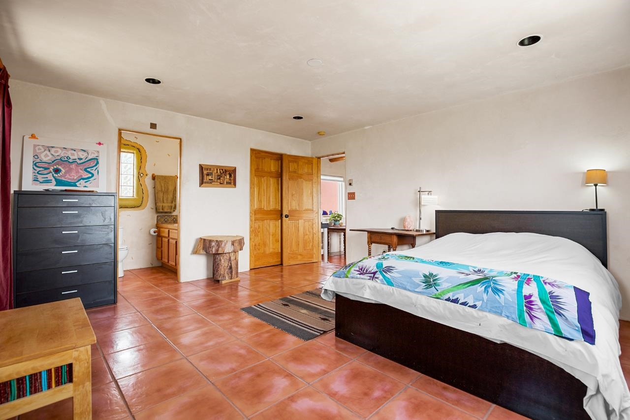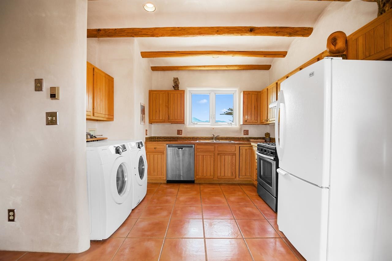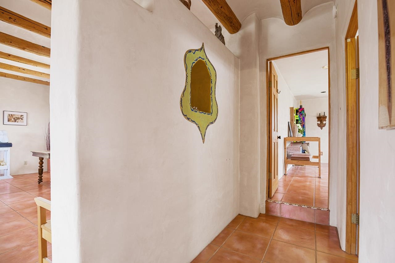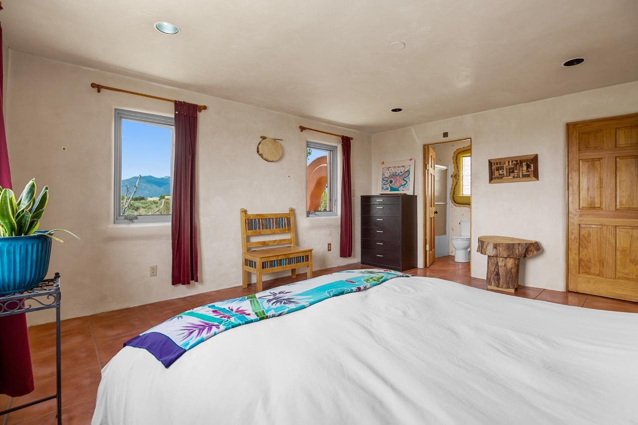 Authentic Adobe - Experience the charm and craftsmanship of true adobe construction in this thoughtfully designed 1,256 sq ft 2BR/2BA home on 1.145 acres in the desirable Vista Linda subdivision. Crafted with timeless Southwestern details, this home features coved viga ceilings, nichos, hand-painted accents, diamond finish plaster walls, and warm ceramic tile flooring throughout. The open-concept layout offers a spacious feel, enhanced by abundant natural light and a smart split-bedroom floor plan for added privacy. The talavera-tiled kitchen and bathrooms bring vibrant character and color, while modern comforts like in-floor radiant heating, an on-demand boiler, and a radon abatement system ensure year-round efficiency and peace of mind. A cozy woodstove adds warmth and ambiance during cooler months. Outdoors, soak in panoramic mountain views in every direction and enjoy breathtaking sunsets from your west-facing patio and portal--perfect for evening relaxation, dining outside, or entertaining under the expansive New Mexico sky. Mature landscaping with lilacs and aspens. Located near the end of a quiet dead-end road in nice subdivision with reasonable CC&R's and buried utilities. Detached 1-car carport and easy access to hiking, golf, and the vibrant Taos arts scene, this is traditional adobe living at its finest.