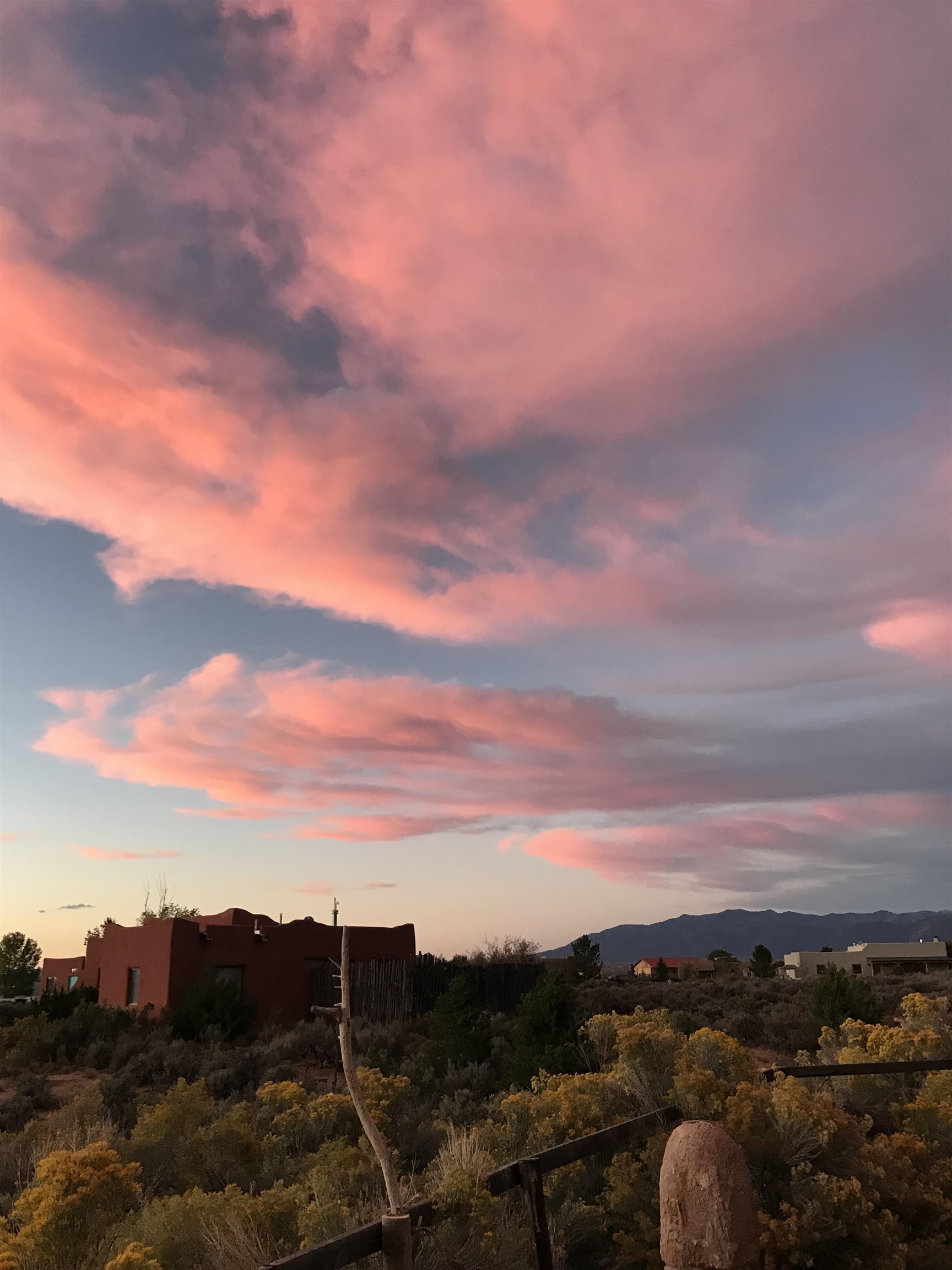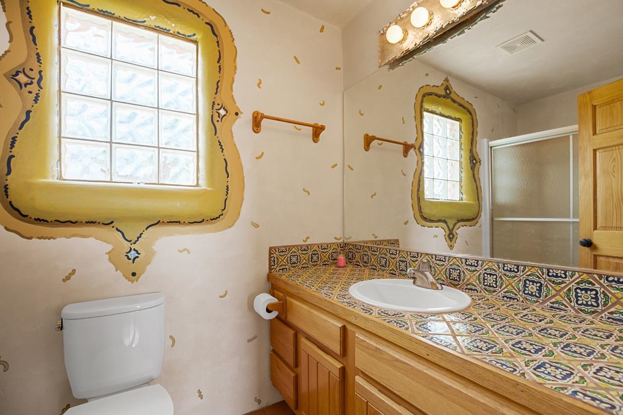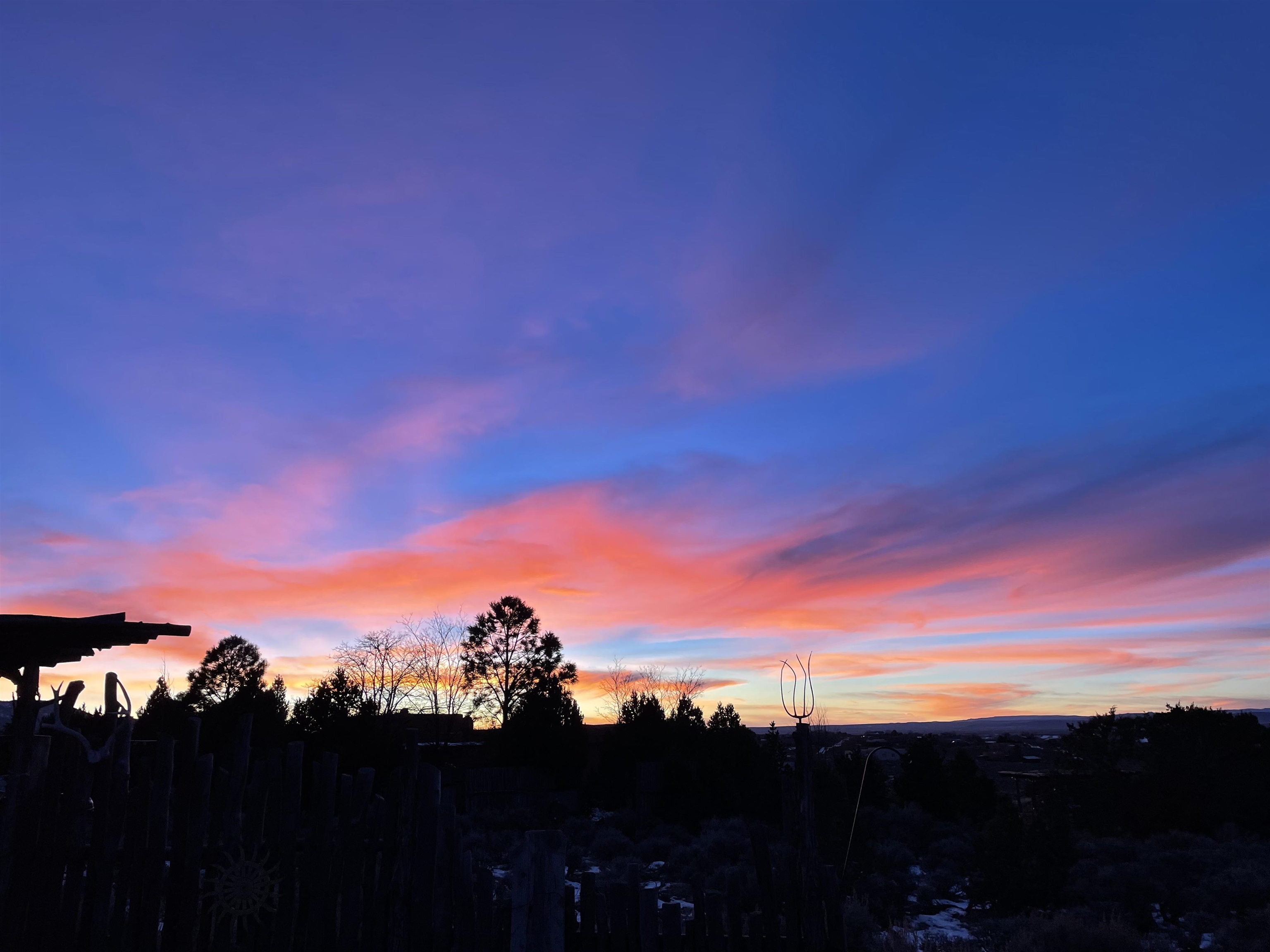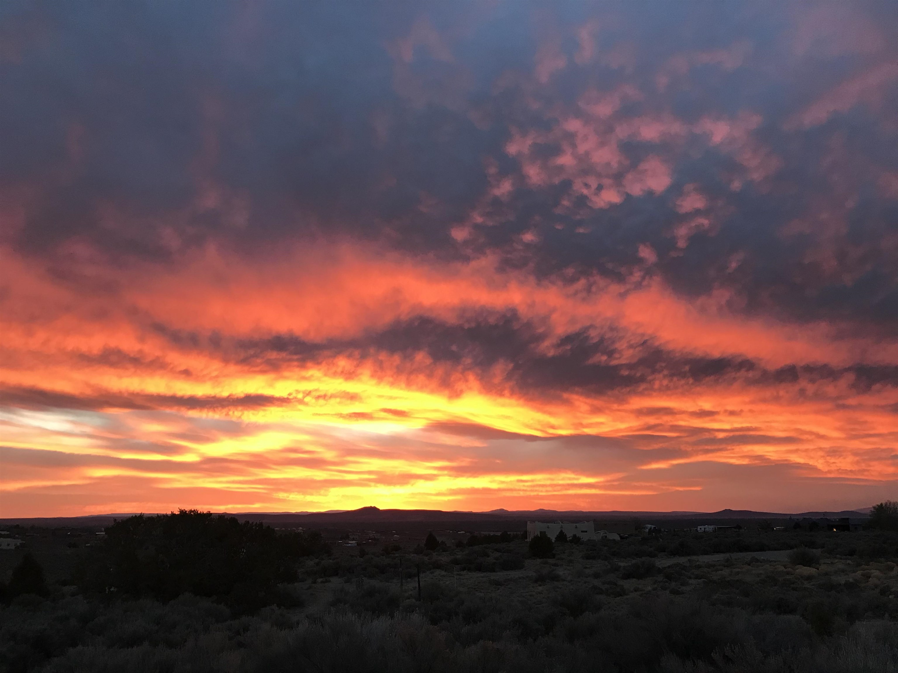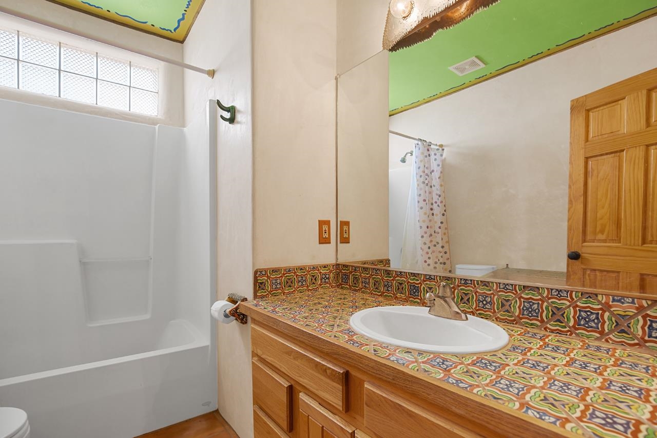 Authentic Adobe - Experience the charm and craftsmanship of true adobe construction in this thoughtfully designed 1,256 sq ft 2BR/2BA home on 1.145 acres in the desirable Vista Linda subdivision. Crafted with timeless Southwestern details, this home features coved viga ceilings, nichos, hand-painted accents, diamond finish plaster walls, and warm ceramic tile flooring throughout. The open-concept layout offers a spacious feel, enhanced by abundant natural light and a smart split-bedroom floor plan for added privacy. The talavera-tiled kitchen and bathrooms bring vibrant character and color, while modern comforts like in-floor radiant heating, an on-demand boiler, and a radon abatement system ensure year-round efficiency and peace of mind. A cozy woodstove adds warmth and ambiance during cooler months. Outdoors, soak in panoramic mountain views in every direction and enjoy breathtaking sunsets from your west-facing patio and portal--perfect for evening relaxation, dining outside, or entertaining under the expansive New Mexico sky. Mature landscaping with lilacs and aspens. Located near the end of a quiet dead-end road in nice subdivision with reasonable CC&R's and buried utilities. Detached 1-car carport and easy access to hiking, golf, and the vibrant Taos arts scene, this is traditional adobe living at its finest.