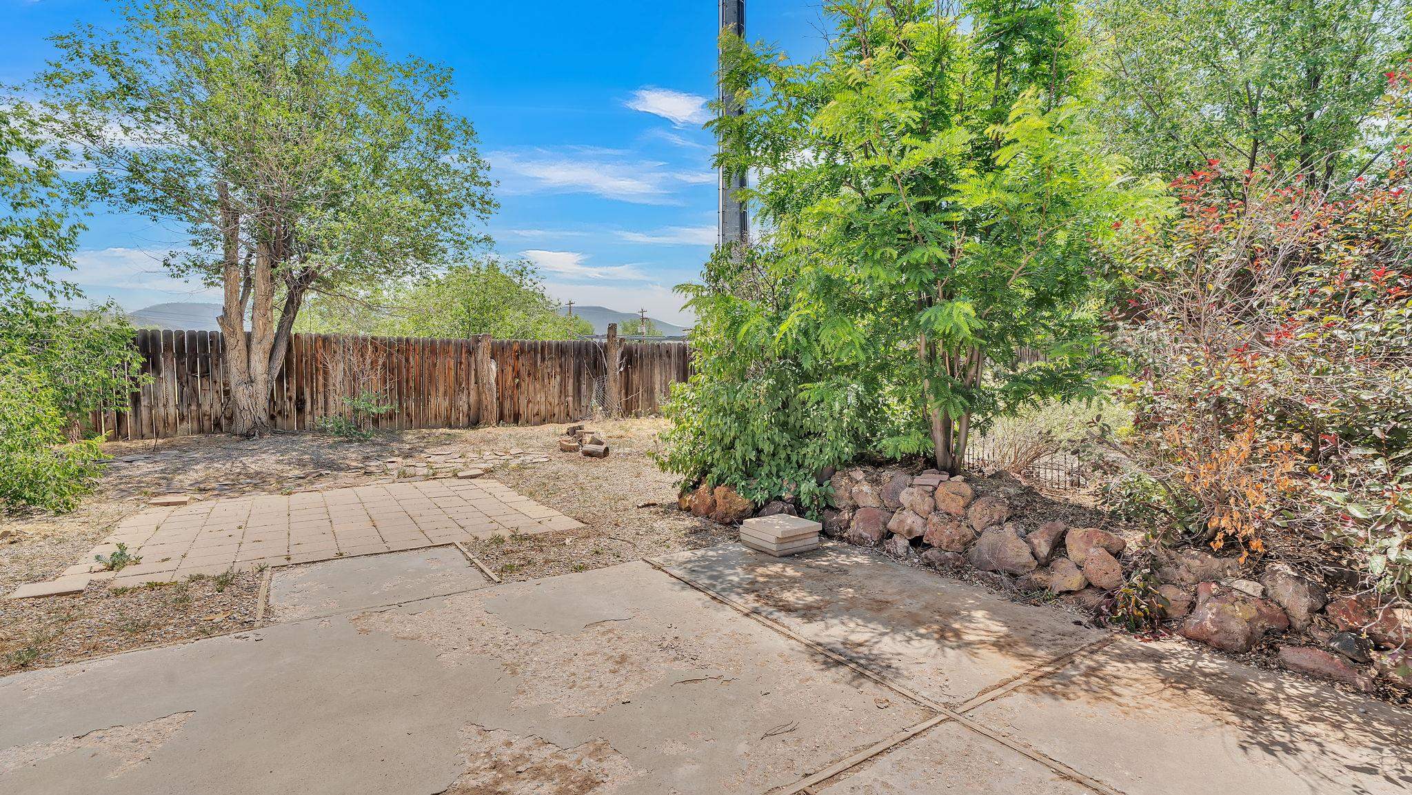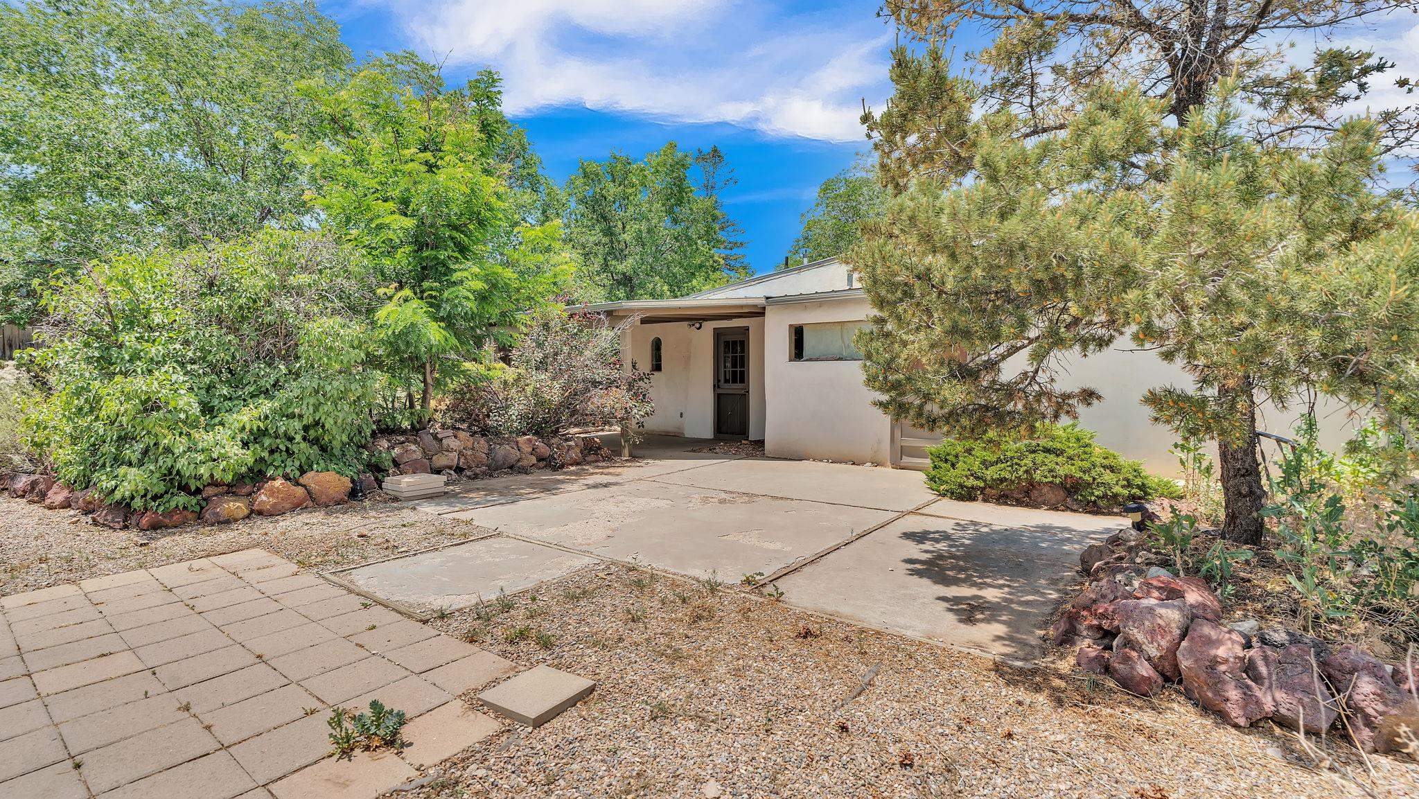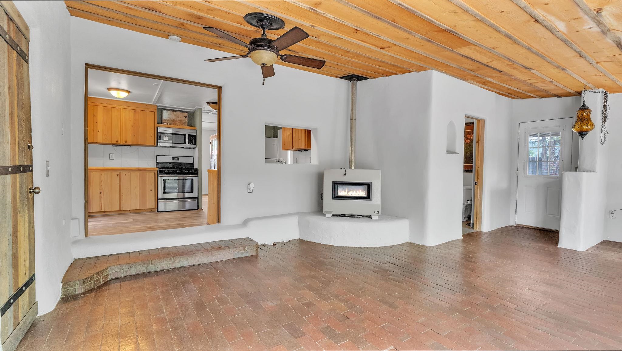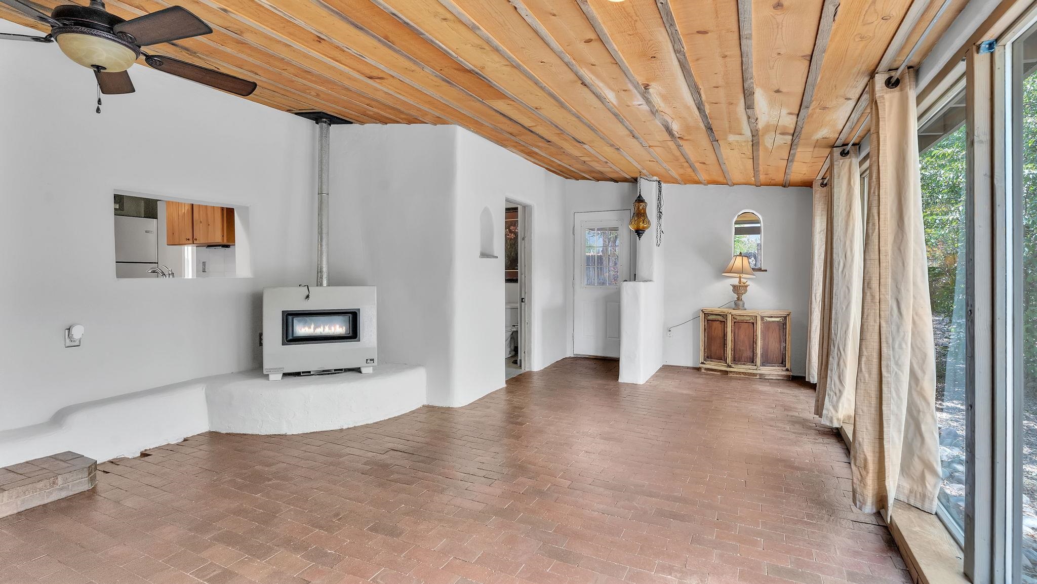 A Special Property with a Yard Just Minutes from Downtown Taos ~ Tucked at the end of a private road in Town, you will stumble upon this wonderful 3 bedroom, 1.5 bath residence with a spacious gated yard and large carport. This rare town gem with mature greenery surrounding is a home that offers unrivaled tranquility moments from the vibrant Taos Plaza, restaurants, shopping, schools, doctors, and many outlets to NATURE. Through the chainlink fence into the second contained yard area then enter the residence through a rustic front door to an incredibly warm and loving space. First, the living room with its inviting brick floors, efficient south-facing windows that flood the entire front area with natural light and passive solar heat, and a fantastic natural gas heater strong enough to warm the home by itself that ideally compliments the sunshine. The residence possesses unique South Western architectural features, with subtle farm-style touches such as rustic wood ceilings found throughout the home. In the large primary bedroom you will find a traditional wood-burning fireplace with a bancito, updated thermopane windows also found in other rooms, and a generous walk-in closet. In to the bright and updated kitchen where culinary delights will be crated on the daile, followed by two additional cozy bedrooms, two tastefully renovated bathrooms that add a feeling of extra freshness to the space, and a fully functional laundry room with practically brand new units. Beyond the home's endless interior potential, the outdoor's surrounding offer equal opportunity with plenty of room to garden, xeriscape, landscape, or leave it as is; whatever you, the kids, and pets desire. Around the corner, explore world-class art galleries, hit the slopes at Taos Ski Valley, fish the Rio Grande, or immerse yourself in the rich culture and history of the region. The home has been virtually staged to spark creativity. There's not many places as convenient, maintained, an ready-to-go than 121 Cruz Alta, so be sure you don't miss the opportunity.