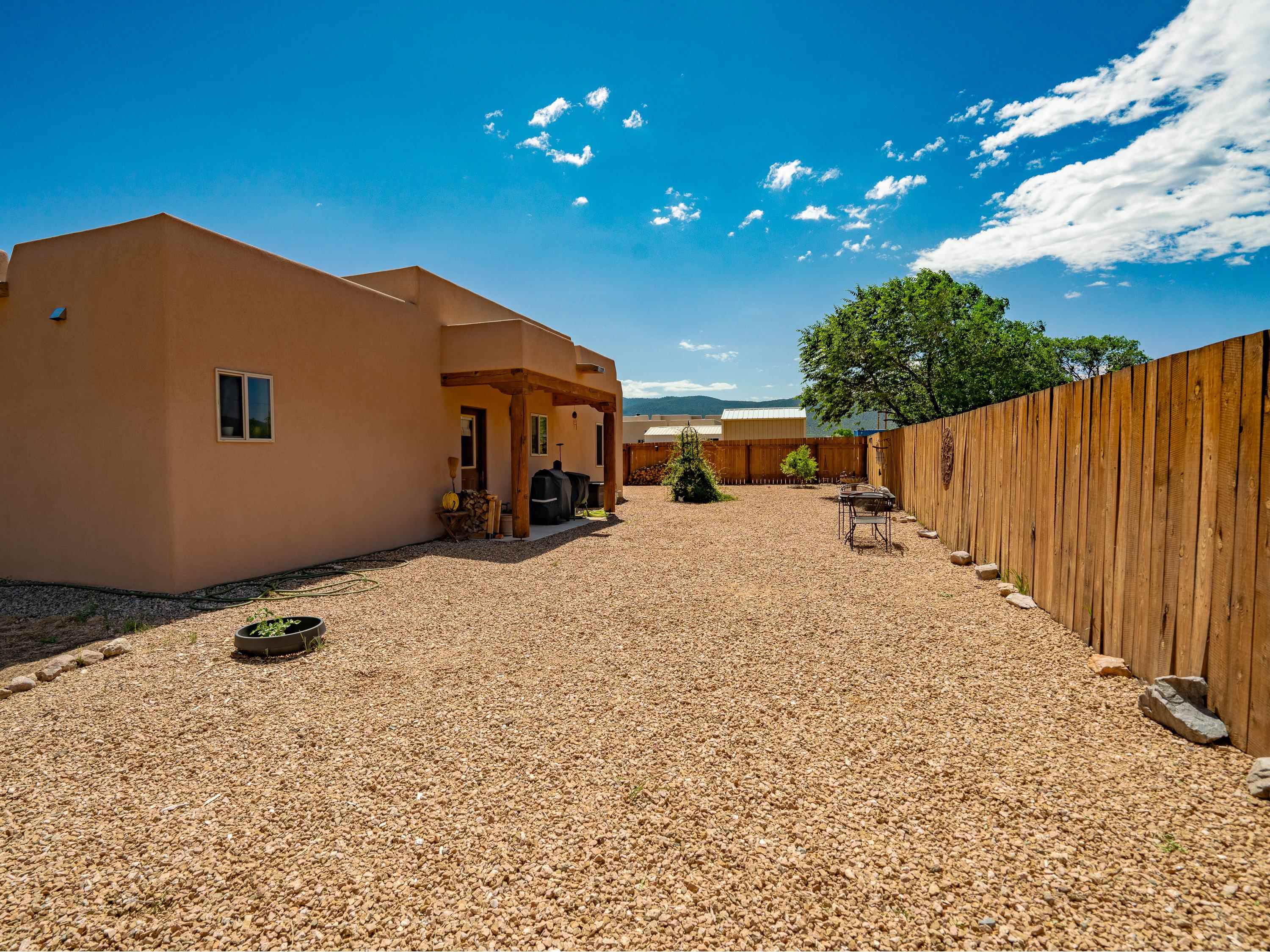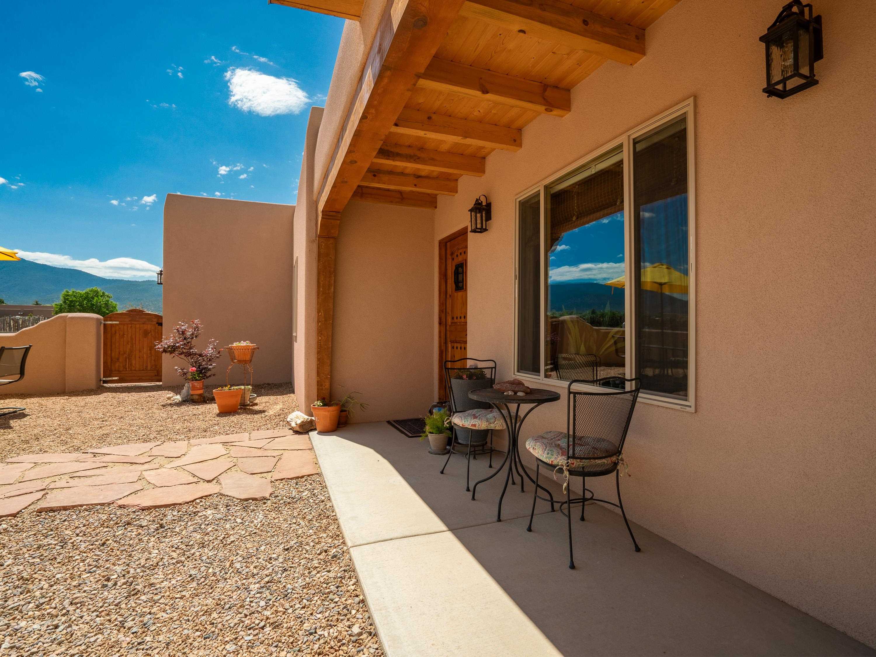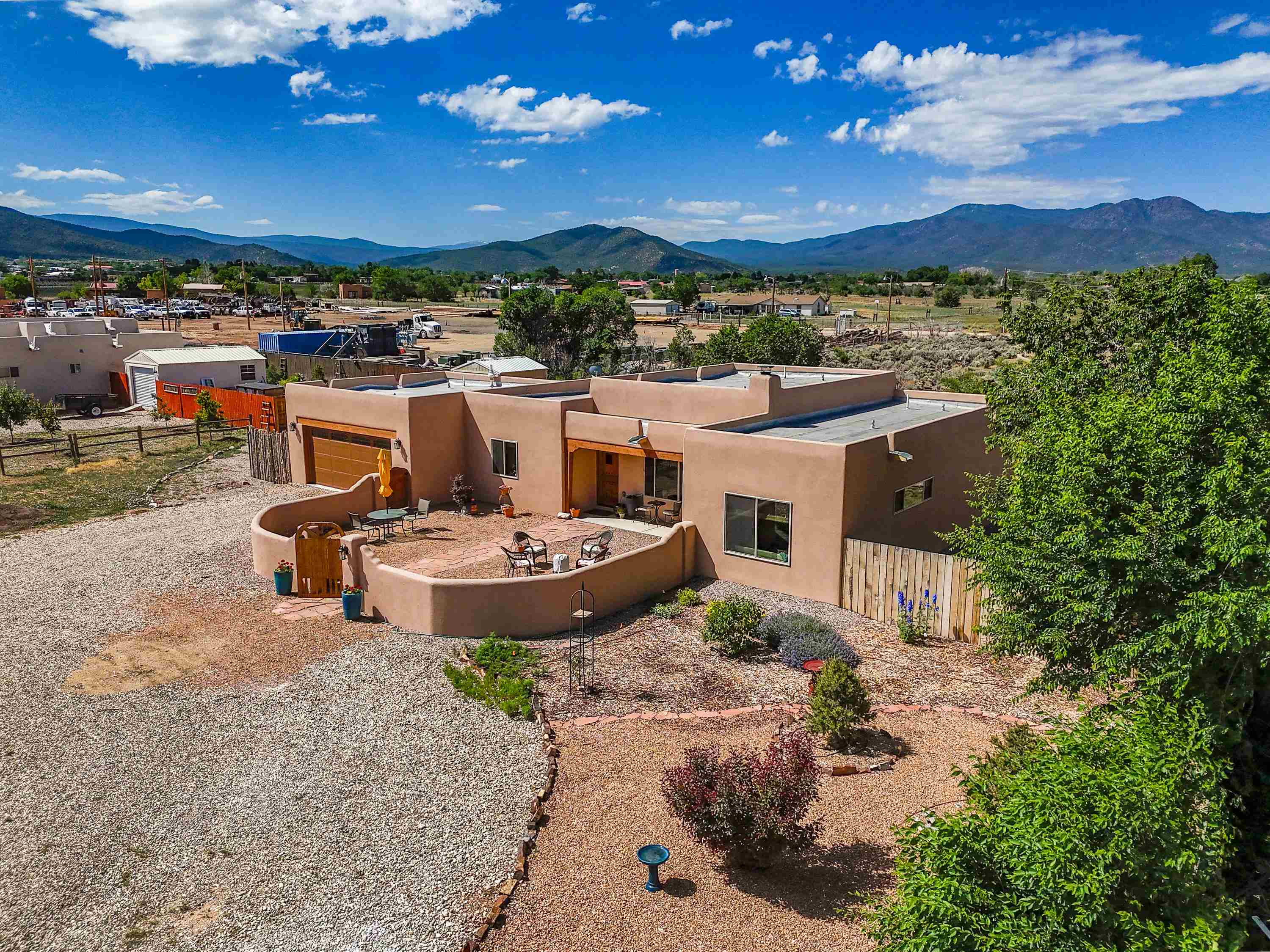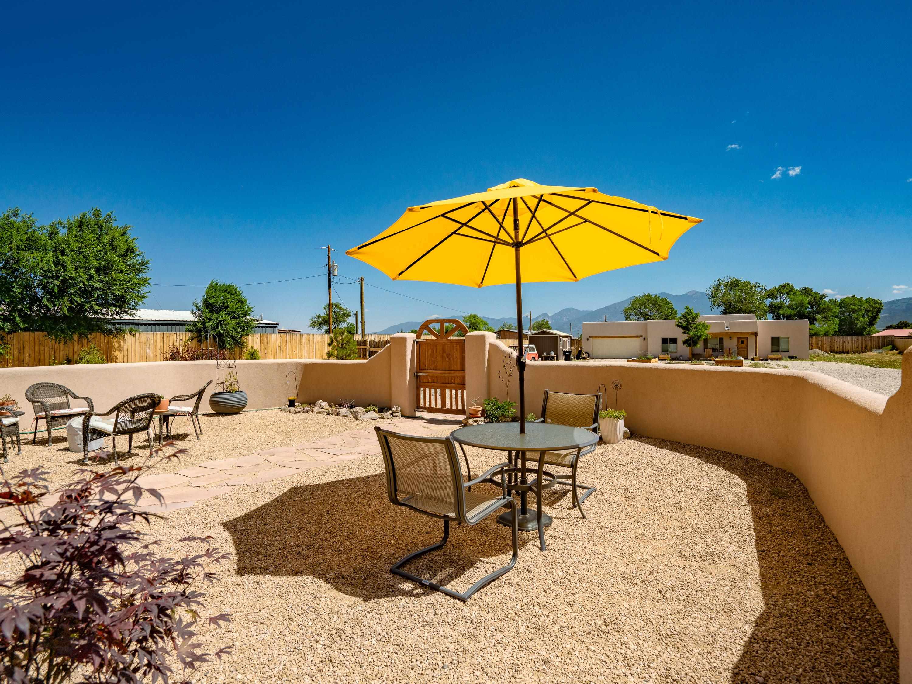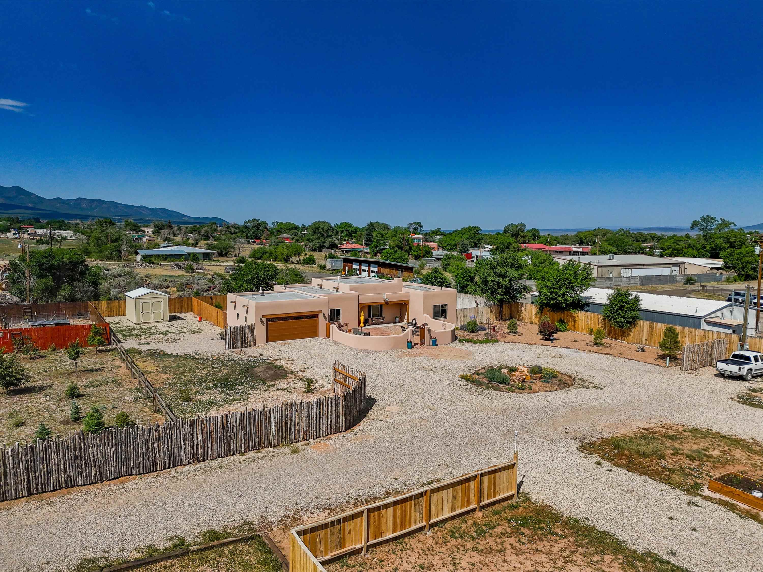 If privacy, comfort, and low maintenance are on your wish list, this is your spot. At the very end of a dead-end road, this home gives you that "away from it all" feeling--without actually being far from anything. No neighbors driving by. Just a well thought out property; start to finish! Inside, the kitchen is ready for serious cooking. We're talking oversized knotty alder cabinets, granite countertops, a huge breakfast bar, and a large walk-in-style pantry. The living room brings the Taos feel with a real wood-burning kiva fireplace finished with smooth plaster in a contrasting color, and a big window that frames the landscaped courtyard with the mountains behind it. Saltillo tile runs throughout the home; a must have here in Taos. Designed with smart separation in mind, the primary suite is on one side of the home while the two guest bedrooms (or bedroom + office) are on the other. The primary suite is BIG. Room for your king-size bed, dressers, and then some. The en-suite bathroom includes a walk-in shower with frameless glass, double sinks on a granite counter, custom alder cabinets, and even a built-in linen closet. The walk-in closet has room for your stuff AND your significant other. One of the two guest bedrooms is currently used as a home office with high-speed internet and the guest bathroom has all the beautiful finishes the primary has, including a frameless glass door. The whole house (yes, including the garage) is heated with radiant in-floor heat powered by an on-demand natural gas boiler. That same system also handles your hot water. If you ever felt like you needed more living space, the heated garage is an excellent outlet for your creativity. Extras? You've got them: natural gas hookup, shared well, water softener, radon mitigation system, and town sewer--so no septic headaches. Outside, you'll find a circular driveway, xeriscaping, trees, and privacy fencing in all the right places. The front courtyard is wrapped in a beautiful adobe wall with a nice wooden gate to let you out and keep your pets in! Tucked away in the back corner of the property you'll find a new Tough Shed for all the stuff you don't want to stuff into your garage. Built in 2022, the house is in great condition and is ready for you to move in, relax, and enjoy the reasons you are moving to Taos for!