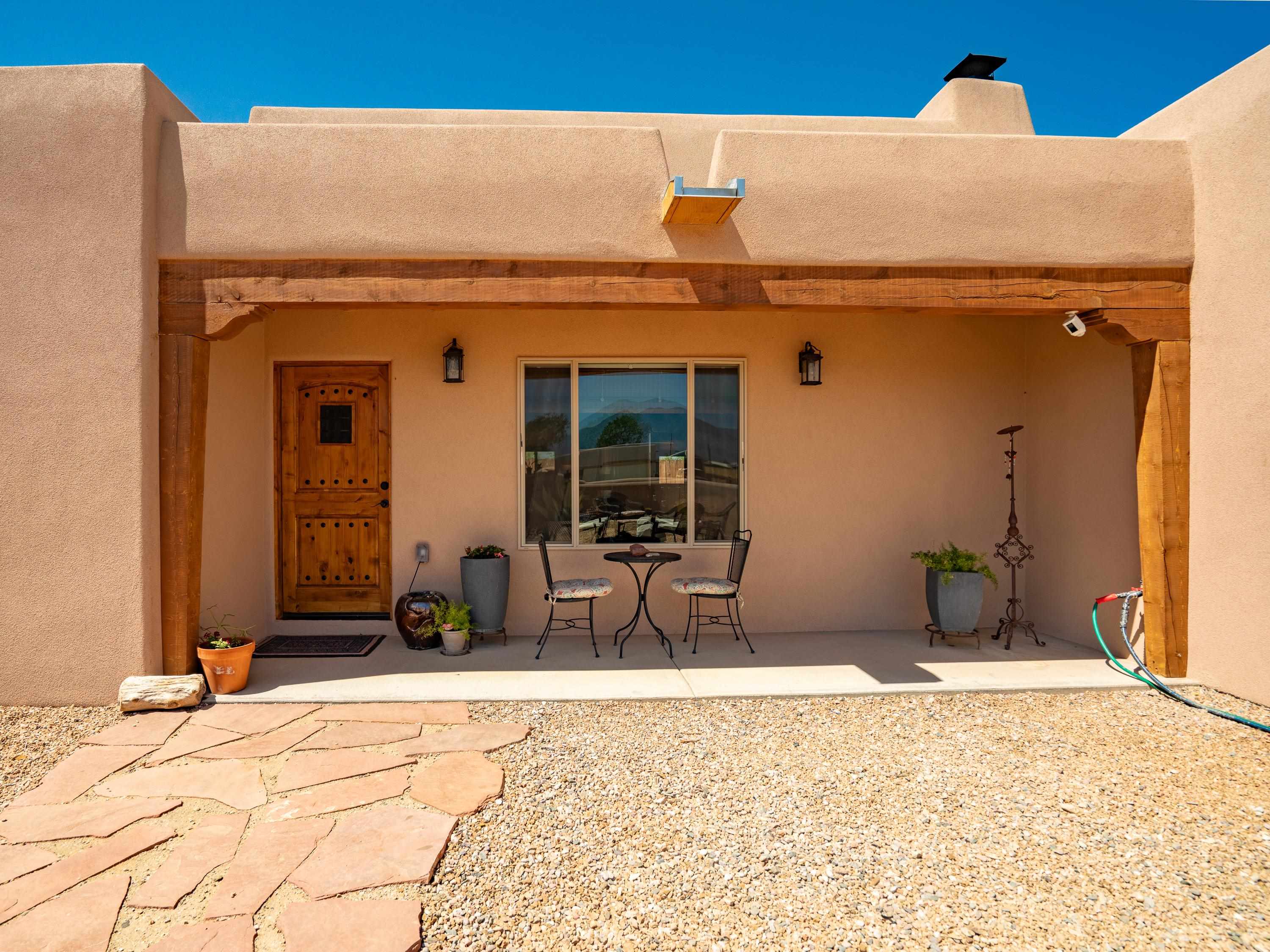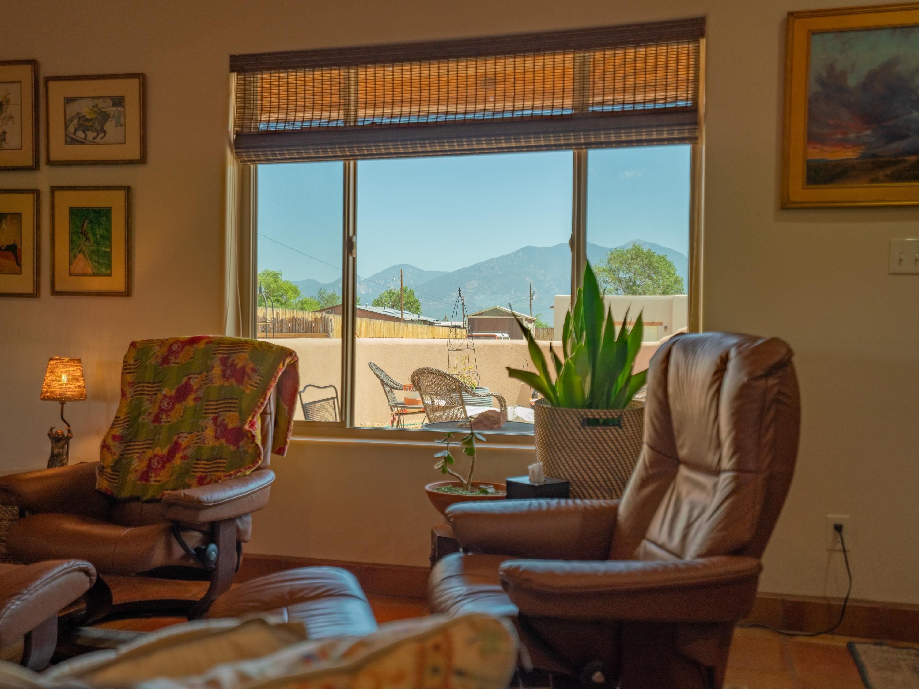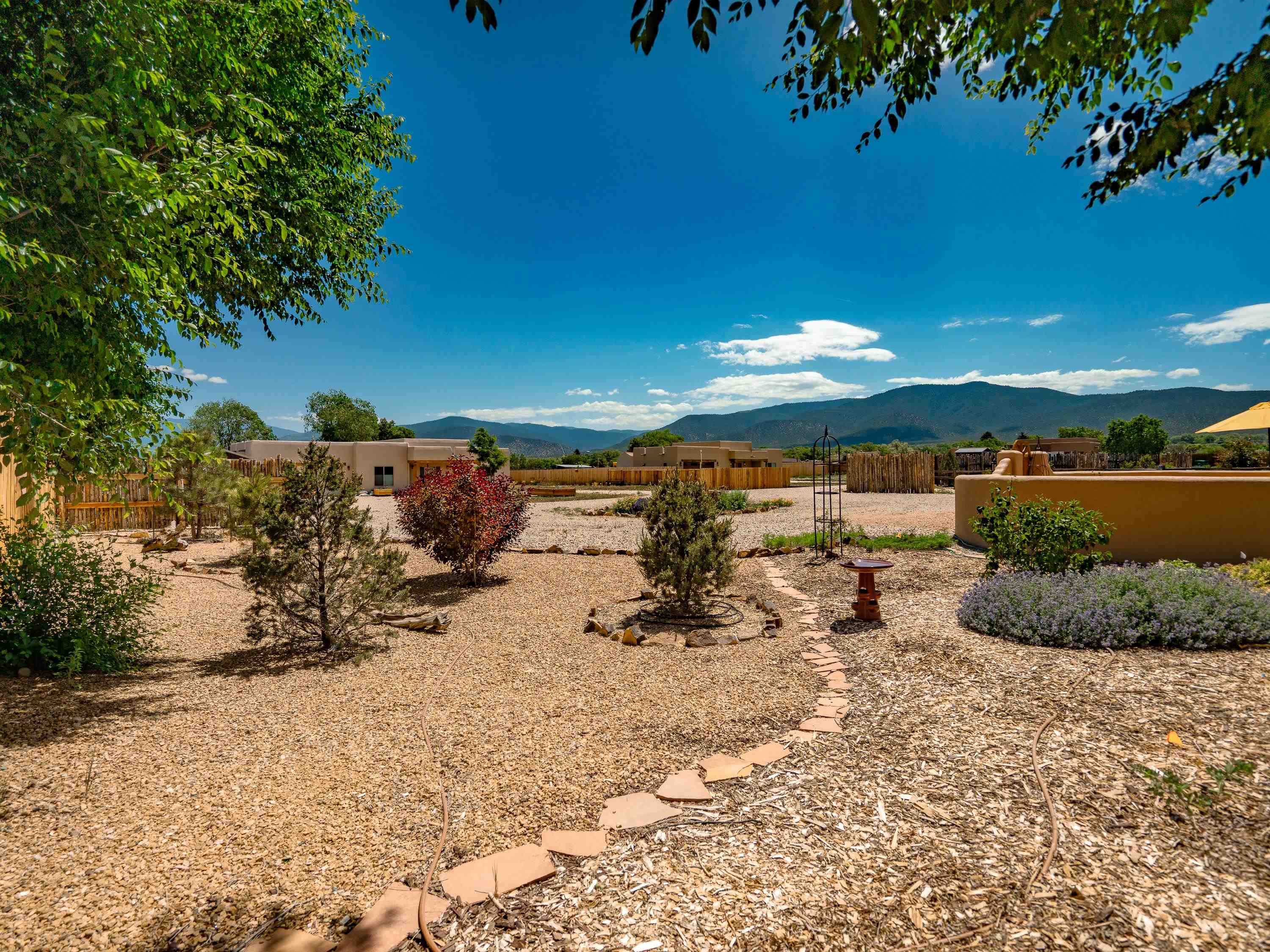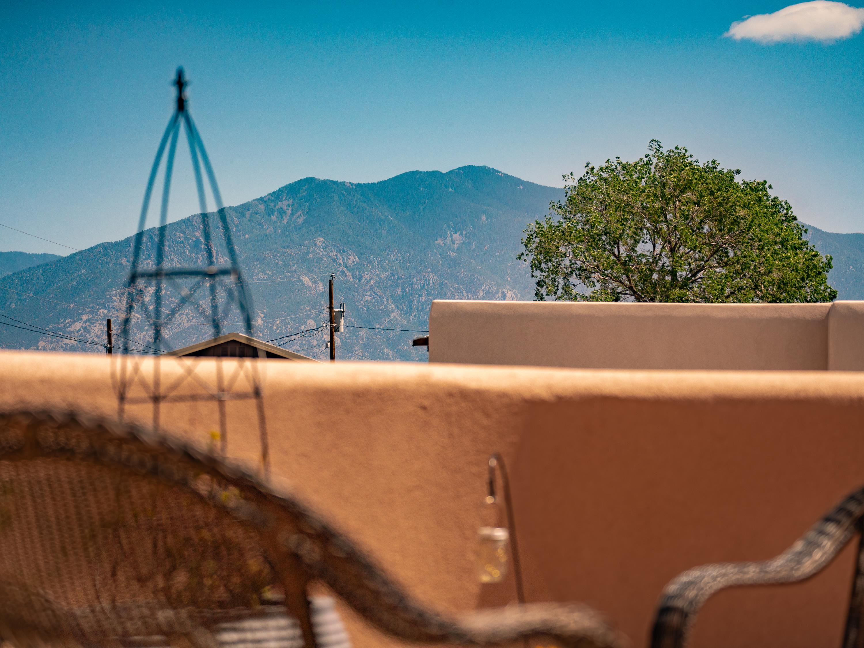 If privacy, comfort, and low maintenance are on your wish list, this is your spot. At the very end of a dead-end road, this home gives you that "away from it all" feeling--without actually being far from anything. No neighbors driving by. Just a well thought out property; start to finish! Inside, the kitchen is ready for serious cooking. We're talking oversized knotty alder cabinets, granite countertops, a huge breakfast bar, and a large walk-in-style pantry. The living room brings the Taos feel with a real wood-burning kiva fireplace finished with smooth plaster in a contrasting color, and a big window that frames the landscaped courtyard with the mountains behind it. Saltillo tile runs throughout the home; a must have here in Taos. Designed with smart separation in mind, the primary suite is on one side of the home while the two guest bedrooms (or bedroom + office) are on the other. The primary suite is BIG. Room for your king-size bed, dressers, and then some. The en-suite bathroom includes a walk-in shower with frameless glass, double sinks on a granite counter, custom alder cabinets, and even a built-in linen closet. The walk-in closet has room for your stuff AND your significant other. One of the two guest bedrooms is currently used as a home office with high-speed internet and the guest bathroom has all the beautiful finishes the primary has, including a frameless glass door. The whole house (yes, including the garage) is heated with radiant in-floor heat powered by an on-demand natural gas boiler. That same system also handles your hot water. If you ever felt like you needed more living space, the heated garage is an excellent outlet for your creativity. Extras? You've got them: natural gas hookup, shared well, water softener, radon mitigation system, and town sewer--so no septic headaches. Outside, you'll find a circular driveway, xeriscaping, trees, and privacy fencing in all the right places. The front courtyard is wrapped in a beautiful adobe wall with a nice wooden gate to let you out and keep your pets in! Tucked away in the back corner of the property you'll find a new Tough Shed for all the stuff you don't want to stuff into your garage. Built in 2022, the house is in great condition and is ready for you to move in, relax, and enjoy the reasons you are moving to Taos for!