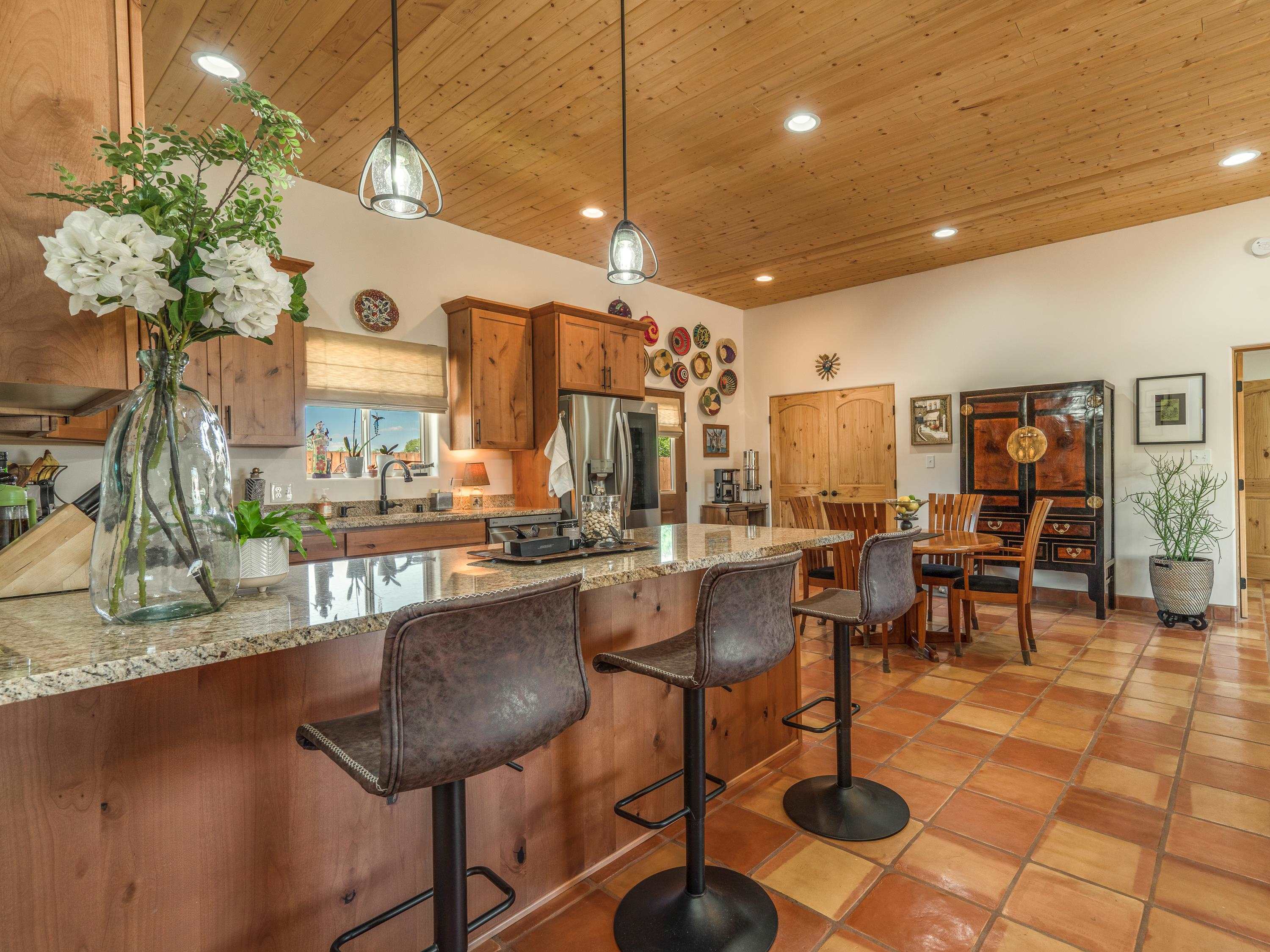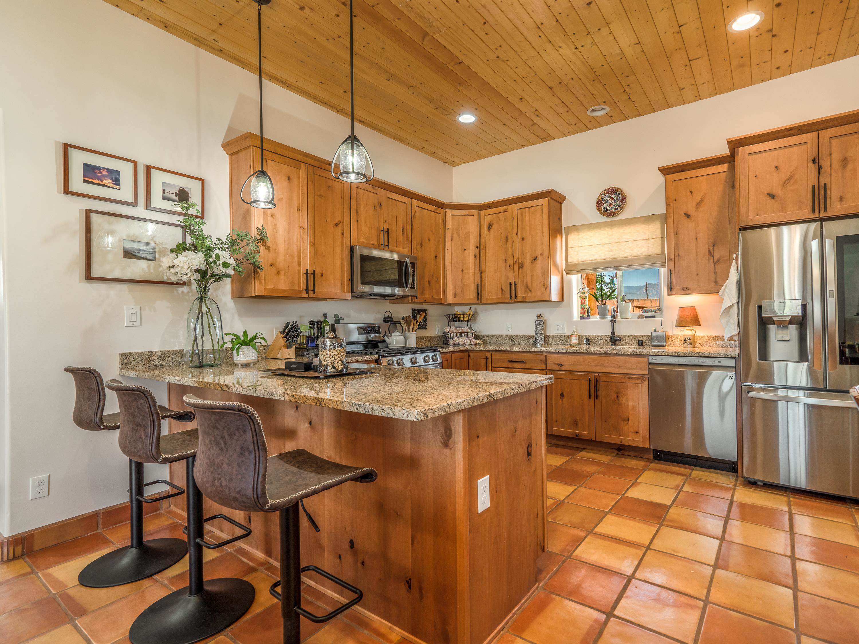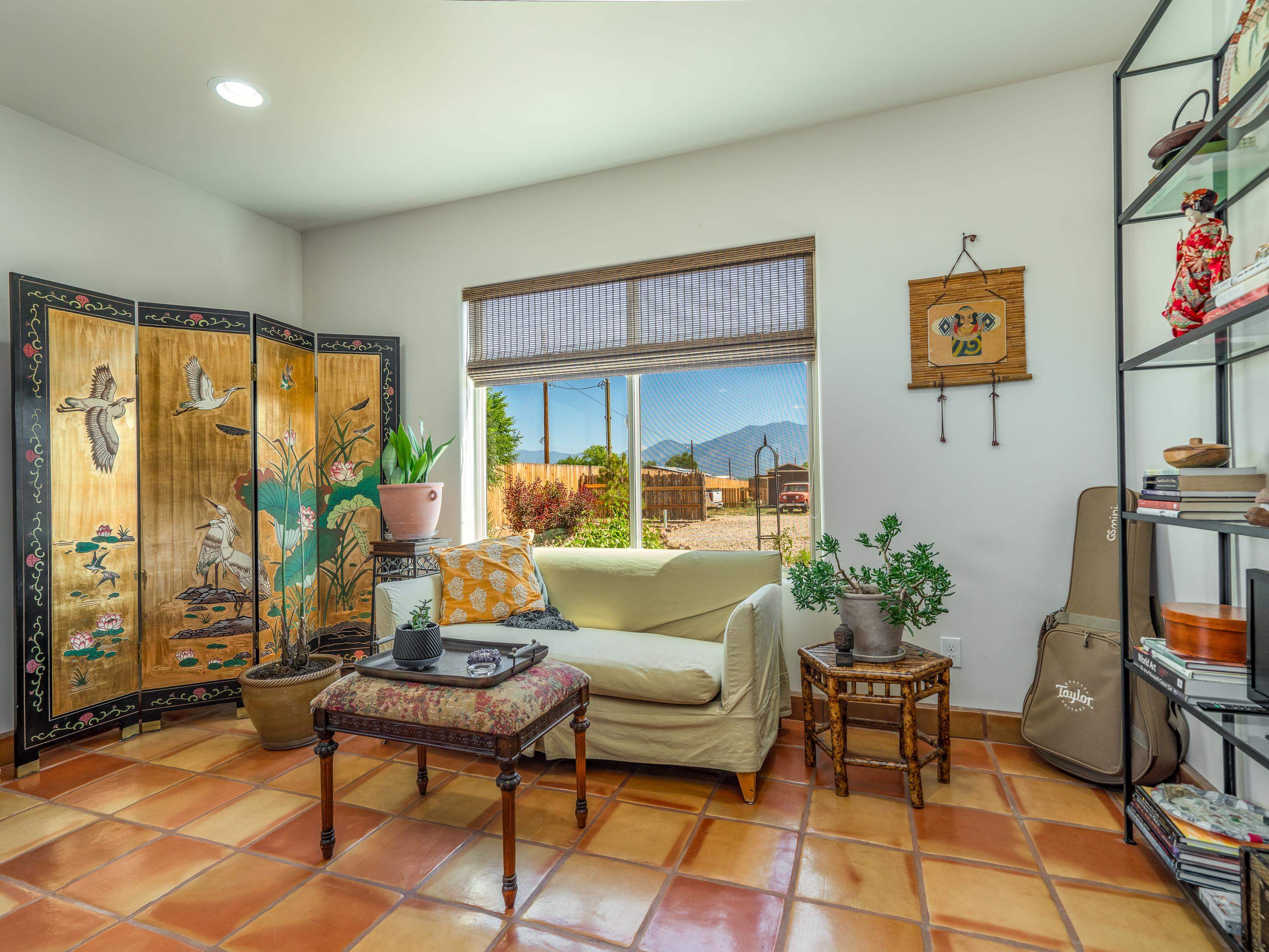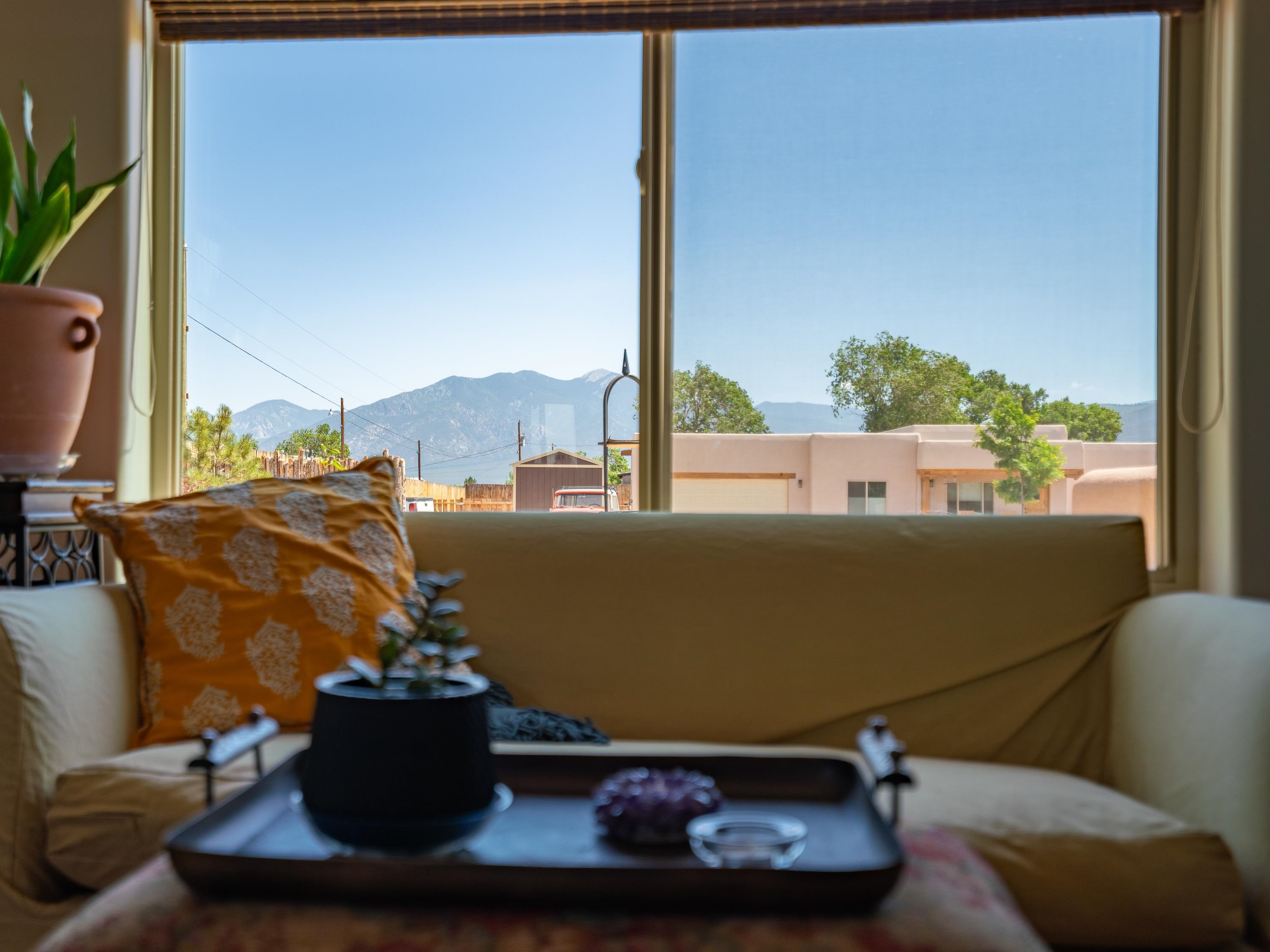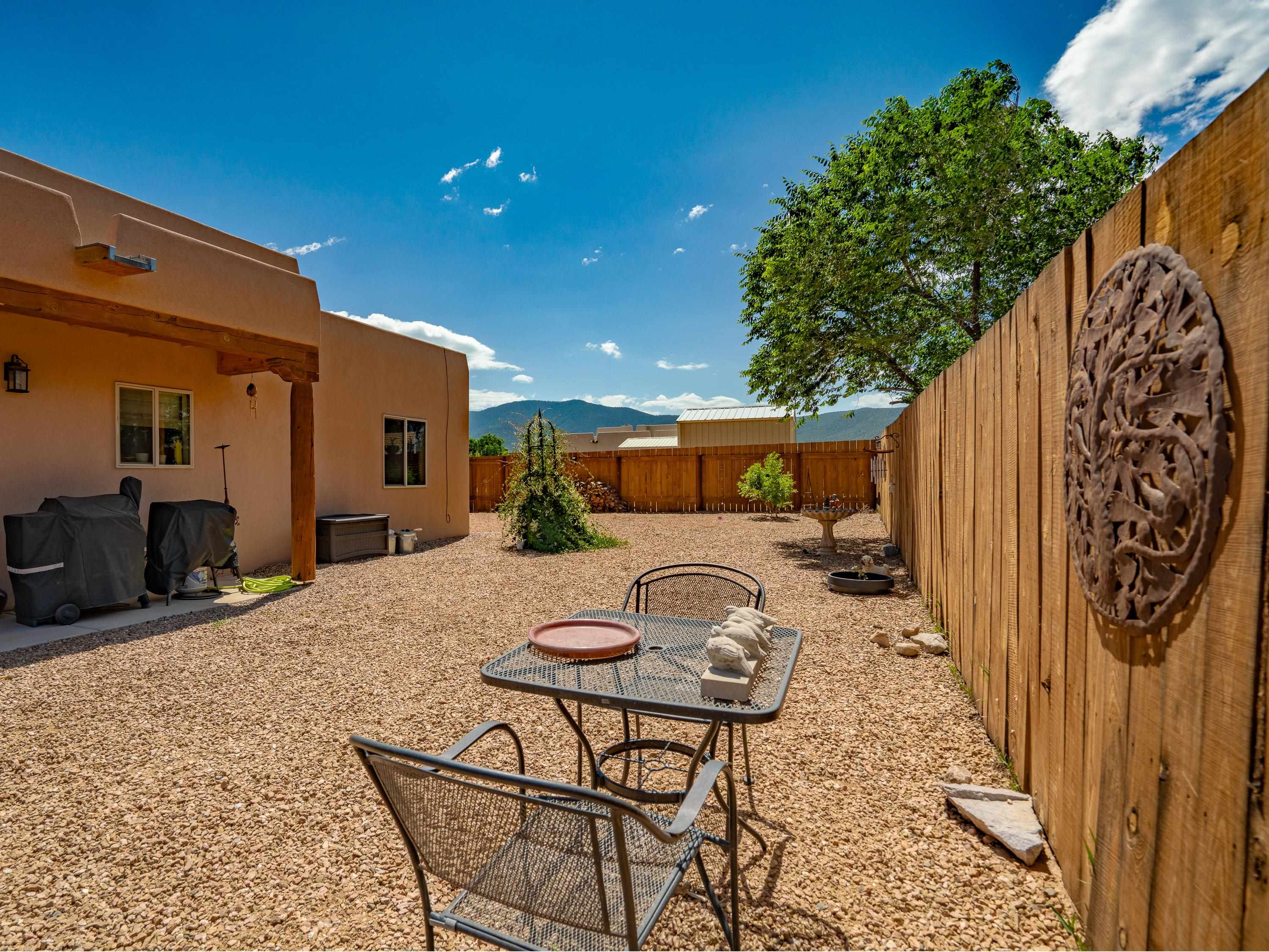 If privacy, comfort, and low maintenance are on your wish list, this is your spot. At the very end of a dead-end road, this home gives you that "away from it all" feeling--without actually being far from anything. No neighbors driving by. Just a well thought out property; start to finish! Inside, the kitchen is ready for serious cooking. We're talking oversized knotty alder cabinets, granite countertops, a huge breakfast bar, and a large walk-in-style pantry. The living room brings the Taos feel with a real wood-burning kiva fireplace finished with smooth plaster in a contrasting color, and a big window that frames the landscaped courtyard with the mountains behind it. Saltillo tile runs throughout the home; a must have here in Taos. Designed with smart separation in mind, the primary suite is on one side of the home while the two guest bedrooms (or bedroom + office) are on the other. The primary suite is BIG. Room for your king-size bed, dressers, and then some. The en-suite bathroom includes a walk-in shower with frameless glass, double sinks on a granite counter, custom alder cabinets, and even a built-in linen closet. The walk-in closet has room for your stuff AND your significant other. One of the two guest bedrooms is currently used as a home office with high-speed internet and the guest bathroom has all the beautiful finishes the primary has, including a frameless glass door. The whole house (yes, including the garage) is heated with radiant in-floor heat powered by an on-demand natural gas boiler. That same system also handles your hot water. If you ever felt like you needed more living space, the heated garage is an excellent outlet for your creativity. Extras? You've got them: natural gas hookup, shared well, water softener, radon mitigation system, and town sewer--so no septic headaches. Outside, you'll find a circular driveway, xeriscaping, trees, and privacy fencing in all the right places. The front courtyard is wrapped in a beautiful adobe wall with a nice wooden gate to let you out and keep your pets in! Tucked away in the back corner of the property you'll find a new Tough Shed for all the stuff you don't want to stuff into your garage. Built in 2022, the house is in great condition and is ready for you to move in, relax, and enjoy the reasons you are moving to Taos for!
