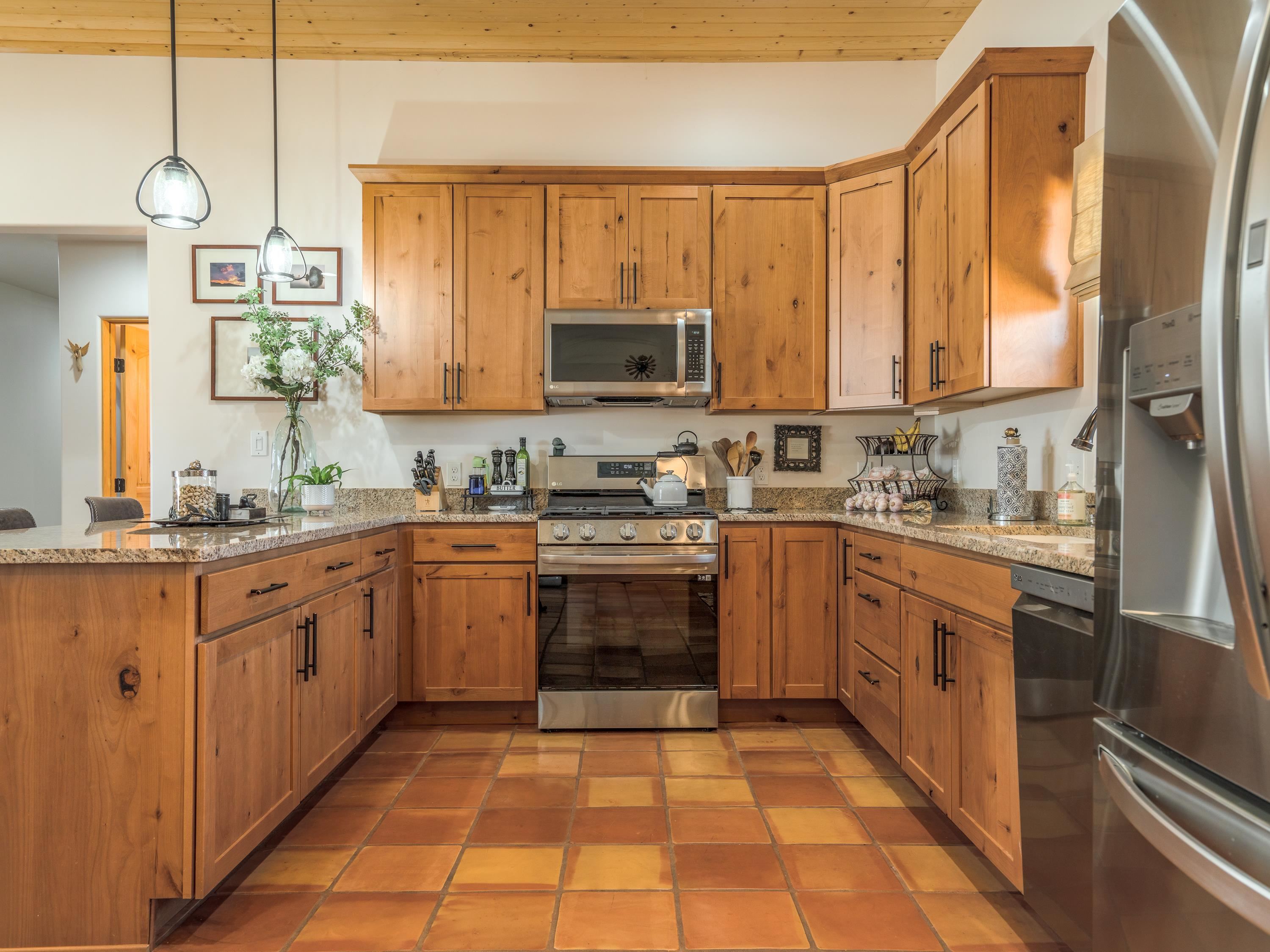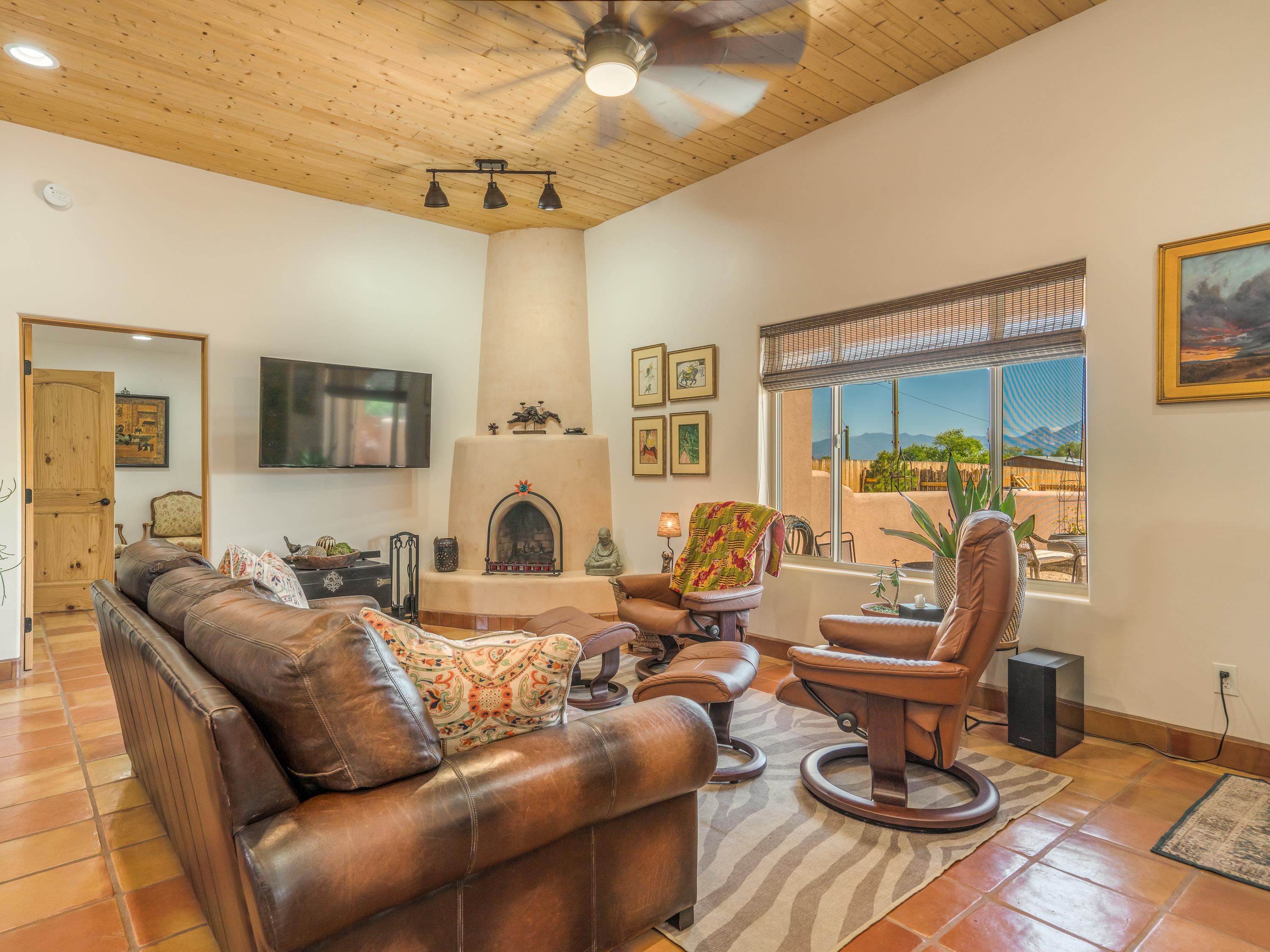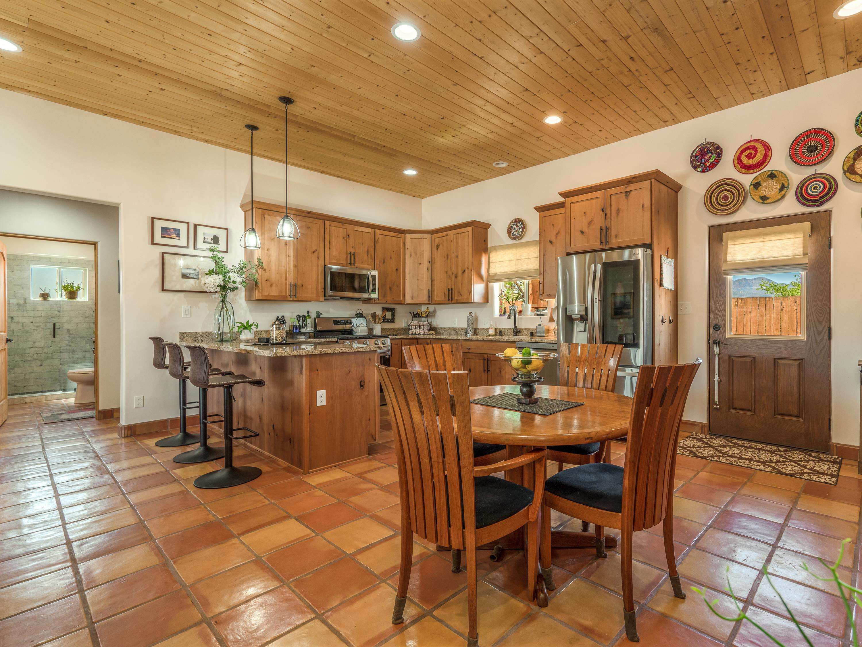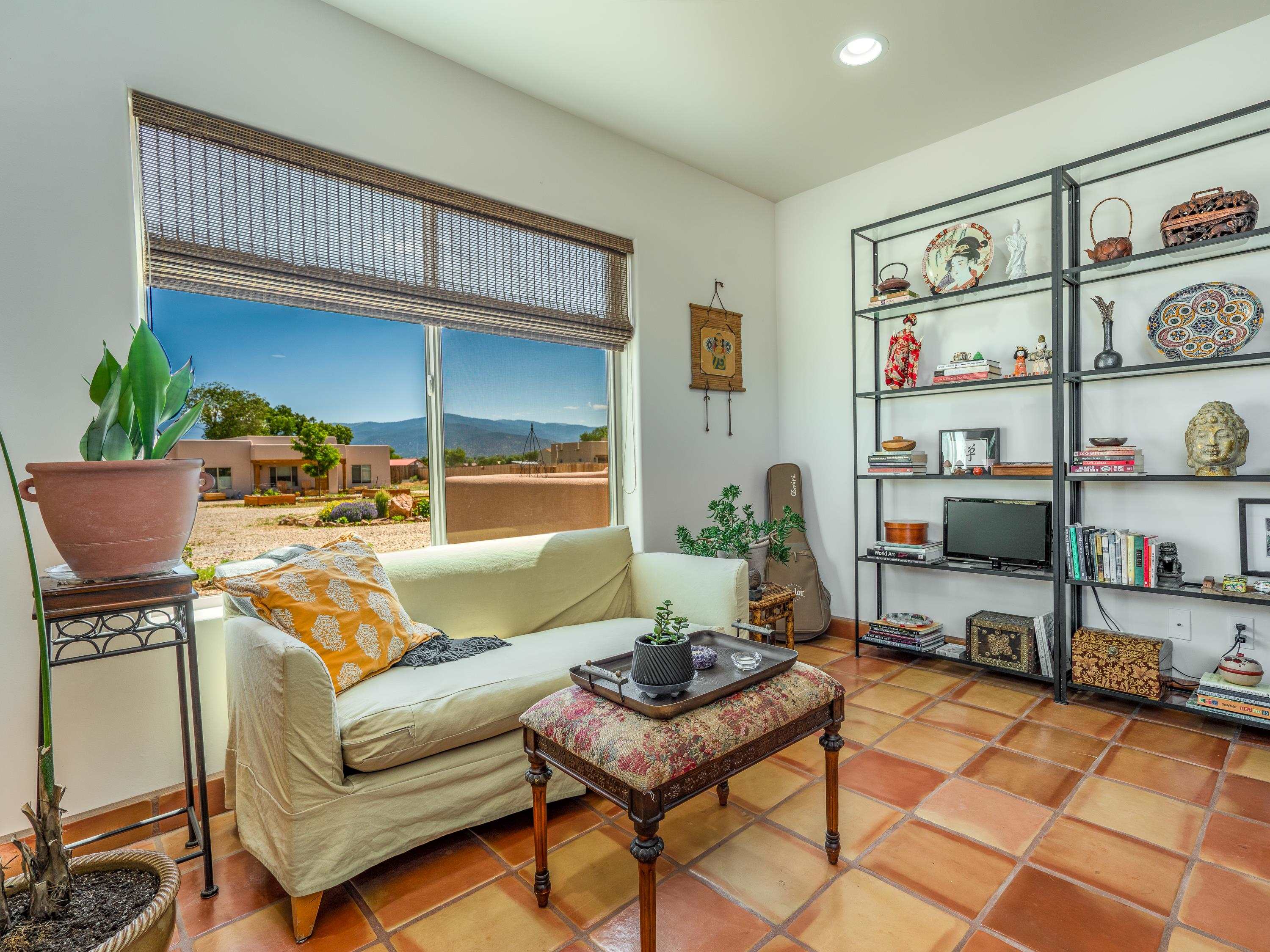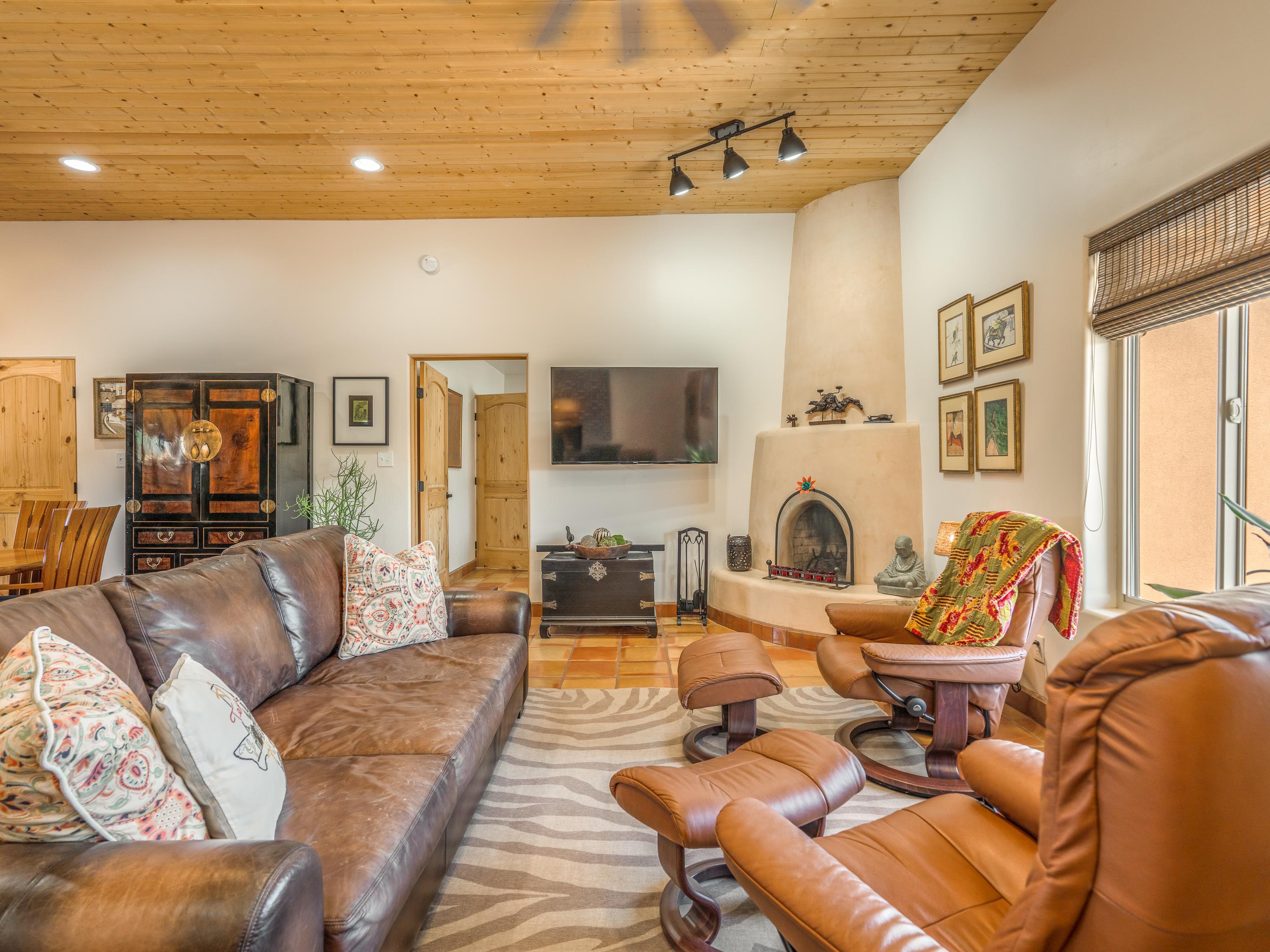 If privacy, comfort, and low maintenance are on your wish list, this is your spot. At the very end of a dead-end road, this home gives you that "away from it all" feeling--without actually being far from anything. No neighbors driving by. Just a well thought out property; start to finish! Inside, the kitchen is ready for serious cooking. We're talking oversized knotty alder cabinets, granite countertops, a huge breakfast bar, and a large walk-in-style pantry. The living room brings the Taos feel with a real wood-burning kiva fireplace finished with smooth plaster in a contrasting color, and a big window that frames the landscaped courtyard with the mountains behind it. Saltillo tile runs throughout the home; a must have here in Taos. Designed with smart separation in mind, the primary suite is on one side of the home while the two guest bedrooms (or bedroom + office) are on the other. The primary suite is BIG. Room for your king-size bed, dressers, and then some. The en-suite bathroom includes a walk-in shower with frameless glass, double sinks on a granite counter, custom alder cabinets, and even a built-in linen closet. The walk-in closet has room for your stuff AND your significant other. One of the two guest bedrooms is currently used as a home office with high-speed internet and the guest bathroom has all the beautiful finishes the primary has, including a frameless glass door. The whole house (yes, including the garage) is heated with radiant in-floor heat powered by an on-demand natural gas boiler. That same system also handles your hot water. If you ever felt like you needed more living space, the heated garage is an excellent outlet for your creativity. Extras? You've got them: natural gas hookup, shared well, water softener, radon mitigation system, and town sewer--so no septic headaches. Outside, you'll find a circular driveway, xeriscaping, trees, and privacy fencing in all the right places. The front courtyard is wrapped in a beautiful adobe wall with a nice wooden gate to let you out and keep your pets in! Tucked away in the back corner of the property you'll find a new Tough Shed for all the stuff you don't want to stuff into your garage. Built in 2022, the house is in great condition and is ready for you to move in, relax, and enjoy the reasons you are moving to Taos for!