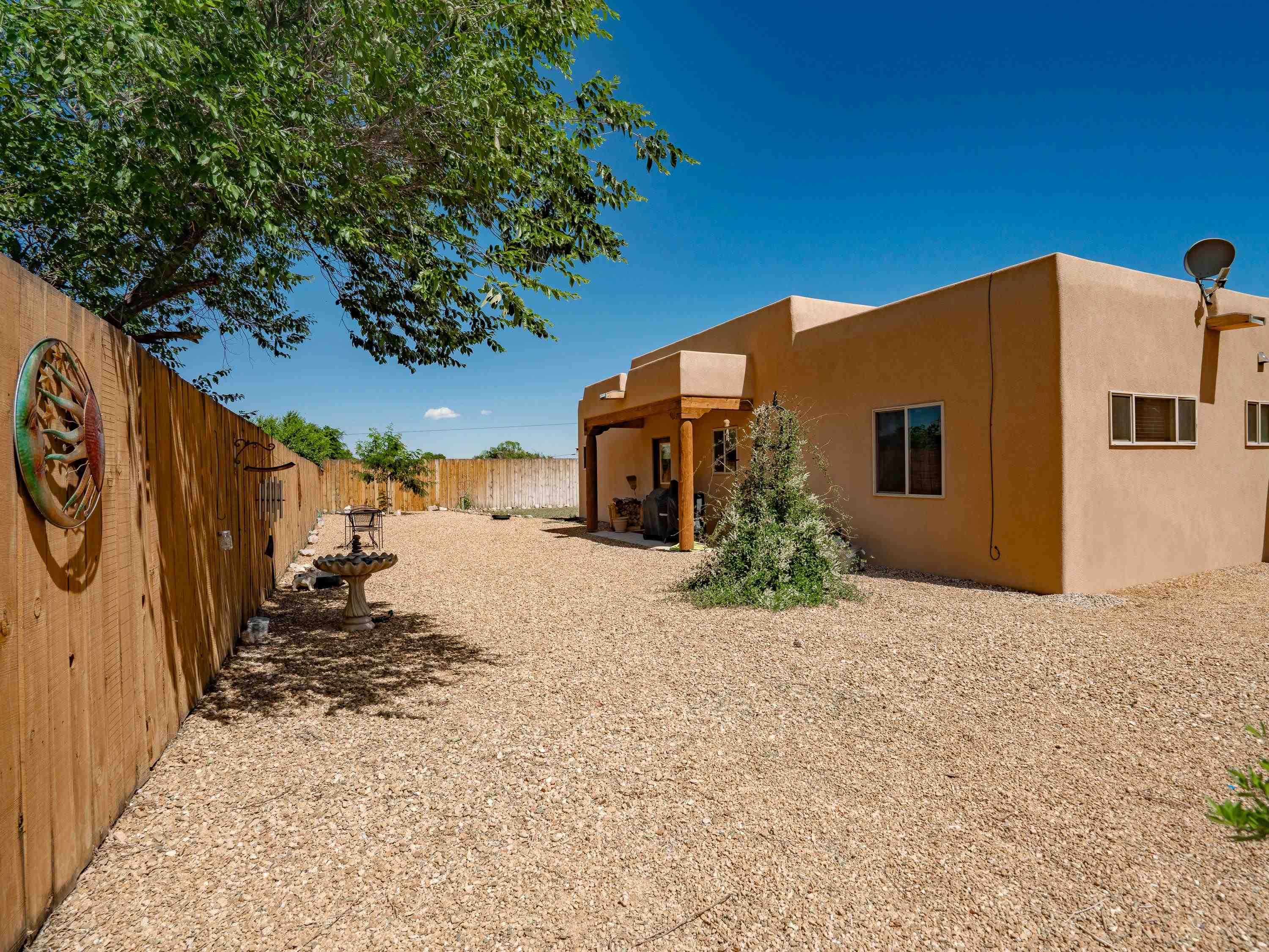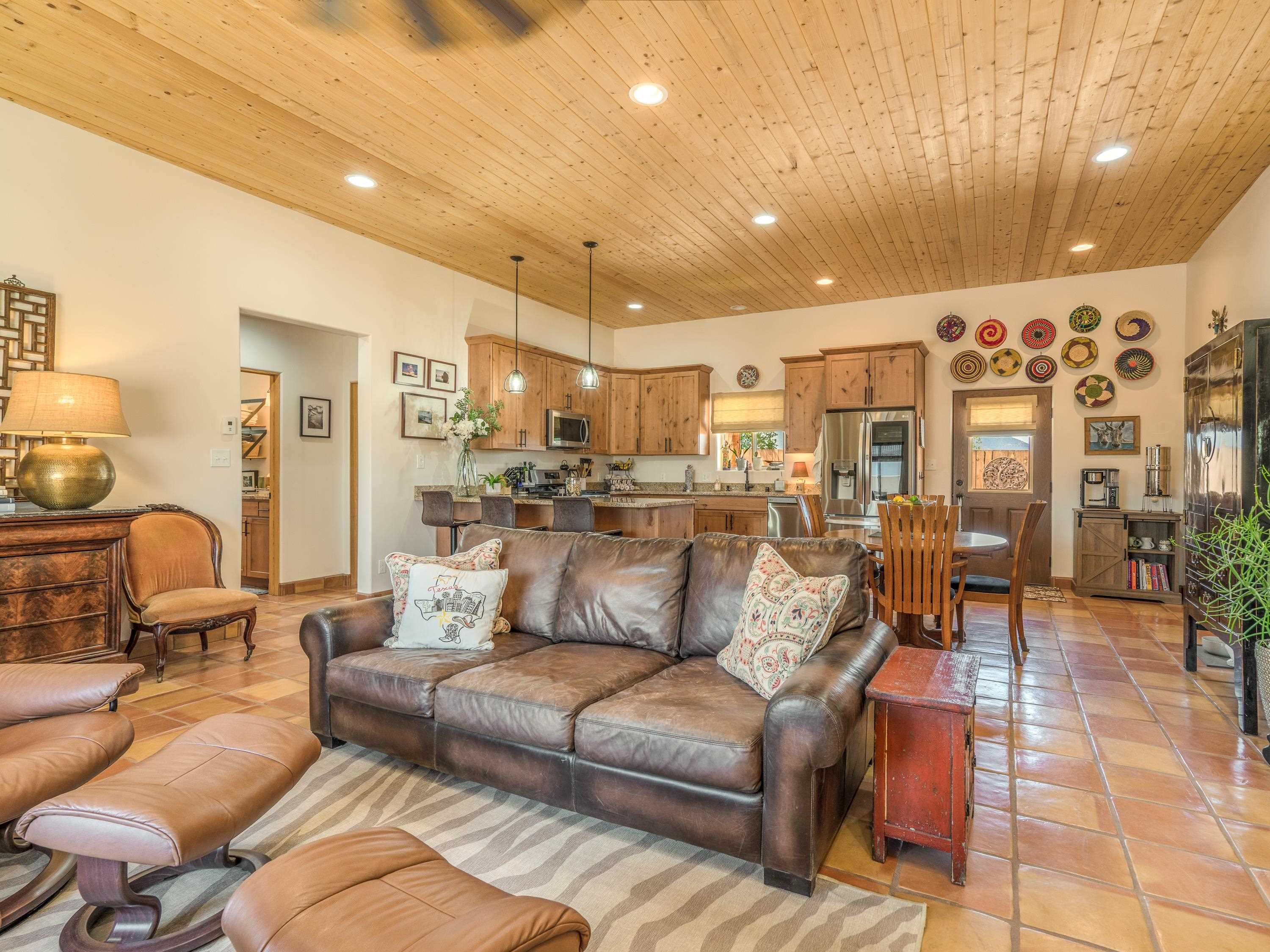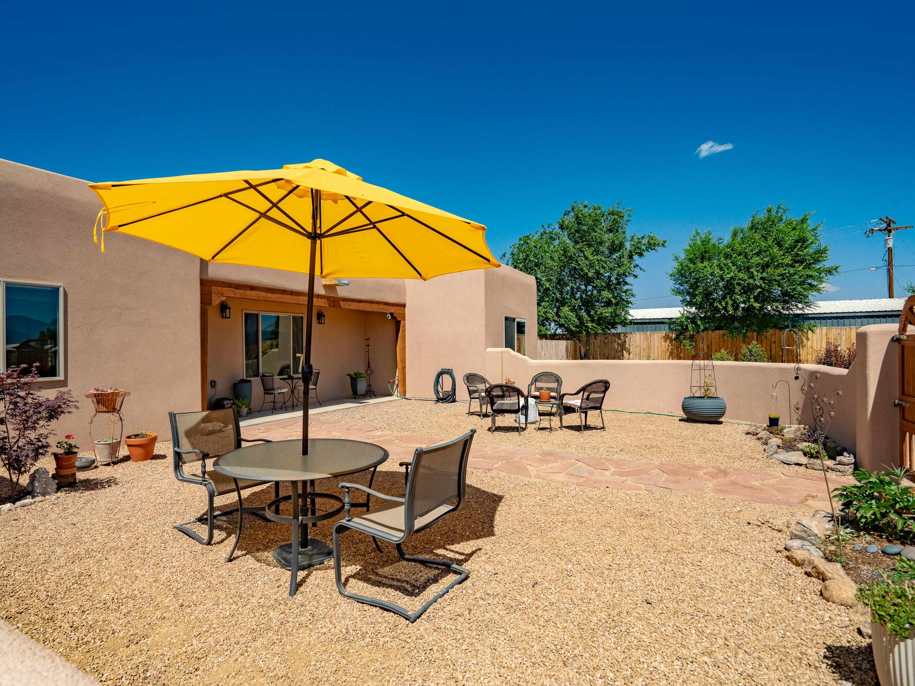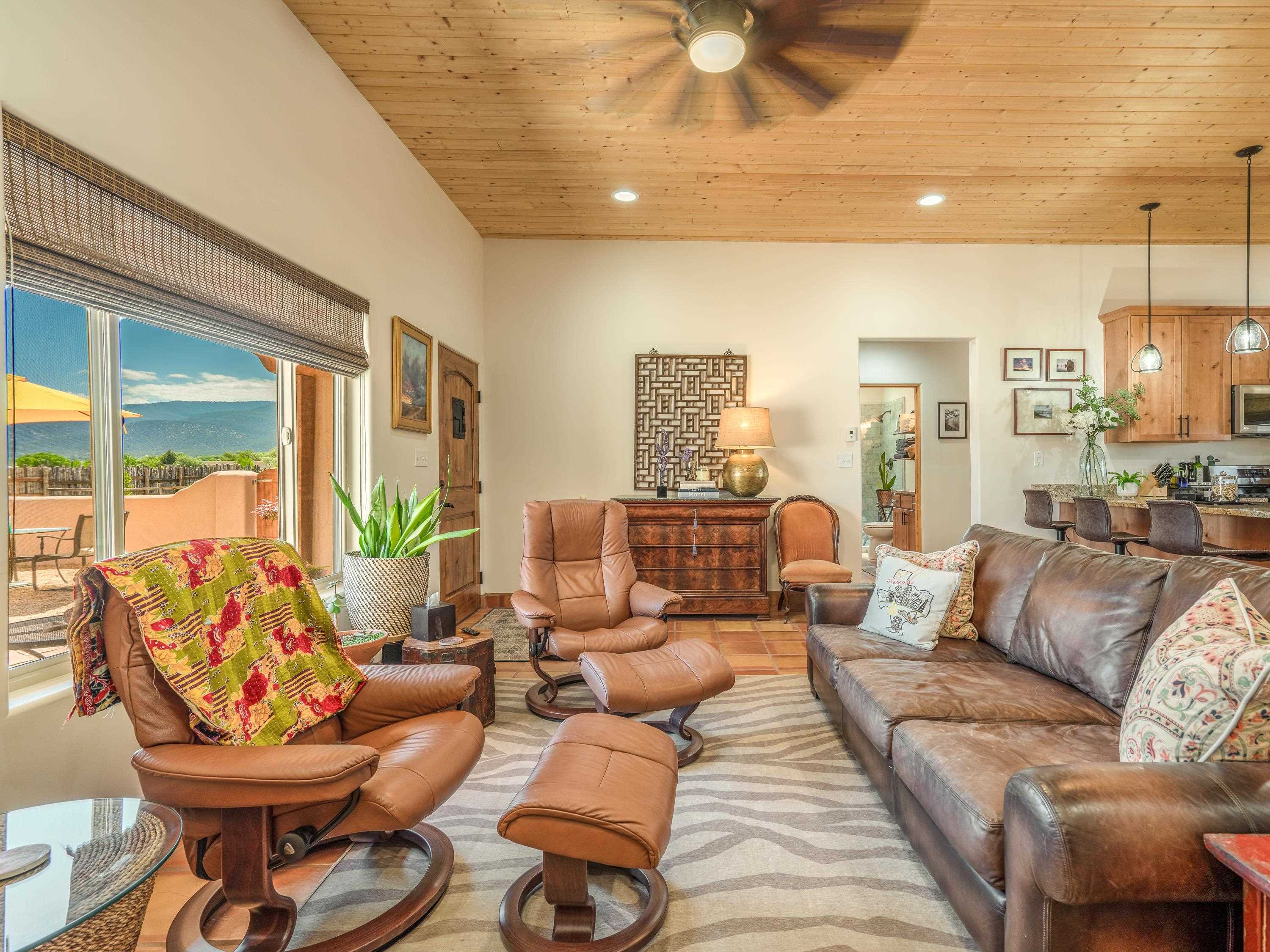 If privacy, comfort, and low maintenance are on your wish list, this is your spot. At the very end of a dead-end road, this home gives you that "away from it all" feeling--without actually being far from anything. No neighbors driving by. Just a well thought out property; start to finish! Inside, the kitchen is ready for serious cooking. We're talking oversized knotty alder cabinets, granite countertops, a huge breakfast bar, and a large walk-in-style pantry. The living room brings the Taos feel with a real wood-burning kiva fireplace finished with smooth plaster in a contrasting color, and a big window that frames the landscaped courtyard with the mountains behind it. Saltillo tile runs throughout the home; a must have here in Taos. Designed with smart separation in mind, the primary suite is on one side of the home while the two guest bedrooms (or bedroom + office) are on the other. The primary suite is BIG. Room for your king-size bed, dressers, and then some. The en-suite bathroom includes a walk-in shower with frameless glass, double sinks on a granite counter, custom alder cabinets, and even a built-in linen closet. The walk-in closet has room for your stuff AND your significant other. One of the two guest bedrooms is currently used as a home office with high-speed internet and the guest bathroom has all the beautiful finishes the primary has, including a frameless glass door. The whole house (yes, including the garage) is heated with radiant in-floor heat powered by an on-demand natural gas boiler. That same system also handles your hot water. If you ever felt like you needed more living space, the heated garage is an excellent outlet for your creativity. Extras? You've got them: natural gas hookup, shared well, water softener, radon mitigation system, and town sewer--so no septic headaches. Outside, you'll find a circular driveway, xeriscaping, trees, and privacy fencing in all the right places. The front courtyard is wrapped in a beautiful adobe wall with a nice wooden gate to let you out and keep your pets in! Tucked away in the back corner of the property you'll find a new Tough Shed for all the stuff you don't want to stuff into your garage. Built in 2022, the house is in great condition and is ready for you to move in, relax, and enjoy the reasons you are moving to Taos for!