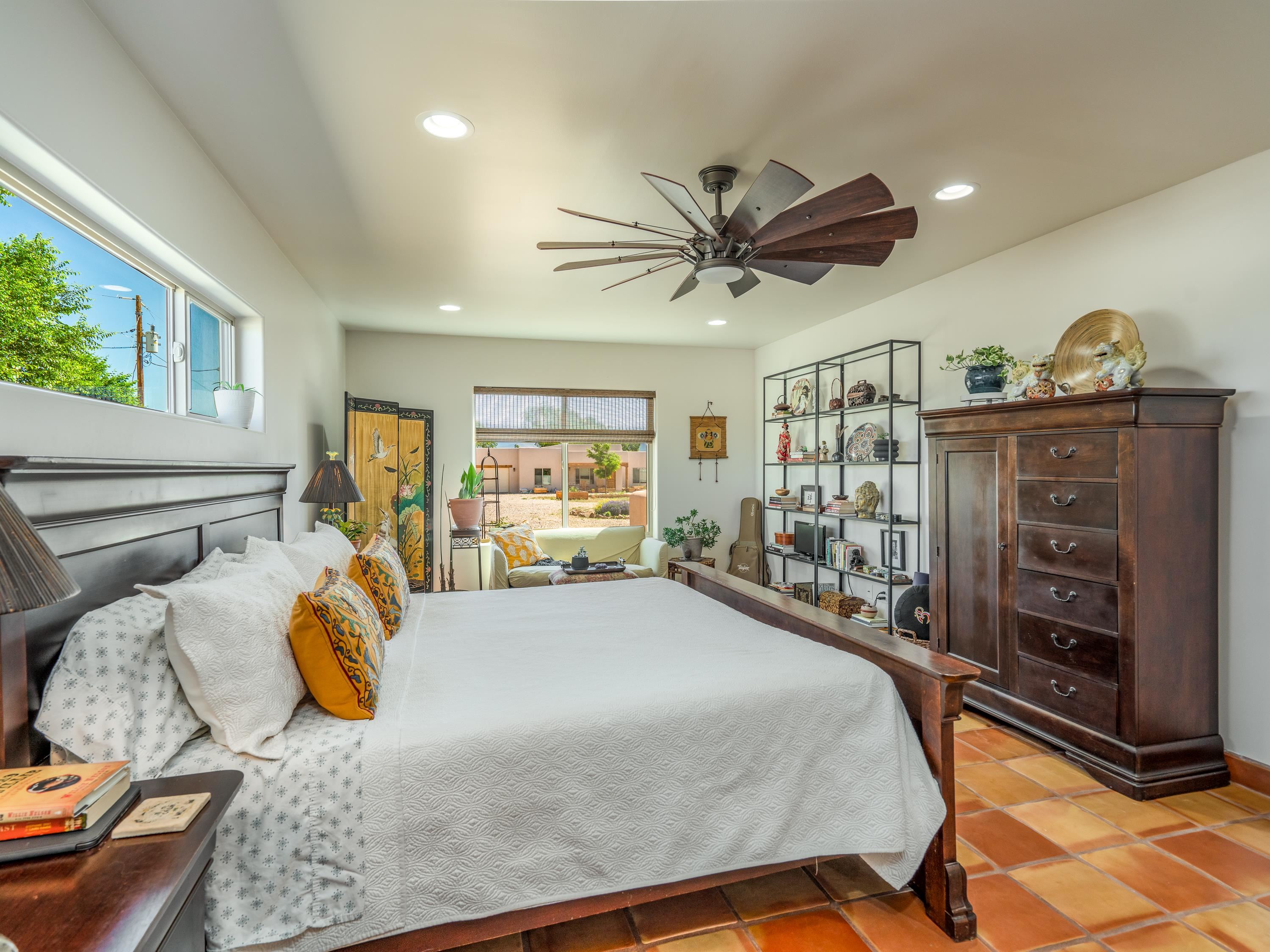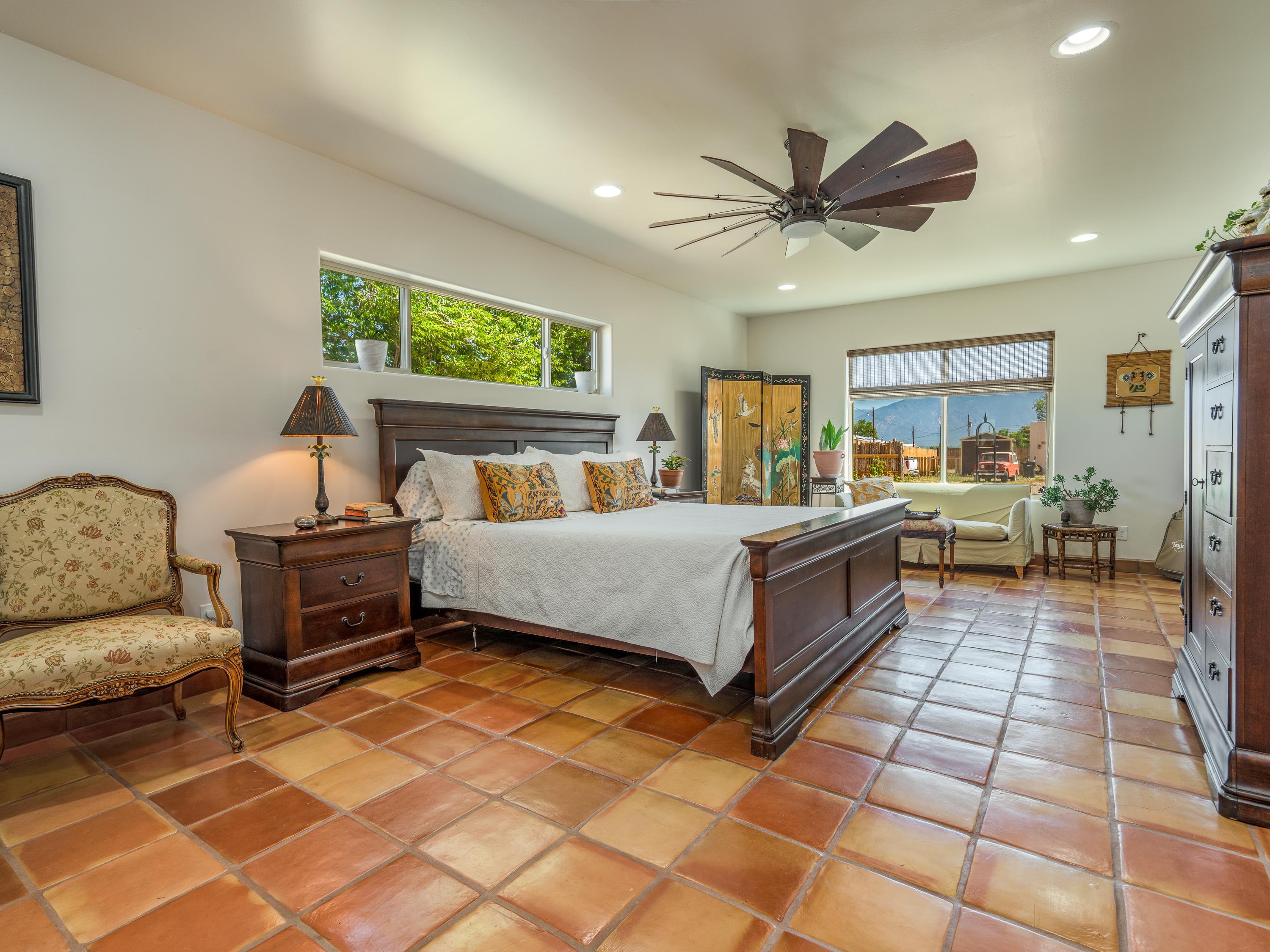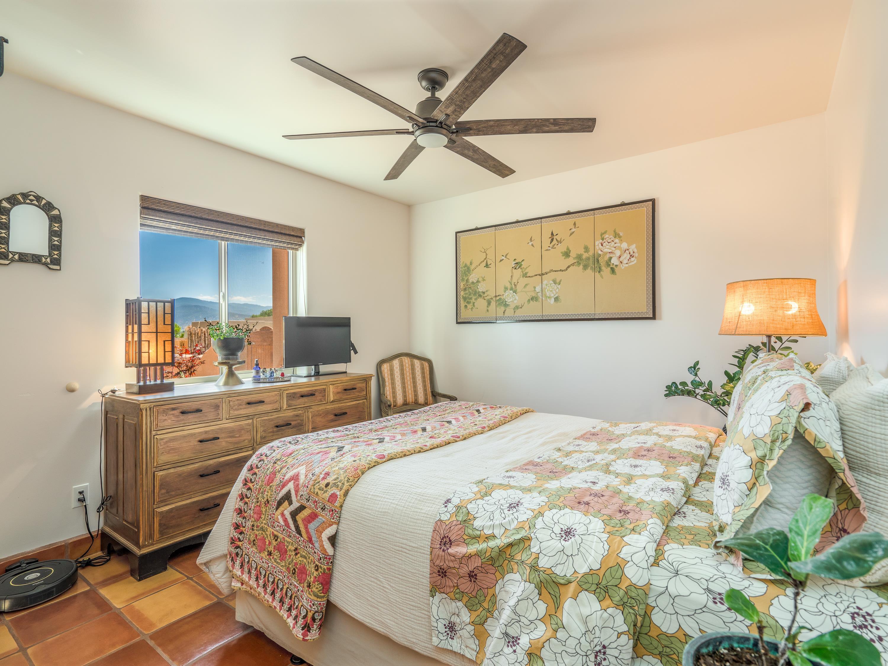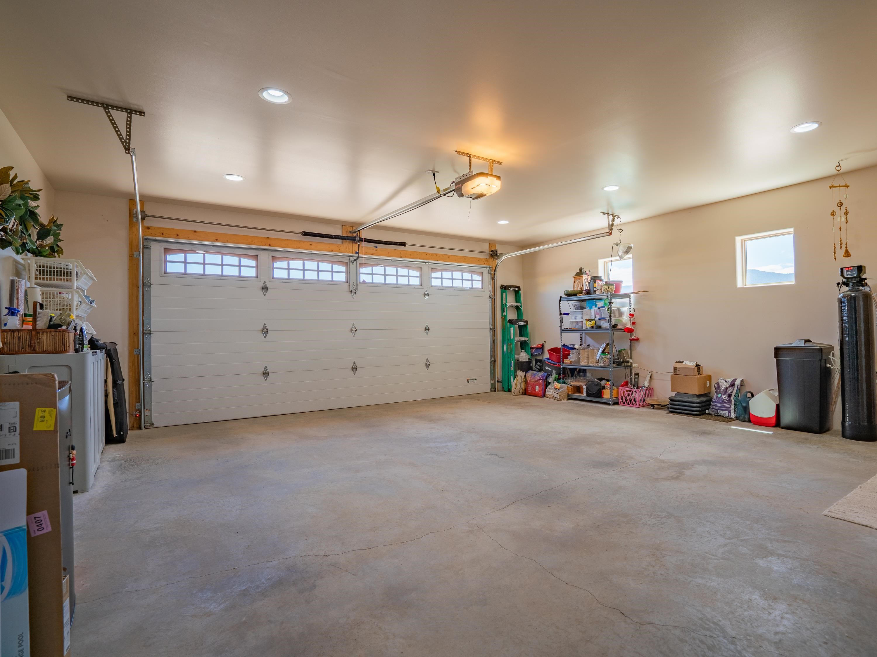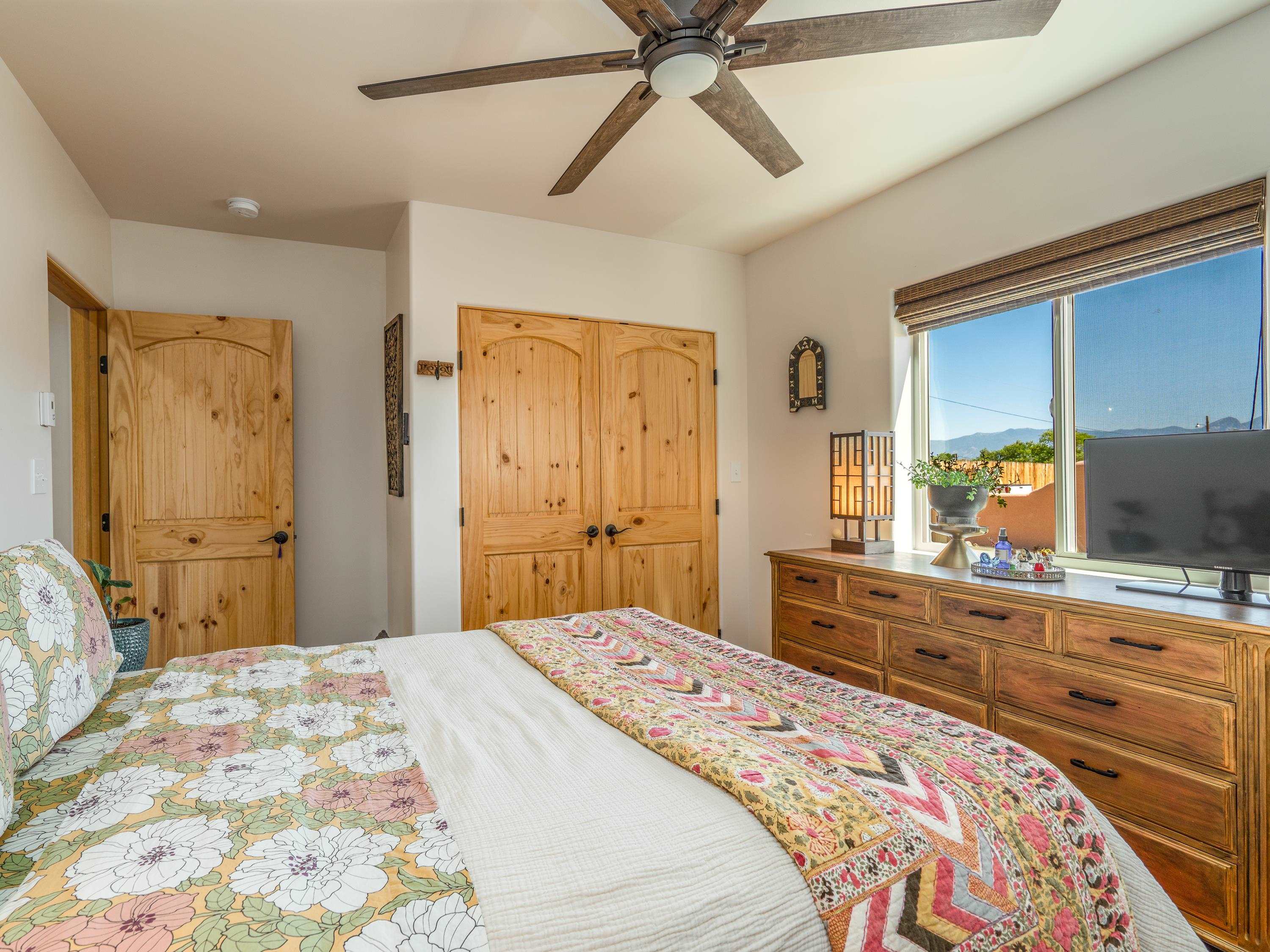 If privacy, comfort, and low maintenance are on your wish list, this is your spot. At the very end of a dead-end road, this home gives you that "away from it all" feeling--without actually being far from anything. No neighbors driving by. Just a well thought out property; start to finish! Inside, the kitchen is ready for serious cooking. We're talking oversized knotty alder cabinets, granite countertops, a huge breakfast bar, and a large walk-in-style pantry. The living room brings the Taos feel with a real wood-burning kiva fireplace finished with smooth plaster in a contrasting color, and a big window that frames the landscaped courtyard with the mountains behind it. Saltillo tile runs throughout the home; a must have here in Taos. Designed with smart separation in mind, the primary suite is on one side of the home while the two guest bedrooms (or bedroom + office) are on the other. The primary suite is BIG. Room for your king-size bed, dressers, and then some. The en-suite bathroom includes a walk-in shower with frameless glass, double sinks on a granite counter, custom alder cabinets, and even a built-in linen closet. The walk-in closet has room for your stuff AND your significant other. One of the two guest bedrooms is currently used as a home office with high-speed internet and the guest bathroom has all the beautiful finishes the primary has, including a frameless glass door. The whole house (yes, including the garage) is heated with radiant in-floor heat powered by an on-demand natural gas boiler. That same system also handles your hot water. If you ever felt like you needed more living space, the heated garage is an excellent outlet for your creativity. Extras? You've got them: natural gas hookup, shared well, water softener, radon mitigation system, and town sewer--so no septic headaches. Outside, you'll find a circular driveway, xeriscaping, trees, and privacy fencing in all the right places. The front courtyard is wrapped in a beautiful adobe wall with a nice wooden gate to let you out and keep your pets in! Tucked away in the back corner of the property you'll find a new Tough Shed for all the stuff you don't want to stuff into your garage. Built in 2022, the house is in great condition and is ready for you to move in, relax, and enjoy the reasons you are moving to Taos for!