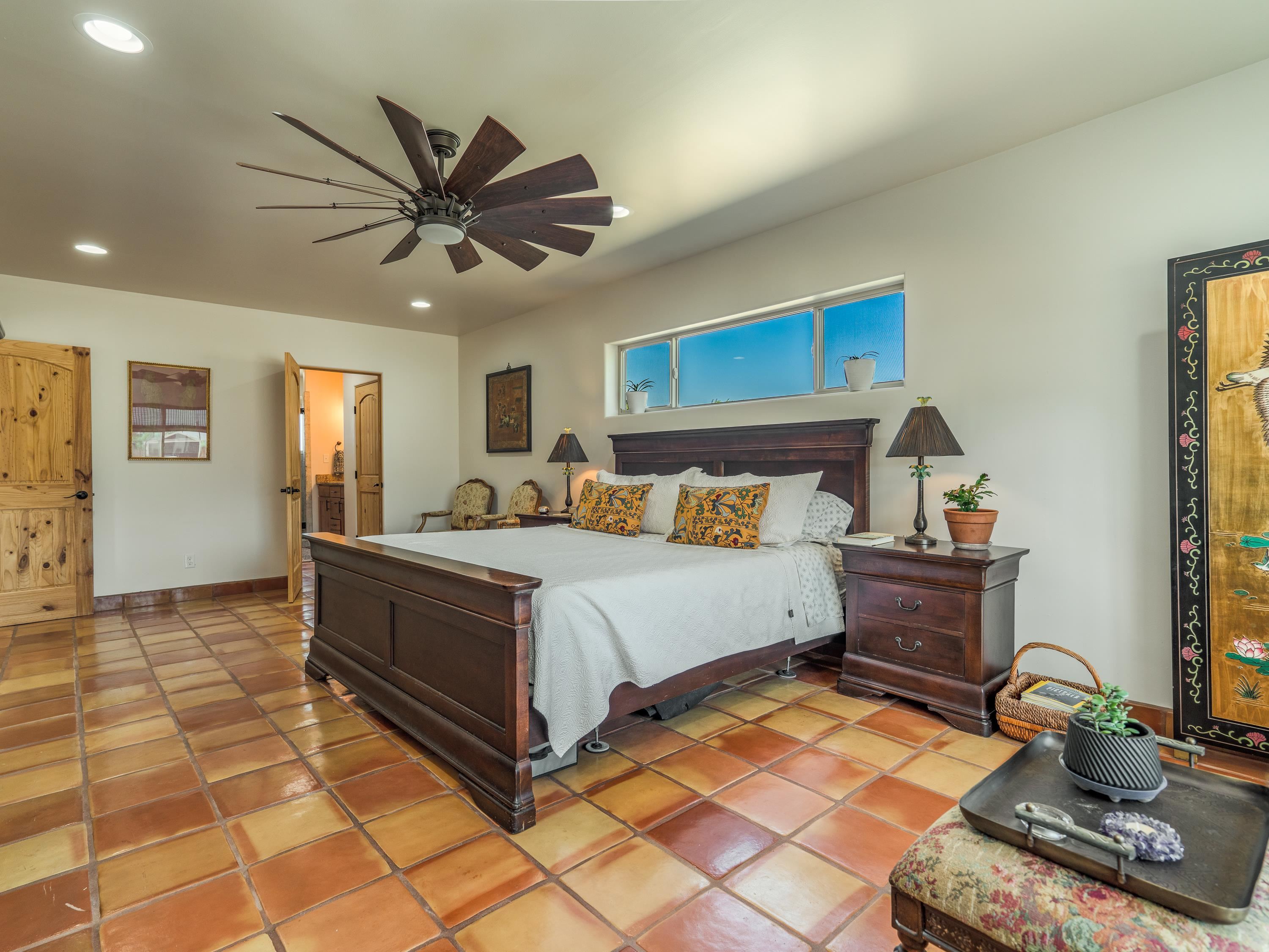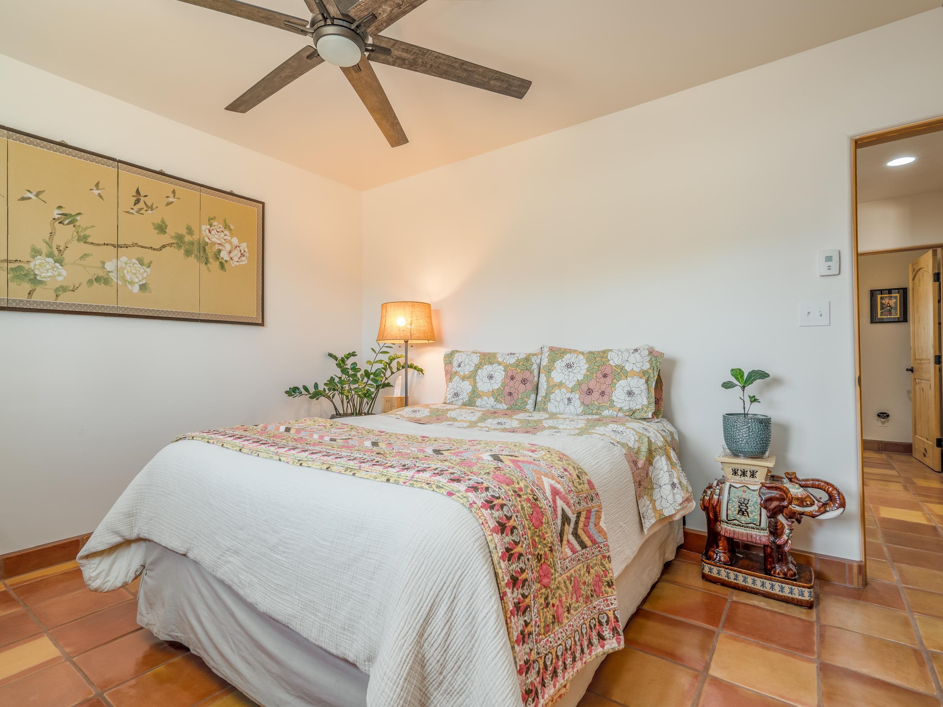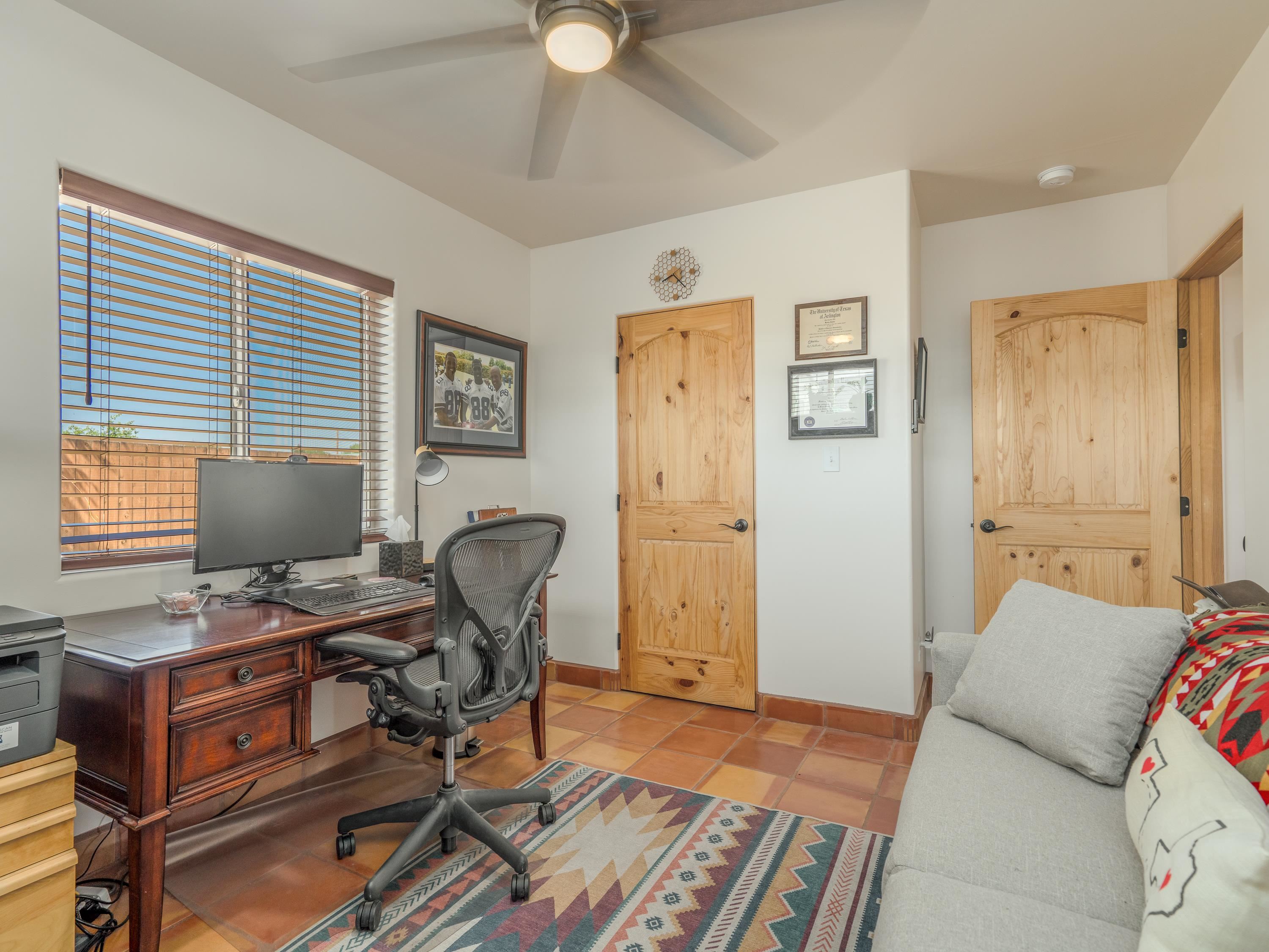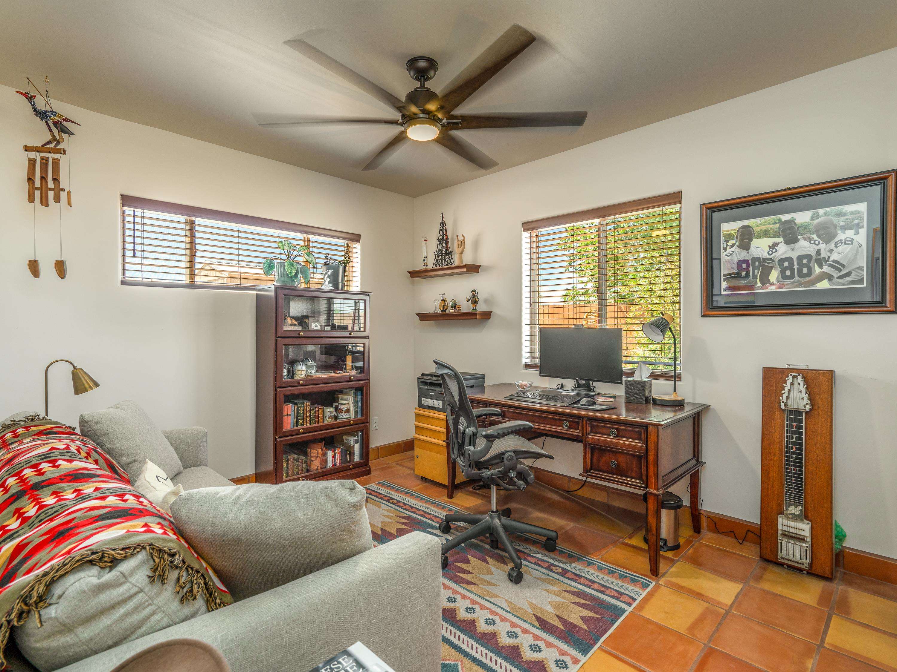 If privacy, comfort, and low maintenance are on your wish list, this is your spot. At the very end of a dead-end road, this home gives you that "away from it all" feeling--without actually being far from anything. No neighbors driving by. Just a well thought out property; start to finish! Inside, the kitchen is ready for serious cooking. We're talking oversized knotty alder cabinets, granite countertops, a huge breakfast bar, and a large walk-in-style pantry. The living room brings the Taos feel with a real wood-burning kiva fireplace finished with smooth plaster in a contrasting color, and a big window that frames the landscaped courtyard with the mountains behind it. Saltillo tile runs throughout the home; a must have here in Taos. Designed with smart separation in mind, the primary suite is on one side of the home while the two guest bedrooms (or bedroom + office) are on the other. The primary suite is BIG. Room for your king-size bed, dressers, and then some. The en-suite bathroom includes a walk-in shower with frameless glass, double sinks on a granite counter, custom alder cabinets, and even a built-in linen closet. The walk-in closet has room for your stuff AND your significant other. One of the two guest bedrooms is currently used as a home office with high-speed internet and the guest bathroom has all the beautiful finishes the primary has, including a frameless glass door. The whole house (yes, including the garage) is heated with radiant in-floor heat powered by an on-demand natural gas boiler. That same system also handles your hot water. If you ever felt like you needed more living space, the heated garage is an excellent outlet for your creativity. Extras? You've got them: natural gas hookup, shared well, water softener, radon mitigation system, and town sewer--so no septic headaches. Outside, you'll find a circular driveway, xeriscaping, trees, and privacy fencing in all the right places. The front courtyard is wrapped in a beautiful adobe wall with a nice wooden gate to let you out and keep your pets in! Tucked away in the back corner of the property you'll find a new Tough Shed for all the stuff you don't want to stuff into your garage. Built in 2022, the house is in great condition and is ready for you to move in, relax, and enjoy the reasons you are moving to Taos for!