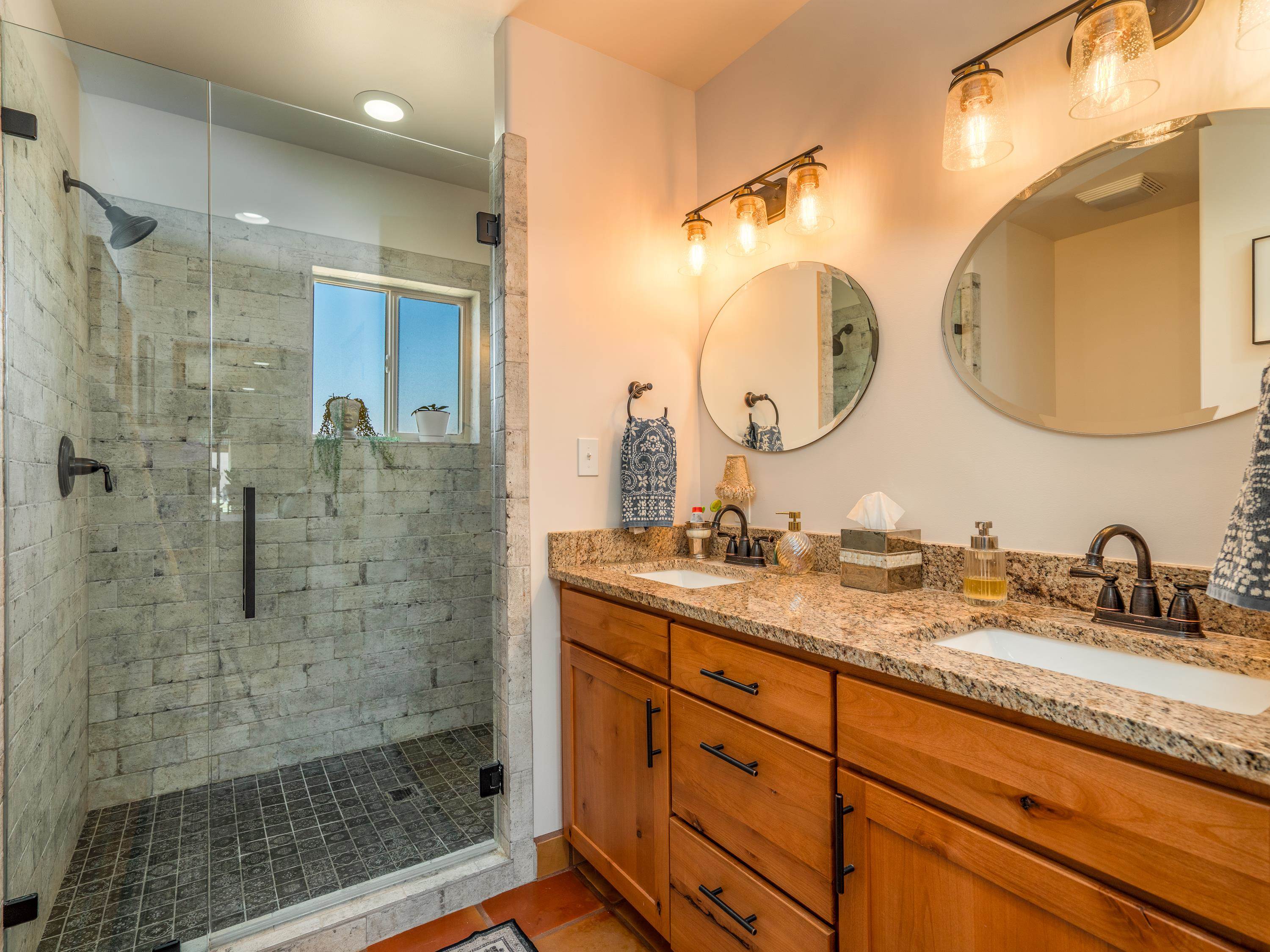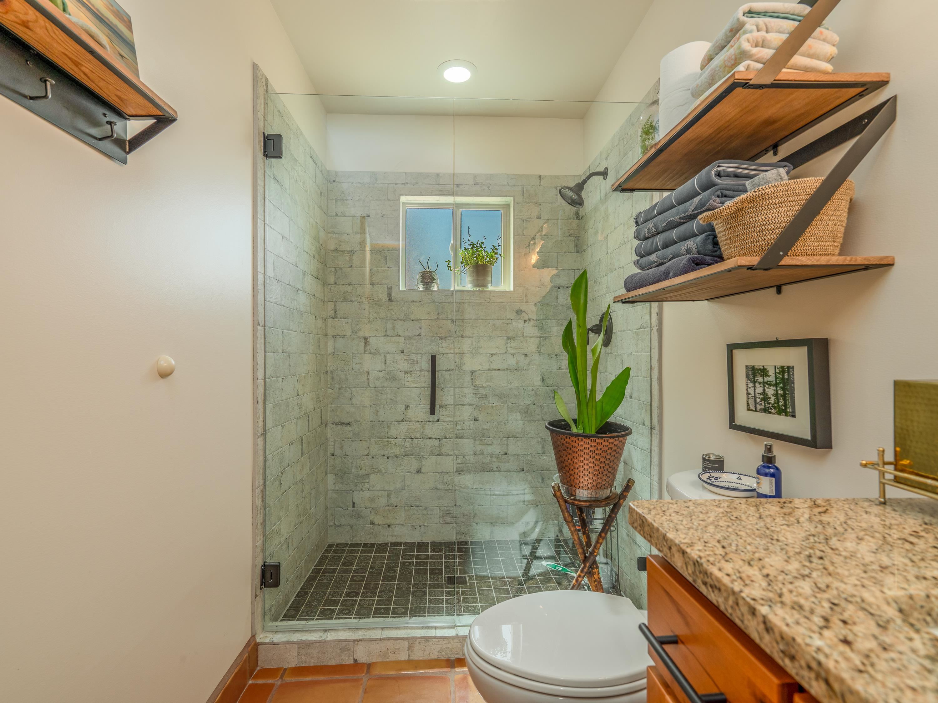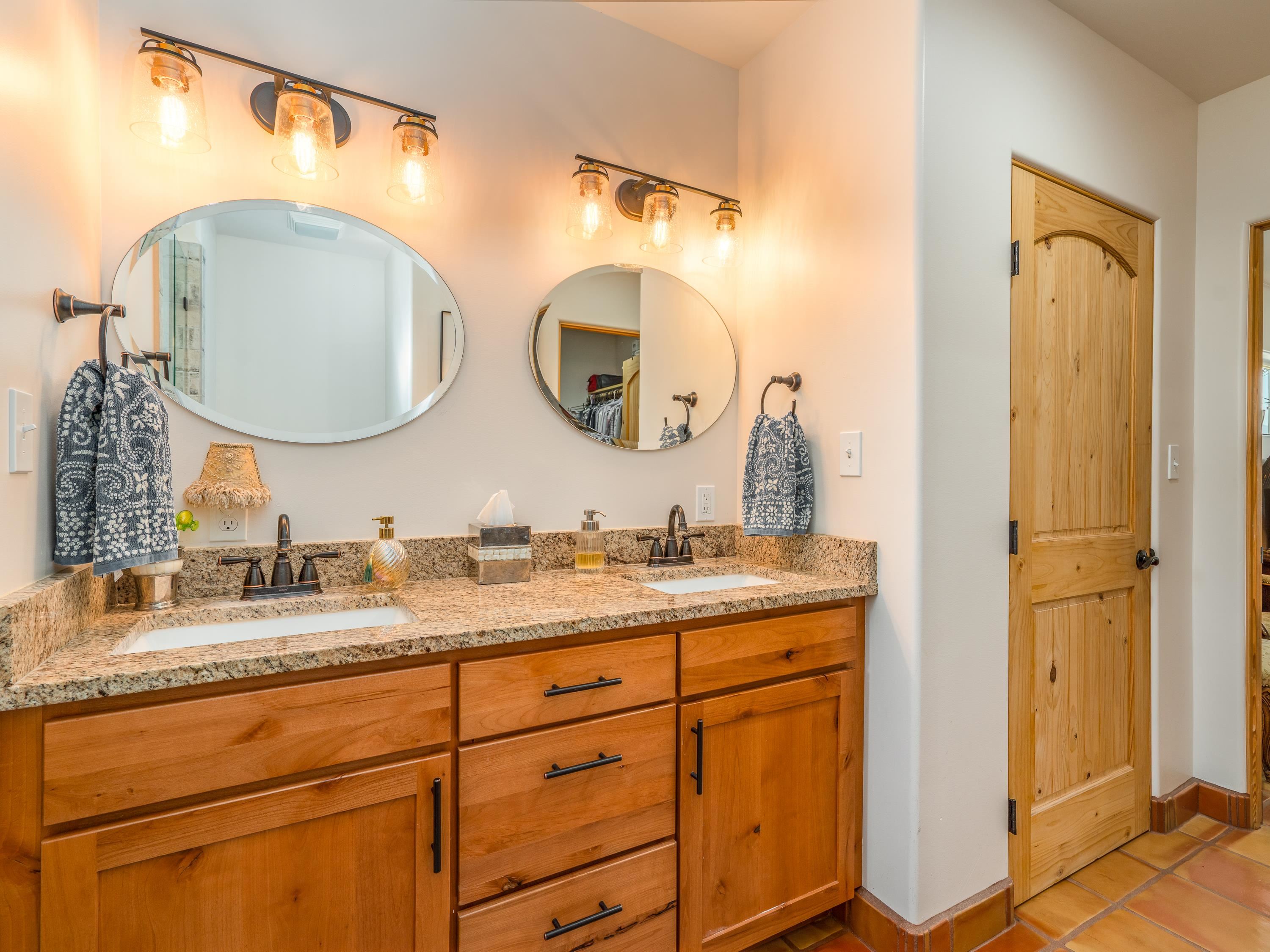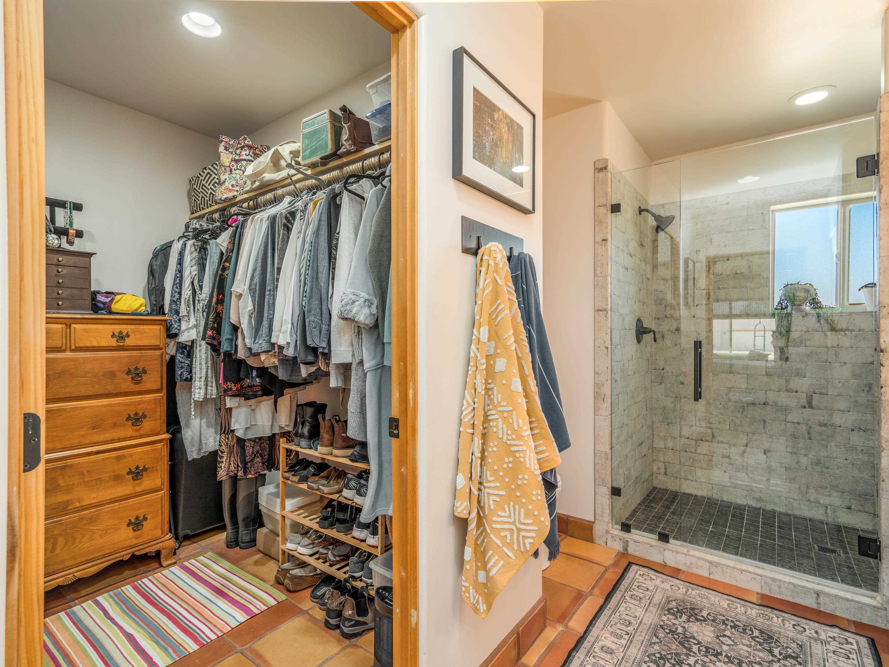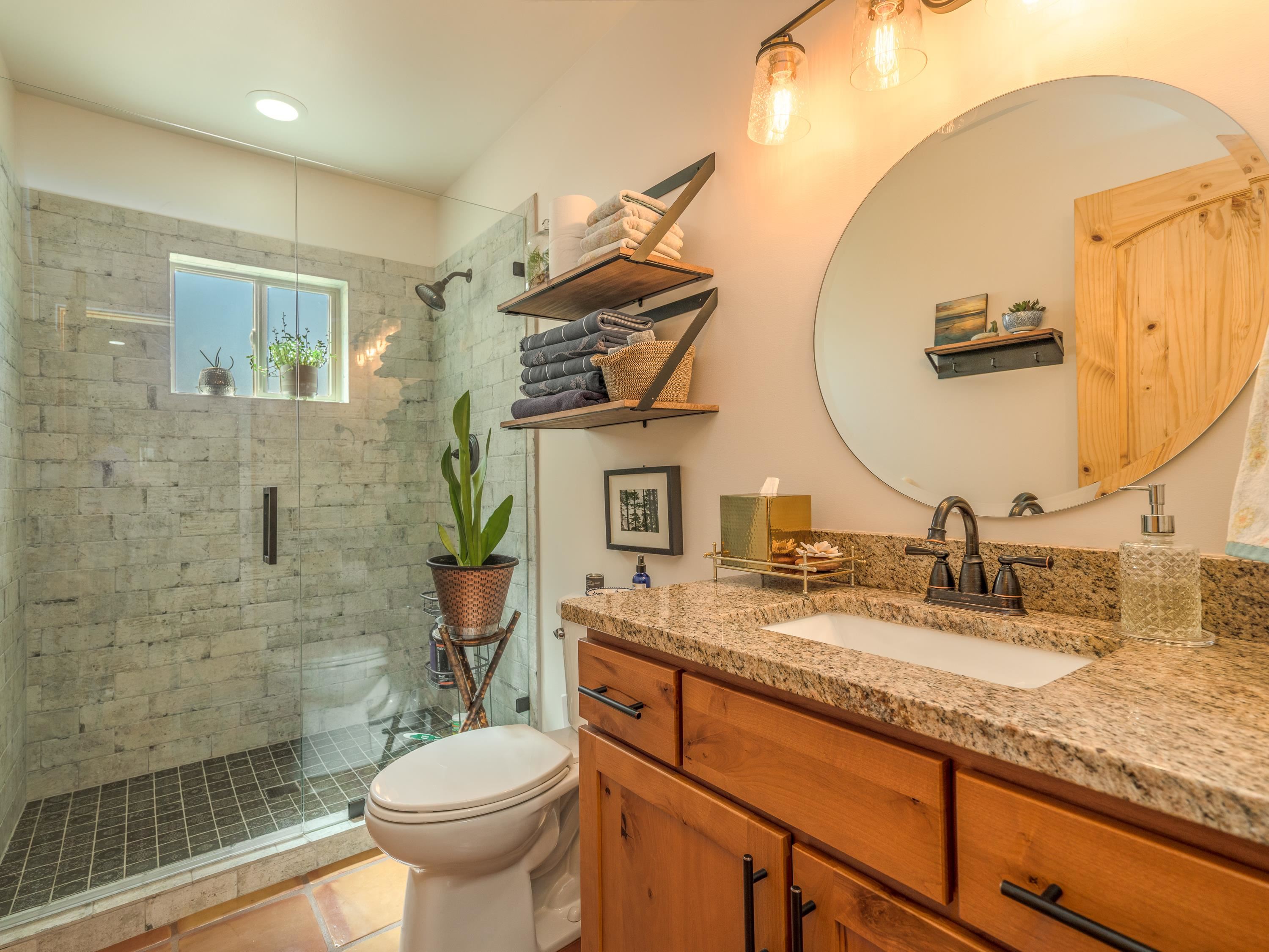 If privacy, comfort, and low maintenance are on your wish list, this is your spot. At the very end of a dead-end road, this home gives you that "away from it all" feeling--without actually being far from anything. No neighbors driving by. Just a well thought out property; start to finish! Inside, the kitchen is ready for serious cooking. We're talking oversized knotty alder cabinets, granite countertops, a huge breakfast bar, and a large walk-in-style pantry. The living room brings the Taos feel with a real wood-burning kiva fireplace finished with smooth plaster in a contrasting color, and a big window that frames the landscaped courtyard with the mountains behind it. Saltillo tile runs throughout the home; a must have here in Taos. Designed with smart separation in mind, the primary suite is on one side of the home while the two guest bedrooms (or bedroom + office) are on the other. The primary suite is BIG. Room for your king-size bed, dressers, and then some. The en-suite bathroom includes a walk-in shower with frameless glass, double sinks on a granite counter, custom alder cabinets, and even a built-in linen closet. The walk-in closet has room for your stuff AND your significant other. One of the two guest bedrooms is currently used as a home office with high-speed internet and the guest bathroom has all the beautiful finishes the primary has, including a frameless glass door. The whole house (yes, including the garage) is heated with radiant in-floor heat powered by an on-demand natural gas boiler. That same system also handles your hot water. If you ever felt like you needed more living space, the heated garage is an excellent outlet for your creativity. Extras? You've got them: natural gas hookup, shared well, water softener, radon mitigation system, and town sewer--so no septic headaches. Outside, you'll find a circular driveway, xeriscaping, trees, and privacy fencing in all the right places. The front courtyard is wrapped in a beautiful adobe wall with a nice wooden gate to let you out and keep your pets in! Tucked away in the back corner of the property you'll find a new Tough Shed for all the stuff you don't want to stuff into your garage. Built in 2022, the house is in great condition and is ready for you to move in, relax, and enjoy the reasons you are moving to Taos for!