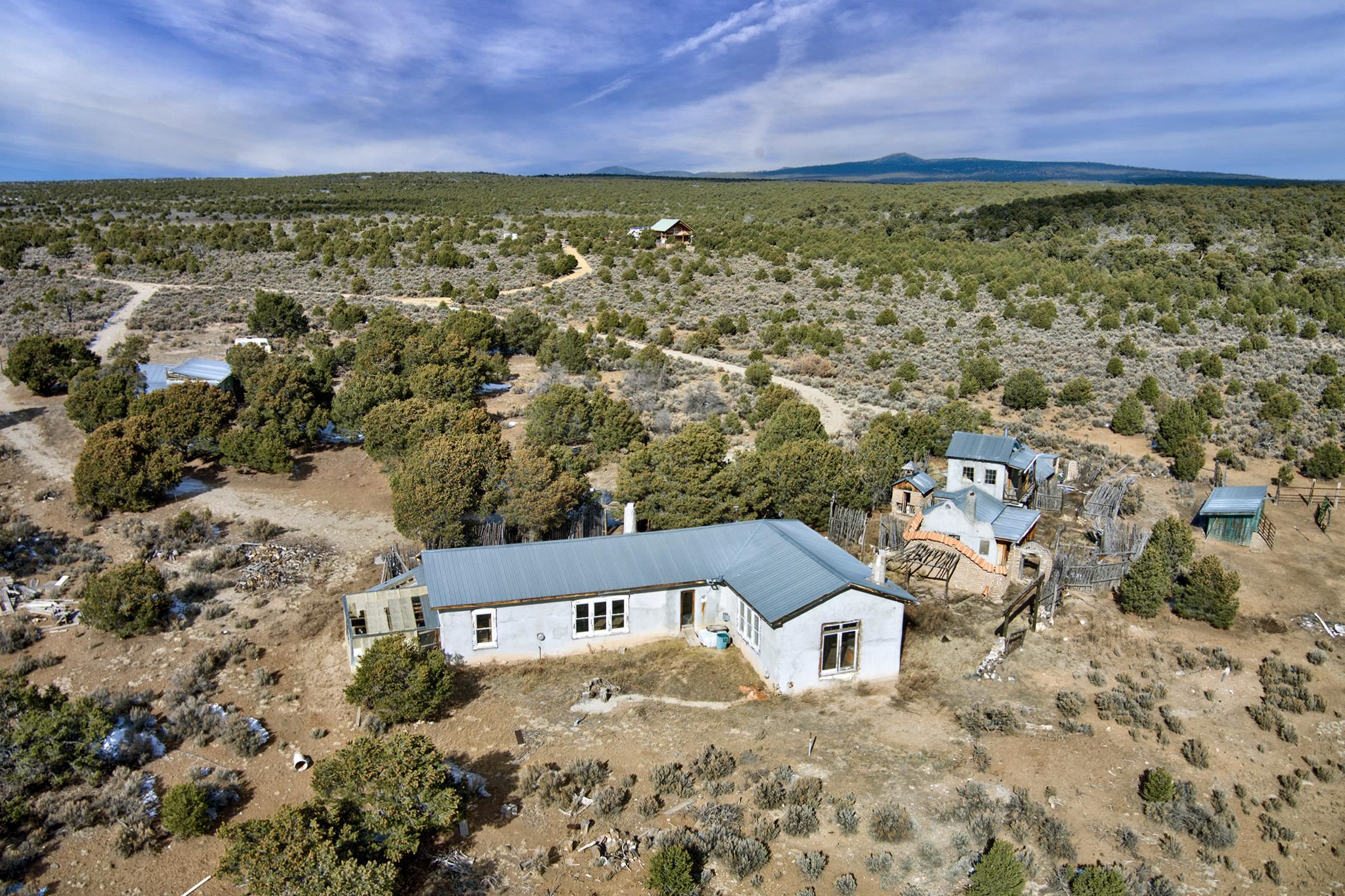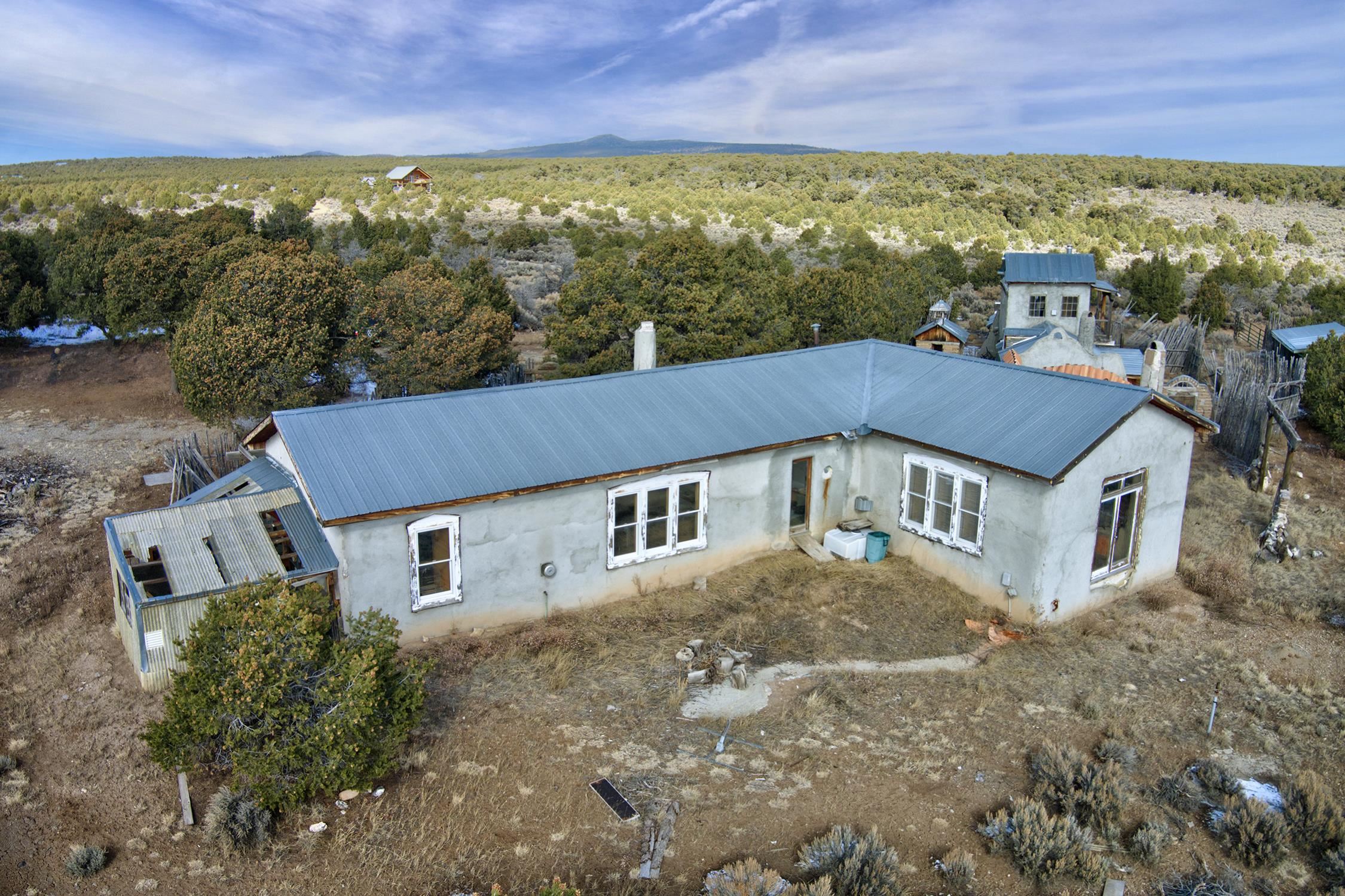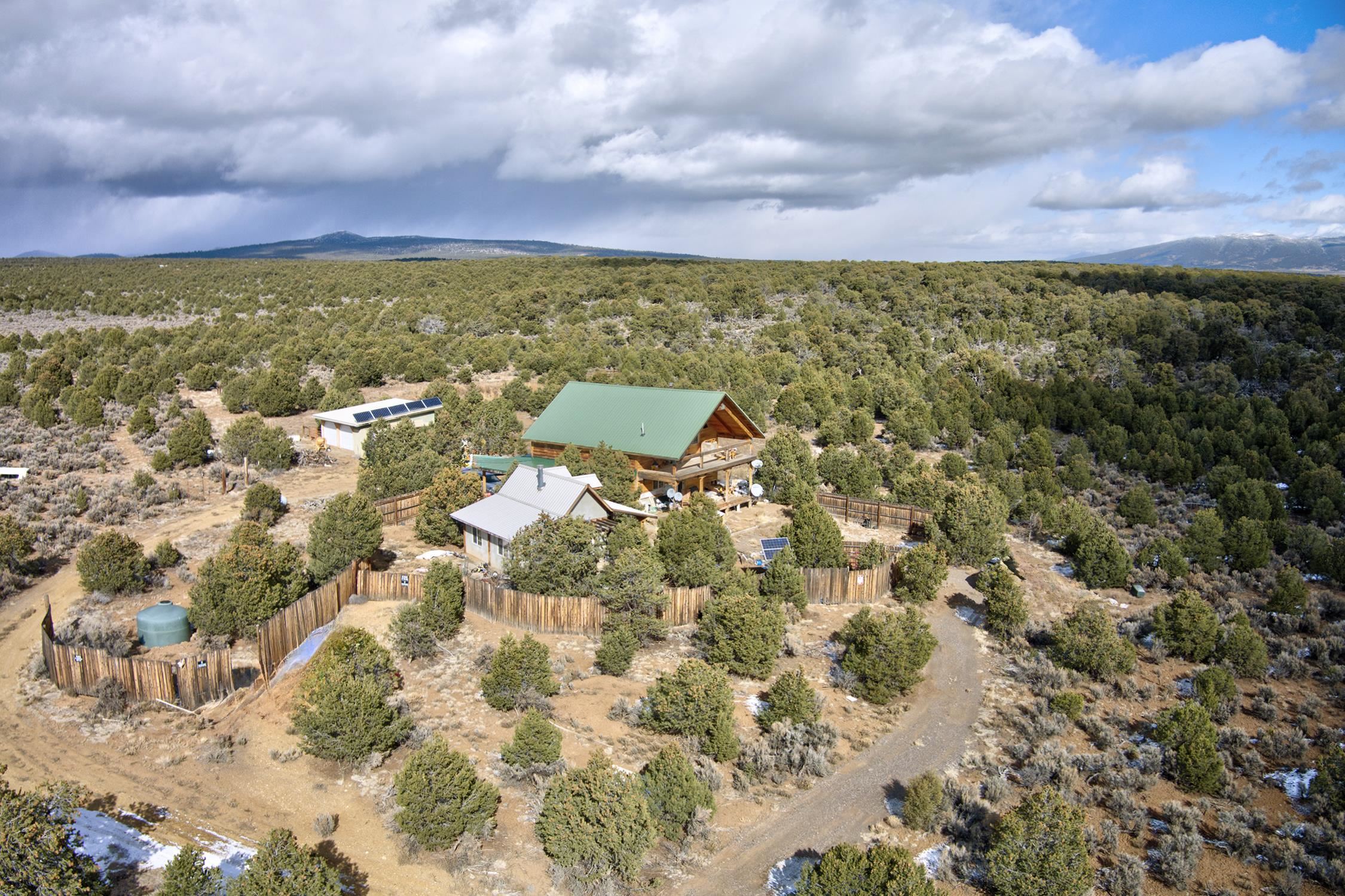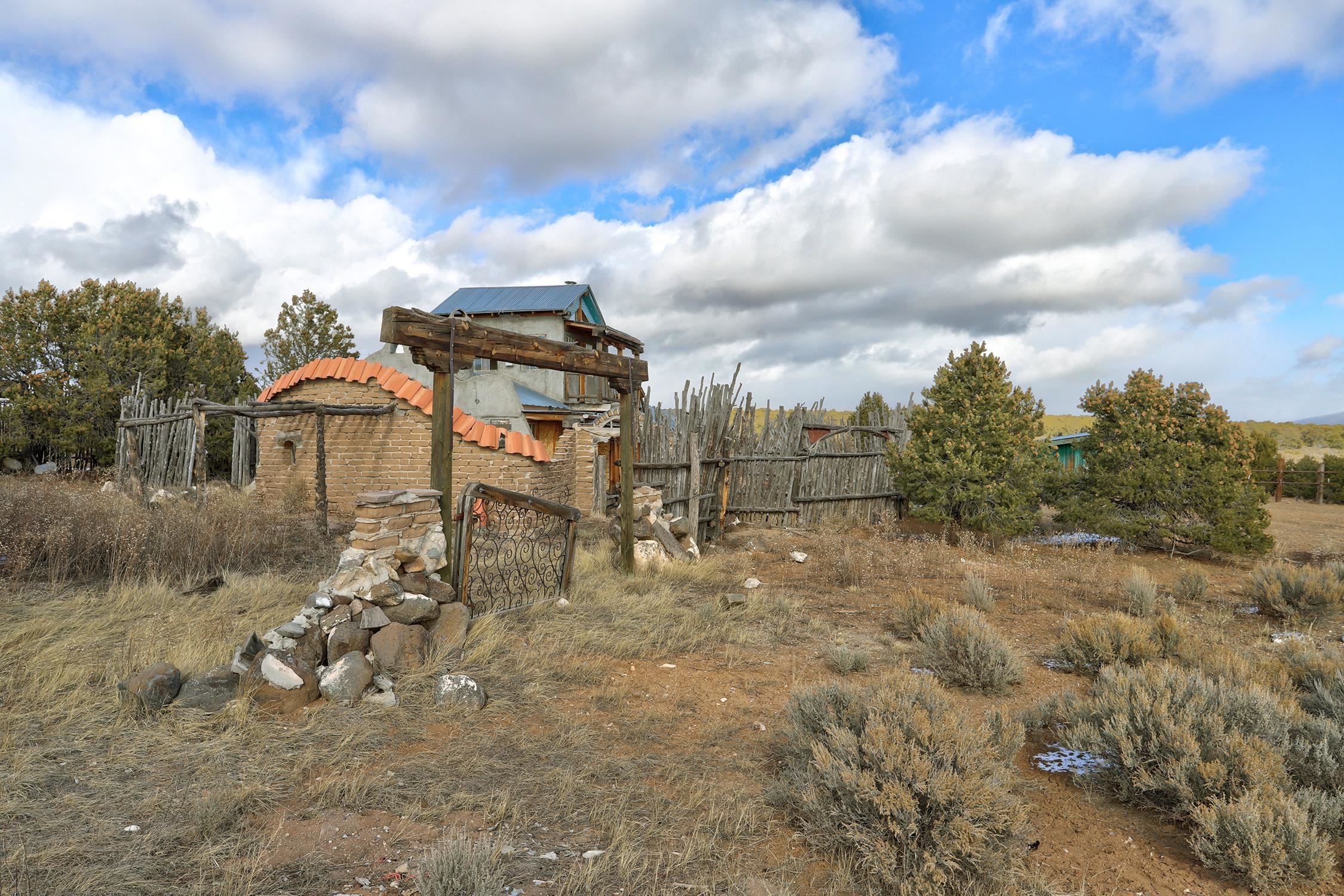 Welcome to Flying F Ranch, a rare 288.59-acre property where Southwestern charm meets sustainable living. With unobstructed views stretching 35 miles, this one-of-a-kind ranch is a rugged sanctuary awaiting your creative vision. Two primary residences provide plenty of space for everyone. Enjoy unmatched views from the second-floor primary suite and spacious covered balcony of the 2-bedroom, 1.5 bath chalet. The classic adobe home features a sunken living room 2 Carmen Velarde fireplaces, a wood stove, and a galley kitchen with custom tile countertops and backsplash and brick flooring. Outbuildings include a 2-room cabin, your own turn of the century adobe chapel, two hay barns, a workshop, garage and more. Plenty of space to roam, raise, or ride. We'll provide the bones and bling, you bring your imagination. Whether you're seeking a retreat, a working ranch, or an inspiring canvas for your dreams, Flying F Ranch is an offering unlike any other. A place of wild, panoramic freedom, where sunrises and starlit skies become daily rituals.