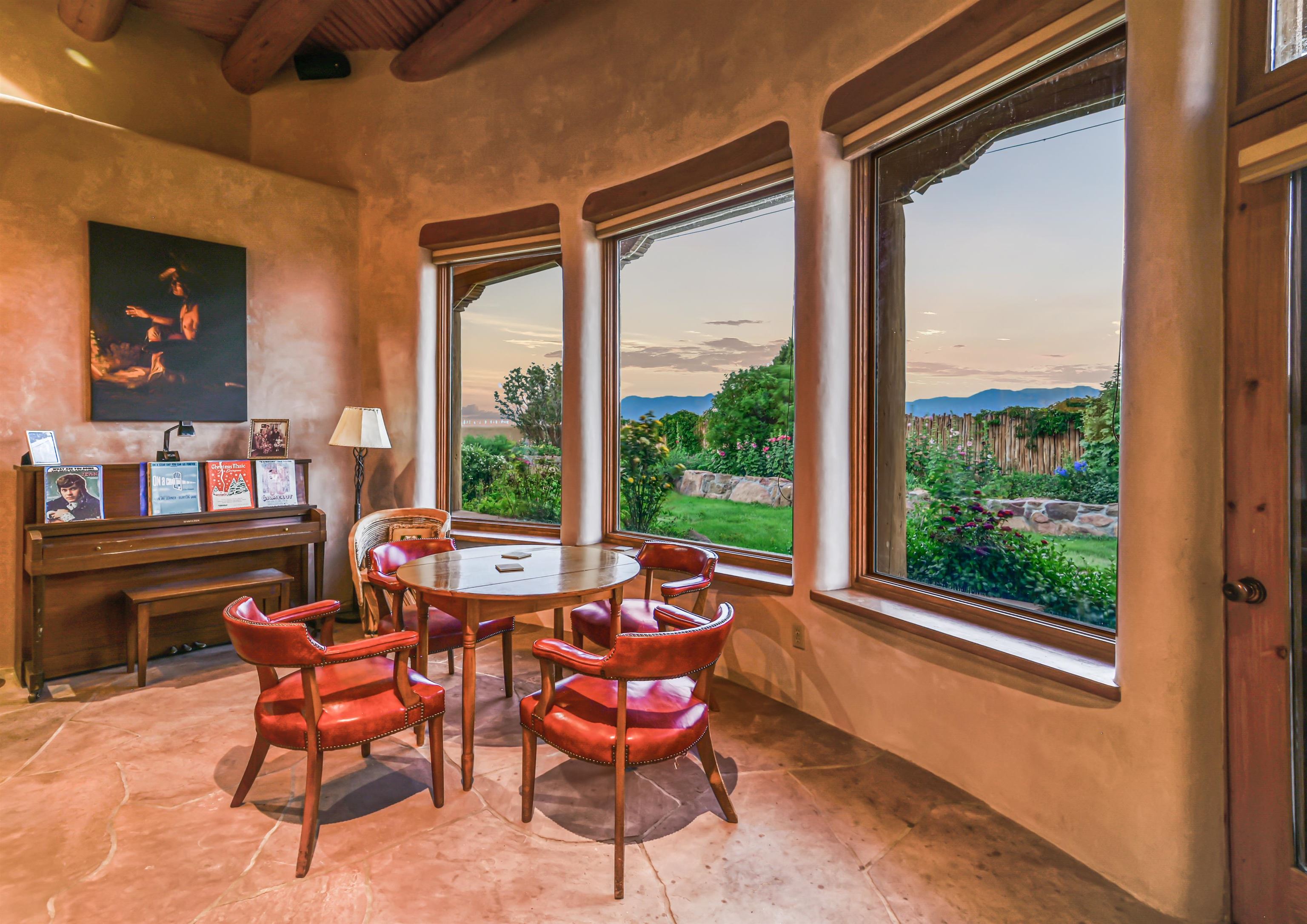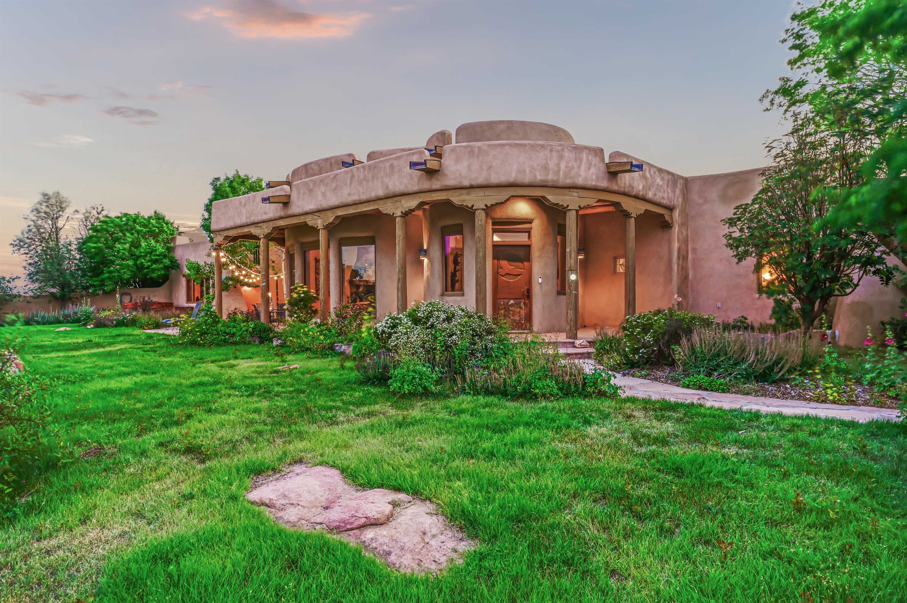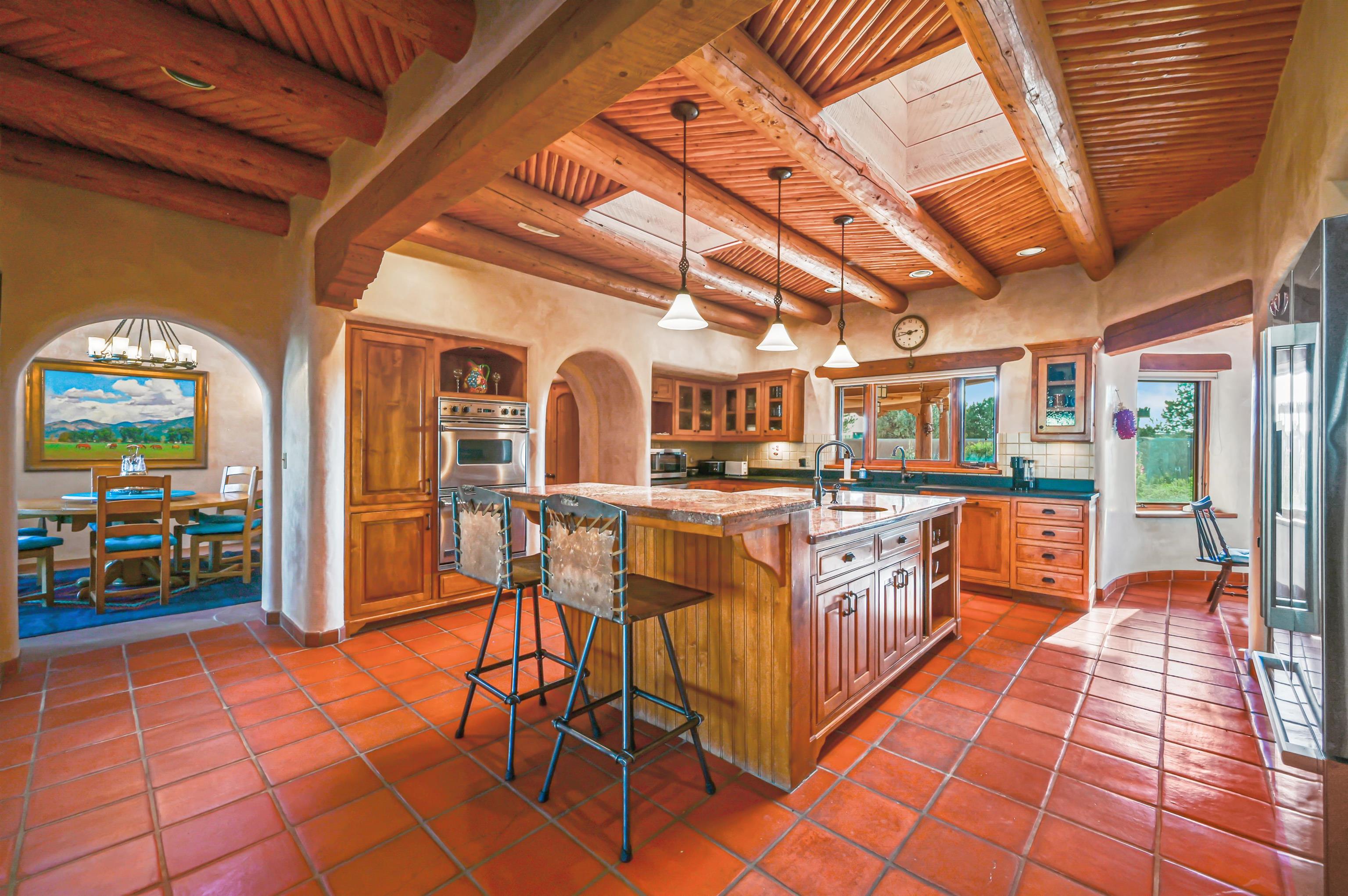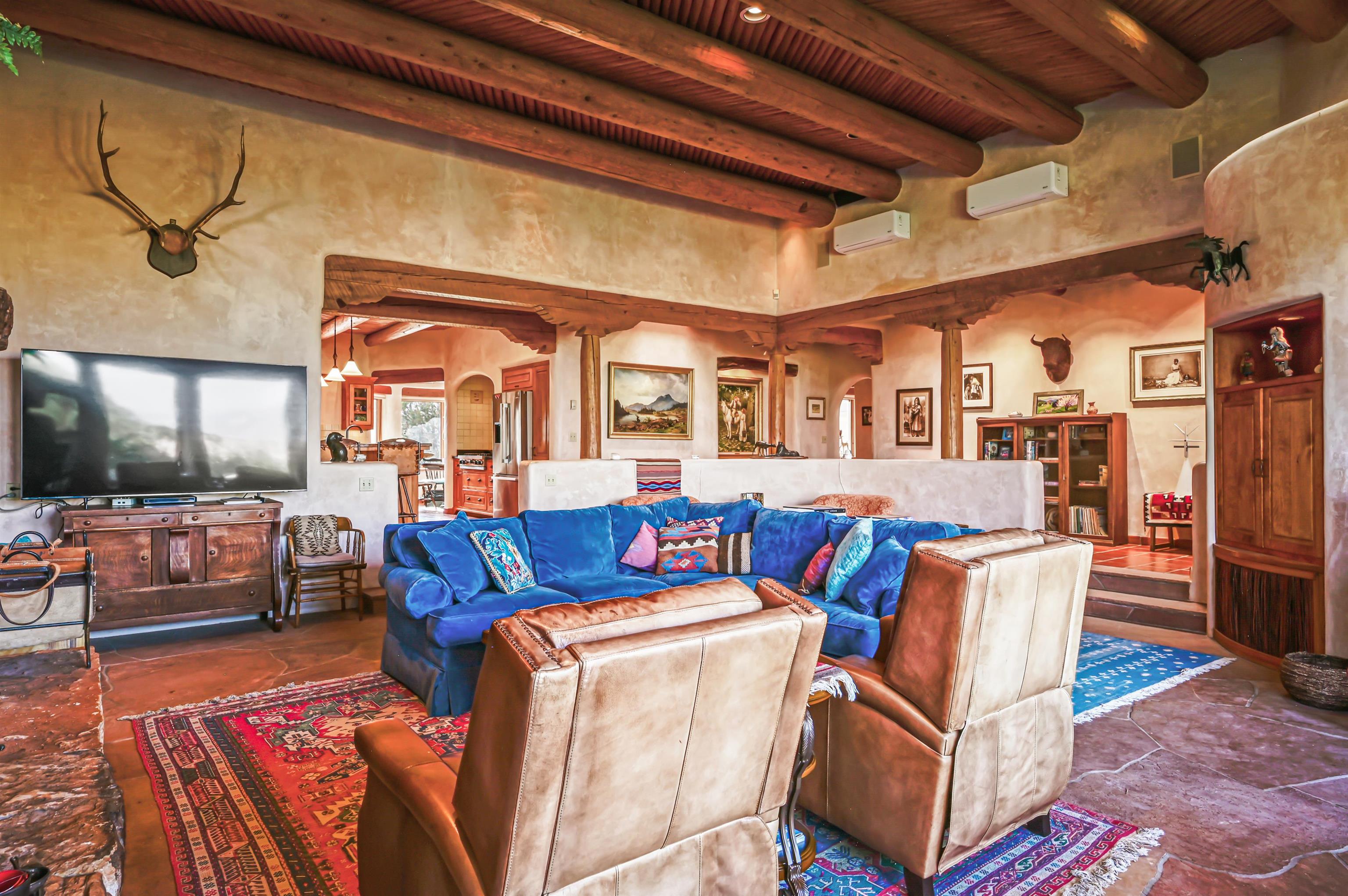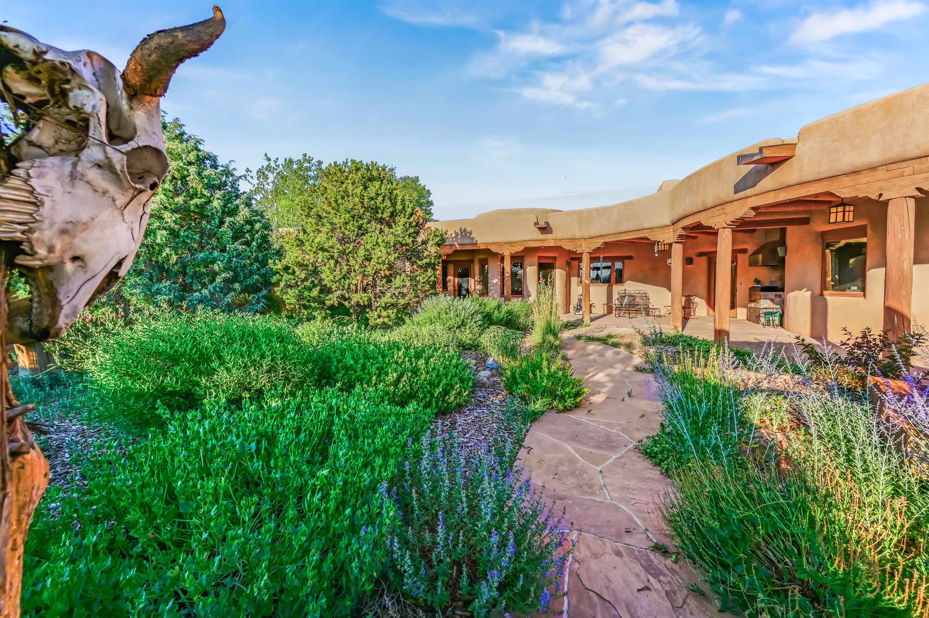 Welcome to a truly exceptional Northern New Mexico retreat--110 acres of serene beauty and luxurious living. This remarkable property features a stunning 4-bedroom, 3-bath primary residence once showcased in Enchanted Homes magazine, a testament to its timeless design, high-level craftsmanship, and one-of-a-kind charm. Inside, you'll find hand-carved beams, a magnificent stone fireplace, and warm, inviting spaces designed for comfort and elegance. The chef's kitchen is a dream for culinary enthusiasts, while multiple private patios and lush, thoughtfully landscaped gardens create a true oasis in the desert--perfect for quiet mornings, lively gatherings, and starlit evenings. Conveniently located just 10 quick minutes west of the Taos Regional Airport, this extraordinary estate is as functional as it is beautiful. A grid-tied solar system, private well, and high-speed fiber optic internet ensure modern sustainability and convenience. The land includes well-appointed outbuildings: storage, tack room, hay barn, and a 3-bedroom, 2-bath manufactured caretaker's home--ideal for guests, a ranch manager, or extended family. Take in breathtaking 360-degree views from every angle and enjoy the option for an elk hunting license, adding unique appeal for outdoor enthusiasts. Whether you dream of tending gardens, riding horses, or simply soaking up the peace and privacy under expansive skies, this property invites you to experience the very best of refined country living. If you've been searching for a luxurious private sanctuary that must be seen to be truly appreciated, this is the one.
