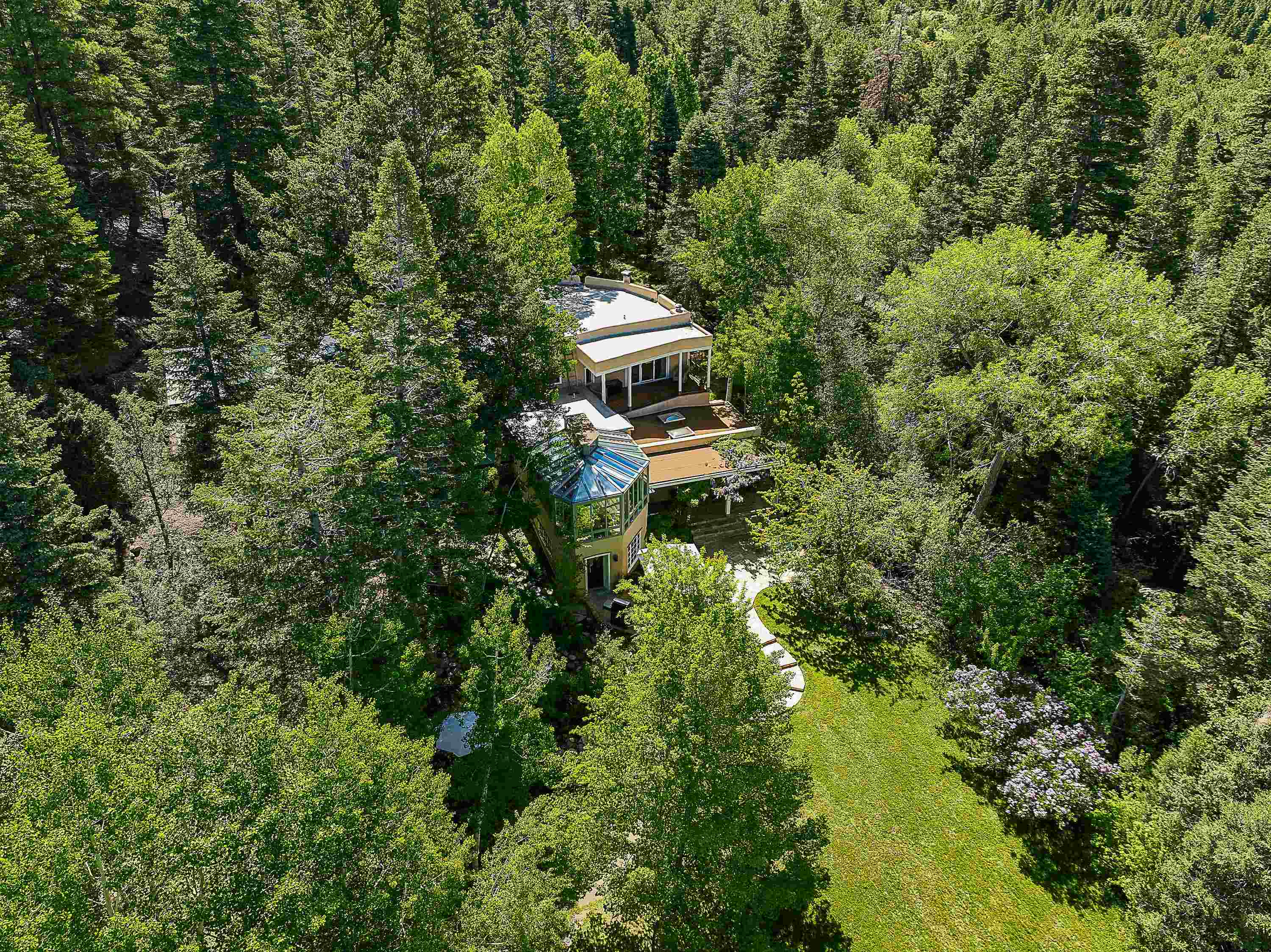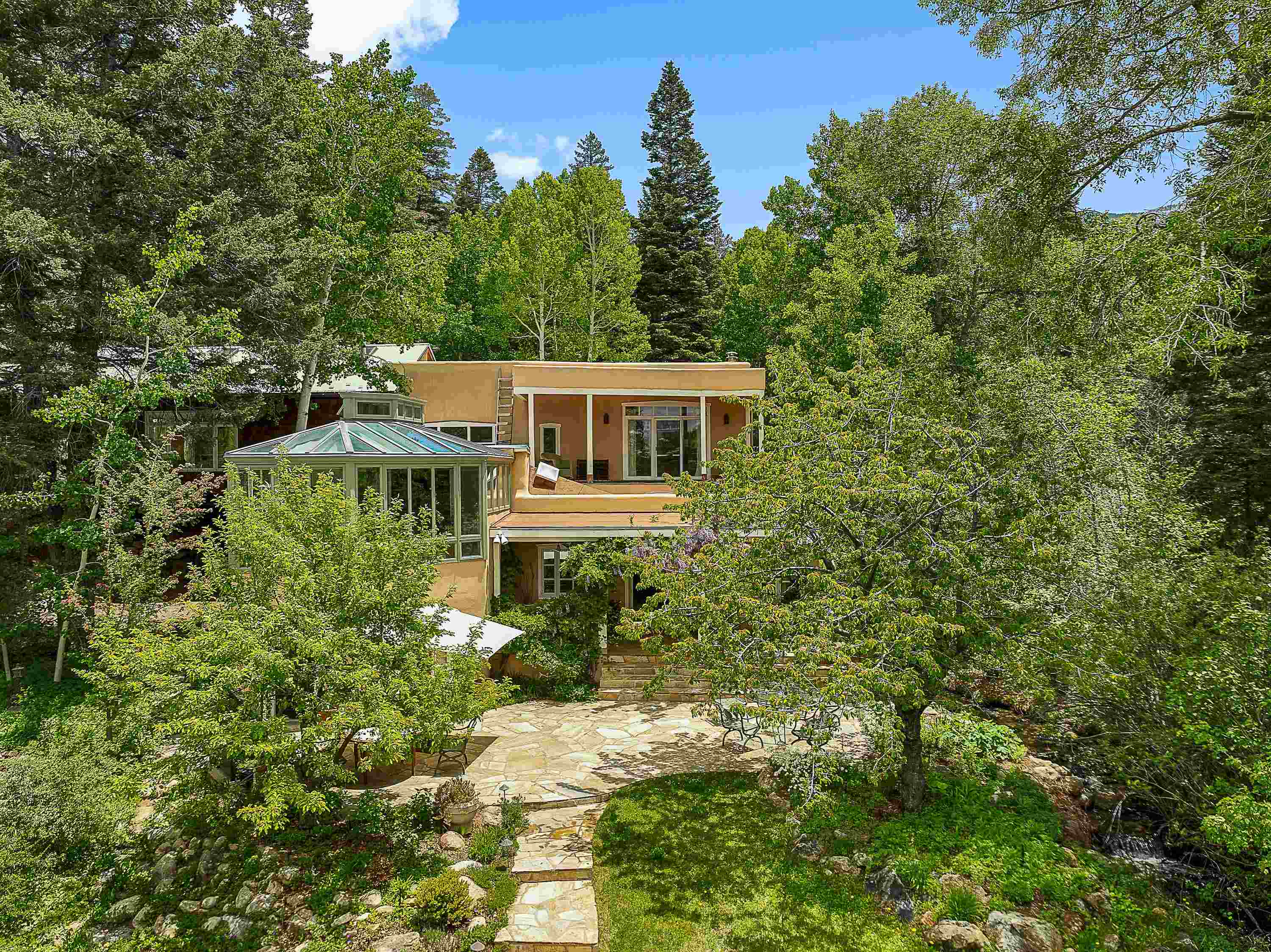 Comfortably tucked beneath the towering El Salto Mountain, sits this special 5.25 acre estate alongside the Arroyo Seco stream. This green oasis is defined by water, tall trees, birdsong and woodland gardens, by clear light, forever views and cool, starry nights. From its origins in the early 1970's, generously expanded over several decades, the home is built in harmony with the land. Each level flows naturally from the last, echoing the cascading waters just outside, with terraces, nooks, and rooms unfolding like the curves of the Creek itself. Both informal and refined, the house feels completely welcoming and comfortable. Gorgeous Idaho quartzite flagstone moves seamlessly from the broad front portal draped with Wisteria into the kitchen. The principal living space has a dreamy kitchen with a fantastic 1954 red enamel Chambers stove, a wonderful creek-side sitting area, a living room with wide plank reclaimed heart pine floors, a dry-stack stone fireplace, a library nook, a dining area, and three sets of French doors leading out onto a wrap-around patio that follows the banks of the winding creek. Salvaged and repurposed cypress shutters from New Orleans became beautiful wainscot paneling and doors. The home is anchored by a spectacular second story glass sunroom, made and installed by Pennsylvania Mennonite and Amish craftsmen from Renaissance Conservatories. The magical room with a warm quartzite floor is bathed in natural light that invites the outdoors in- perfect for morning coffee, quiet reflection, reading, writing, or entertaining under the stars. From here, a short rise of stairs leads to a landing off of which radiate two large, private suites. The western facing suite has a cozy sitting area with a large fireplace and a patio overlooking the stream and endless views to the Rio Grande Gorge and beyond. The corresponding suite is bathed in beautiful natural light from the large windows, vaulted ceilings and skylights. It feels like a cozy nest tucked into the treed canopy surrounding it. The third bedroom suite is can be accessed from the main living level or via a private door from the gardens. A delightful guesthouse with a complete kitchen sits at the base of a grassy lawn. Under the same roof, yet with it's own entrances from the lawn or garage is an additional light-filled room currently used as a home gym/office, and has a half bathroom. Versatile spaces amongst a verdant landscape. The stream brings the music of water to your daily rhythms. In the evening a cool breeze comes down the creek, and with it the gift of sleeping under a light blanket...windows wide open, stream trickling along. Natural springs feed native plants and perennials that bloom spring and summer. Golden Aspens shimmer and quake in the fall. Over 60 varieties of flowering trees, shrubs and perennials make for a true botanical delight. This is northern New Mexico at its most magical. Simply stroll out the door to hike and bike. No bike racks and drives to a trailhead necessary. Contiguous with quiet Taos Pueblo lands. Hiking trails lead to the El Salto waterfall and Carson National Forest. It's an easy 12 mile/20 minute drive to Taos Ski Valley. The location is secluded, yet sneaky-convenient. Meticulously maintained by one Owner for over 50 years, this is the first opportunity for another lucky soul to call this Home. This one-of-a-kind mountain sanctuary blends privacy, luxury and natural beauty in a way that simply can't be replicated. It is a truly special spot- Private Luxury at the Edge of Wild.