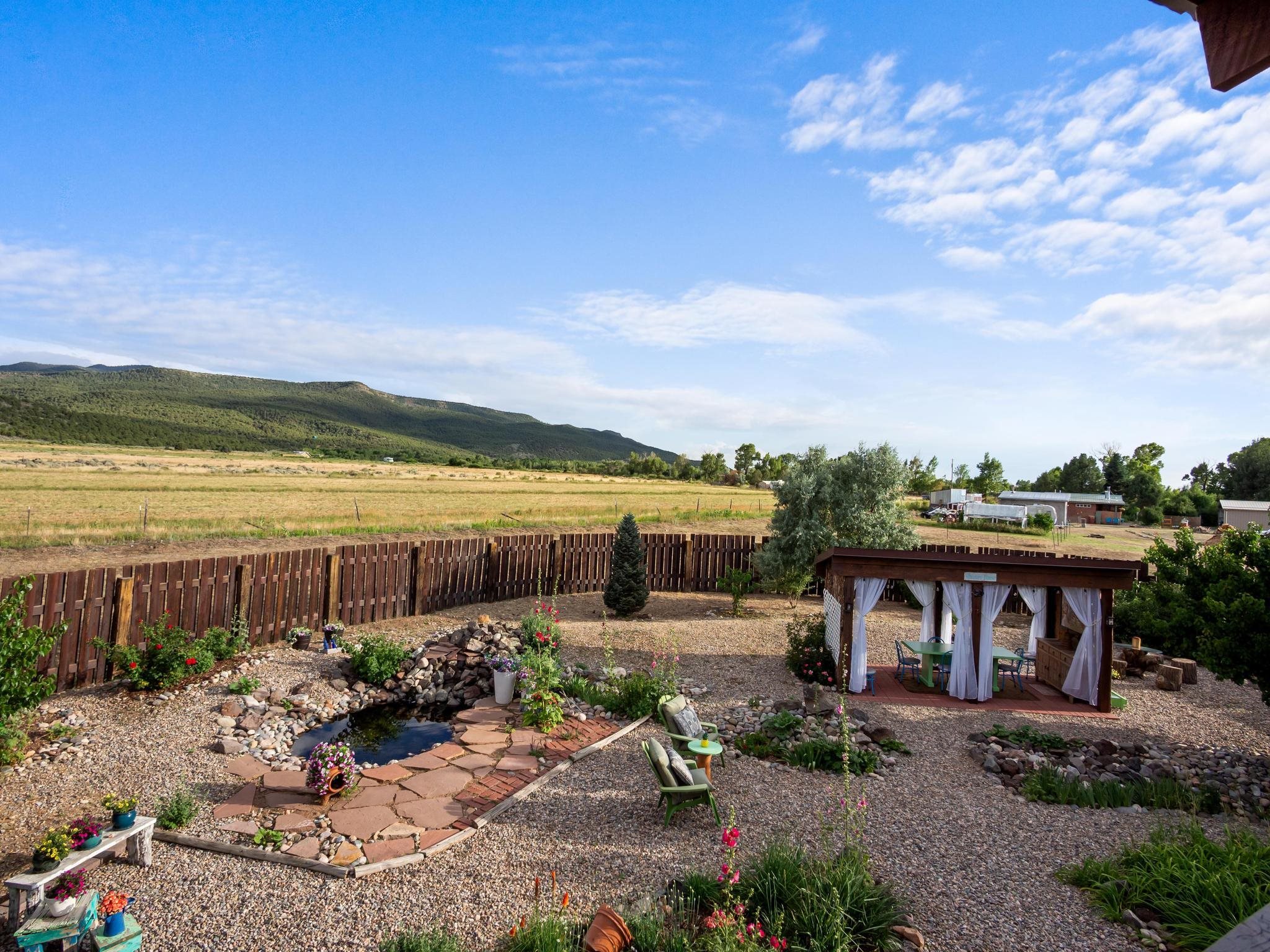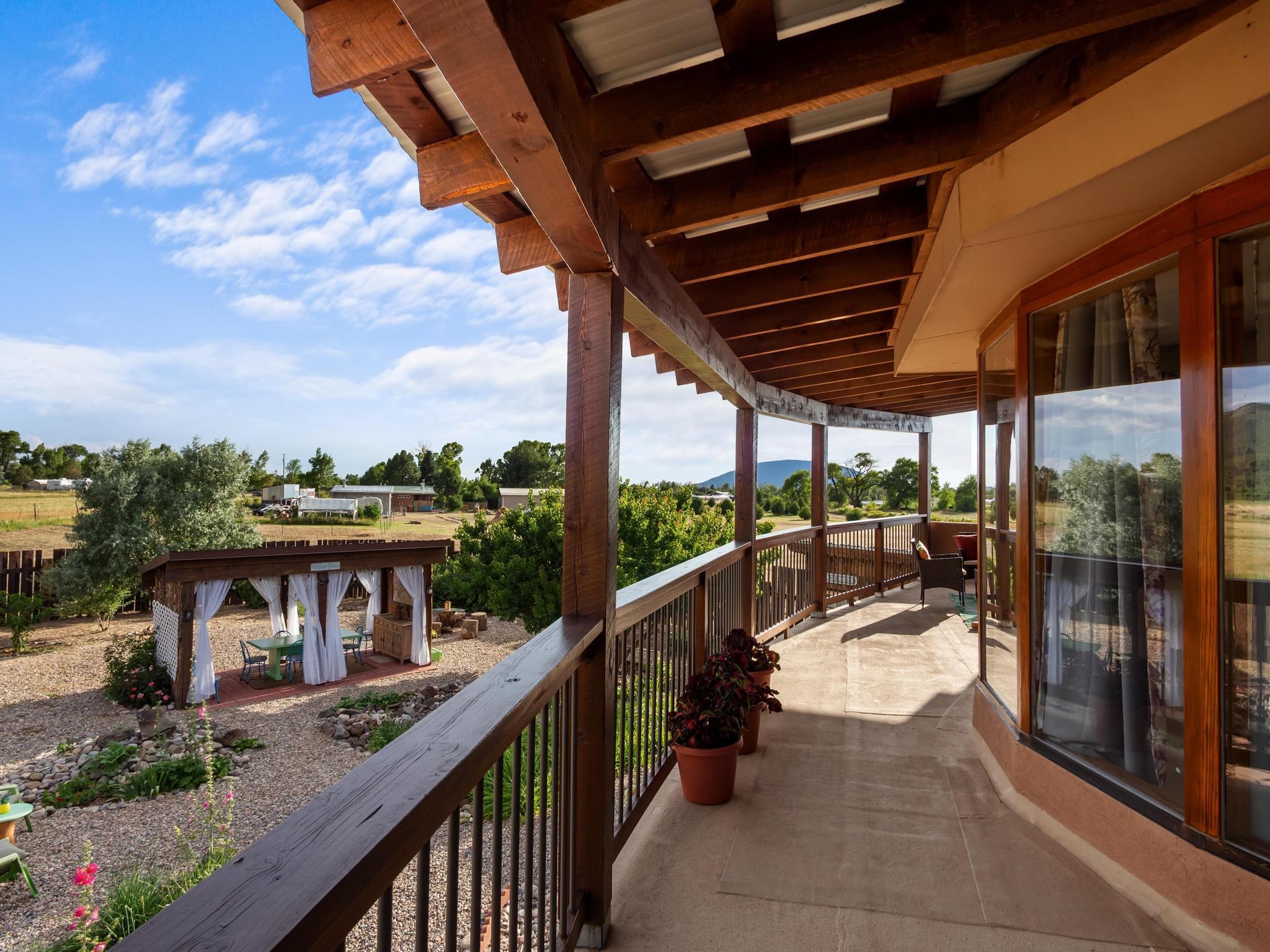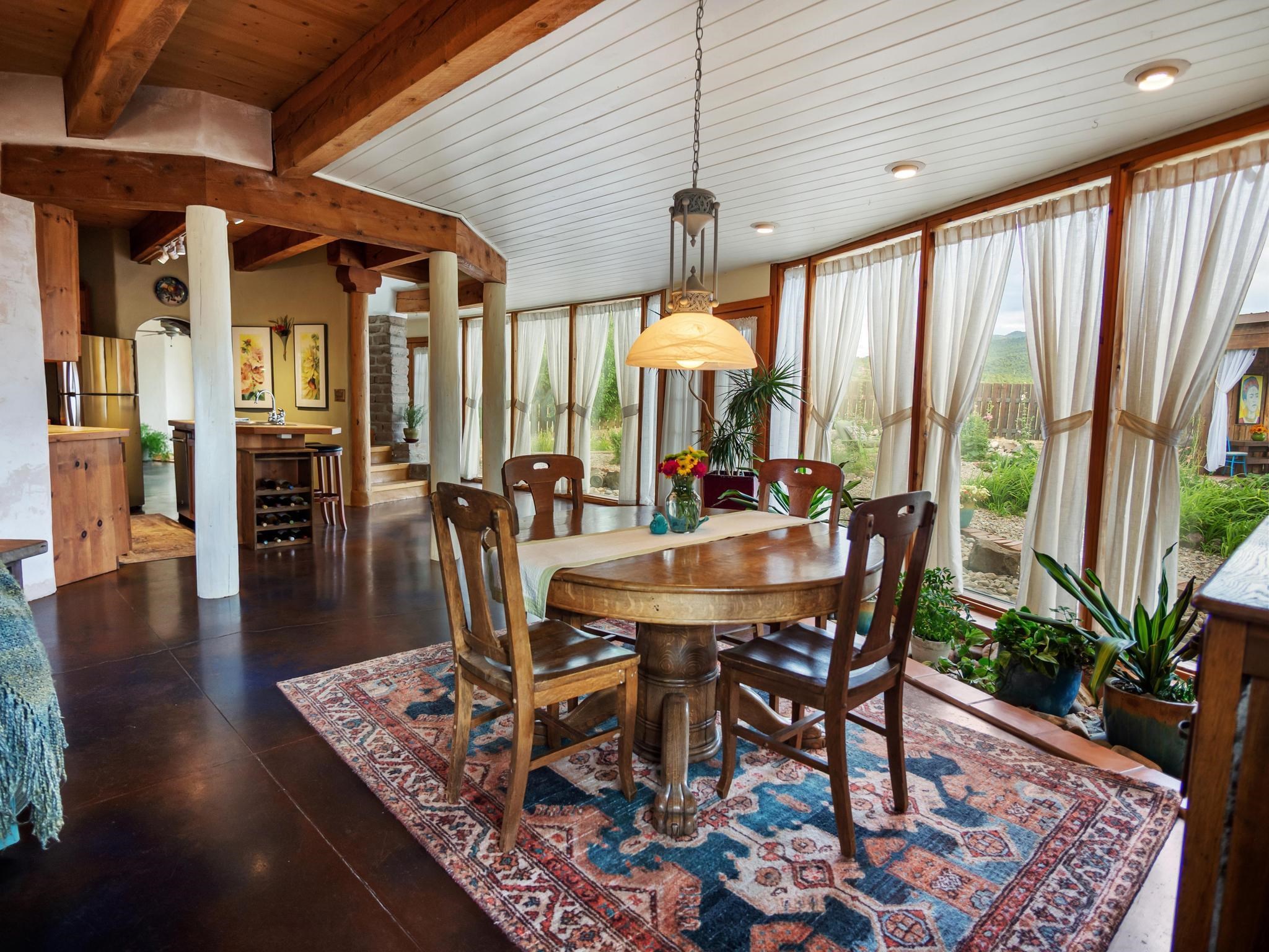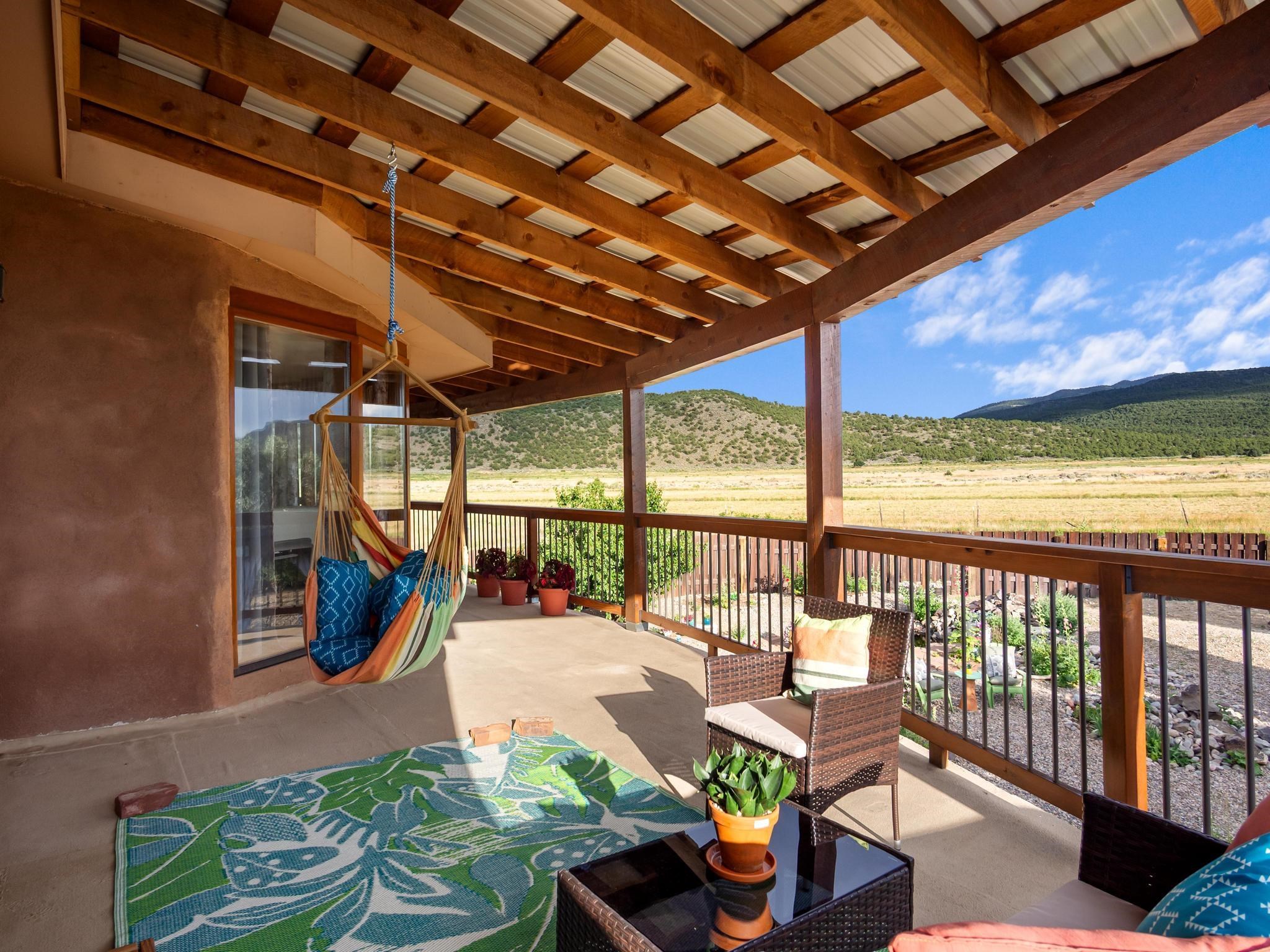 47B is located on The Poleo, the most desirable place in Costilla. One may walk down the road to trout fishing, or hunt elk and mule deer in the pasture. The 2484 square foot, two-story home is a well-functioning passive solar design, featuring a south-facing wall of floor-to-ceiling windows. The built-in planters, dark cement floors, and center adobe core collect heat during the day and release it at night. The windows are calibrated to facilitate solar gain through the seasons. This one-of-a-kind home features tongue and groove ceilings with exposed beams that add warmth and character throughout. The layout is part open-plan, with everything radiating from the circular kitchen at the heart of the home. The kitchen includes a newly updated gas range and stainless steel appliances. There are three bedrooms and two full bathrooms. The main floor includes a bedroom conveniently located next to the downstairs bath. Upstairs, a Jack and Jill bathroom with beautiful tile work and a jetted tub connects two additional bedrooms, along with a bright sunroom that opens to a full-length covered balcony with stunning views. Comfort is ensured year-round with two mini-split systems, as well as a wood-burning fireplace for cozy winter nights. The outdoor living area is just as special, featuring a fenced-in garden and yard space with a pergola-covered dining area--perfect for enjoying the fresh mountain air. The views from this property are truly outstanding in every direction. This property includes an expansive 18.47-acre parcel of lush pastureland bordering the Rio Costilla Cooperative Livestock Association (RCCLA), offering direct access to prime elk habitat. This unique property conveys with an existing elk hunting tag, making it an exceptional opportunity for sportsmen, ranchers, and conservation-minded buyers alike.