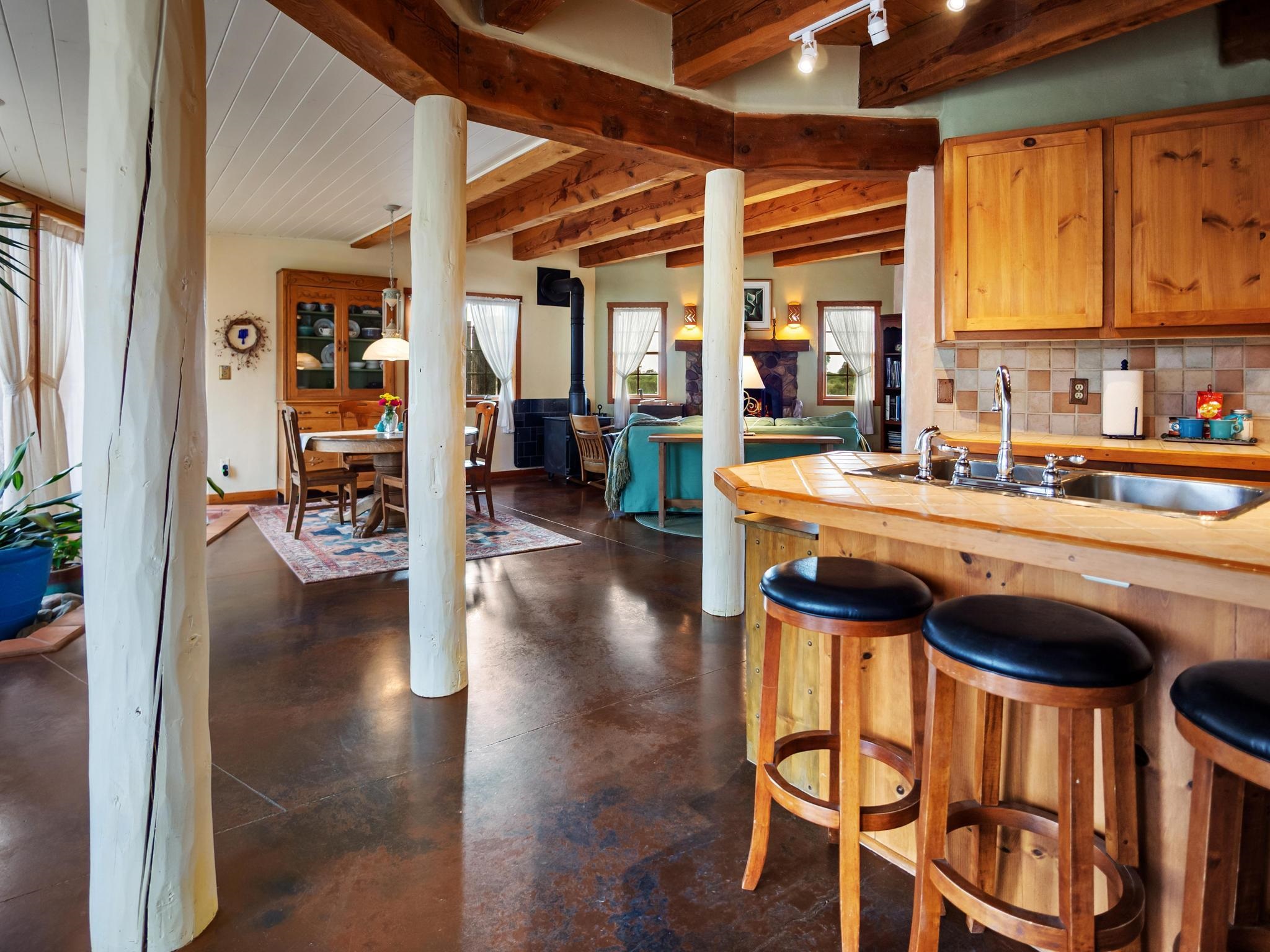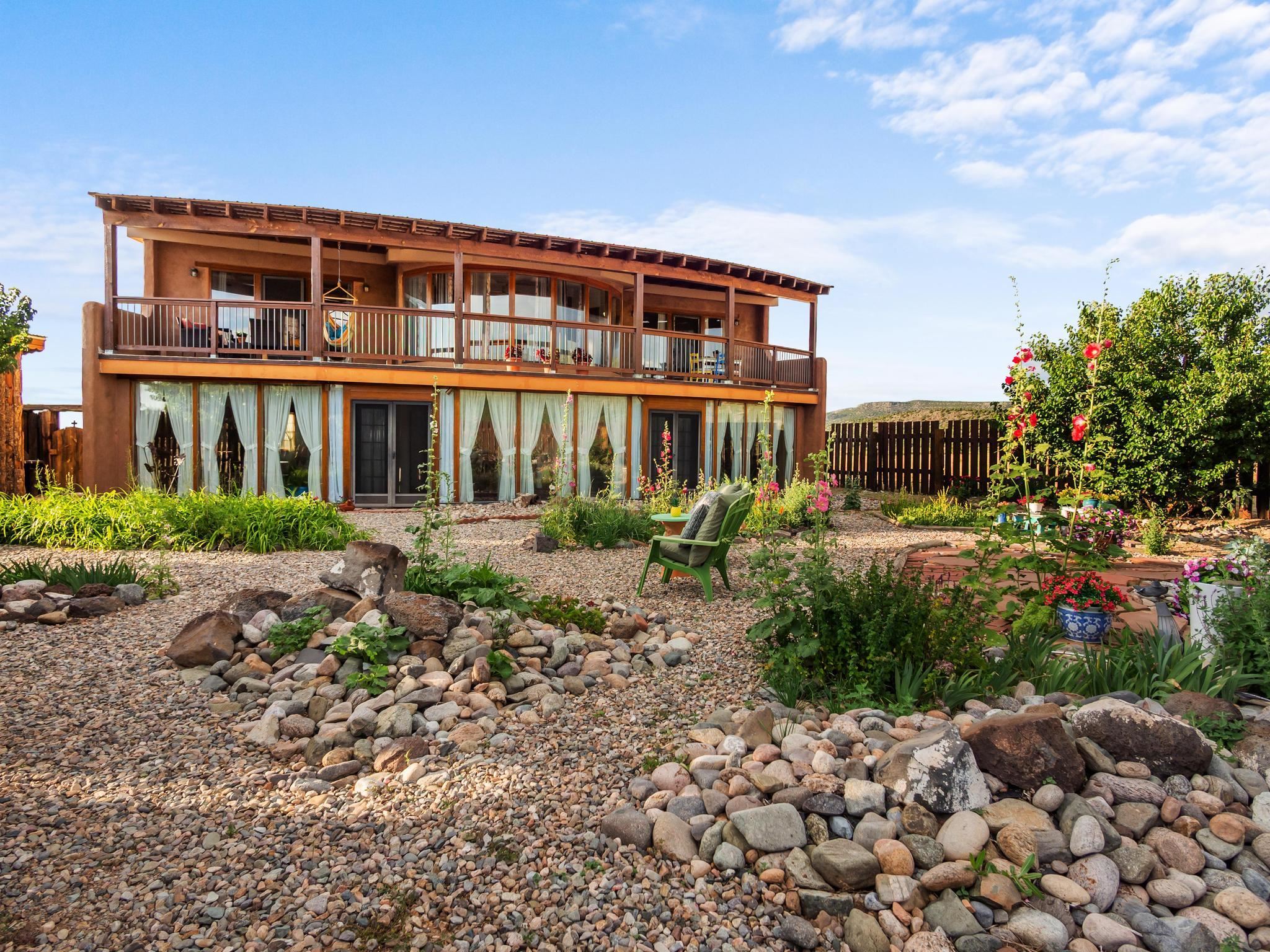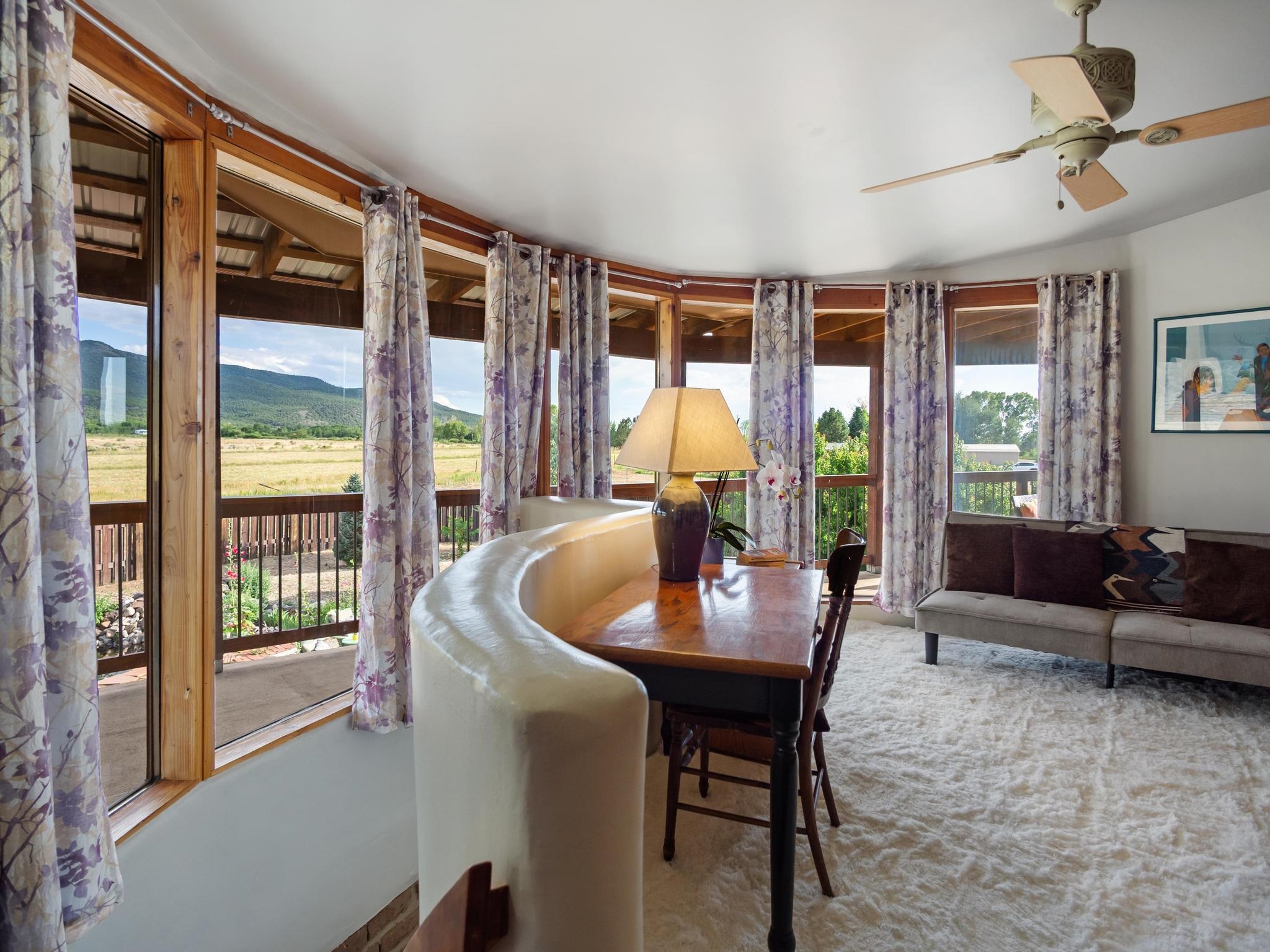 47B is located on The Poleo, the most desirable place in Costilla. One may walk down the road to trout fishing, or hunt elk and mule deer in the pasture. The 2484 square foot, two-story home is a well-functioning passive solar design, featuring a south-facing wall of floor-to-ceiling windows. The built-in planters, dark cement floors, and center adobe core collect heat during the day and release it at night. The windows are calibrated to facilitate solar gain through the seasons. This one-of-a-kind home features tongue and groove ceilings with exposed beams that add warmth and character throughout. The layout is part open-plan, with everything radiating from the circular kitchen at the heart of the home. The kitchen includes a newly updated gas range and stainless steel appliances. There are three bedrooms and two full bathrooms. The main floor includes a bedroom conveniently located next to the downstairs bath. Upstairs, a Jack and Jill bathroom with beautiful tile work and a jetted tub connects two additional bedrooms, along with a bright sunroom that opens to a full-length covered balcony with stunning views. Comfort is ensured year-round with two mini-split systems, as well as a wood-burning fireplace for cozy winter nights. The outdoor living area is just as special, featuring a fenced-in garden and yard space with a pergola-covered dining area--perfect for enjoying the fresh mountain air. The views from this property are truly outstanding in every direction. This property includes an expansive 18.47-acre parcel of lush pastureland bordering the Rio Costilla Cooperative Livestock Association (RCCLA), offering direct access to prime elk habitat. This unique property conveys with an existing elk hunting tag, making it an exceptional opportunity for sportsmen, ranchers, and conservation-minded buyers alike.