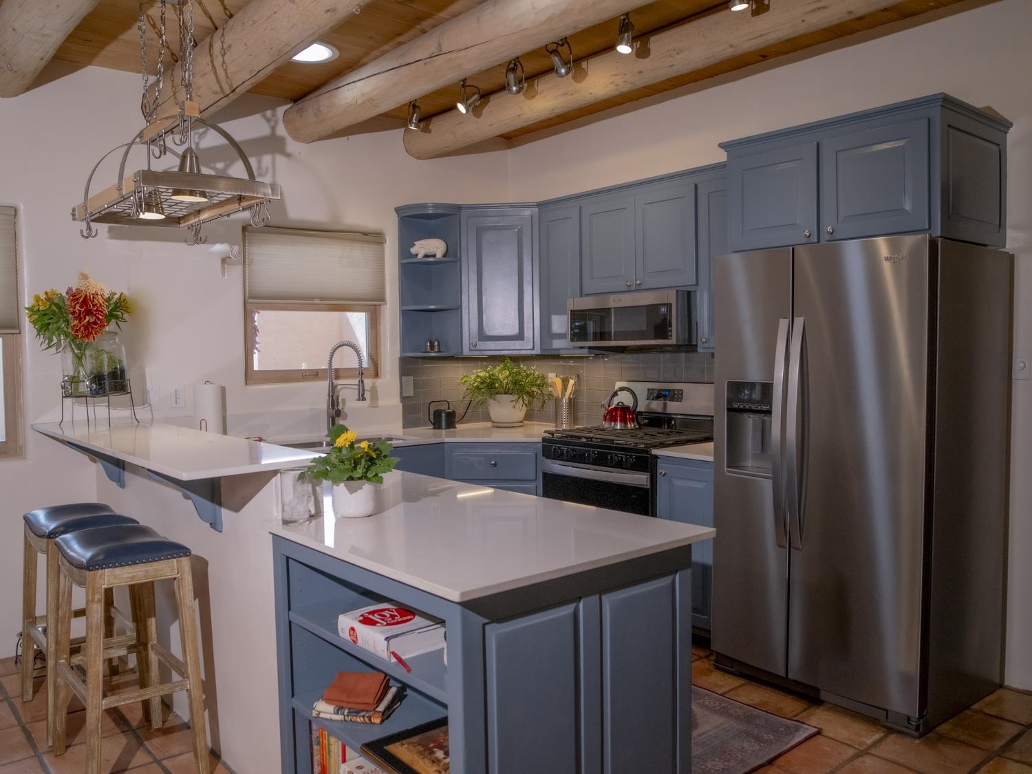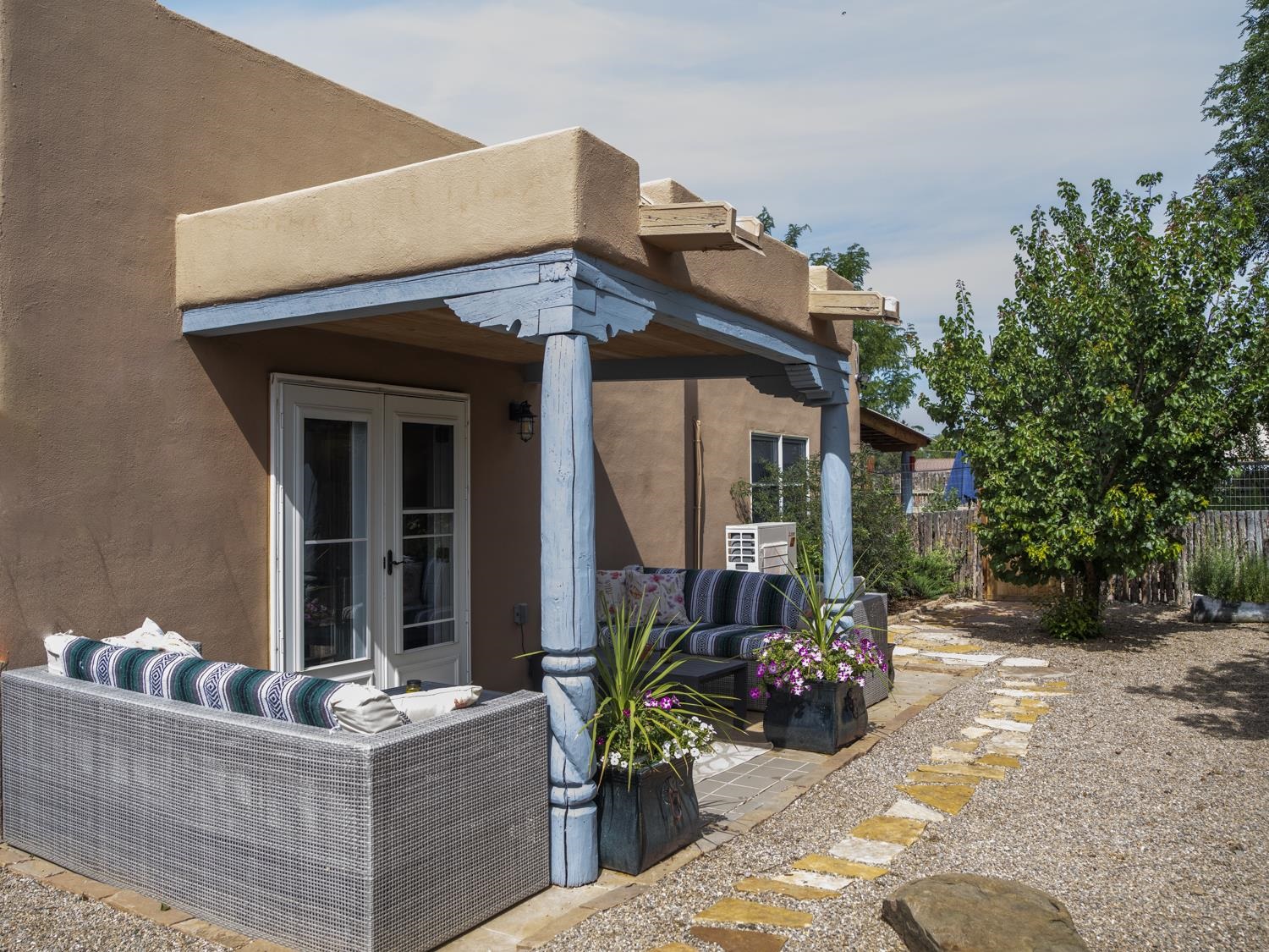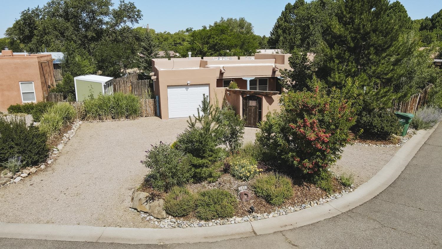 YOUR PICTURE PERFECT TAOS DREAM HOME delivers ultimate comfort with air conditioning and an unbeatable location steps from everything. Discover the enchanting world of Taos with this gorgeous, move-in ready 3-bedroom, 2-bath Pueblo-style home. Fully fenced with a one-car attached garage, this 1462 sq ft residence welcomes you through a beautifully manicured outdoor courtyard with a fountain, immediately setting a serene tone. The well-thought-out open floor plan creates a spacious and inviting atmosphere, perfect for both daily living and entertaining. The kitchen, truly the heart of the house, boasts new upscale appliances, ample counter space for cooking, countertop for casual dining and plenty of storage. The spacious dining/living room extends seamlessly outdoors to a lovely patio--ideal for morning coffee or evening relaxation or entertaining. A large primary bedroom with an attached bathroom opens directly to a hot tub and a stunning landscaped back patio. Two additional bedrooms offer versatile spaces for guests or a dedicated studio. Enjoy the warmth and beauty of tile floors throughout, complemented by a charming Southwestern fireplace, tongue & groove and Viga ceilings that add character and charm. Comfort is paramount with radiant floor heat keeping you warm on chilly evenings, and efficient mini-splits providing year-round climate control. The attached garage has custom shelving and lots of storage. Additionally there is an adorable green shed perfect for additional storage or whatever your needs are. This home comes with the convenience of town water, sewer, and natural gas. Beyond the flagstone patio, you'll find a meticulously landscaped and treed backyard with a chicken coop and plenty of space for outdoor dining. There are prolific pear trees, a magical quartz fountain and many outside areas to lounge, lunch or meditate. Live in a community where local treasures are just steps away, and the vibrant culture of Taos, including fabulous cafes, new and vibrant restaurants, and the lively Taos Plaza, is at your footsteps.