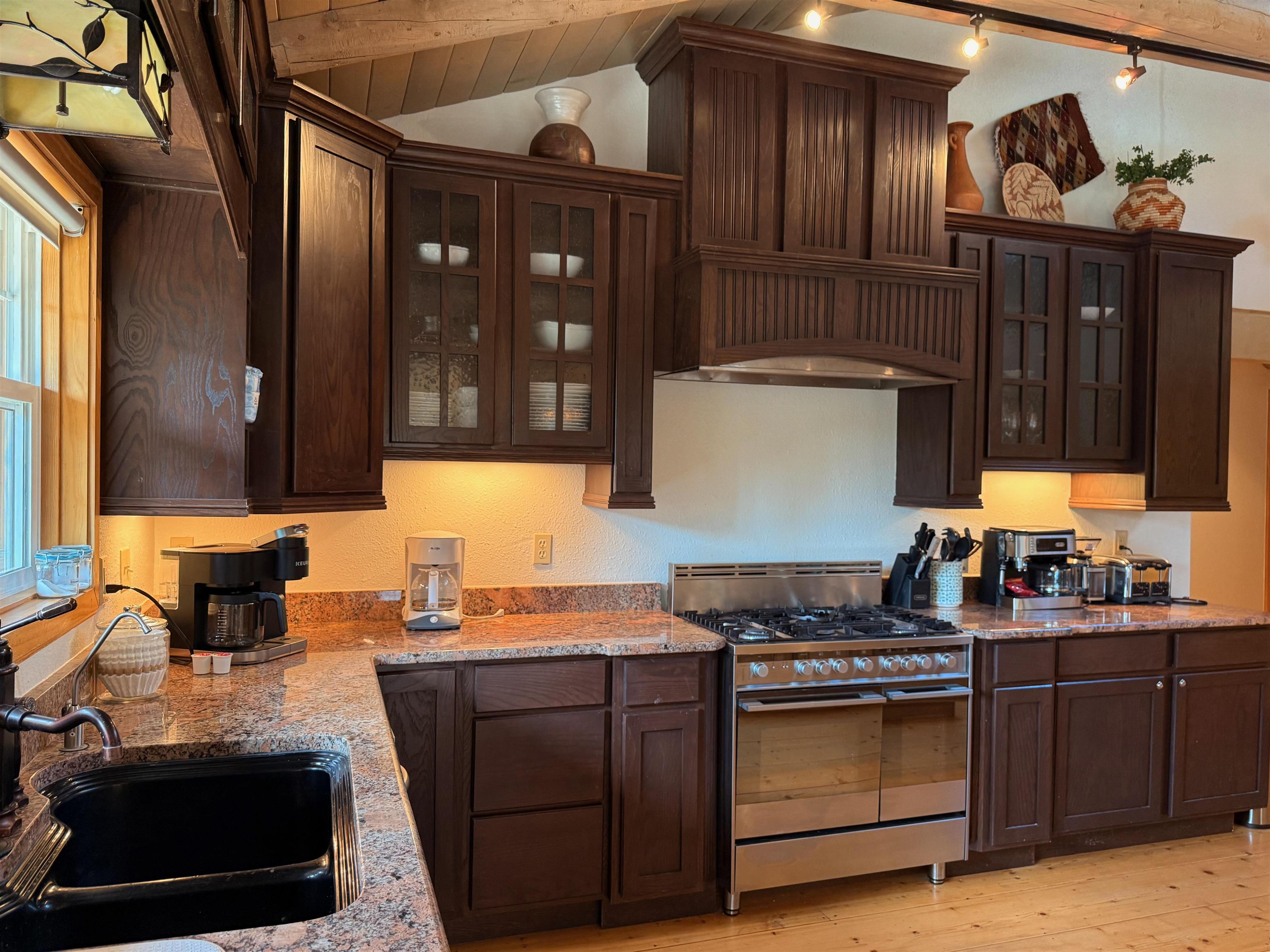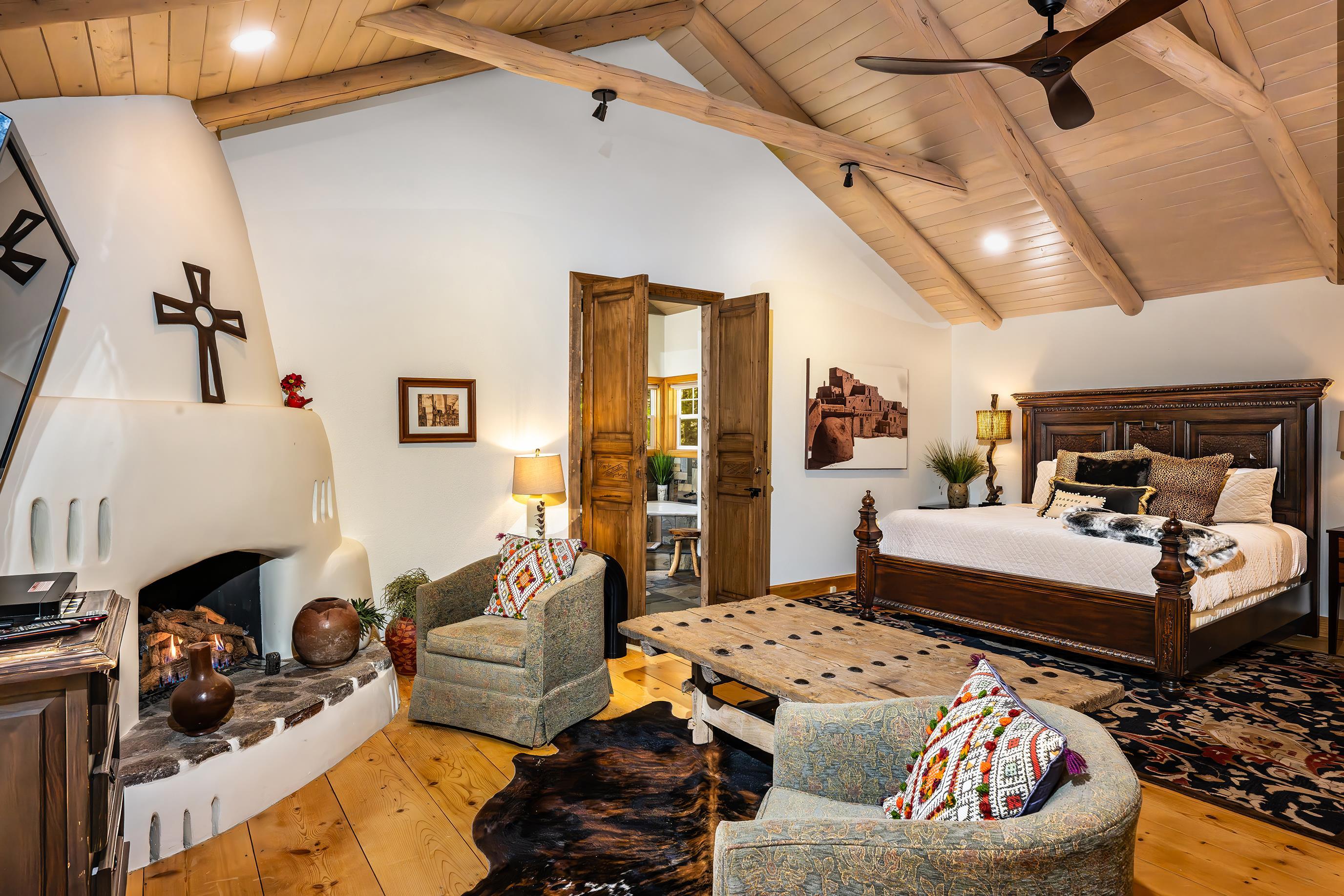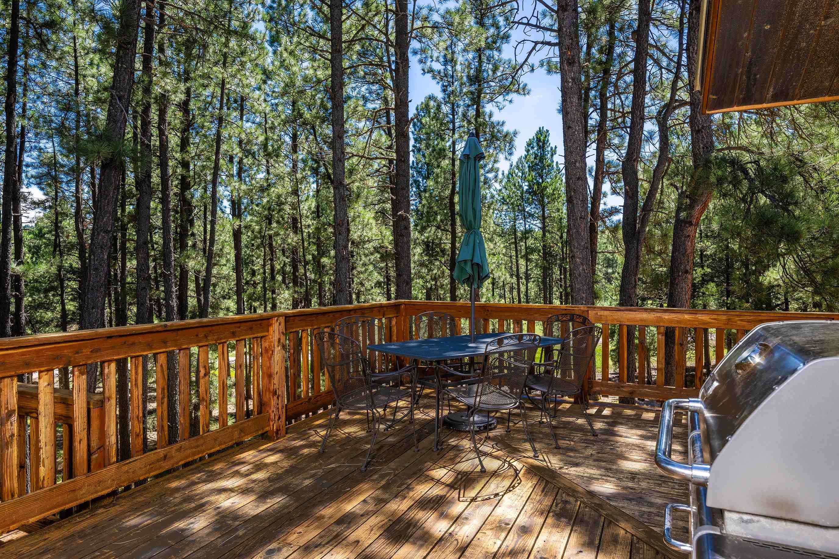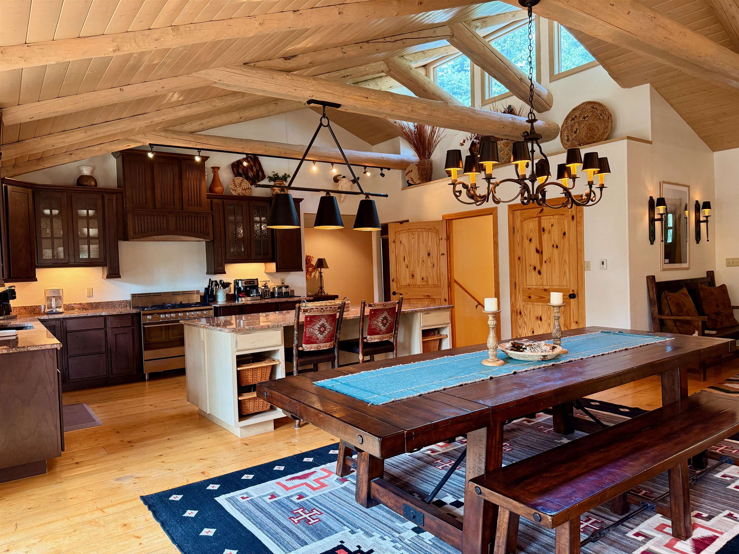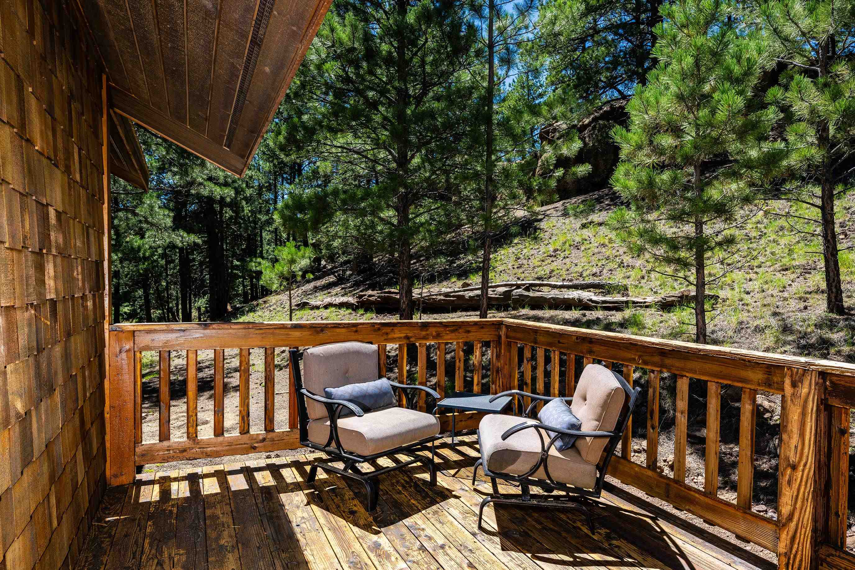 Just listed... a beautiful mountain escape in the Village of Angel Fire, just off the Enchanted Circle of northern New Mexico in the southern Rocky Mountains. Ideally situated on 4 wooded acres in the Angel Fire Resort, known for its ski mountain, nationally recognized mountain bike terrain park, PGA-rated golf course and more. This lovely cabin-style mountain estate home is ready for Thanksgiving, Christmas, ski season and beyond. Fully furnished and fully stocked, the 4300+ square foot home has it all. Having hosted Jimmy Buffet and the cast of Disney's Lone Ranger among others, it can easily accommodate parties of 20+ yet is still cozy for you or the two of you and your large family. Angel Fire does not restrict the number of short-term rentals as do Taos and Santa Fe. Because of its easy all-weather access, this property can produce income year around. The lower level with its separate kitchen, high-capacity laundry room and separate entry can be locked off as a separate rental or opened to the rest of the house for family and friends. The very large Primary Suite with its soaring ceilings, has a fireplace, whirlpool tub, shower and private deck nestled into dramatic rock outcroppings. A wrap-around deck opening off the great room has a large outdoor fireplace for entertaining and a hot tub for relieving stress. Dual Bosch high-capacity tankless water heaters ensure plenty of hot water for 20+ people. Washers and dryers are on both levels. Recent renovations in 2021 added dramatic architectural details and high-grade insulation throughout the main floor keeping temperatures moderate year around. Fiber-optic internet is throughout the house, enabling working from home or making internet available to large groups of guests. Only minutes away to the Resort's ski mountain and numerous other amenities, you can ski on your lunch hour. Angel Fire airport with its jet-capable runway for private aircraft is also only minutes away. Advanced Air, in December of 2024, began 5 weekly round-trip flights from Albuquerque. And now...the best for last... Angel Fire's average summer temperature is 76 degrees with little to no humidity. No mosquitoes, chiggers, fleas and poisonous snakes.