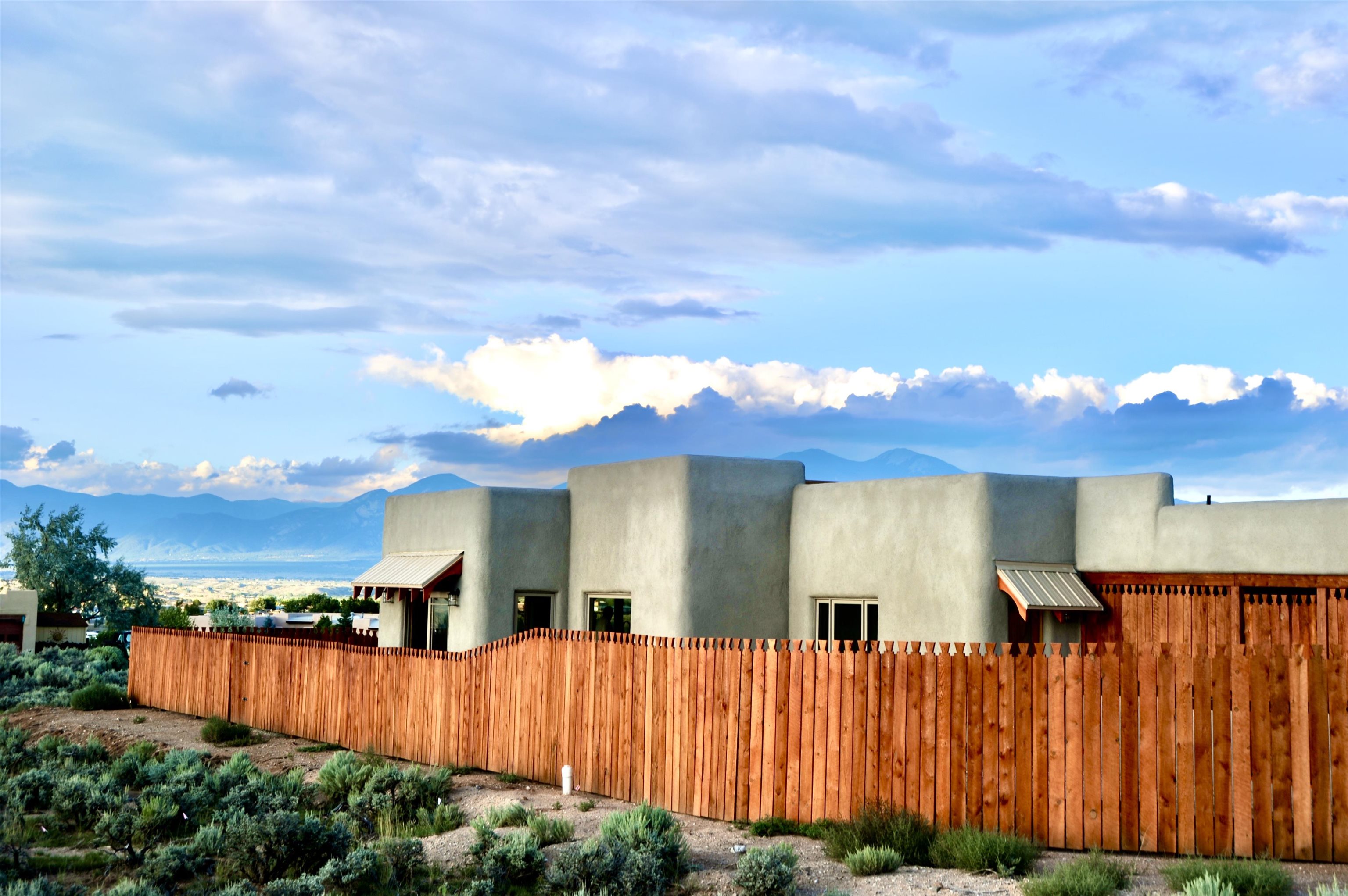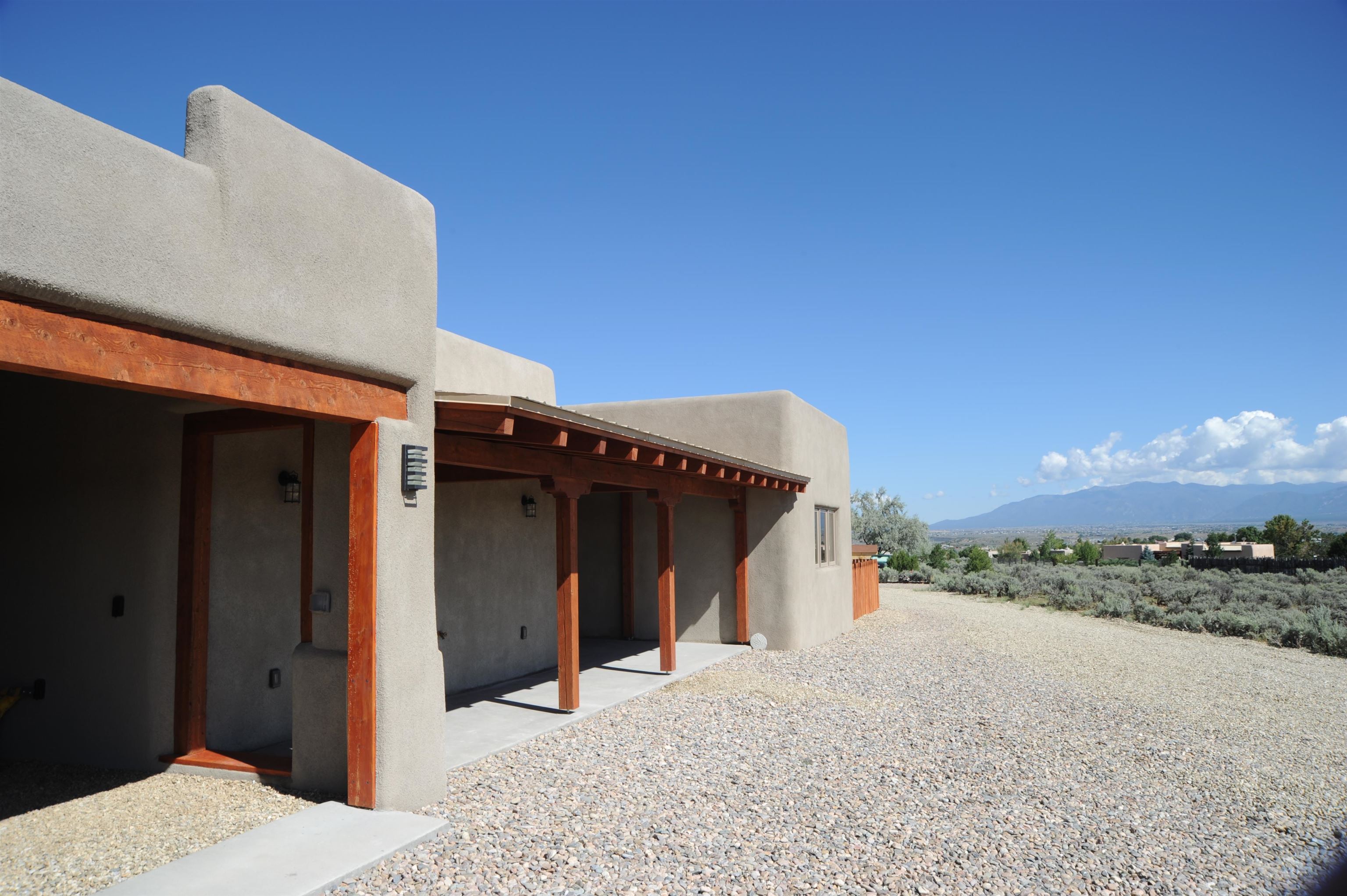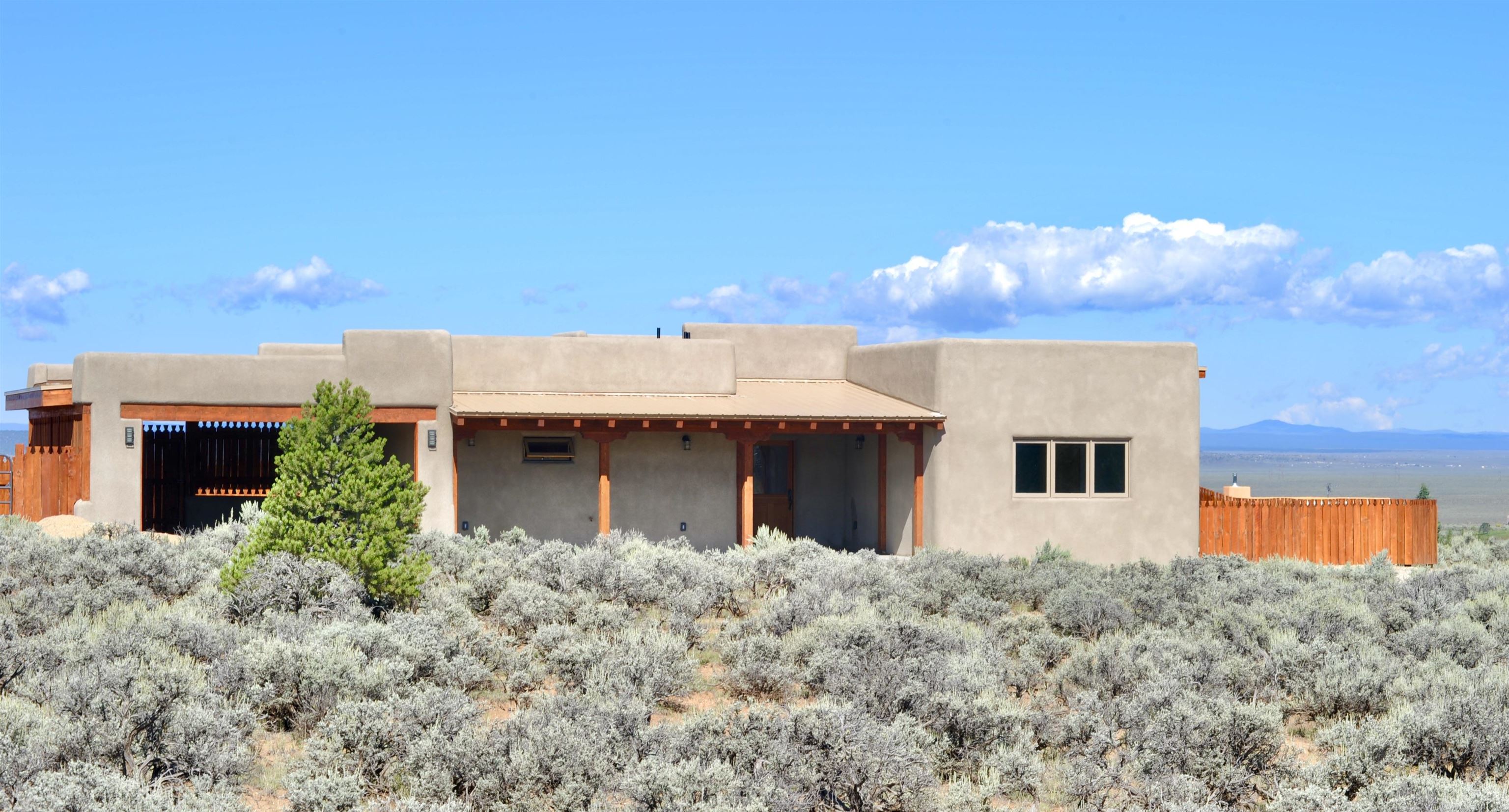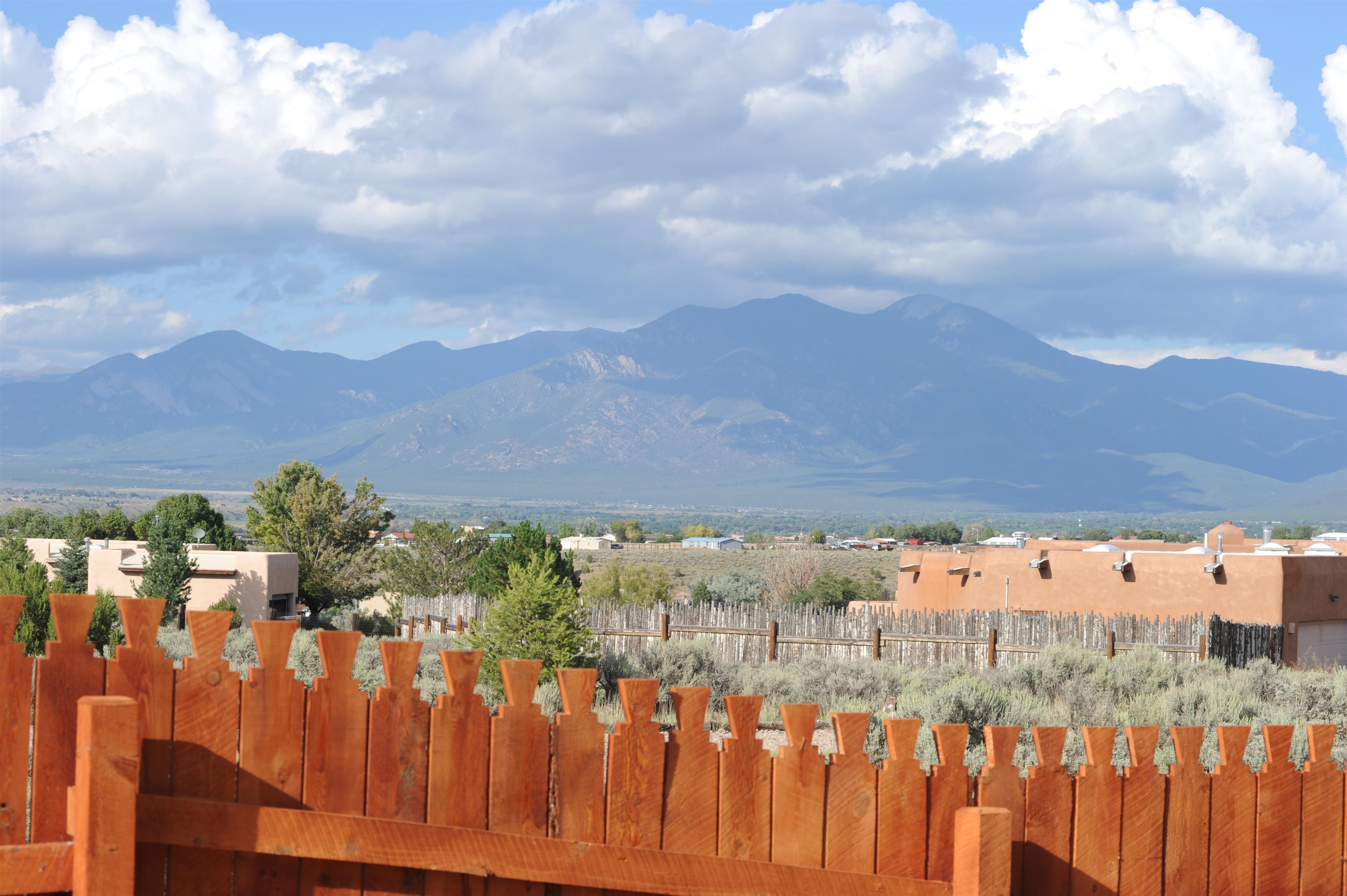 This is a remarkable custom home built in 2025 by renowned local builder Douglas Custom Homes. This property is situated on a hill adjacent to Taos Country Club with 360 degree panoramic views, sitting on 1.25 acres. Amenities include: 36" deep foundation (24" is norm.). 6 mil black plastic with 2" sub grade foam insulation = frost and radon barrier. 2x8 construction. R 43 insulated walls. R 60 insulated ceilings. Draw knifed "vigas" throughout. 16" x 32" Italian Porcelain throughout. Hard trowel plaster finish throughout. Sierra Pacific Designer low E double pane windows. LG 5 burner gas stove with pot filler. LG "side by side" 36" refrigerator. Nivean "on demand" domestic and radiant heating. Crack isolation / radon barrier underlayment for tile. 42" under counter stainless kitchen sink. enclosed fenced yard. 2 car carport, prepped for potential enclosure. pion trees on property. 45 minute drive to world renown Taos Ski Valley. 2 minutes to Taos Country Club golf course. 2 hr. 45 min. to ABQ Int'l airport. 10 min. from Taos Plaza. Single track mtn. biking along The Rio Grande Gorge, 5 min. away. Unobstructed scenic views abound, Must see Property!! Incredibly built!