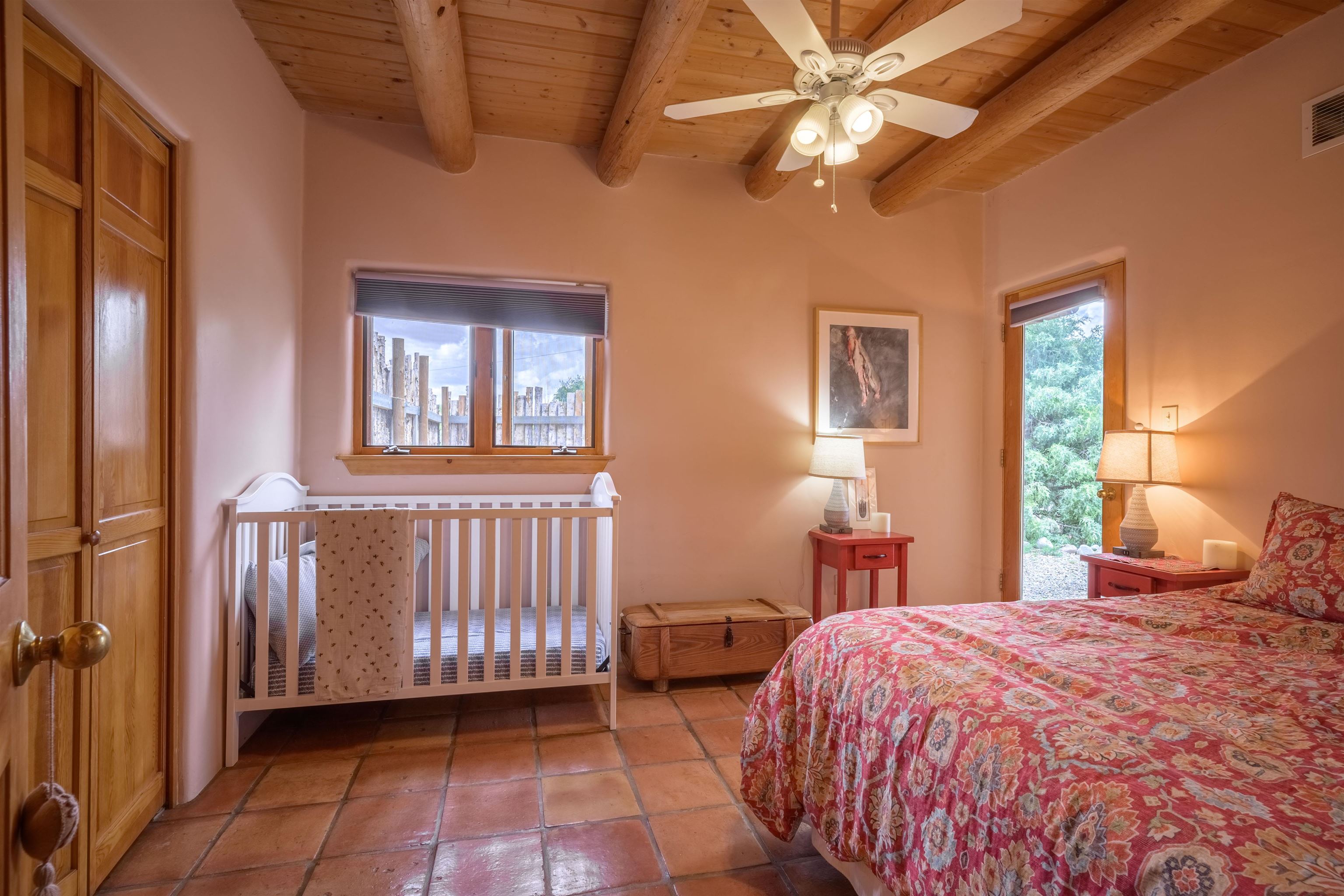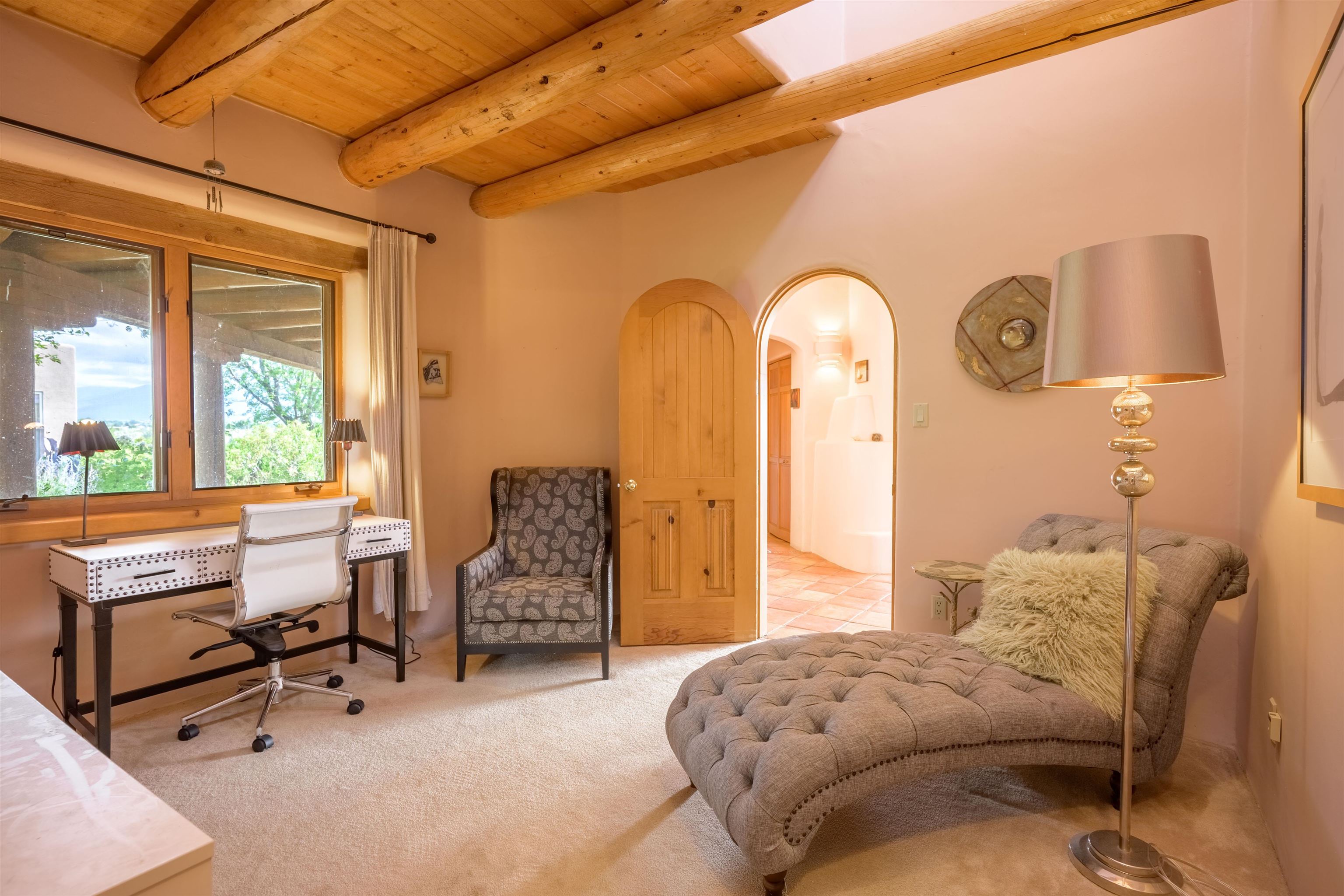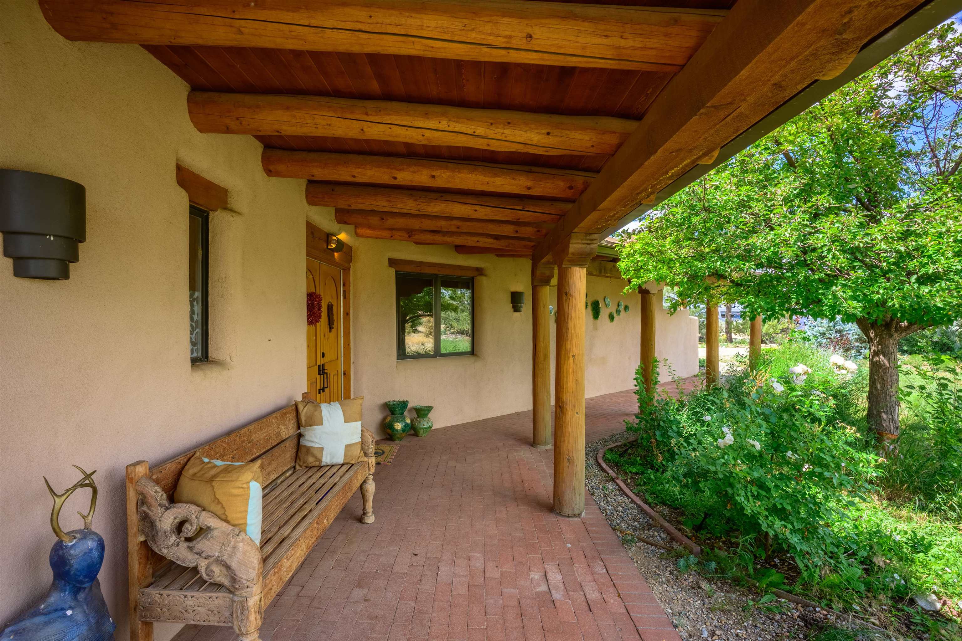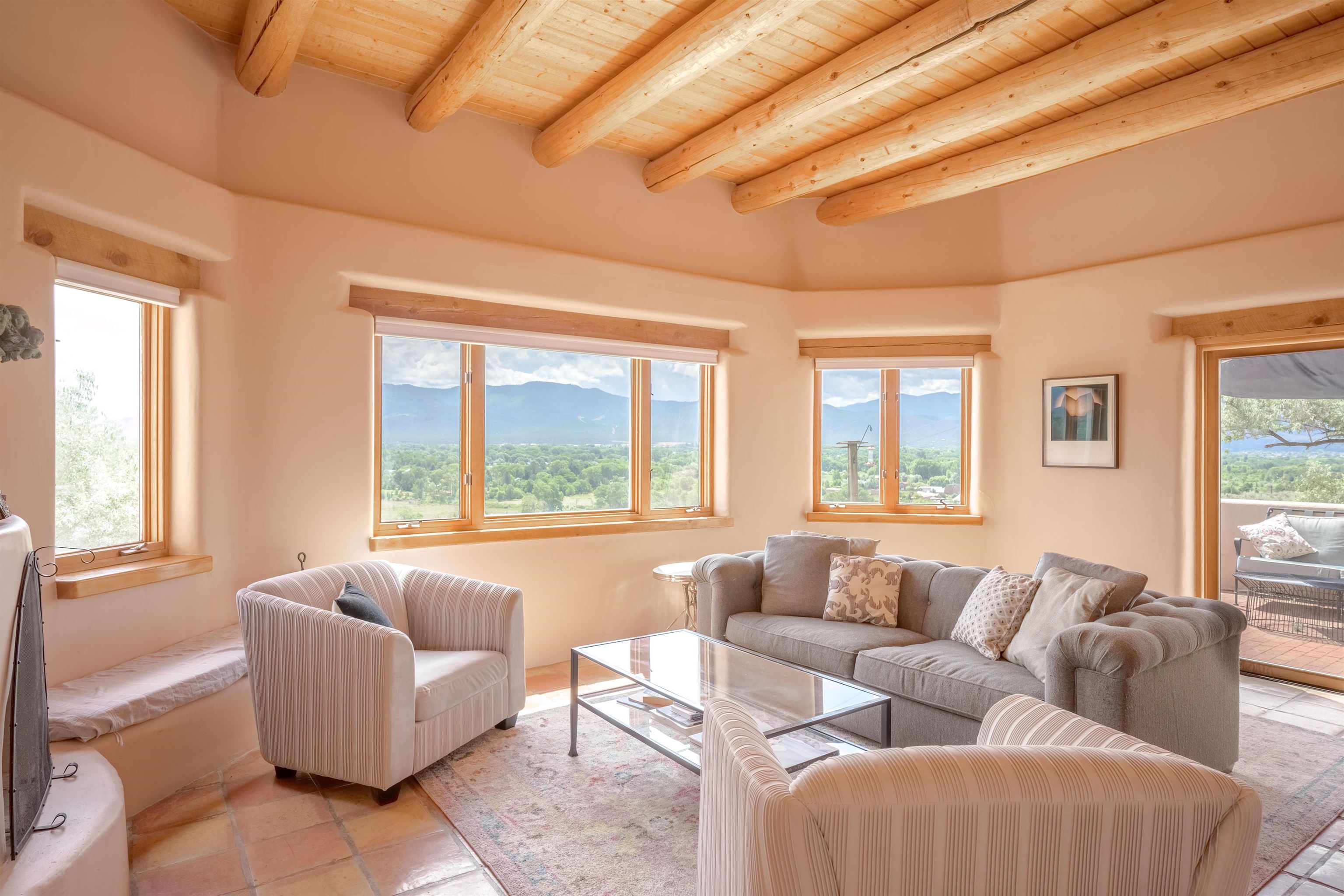 Imagine owning a house and guesthouse overlooking Taos Valley with big mountain views on 1.95 acres. This glorious home is private, yet close to town and Taos Ski Valley. From the house you can see El Salto, Pueblo Peak, and even Truchas Peak. The orientation of the house and guesthouse allow you to enjoy both sunrises and sunsets. The home was designed to take advantage of solar gain with large clerestories in two bedrooms, trombe walls on the guesthouse, metal clad wood windows, saltillo tiles ,and hardwood floors. The home is both energy efficient and welcoming. The main house has three bedrooms and two baths. The kitchen opens onto a large patio with lots of space for outdoor dining and seating. Tiered garden beds are ready to plant and there is a fenced area for your furry friends. A large covered portal welcomes visitors into the front of the home and provides shaded seating overlooking a nice lawn with trees. The guesthouse entrance is down a path from the portal area. It is nicely appointed and has quite a bit of storage with living and dining areas combined and an efficient kitchen. A full sized bathroom makes this a very livable unit. In addition the guesthouse has its own private patio area. Views and space, light and bright, sweetly located and ready to move in, this property has so much to offer.