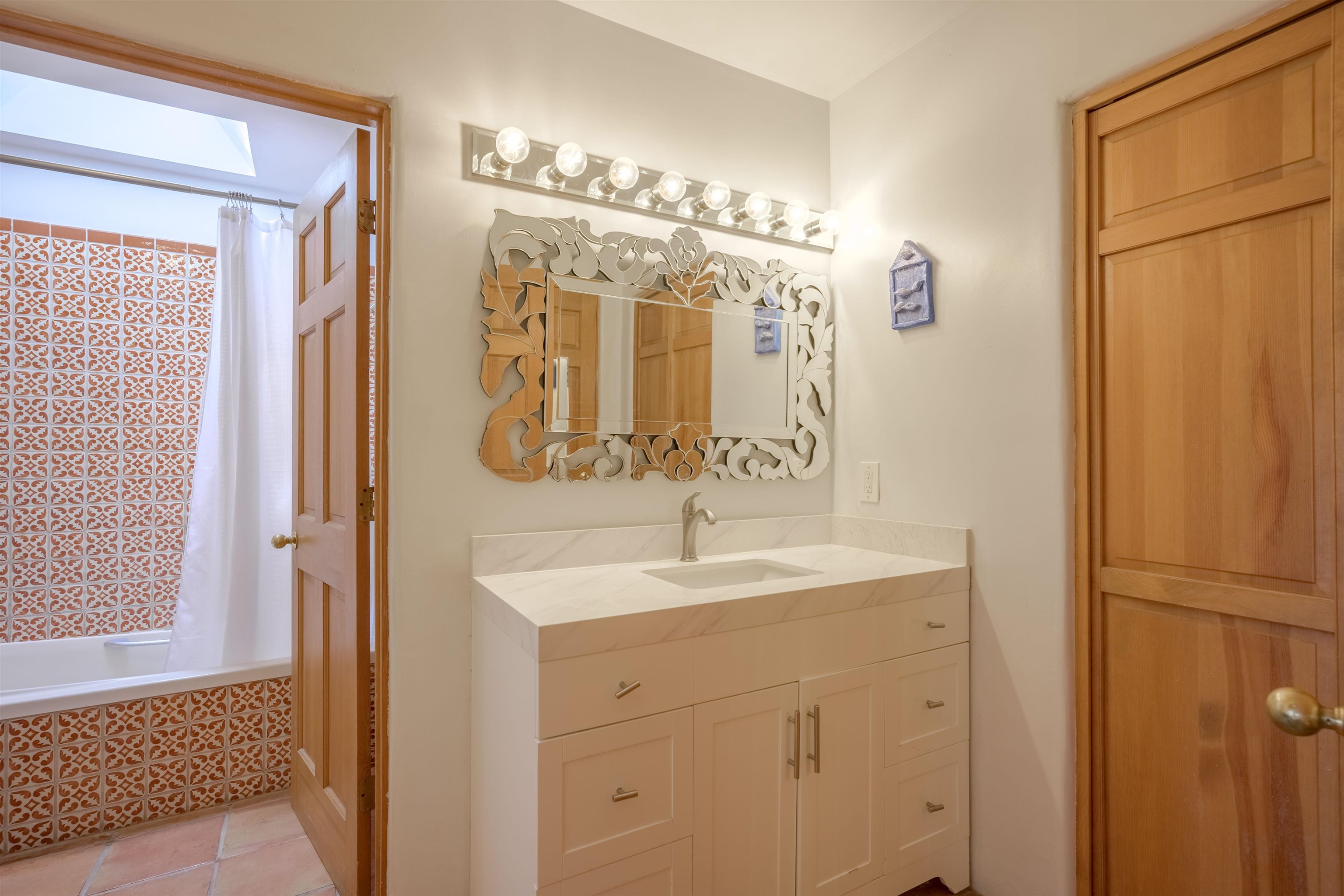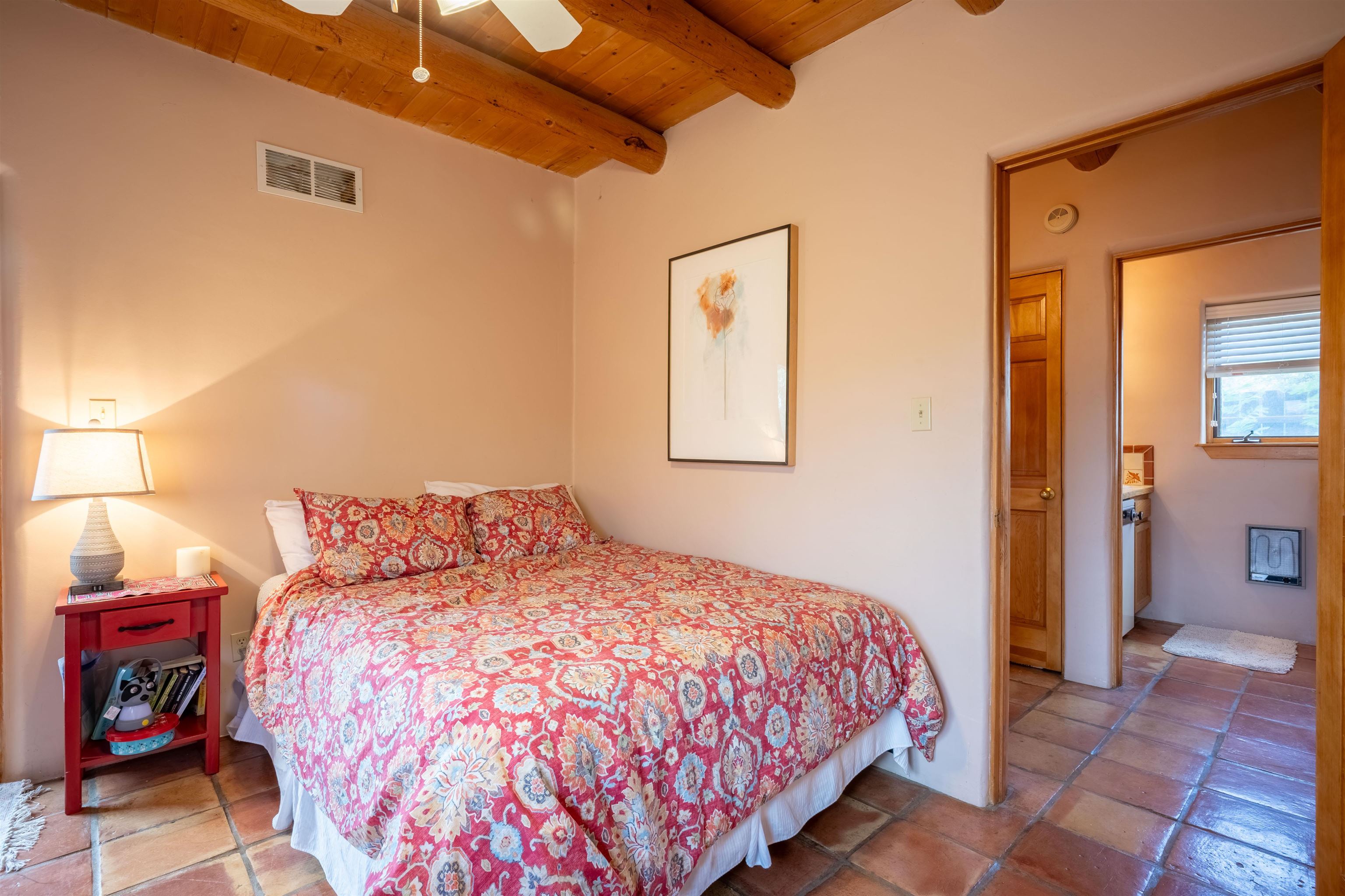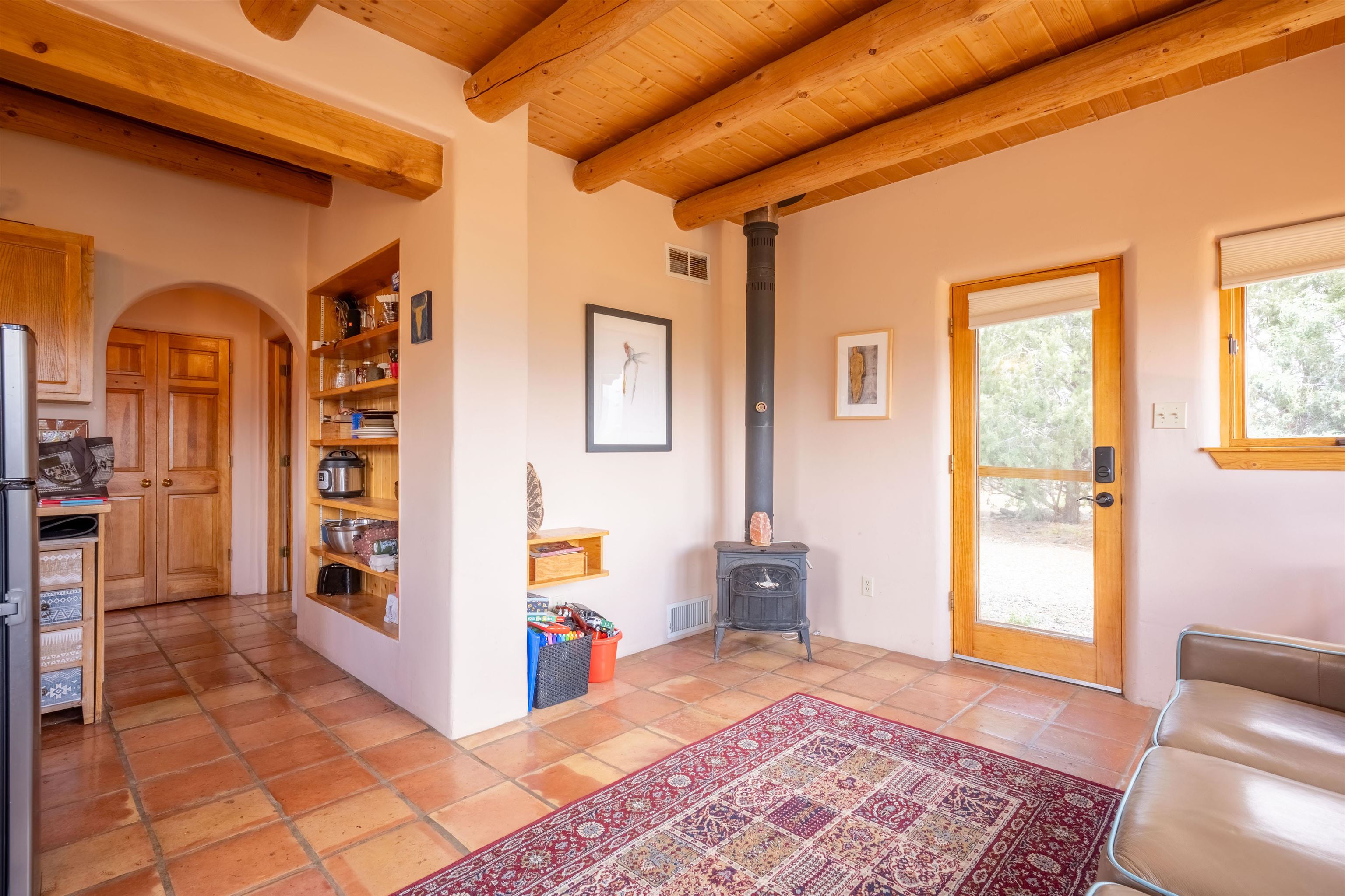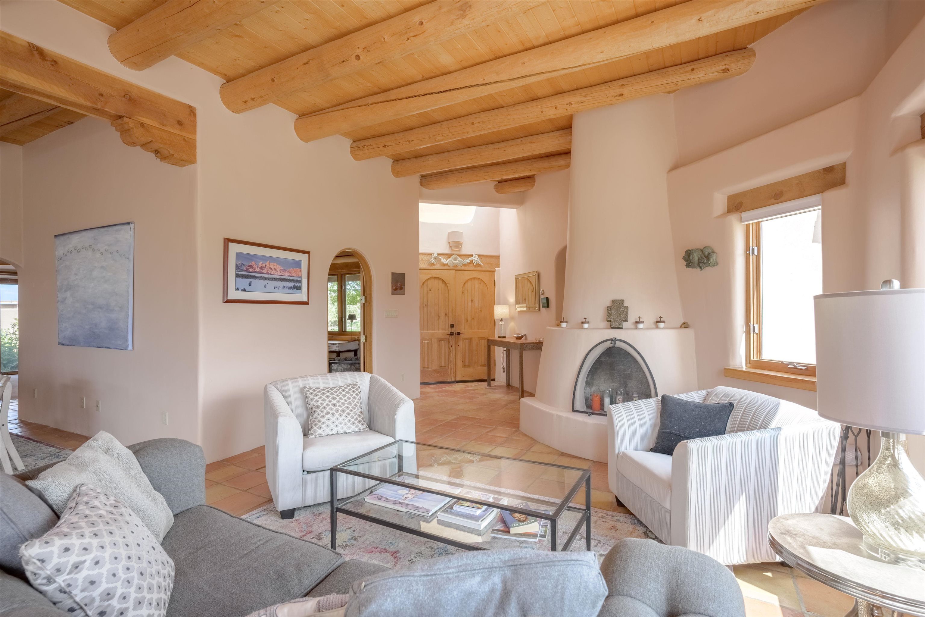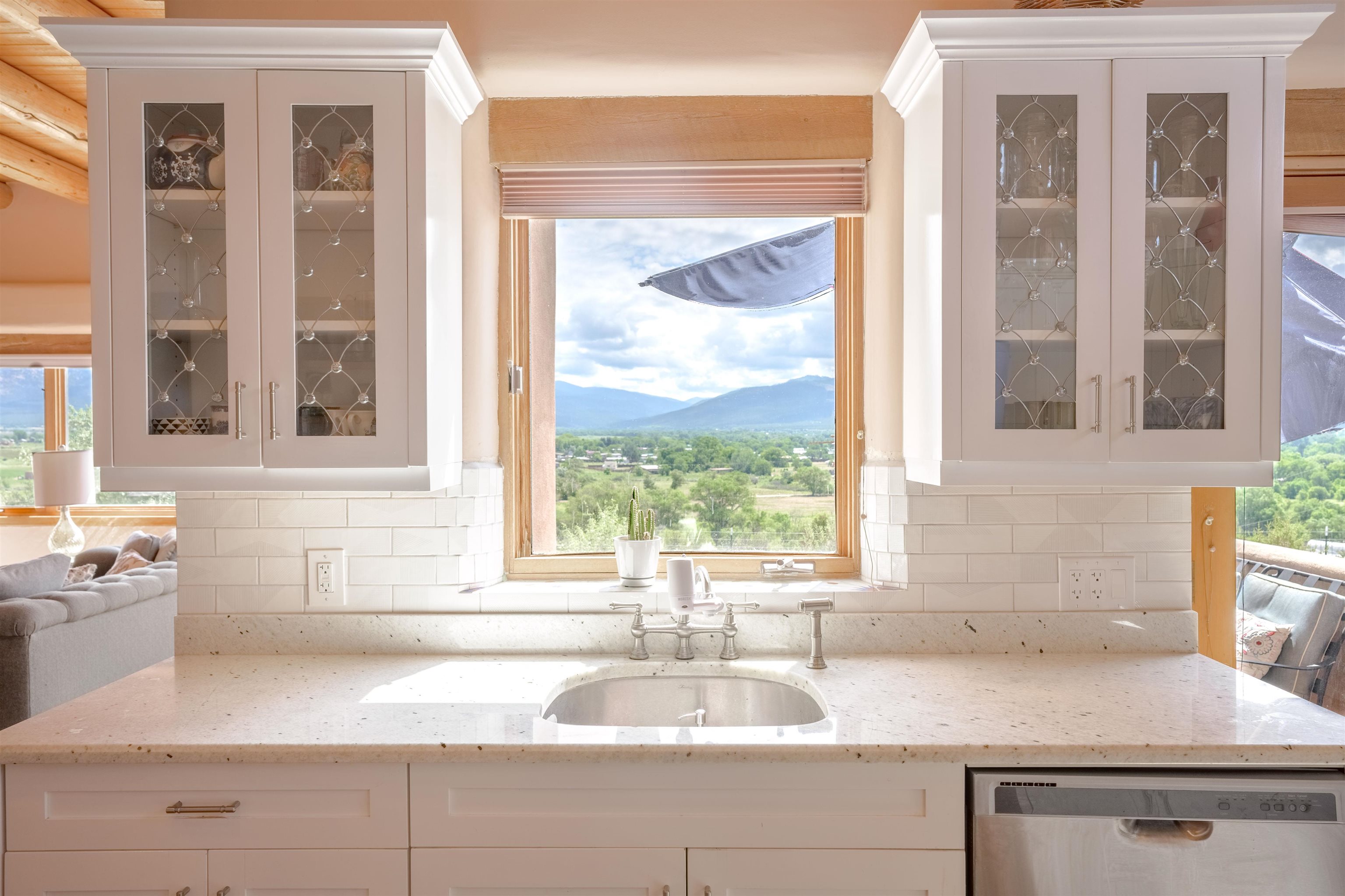 Imagine owning a house and guesthouse overlooking Taos Valley with big mountain views on 1.95 acres. This glorious home is private, yet close to town and Taos Ski Valley. From the house you can see El Salto, Pueblo Peak, and even Truchas Peak. The orientation of the house and guesthouse allow you to enjoy both sunrises and sunsets. The home was designed to take advantage of solar gain with large clerestories in two bedrooms, trombe walls on the guesthouse, metal clad wood windows, saltillo tiles ,and hardwood floors. The home is both energy efficient and welcoming. The main house has three bedrooms and two baths. The kitchen opens onto a large patio with lots of space for outdoor dining and seating. Tiered garden beds are ready to plant and there is a fenced area for your furry friends. A large covered portal welcomes visitors into the front of the home and provides shaded seating overlooking a nice lawn with trees. The guesthouse entrance is down a path from the portal area. It is nicely appointed and has quite a bit of storage with living and dining areas combined and an efficient kitchen. A full sized bathroom makes this a very livable unit. In addition the guesthouse has its own private patio area. Views and space, light and bright, sweetly located and ready to move in, this property has so much to offer.