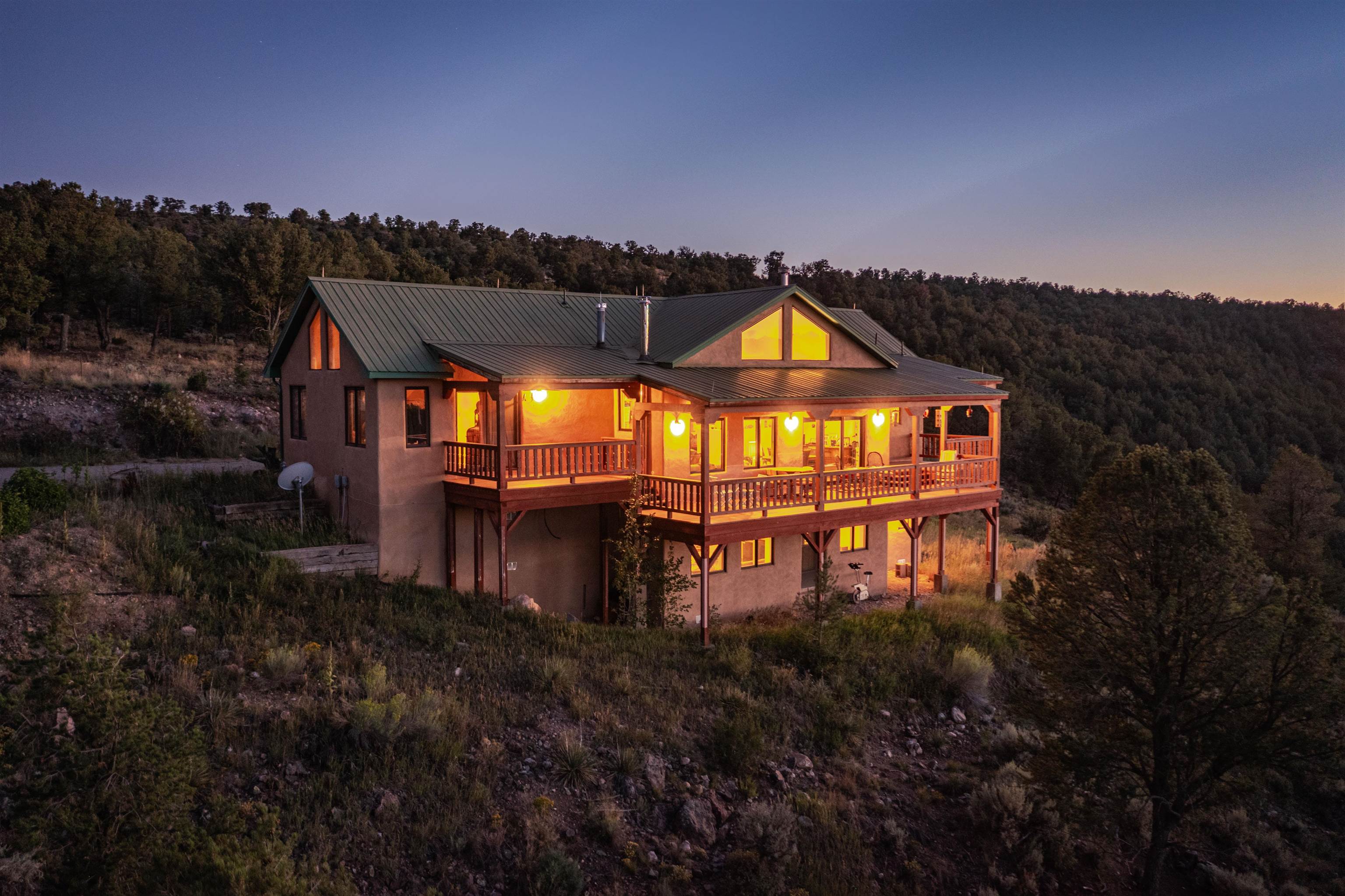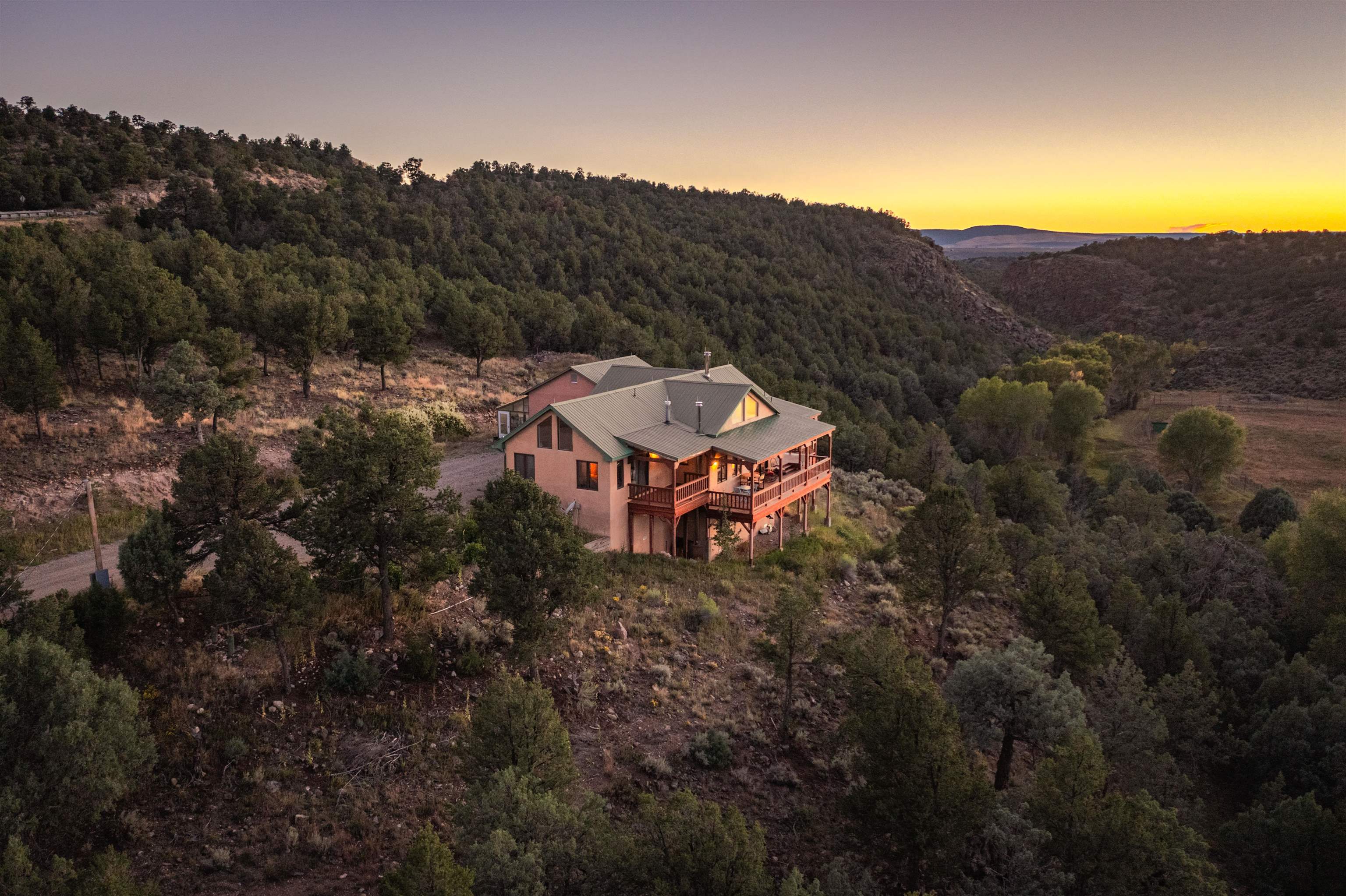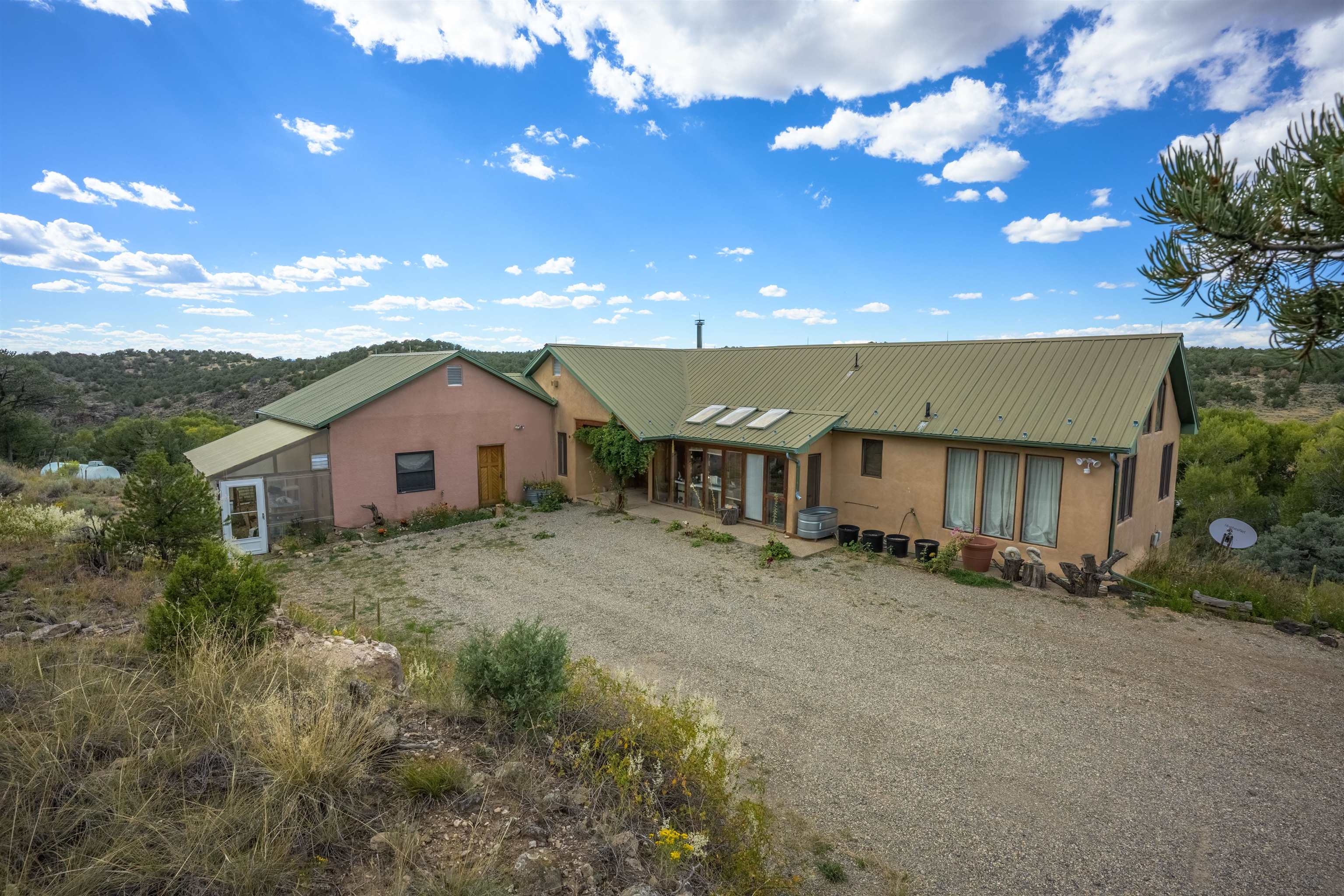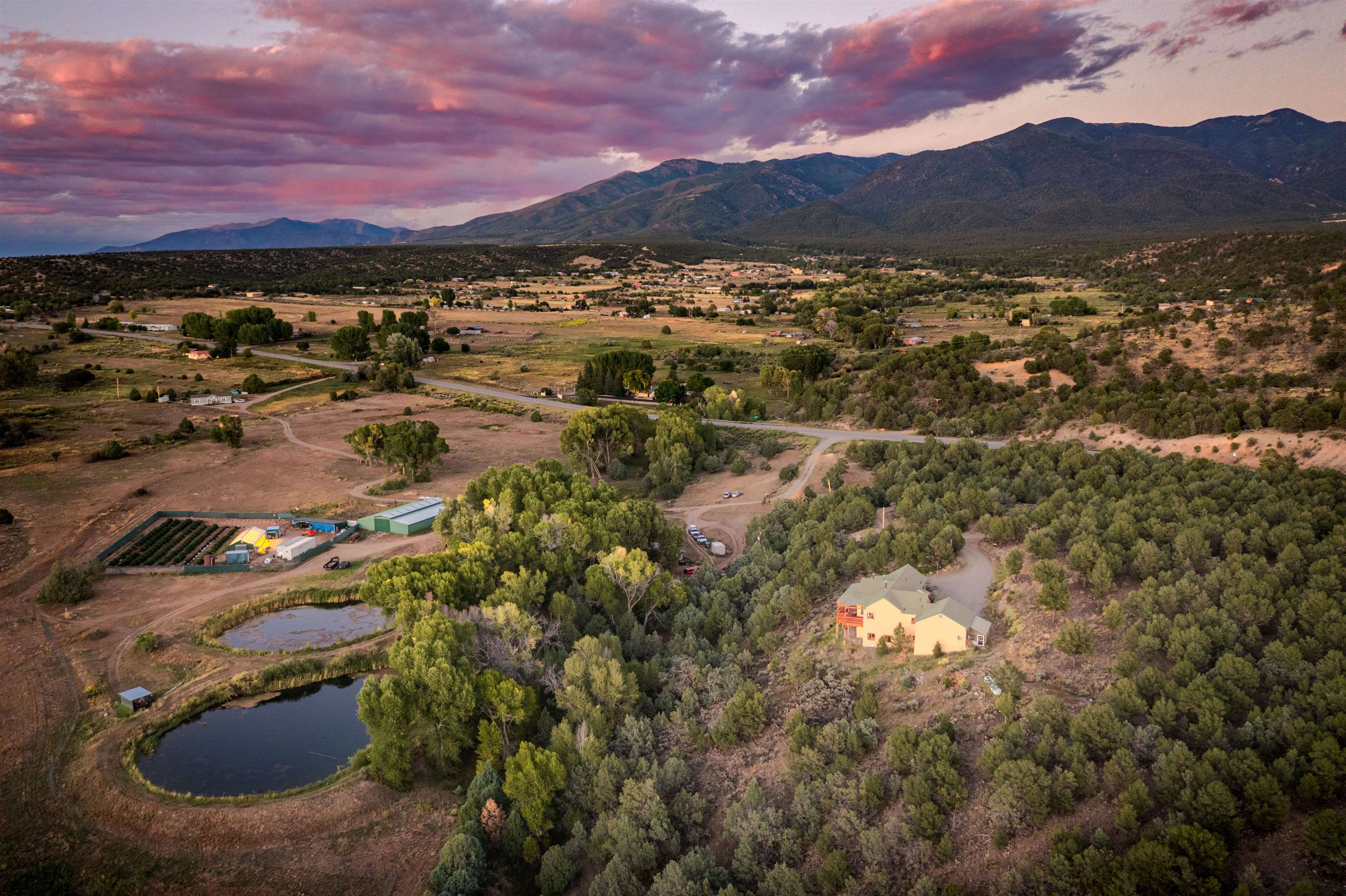 Incredible One-of-a-Kind Residence on the San Cristobal Hillside ~ Let me introduce you to this private and perfectly situated property on 3.5 plus acres overlooking the lush San Cristobal Valley. This meticulously overbuilt, contemporary Southwestern style home offers a truly unparalleled living experience, surrounded by tranquil ponds and a picturesque canyon. The property is a haven for wildlife, with a neighboring water source attracting a variety of animals that can be observed from the expansive, three-quarter wrap-around deck. Step inside through hand-carved doors salvaged from the historic Our Lady of Guadalupe Church in downtown Taos from the 1800s. The interior blends traditional Southwestern touches like Saltillo tile and diamond-finish walls with elegant wood accents. The home's efficient construction boasts a high R-value with 2-inch thick rigid fiberglass insulated walls and 20-inch blown-in ceiling insulation--keeping the space comfortable year-round. Passive solar windows and number one diesel wall heaters provide additional warmth, creating a perfectly inviting atmosphere. The antique wood stove in the kitchen is a great back-up, and can even be used for cooking like they did in the good ol' days. The true highlight of the homes is the ability to carry out true Indoor-Outdoor living, with multiple egress points leading to the grand deck and its awe-inspiring daily views. The primary ensuite, complete with a loft, walk-in closets, and high ceilings, offers a serene retreat. The residence is also ADA compliant, featuring an installed wheelchair lift. The lower level provides a second bedroom, a large living area, and two bonus rooms perfect for a gym, office, den, or perhaps a second separate living space. Back upstairs you will find a sunroom currently being used as an office, but certainly a place to house all your indoor greener.y The property also includes a detached studio space, currently utilized as a sewing room but easily adaptable as an art studio or guest casita equipped electric. A spacious storage room and a south-facing greenhouse for year-round gardening complete the grounds attached to the studio.This exceptional home is conveniently located on the north side of town, offering quick access to Taos Ski Valley, the Rio Grande River, and a variety of trails for hiking, biking, hunting, and fishing galore. Properties of this caliber are a rare find; don't miss the chance to make this extraordinary residence your own.