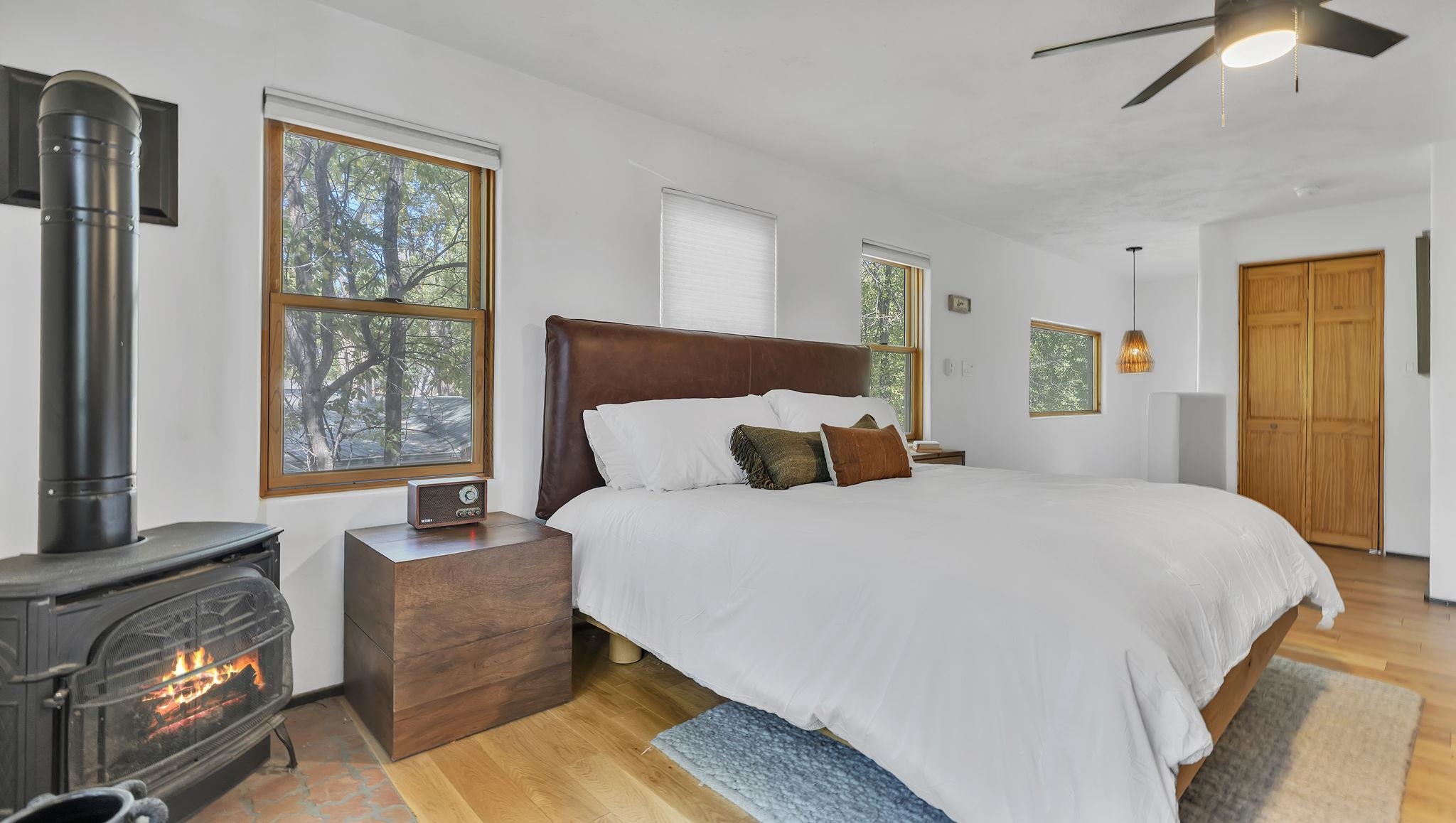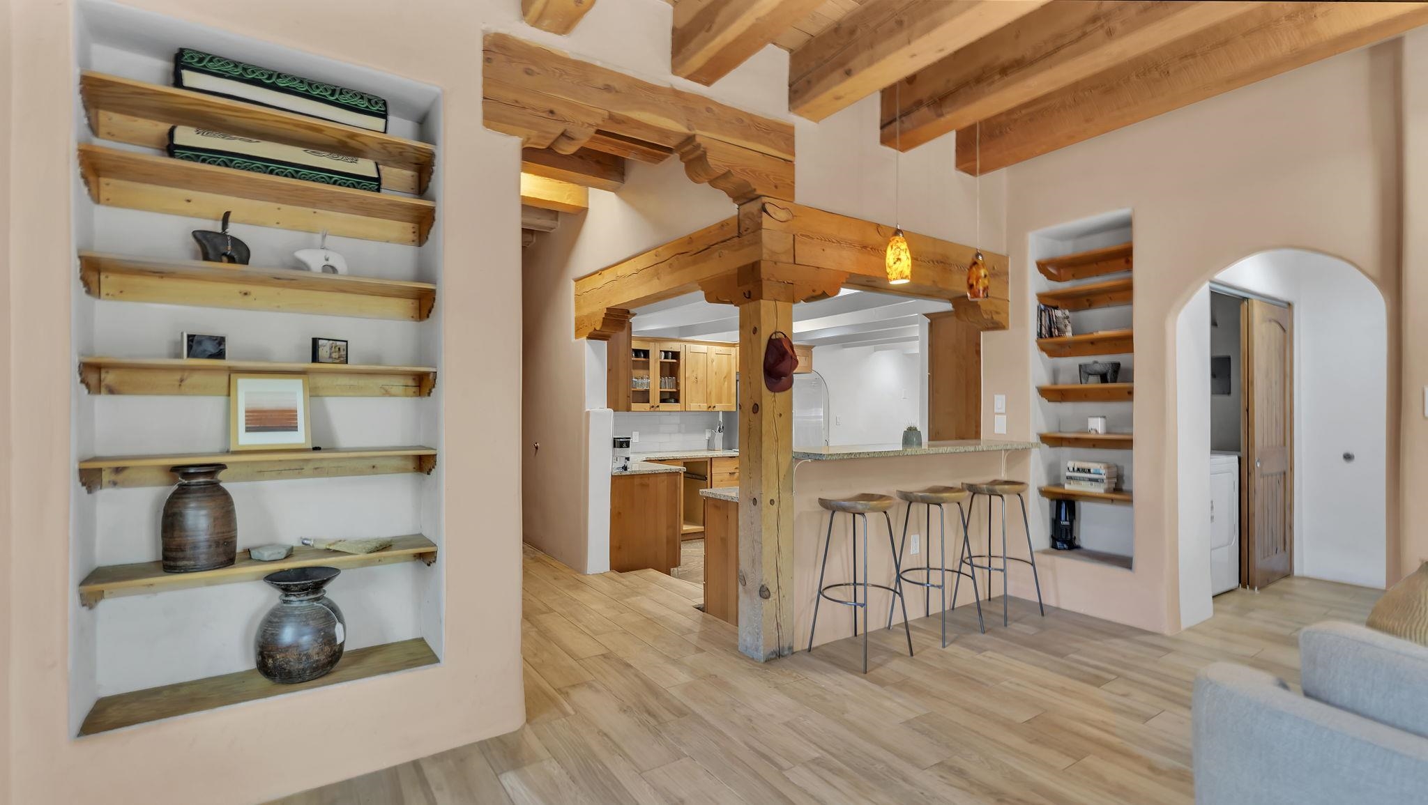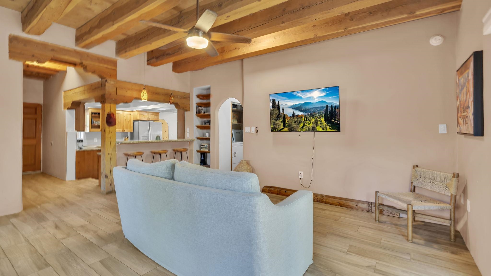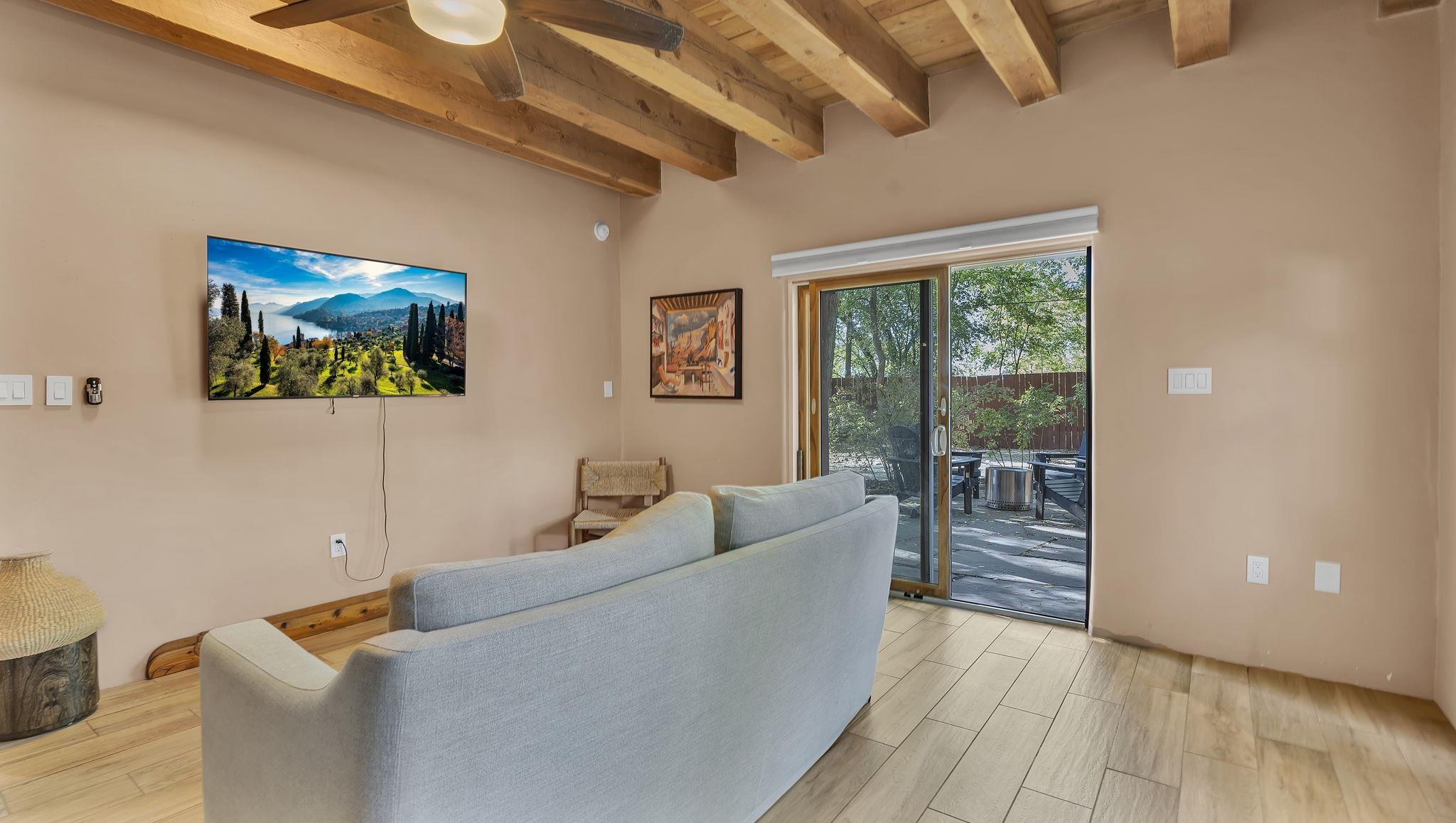 True Taos Charm on Montoya Street Near Taos Plaza ~ This authentic, beautifully remodeled adobe home is a downtown Taos masterpiece, blending historic character with modern luxury. Located just a short stroll from the Taos Plaza, this 1940s-era property features a main house with 3 bedrooms and 2 baths, plus a valuable detached upstairs studio apartment perfect for rental income or a private guest space. Inside the main home, the renovation is meticulous. High-end fixtures complement classic Southwestern style, including elegant oiled pine beams and corbels on the ceilings, and flagstone and wood-inspired tile floors. The kitchen is a chefs desire with stainless steel appliances, thoughtful space, and ample storage. The central living space with extra high ceilings is where you make year-round memories with family and friends. Spacious bedrooms are bathed in natural sunlight, and two offer direct access to the lush, shaded outdoor patios. The home sits on a large, landscaped lot that borders Couse Pasture, providing a fenced backyard ideal for pets to roam and children to play. These spaces, along with the thoughtful layout of the home are designed for entertaining guest for all the holidays and Park Concerts. At this location you are also close to the chic and newly restored Hotel Willa where you will experience some of the finest hospitality and dining in the Southwest. This property is a rare "Old Taos" gem, offering the ultimate walkability and privacy. Owning a home here means immersing yourself in the many special features of Taos, New Mexico. Nestled against the dramatic backdrop of the Sangre de Cristo Mountains, Taos is renowned for its vibrant art scene, with world-class galleries and museums around every corner. It's a haven for outdoor enthusiasts, offering year-round recreation from skiing and snowboarding at Taos Ski Valley to hiking, mountain biking, hunting, fishing, and whitewater rafting on the Rio Grande. The town is rich with history and culture, and offers a unique blend of Native American, Hispanic, and Anglo traditions. In Taos you'll find a community that values both the high desert's serene beauty and a lively, independent spirit. At this home you will find the comfort and peace you've been looking for in our majestic high desert