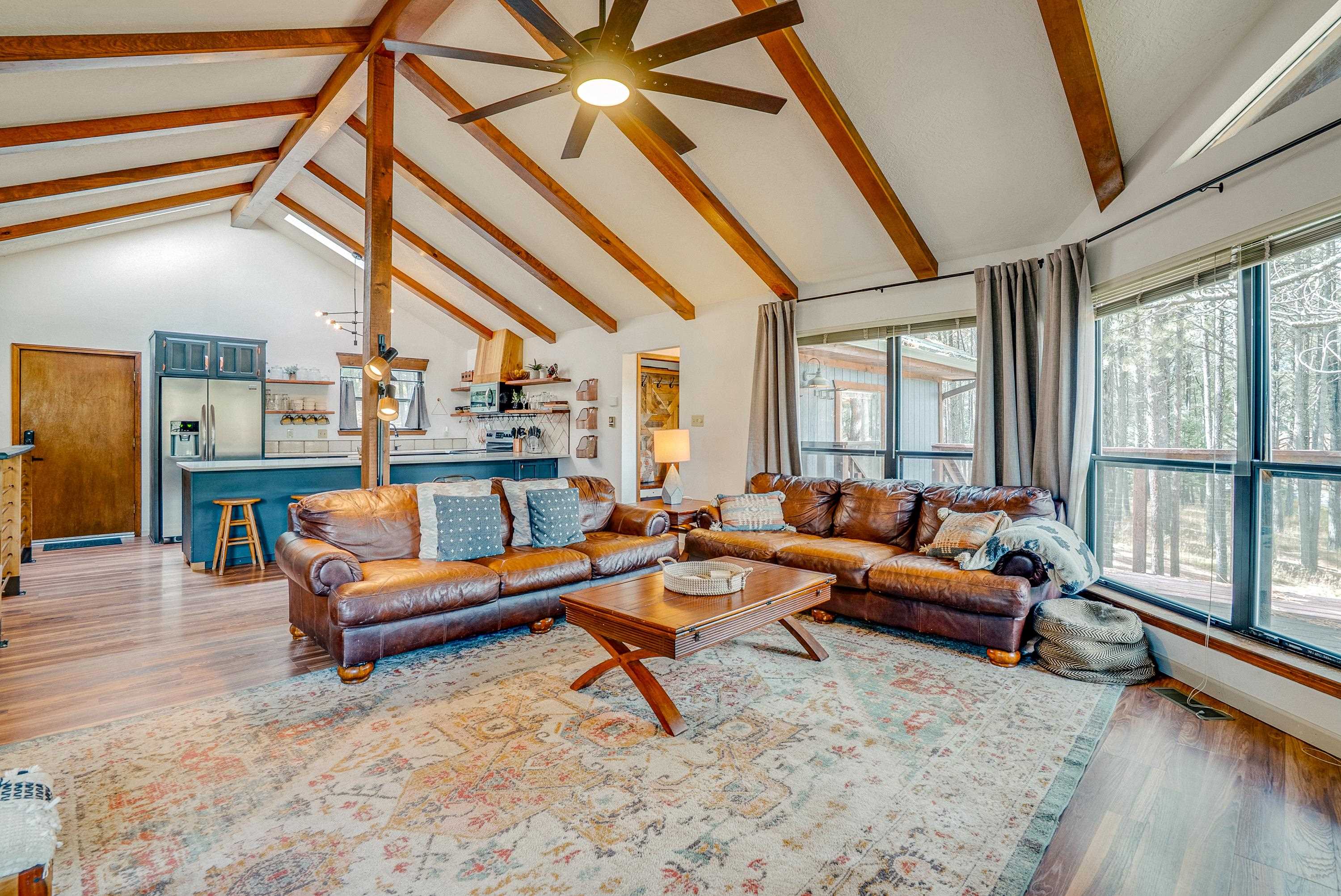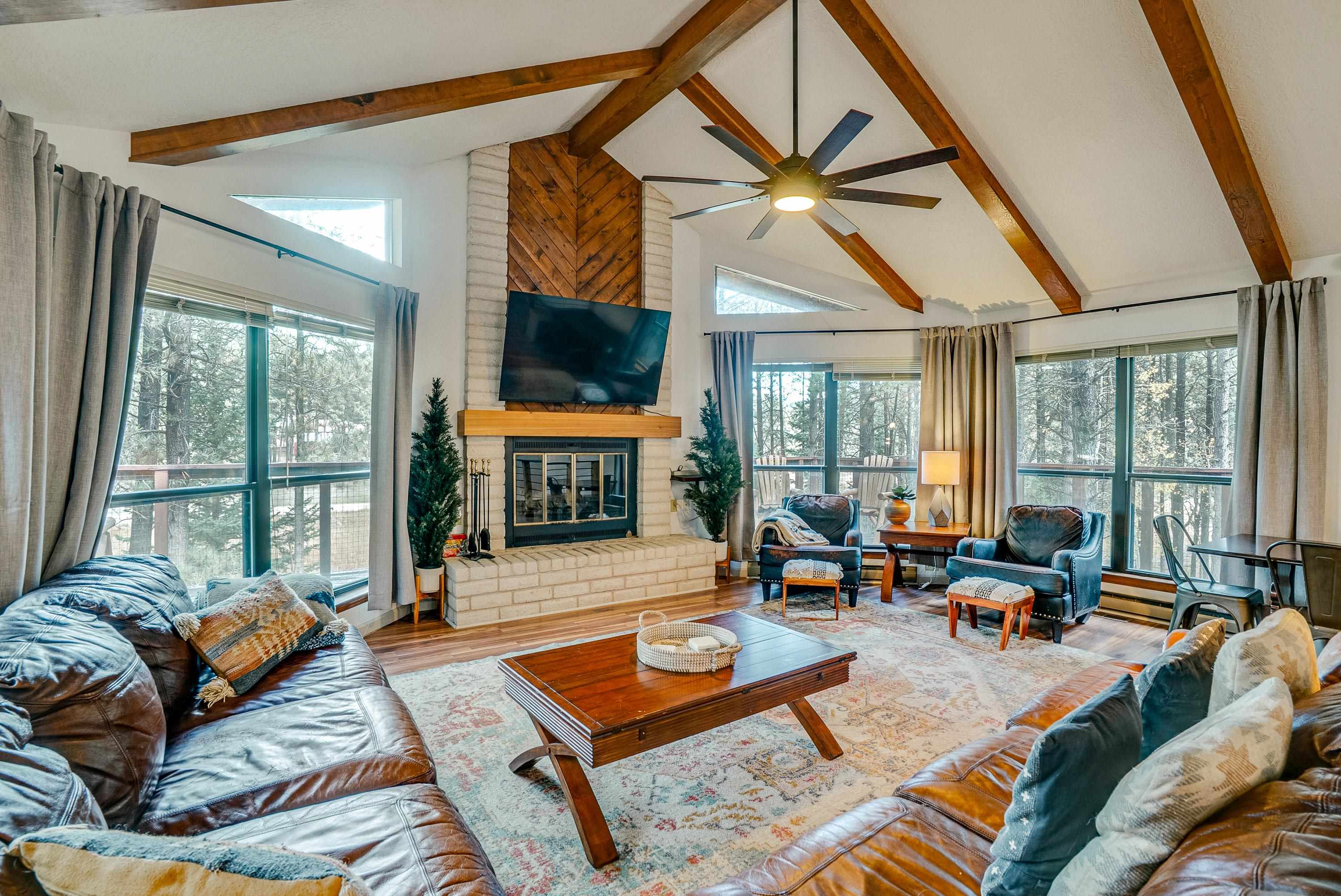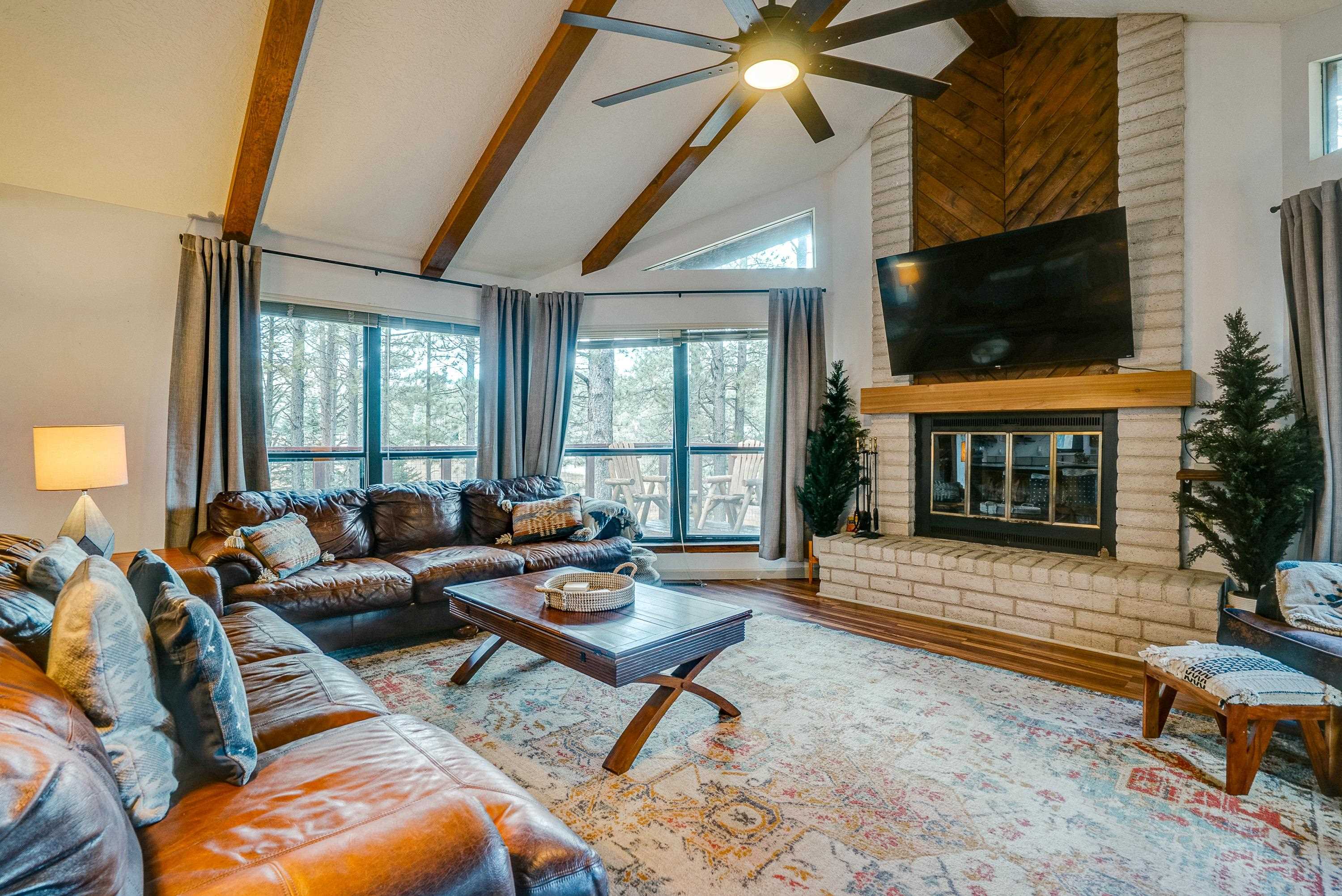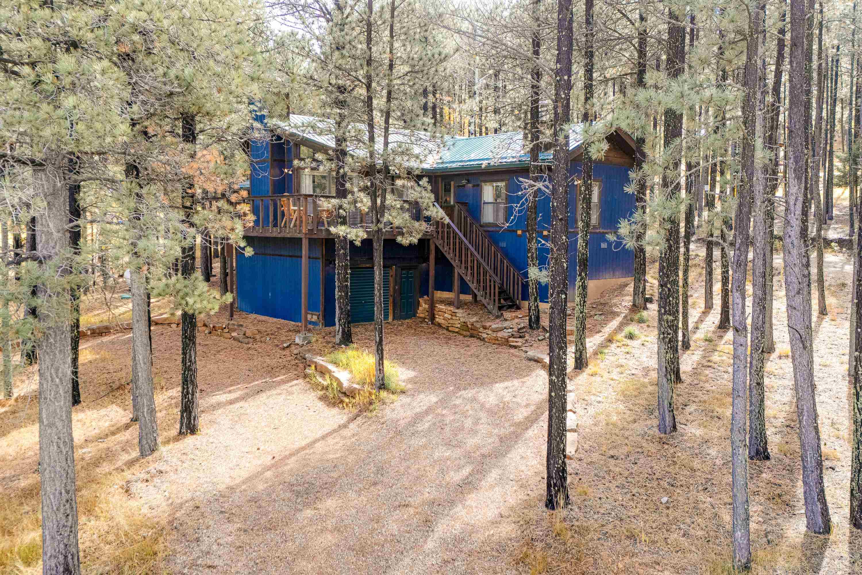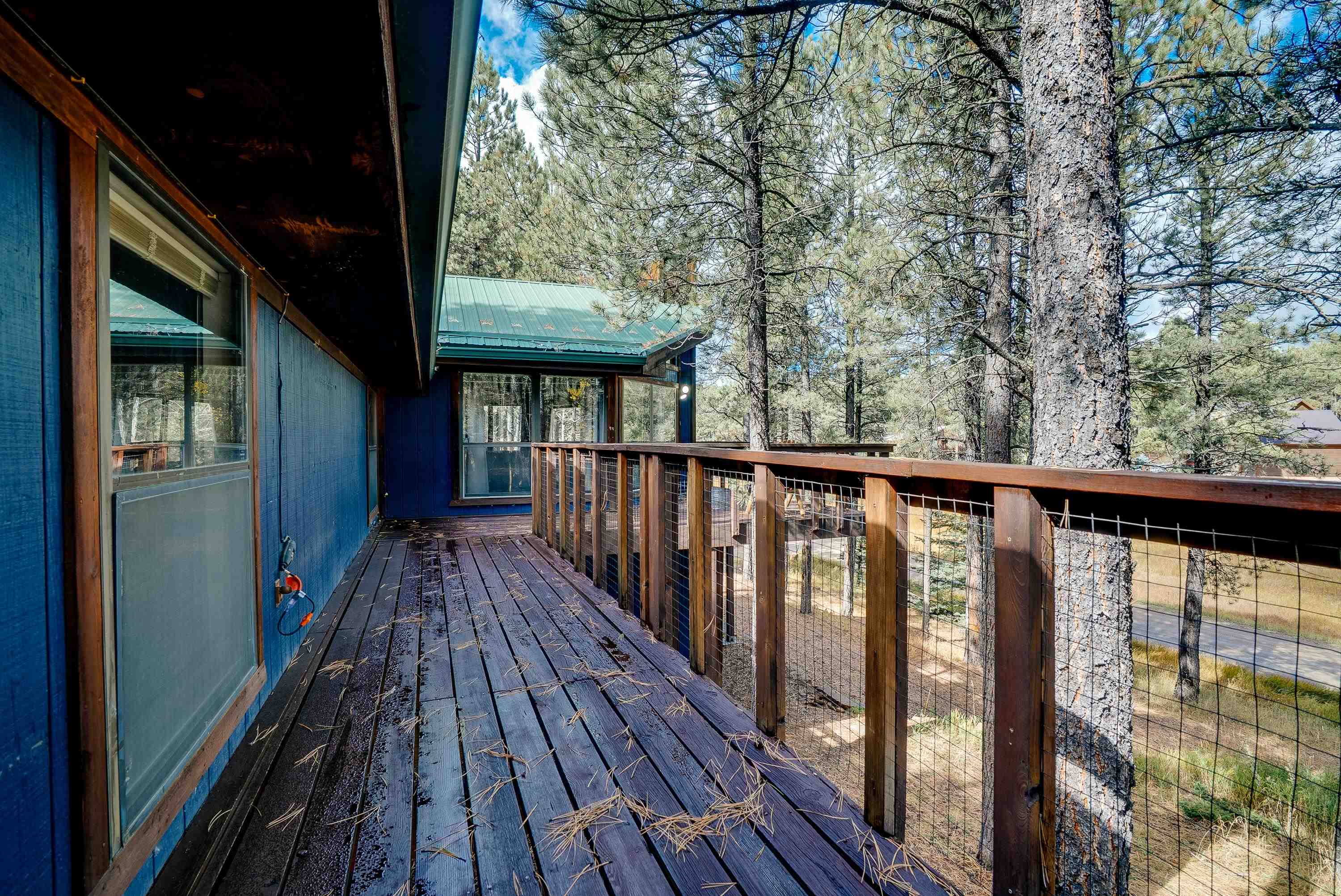 Tucked low in the Moreno Valley for easy, year-round access, this peaceful mountain retreat captures the best of Angel Fire living. Surrounded by towering pines on more than an acre of forested privacy, with a greenbelt across the street and no neighbors in sight, it's a place where the only sounds you'll hear are birdsong and the wind moving through the trees. Here, the days move at the pace of mountain life. Hop on your UTV or golf cart and ride to the Country Club, tee off at the golf course, or wander nearby hiking trails under clear summer skies. Just minutes away, Monte Verde Lake invites you to cast a line for trout, paddleboard or canoe across calm mountain waters, or stroll around its scenic shoreline. And when winter arrives, you're only a short drive from the ski mountain, Nordic Center, and sledding hill, then back home to a cozy wood-burning fire and the hush of the forest. Inside, rustic charm meets modern comfort. Quartz and marble countertops, LVP flooring, and a wood-burning fireplace create a warm, welcoming vibe. With four bedrooms and three full baths, there's space for everyone to gather. Outside, the zip-line, fort, and slack-line turn the backyard into a forest playground for kids and adults alike. Thoughtfully furnished and beautifully styled, this home is offered fully furnished and turn-key, right down to the details, so you can start enjoying it from day one. Whether you're looking for a personal retreat, a family getaway, or a ready-to-go short-term rental with sleeping for eight, 57 Sarazen Terrace delivers the freedom, connection, and serenity you've been searching for. Bring your suitcase and toothbrush, and step straight into Angel Fire living. To see everything included in the sale, contact your favorite REALTOR® for details and a private showing. AAFPO Membership is $1,695 paid annually (valid May 2025-April 2026)