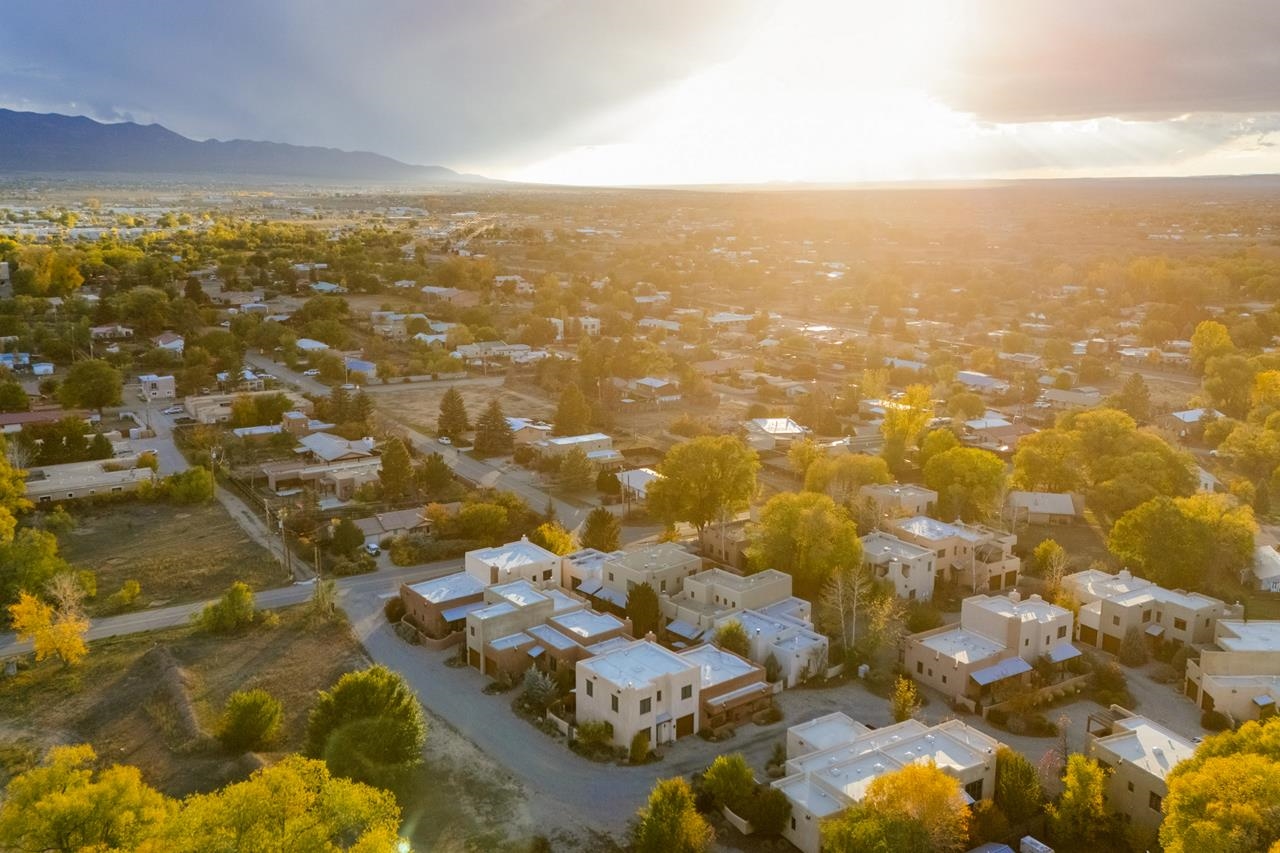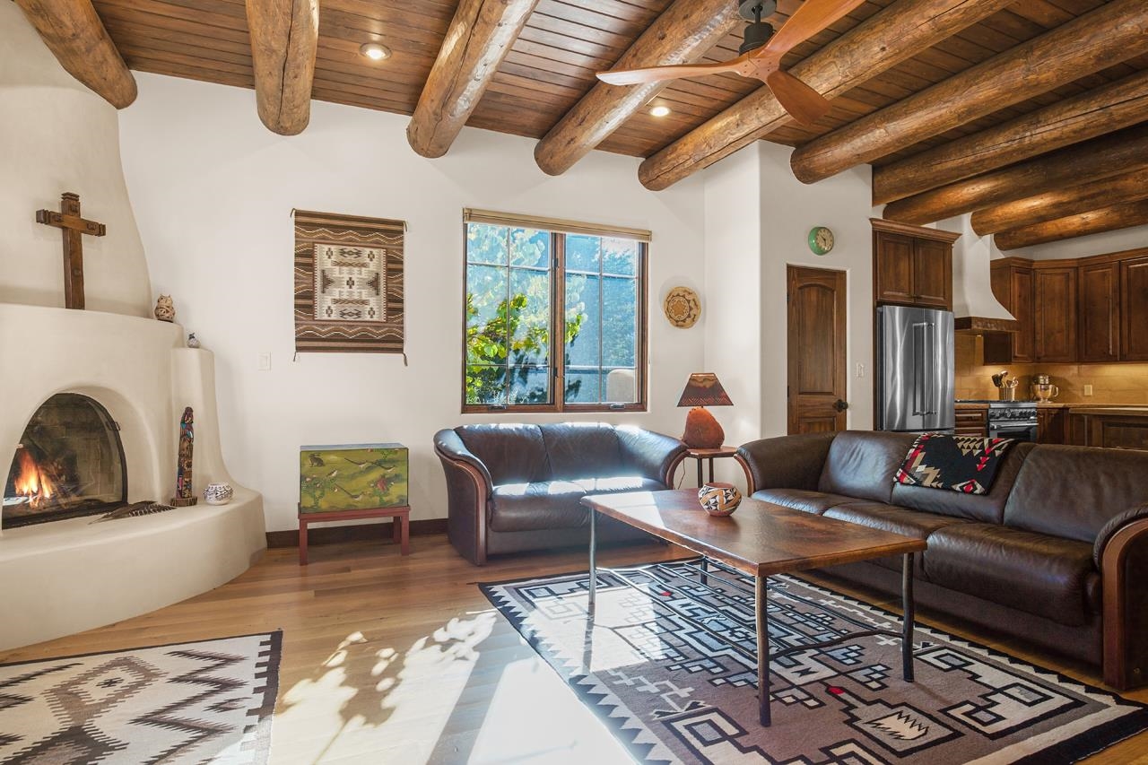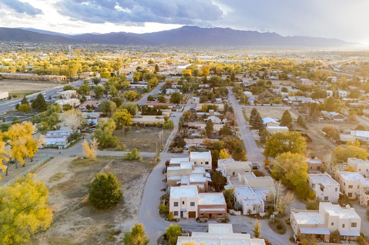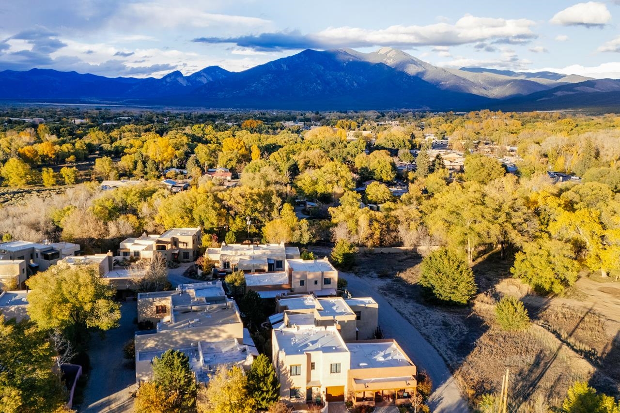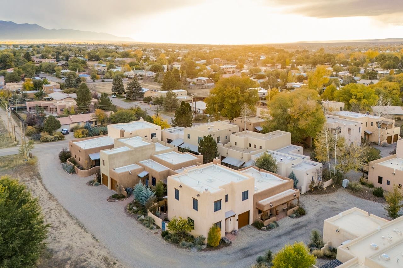 Move right in and start living the good life; no to-do list required! This stunning, high-quality condo in the heart of town is as turnkey as they come. Beautifully maintained and barely lived in, it feels brand new but with all the benefits of thoughtful, careful ownership. Every detail shines, every finish sparkles. This is the kind of home where you can drop your bags, pour a drink, and immediately feel at home. As a desirable corner end unit, this condo enjoys extra privacy, wonderful natural light, and beautifully landscaped surroundings that make it feel like its own little oasis but is under a mile to Taos Plaza. Inside, the open-concept great room glows with natural light, featuring gorgeous white oak floors, soaring viga-accented ceilings, and a cozy gas kiva fireplace for that perfect Taos touch. The kitchen is a dream. Knotty Alder cabinetry with soft-close hinges, sandstone countertops, premium KitchenAid appliances with a Bertazzoni range. The layout flows effortlessly from kitchen to dining area to a private backyard with a covered portal, perfect for sunny brunches or starlit evenings. Upstairs, you'll find three spacious bedrooms, views straight toward Taos Mountain, and two spa-like bathrooms finished in travertine. The primary suite is serene and elegant, with an ensuite bath that feels like a boutique retreat and a plus sized closet for your summer AND winter duds. Every inch of this home whispers quality, from the soundproofed walls, 2x8 construction and Sierra Pacific windows to the Hunter Douglas shades, Kohler fixtures, and built-in radon mitigation system. Even the roof and wall insulation levels are top tier, (R51 and R33) to be exact. With an attached garage, unbeatable in-town location, and not a single project in sight, this condo is pure Taos ease, polished, pristine, and absolutely move-in ready. For more, see video: https://youtu.be/KiPjo9KT-tE