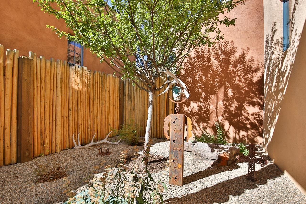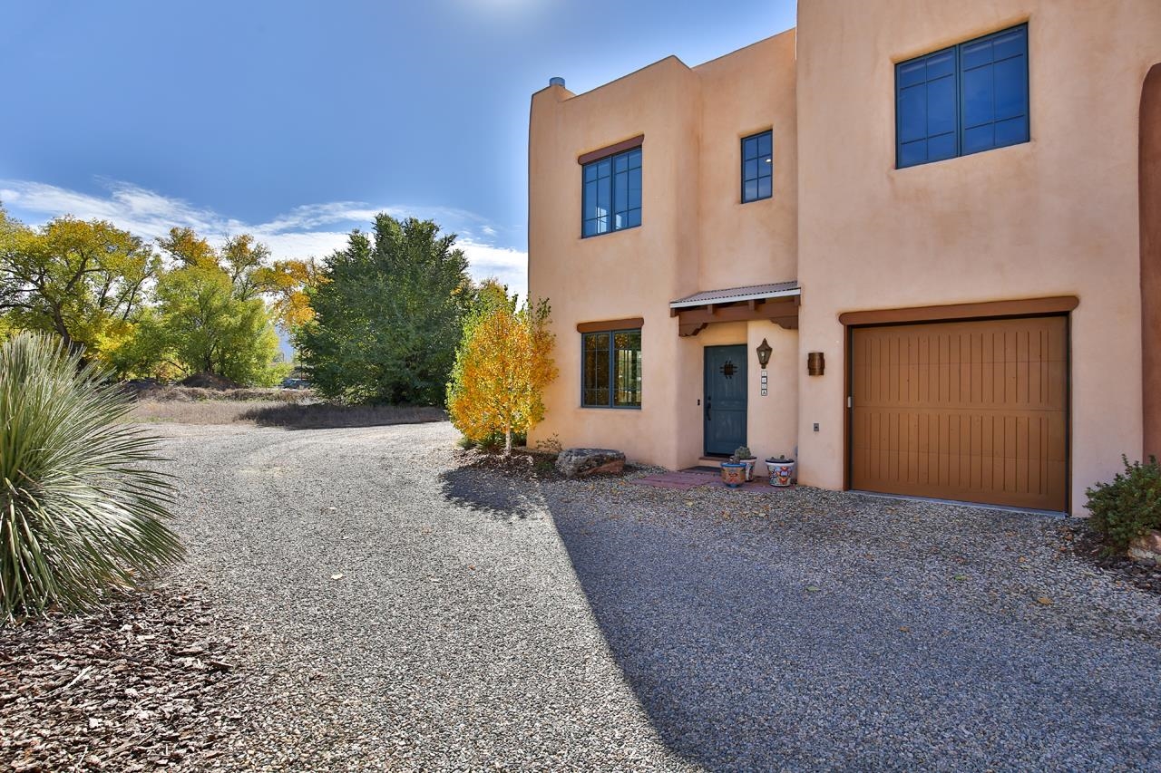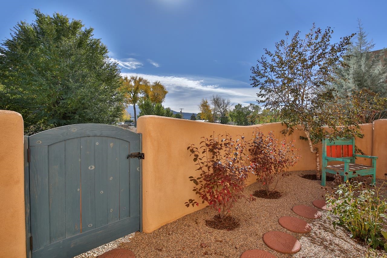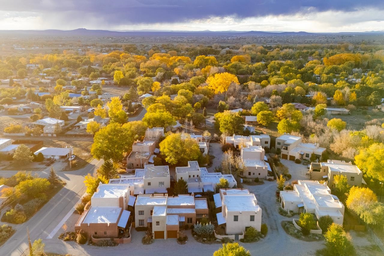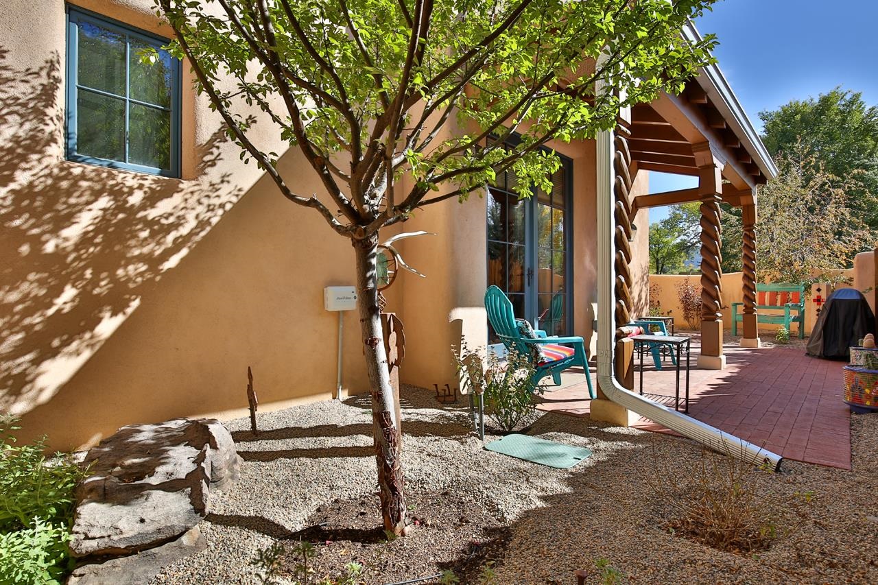 Move right in and start living the good life; no to-do list required! This stunning, high-quality condo in the heart of town is as turnkey as they come. Beautifully maintained and barely lived in, it feels brand new but with all the benefits of thoughtful, careful ownership. Every detail shines, every finish sparkles. This is the kind of home where you can drop your bags, pour a drink, and immediately feel at home. As a desirable corner end unit, this condo enjoys extra privacy, wonderful natural light, and beautifully landscaped surroundings that make it feel like its own little oasis but is under a mile to Taos Plaza. Inside, the open-concept great room glows with natural light, featuring gorgeous white oak floors, soaring viga-accented ceilings, and a cozy gas kiva fireplace for that perfect Taos touch. The kitchen is a dream. Knotty Alder cabinetry with soft-close hinges, sandstone countertops, premium KitchenAid appliances with a Bertazzoni range. The layout flows effortlessly from kitchen to dining area to a private backyard with a covered portal, perfect for sunny brunches or starlit evenings. Upstairs, you'll find three spacious bedrooms, views straight toward Taos Mountain, and two spa-like bathrooms finished in travertine. The primary suite is serene and elegant, with an ensuite bath that feels like a boutique retreat and a plus sized closet for your summer AND winter duds. Every inch of this home whispers quality, from the soundproofed walls, 2x8 construction and Sierra Pacific windows to the Hunter Douglas shades, Kohler fixtures, and built-in radon mitigation system. Even the roof and wall insulation levels are top tier, (R51 and R33) to be exact. With an attached garage, unbeatable in-town location, and not a single project in sight, this condo is pure Taos ease, polished, pristine, and absolutely move-in ready. For more, see video: https://youtu.be/KiPjo9KT-tE