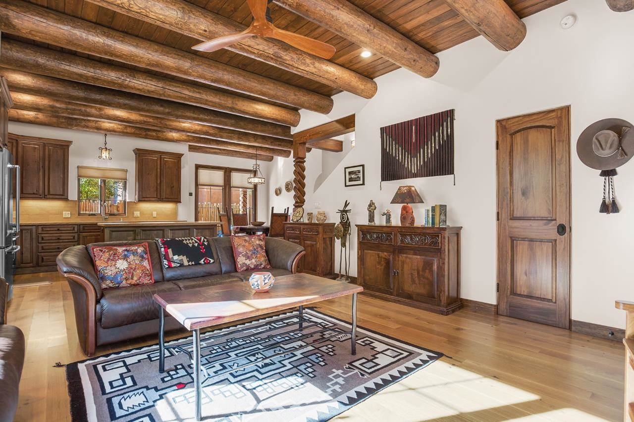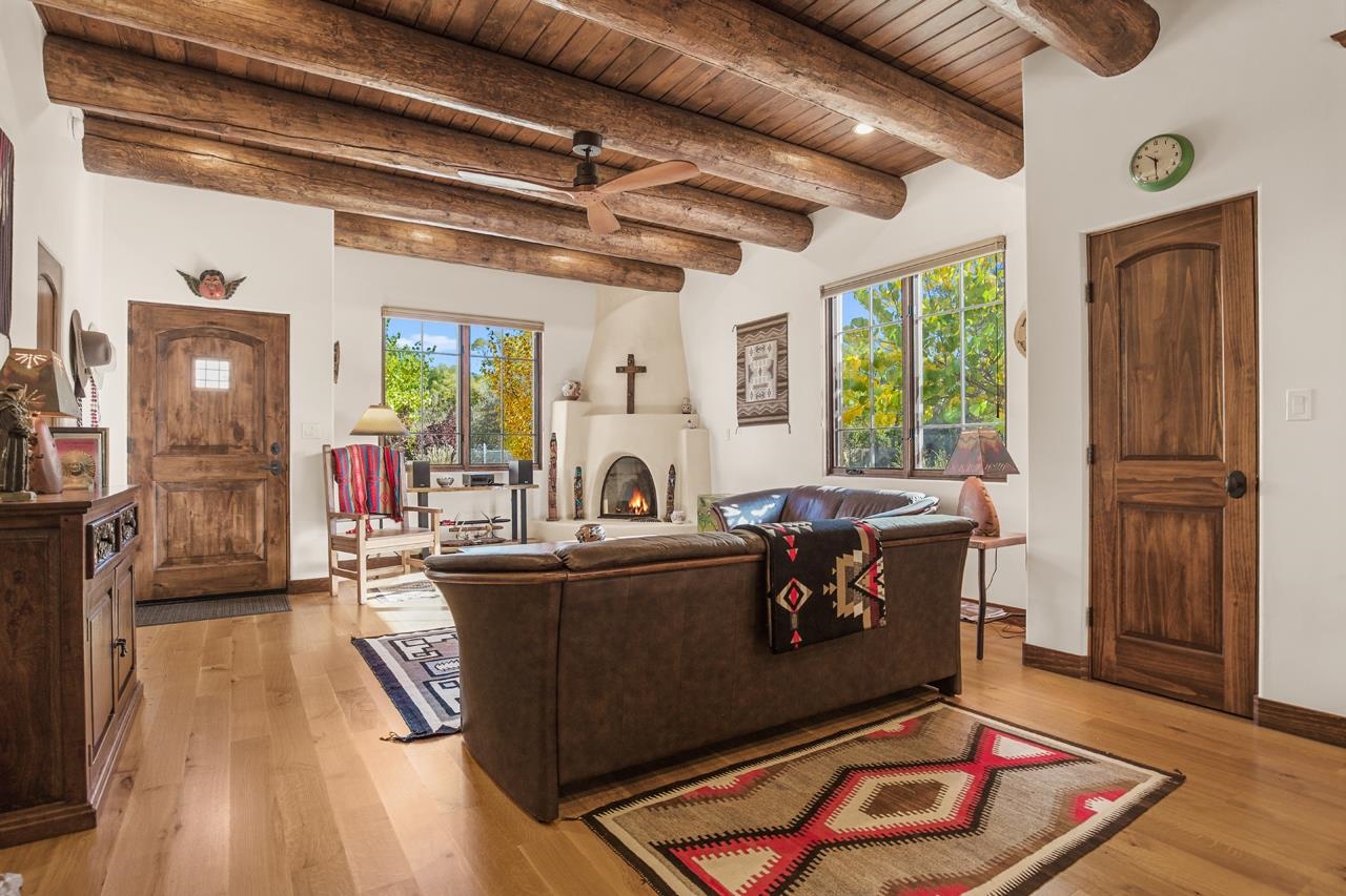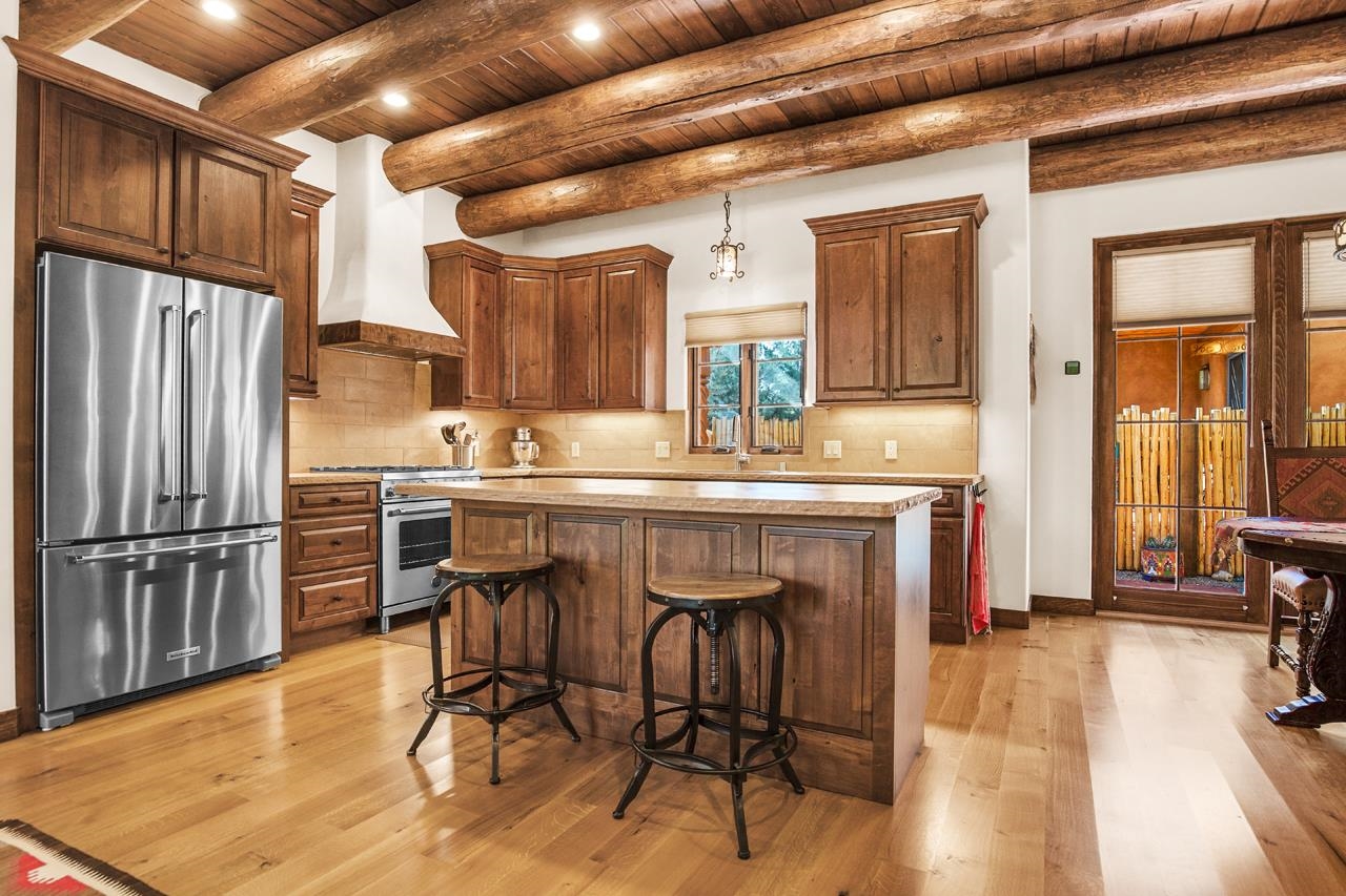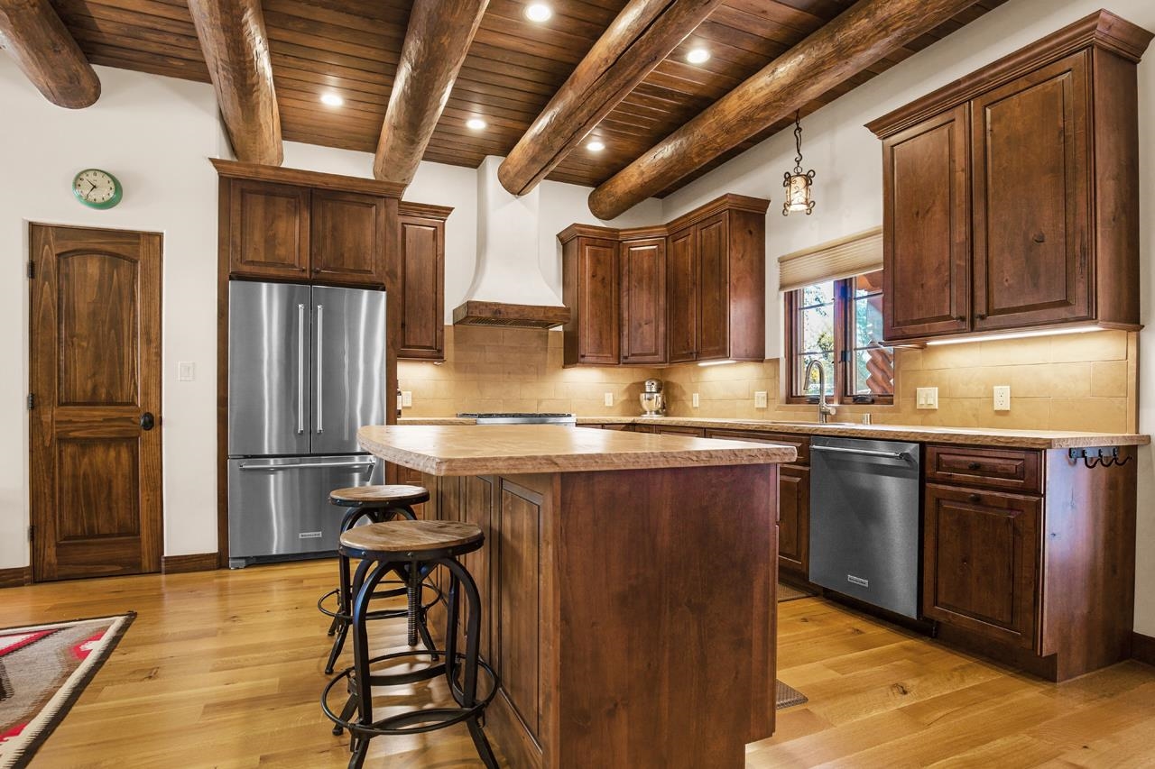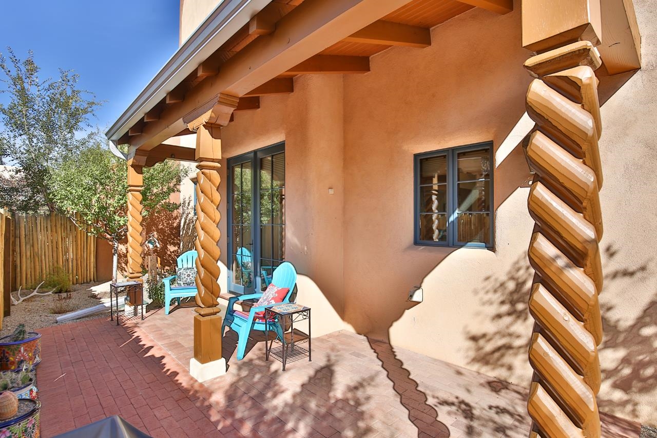 Move right in and start living the good life; no to-do list required! This stunning, high-quality condo in the heart of town is as turnkey as they come. Beautifully maintained and barely lived in, it feels brand new but with all the benefits of thoughtful, careful ownership. Every detail shines, every finish sparkles. This is the kind of home where you can drop your bags, pour a drink, and immediately feel at home. As a desirable corner end unit, this condo enjoys extra privacy, wonderful natural light, and beautifully landscaped surroundings that make it feel like its own little oasis but is under a mile to Taos Plaza. Inside, the open-concept great room glows with natural light, featuring gorgeous white oak floors, soaring viga-accented ceilings, and a cozy gas kiva fireplace for that perfect Taos touch. The kitchen is a dream. Knotty Alder cabinetry with soft-close hinges, sandstone countertops, premium KitchenAid appliances with a Bertazzoni range. The layout flows effortlessly from kitchen to dining area to a private backyard with a covered portal, perfect for sunny brunches or starlit evenings. Upstairs, you'll find three spacious bedrooms, views straight toward Taos Mountain, and two spa-like bathrooms finished in travertine. The primary suite is serene and elegant, with an ensuite bath that feels like a boutique retreat and a plus sized closet for your summer AND winter duds. Every inch of this home whispers quality, from the soundproofed walls, 2x8 construction and Sierra Pacific windows to the Hunter Douglas shades, Kohler fixtures, and built-in radon mitigation system. Even the roof and wall insulation levels are top tier, (R51 and R33) to be exact. With an attached garage, unbeatable in-town location, and not a single project in sight, this condo is pure Taos ease, polished, pristine, and absolutely move-in ready. For more, see video: https://youtu.be/KiPjo9KT-tE