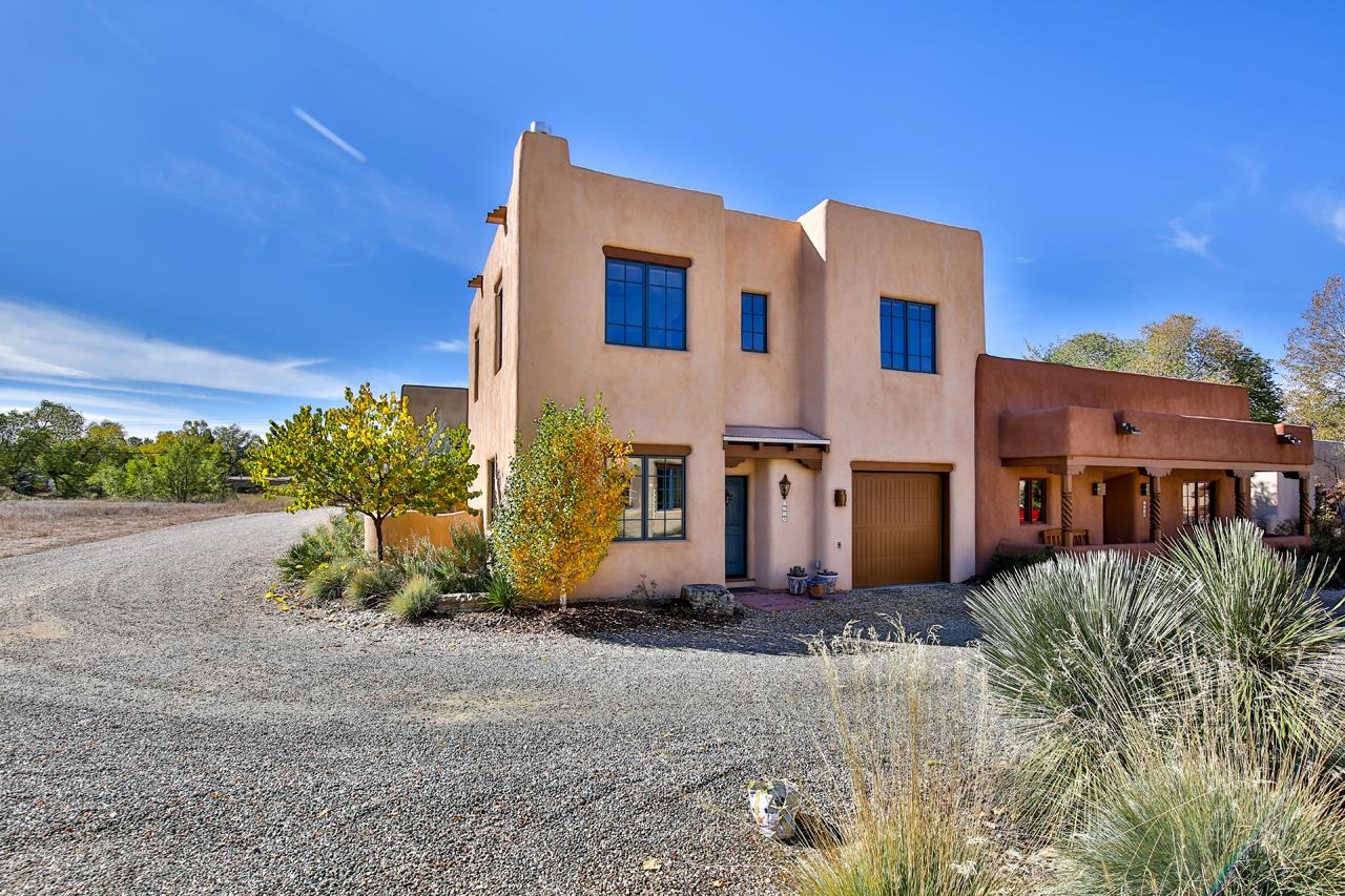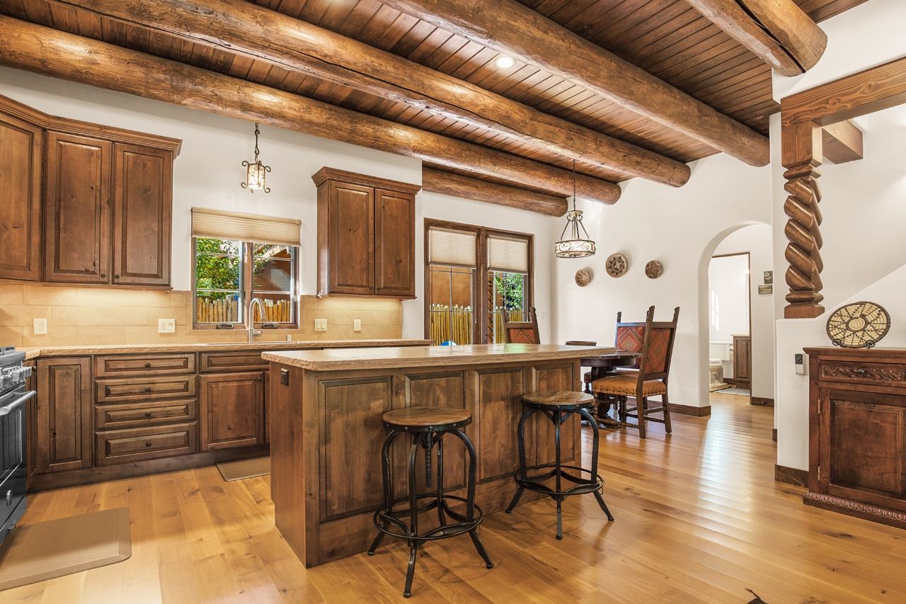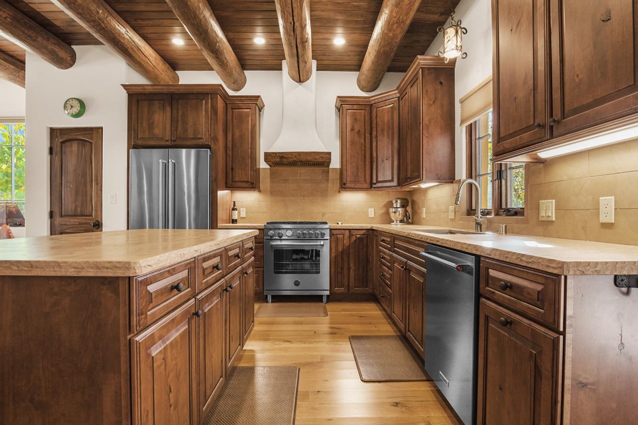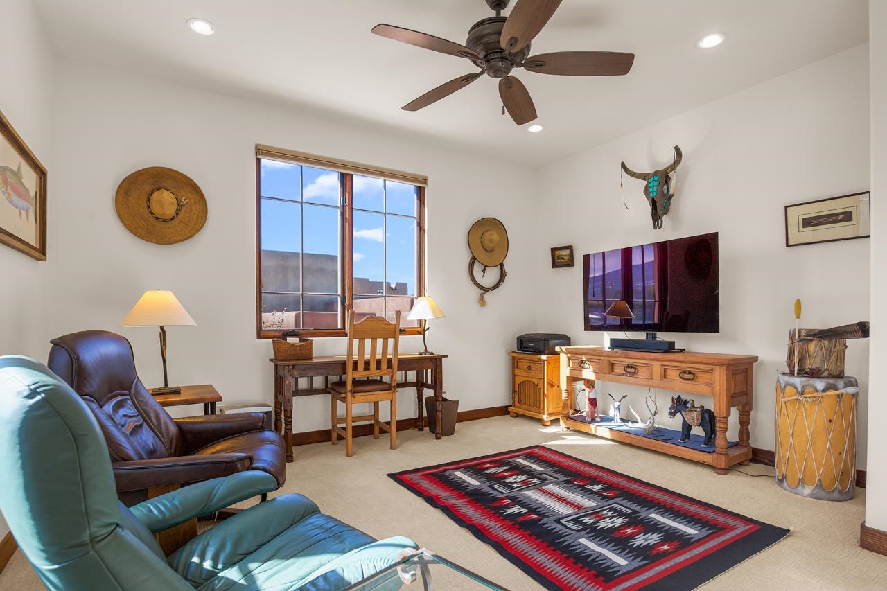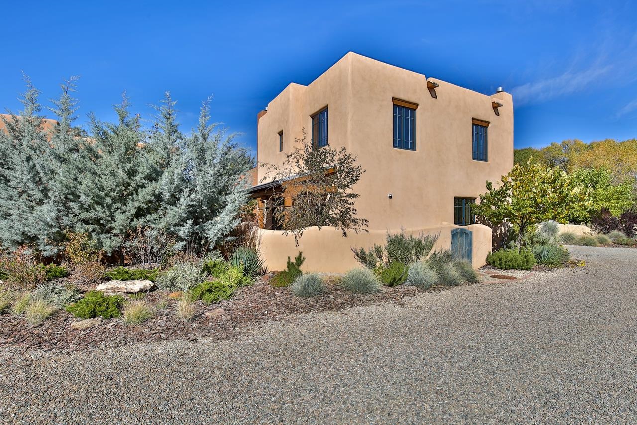 Move right in and start living the good life; no to-do list required! This stunning, high-quality condo in the heart of town is as turnkey as they come. Beautifully maintained and barely lived in, it feels brand new but with all the benefits of thoughtful, careful ownership. Every detail shines, every finish sparkles. This is the kind of home where you can drop your bags, pour a drink, and immediately feel at home. As a desirable corner end unit, this condo enjoys extra privacy, wonderful natural light, and beautifully landscaped surroundings that make it feel like its own little oasis but is under a mile to Taos Plaza. Inside, the open-concept great room glows with natural light, featuring gorgeous white oak floors, soaring viga-accented ceilings, and a cozy gas kiva fireplace for that perfect Taos touch. The kitchen is a dream. Knotty Alder cabinetry with soft-close hinges, sandstone countertops, premium KitchenAid appliances with a Bertazzoni range. The layout flows effortlessly from kitchen to dining area to a private backyard with a covered portal, perfect for sunny brunches or starlit evenings. Upstairs, you'll find three spacious bedrooms, views straight toward Taos Mountain, and two spa-like bathrooms finished in travertine. The primary suite is serene and elegant, with an ensuite bath that feels like a boutique retreat and a plus sized closet for your summer AND winter duds. Every inch of this home whispers quality, from the soundproofed walls, 2x8 construction and Sierra Pacific windows to the Hunter Douglas shades, Kohler fixtures, and built-in radon mitigation system. Even the roof and wall insulation levels are top tier, (R51 and R33) to be exact. With an attached garage, unbeatable in-town location, and not a single project in sight, this condo is pure Taos ease, polished, pristine, and absolutely move-in ready. For more, see video: https://youtu.be/KiPjo9KT-tE