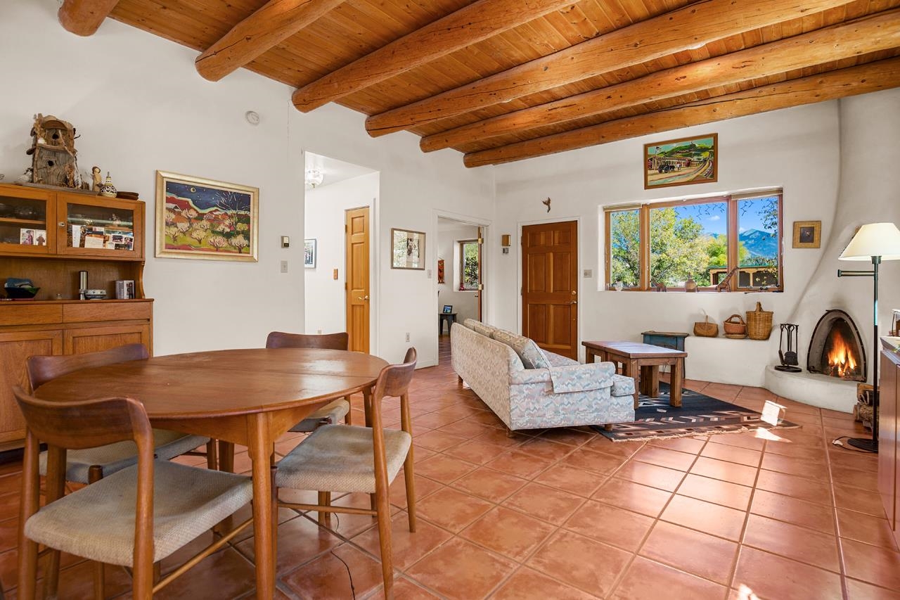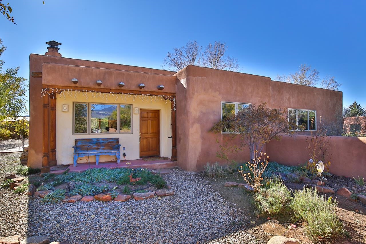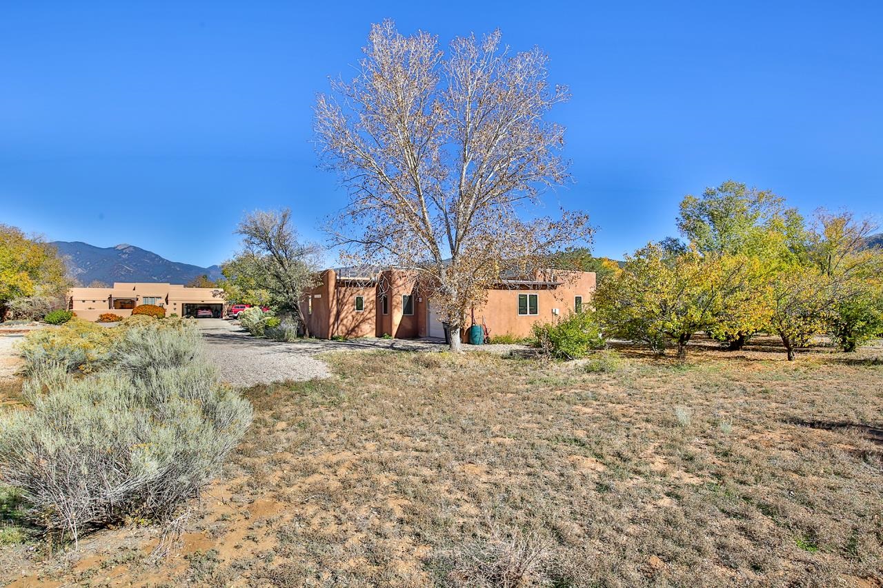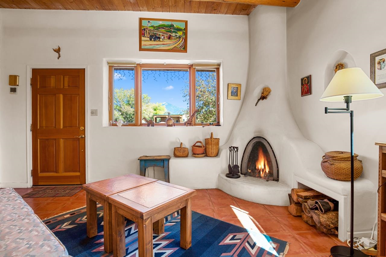 Bright Outlook - Located in the desirable residential area of Vegas de Taos Subdivision, this timeless Southwestern-style home blends classic charm with modern comfort all just minutes from town, restaurants, services, and Taos events. 1,479 sq.ft 2 bedrooms, 2 full baths, plus a bonus room off the living area, this home offers flexible space ideal for an office, studio, or den. Bonus room has a closet and could easily be a 3rd bedroom. The open-concept living area features high ceilings, pumice-crete construction, viga ceilings, nichos, and a kiva fireplace, creating a warm and inviting atmosphere. In-floor radiant heating throughout ensures year-round comfort. The light-filled kitchen boasts wooden cabinets with custom carving, skylight, a large functional island, and a separate dining area, perfect for entertaining or everyday living. The primary suite includes a large closet and a spacious bath with double sinks, bathtub, and a separate shower. The good-sized second bedroom is conveniently located near the second full bath. A laundry area in the hallway and abundant storage throughout add convenience and functionality. Tile and carpet floors, skylights, and expansive windows fill the home with natural light and showcase mountain and foothill views. A sliding glass door opens to a patio and naturally landscaped 0.37-acre yard, while a large gravel driveway provides ample parking. The attached 1-car garage offers parking, storage, or conversion to a studio or hobby space. The front courtyard features xeriscape landscaping, perennials, and a covered entry portal with stunning Taos Mountain views, completing this inviting and well-located home.