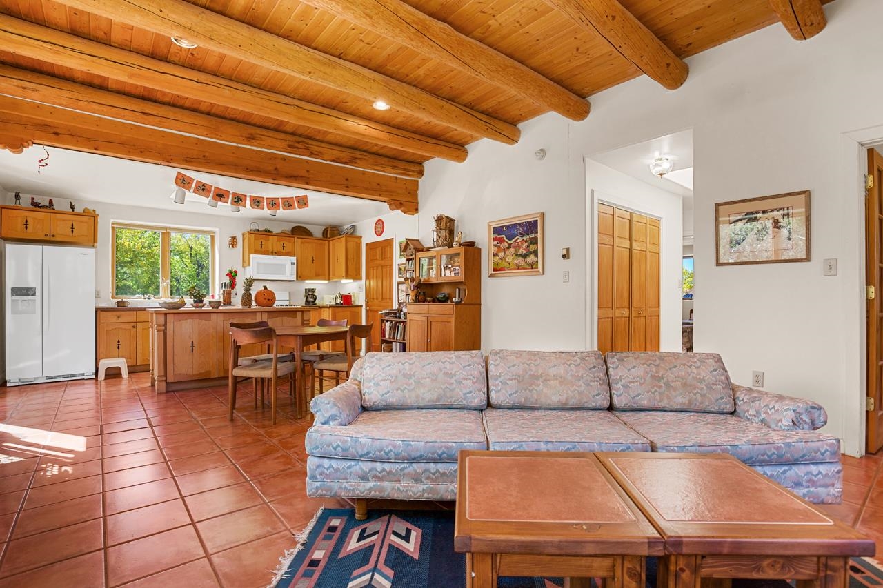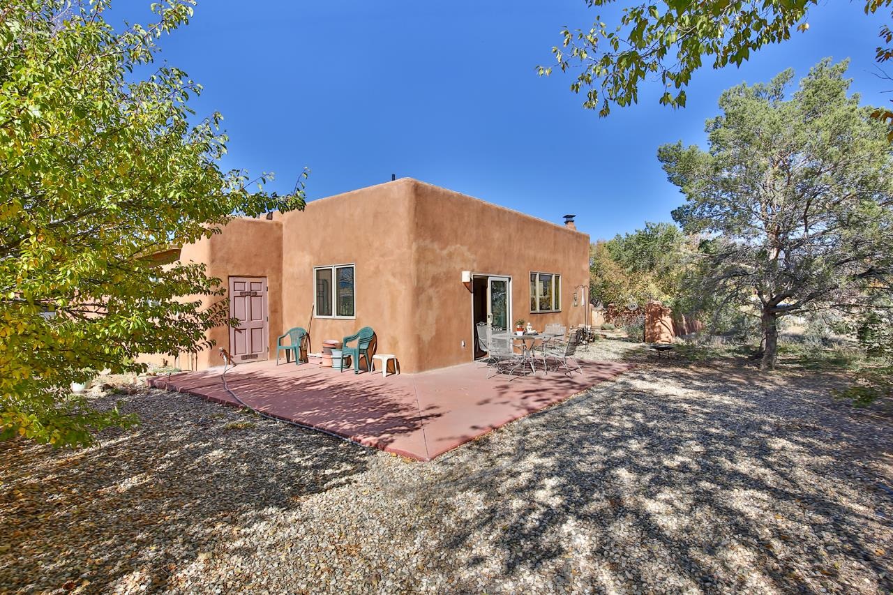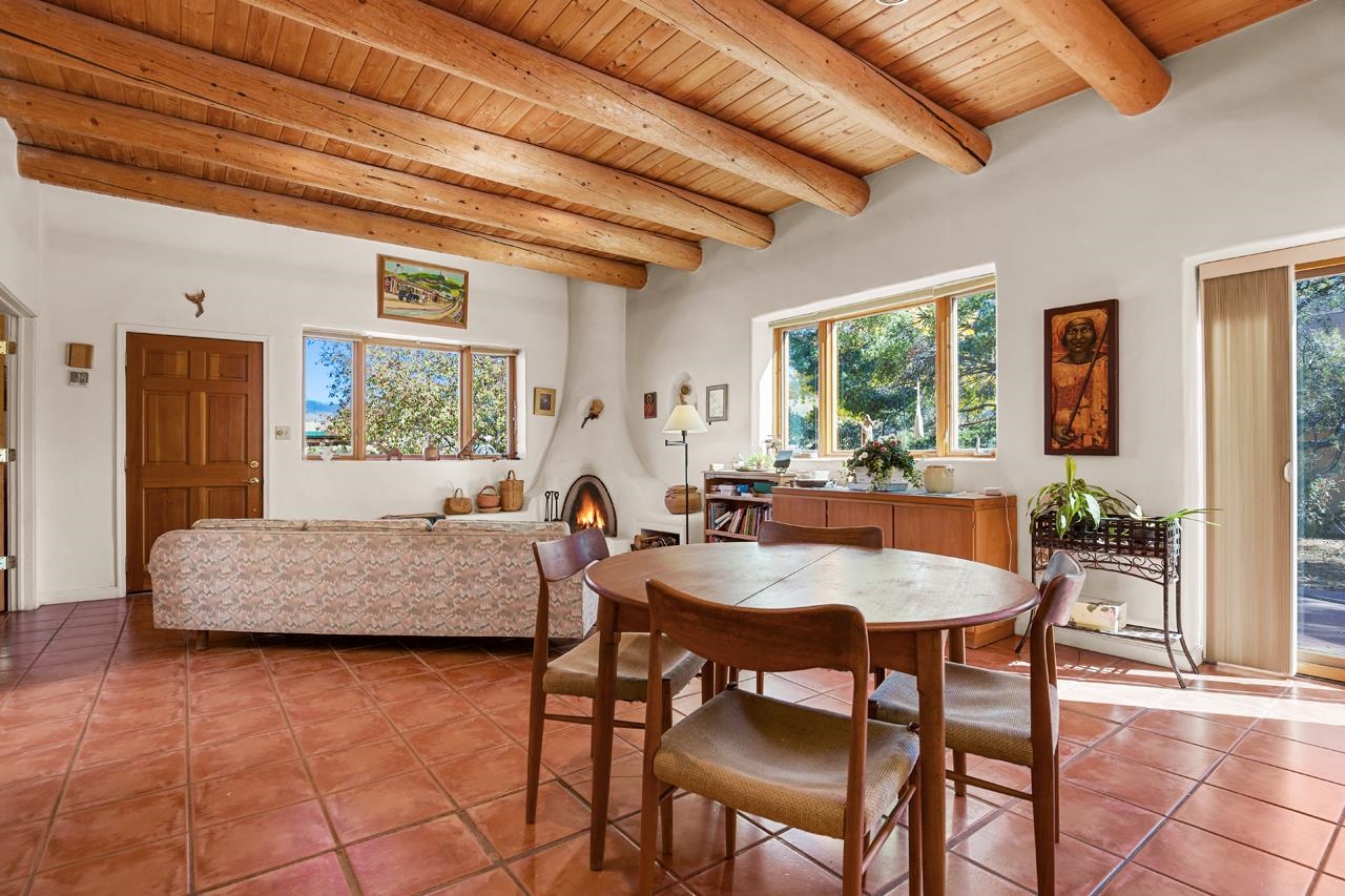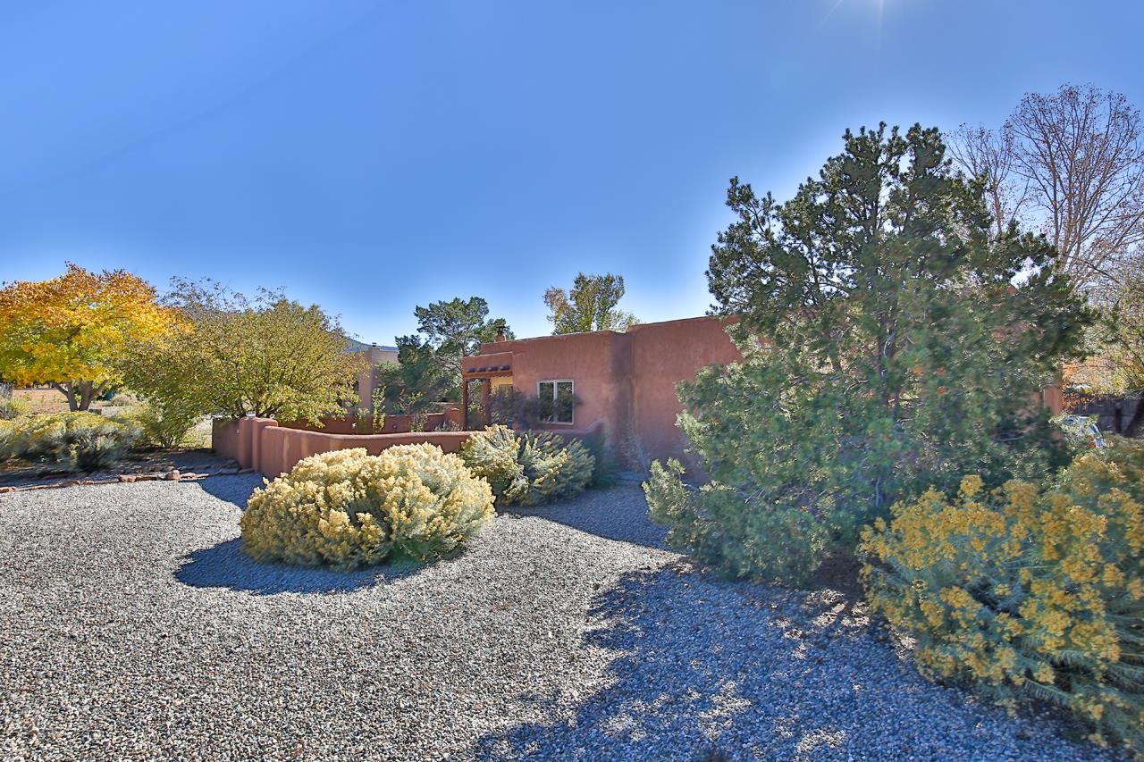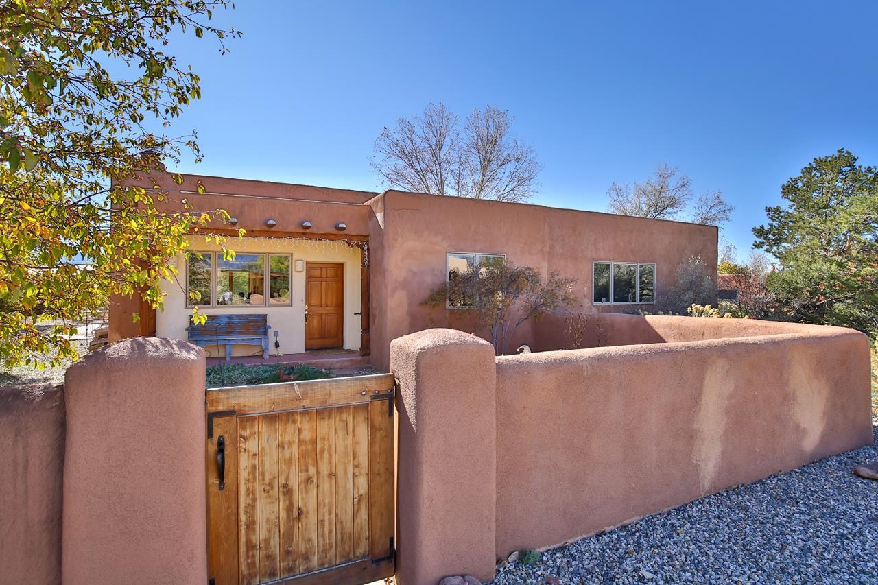 Bright Outlook - Located in the desirable residential area of Vegas de Taos Subdivision, this timeless Southwestern-style home blends classic charm with modern comfort all just minutes from town, restaurants, services, and Taos events. 1,479 sq.ft 2 bedrooms, 2 full baths, plus a bonus room off the living area, this home offers flexible space ideal for an office, studio, or den. Bonus room has a closet and could easily be a 3rd bedroom. The open-concept living area features high ceilings, pumice-crete construction, viga ceilings, nichos, and a kiva fireplace, creating a warm and inviting atmosphere. In-floor radiant heating throughout ensures year-round comfort. The light-filled kitchen boasts wooden cabinets with custom carving, skylight, a large functional island, and a separate dining area, perfect for entertaining or everyday living. The primary suite includes a large closet and a spacious bath with double sinks, bathtub, and a separate shower. The good-sized second bedroom is conveniently located near the second full bath. A laundry area in the hallway and abundant storage throughout add convenience and functionality. Tile and carpet floors, skylights, and expansive windows fill the home with natural light and showcase mountain and foothill views. A sliding glass door opens to a patio and naturally landscaped 0.37-acre yard, while a large gravel driveway provides ample parking. The attached 1-car garage offers parking, storage, or conversion to a studio or hobby space. The front courtyard features xeriscape landscaping, perennials, and a covered entry portal with stunning Taos Mountain views, completing this inviting and well-located home.