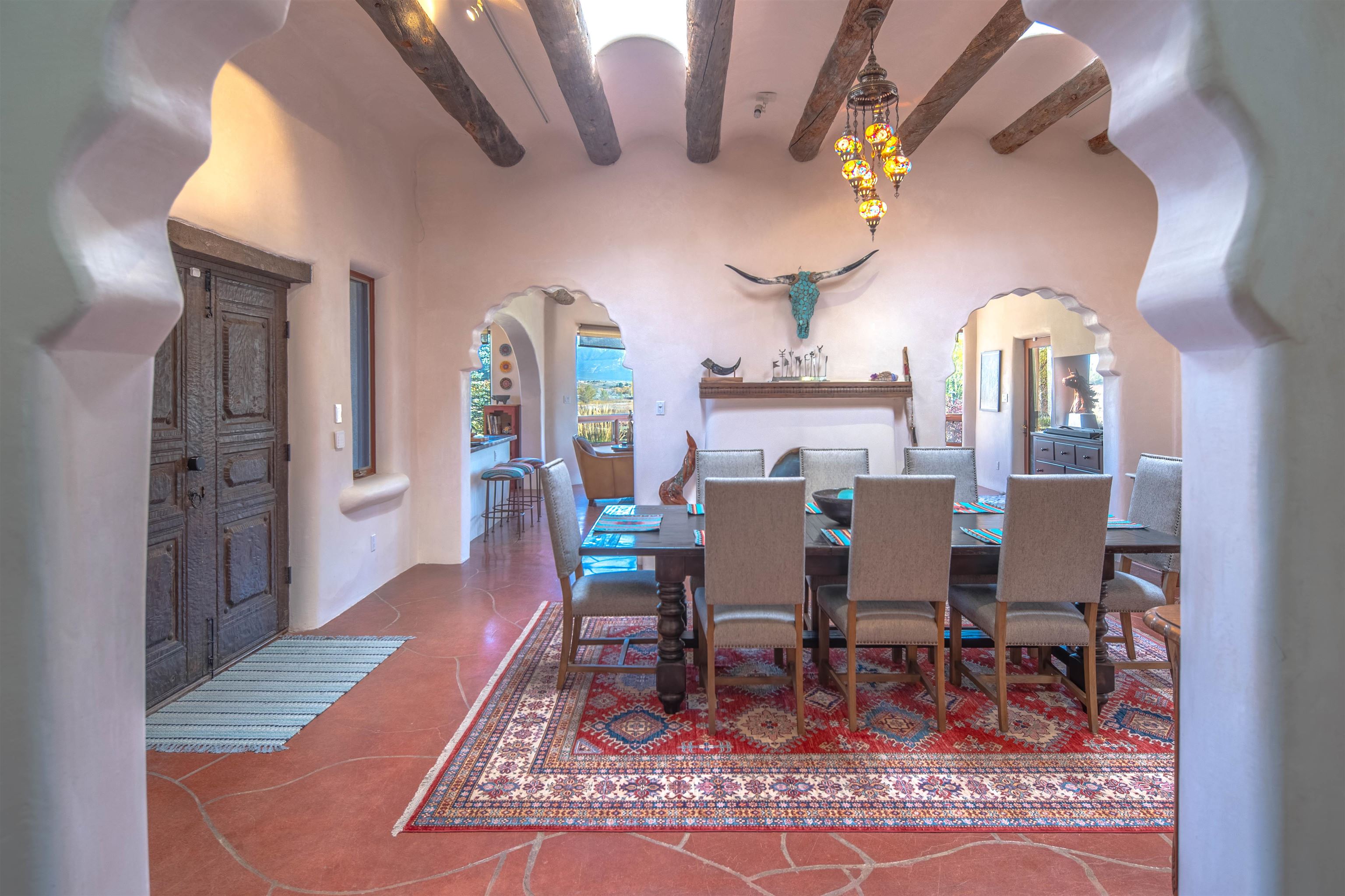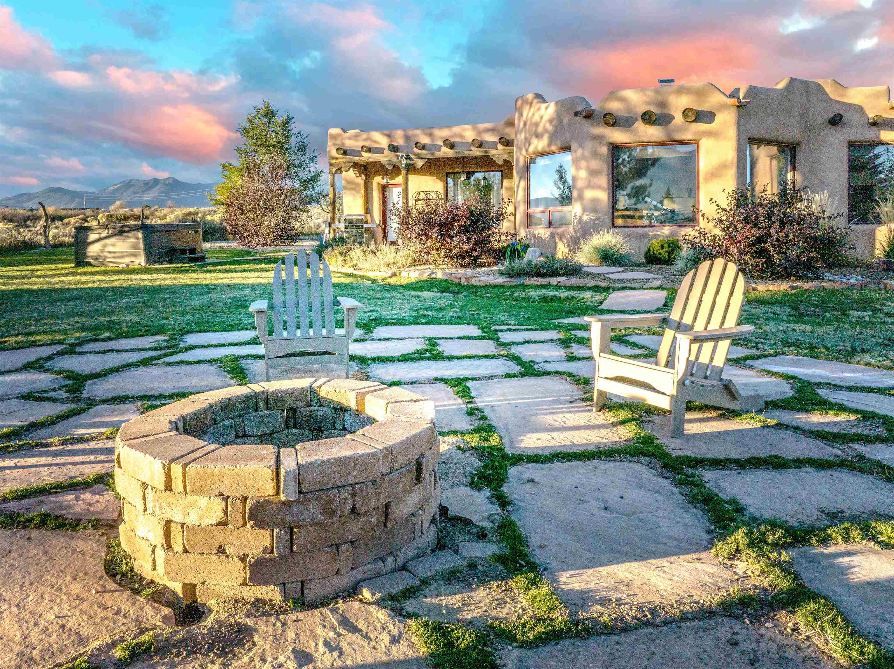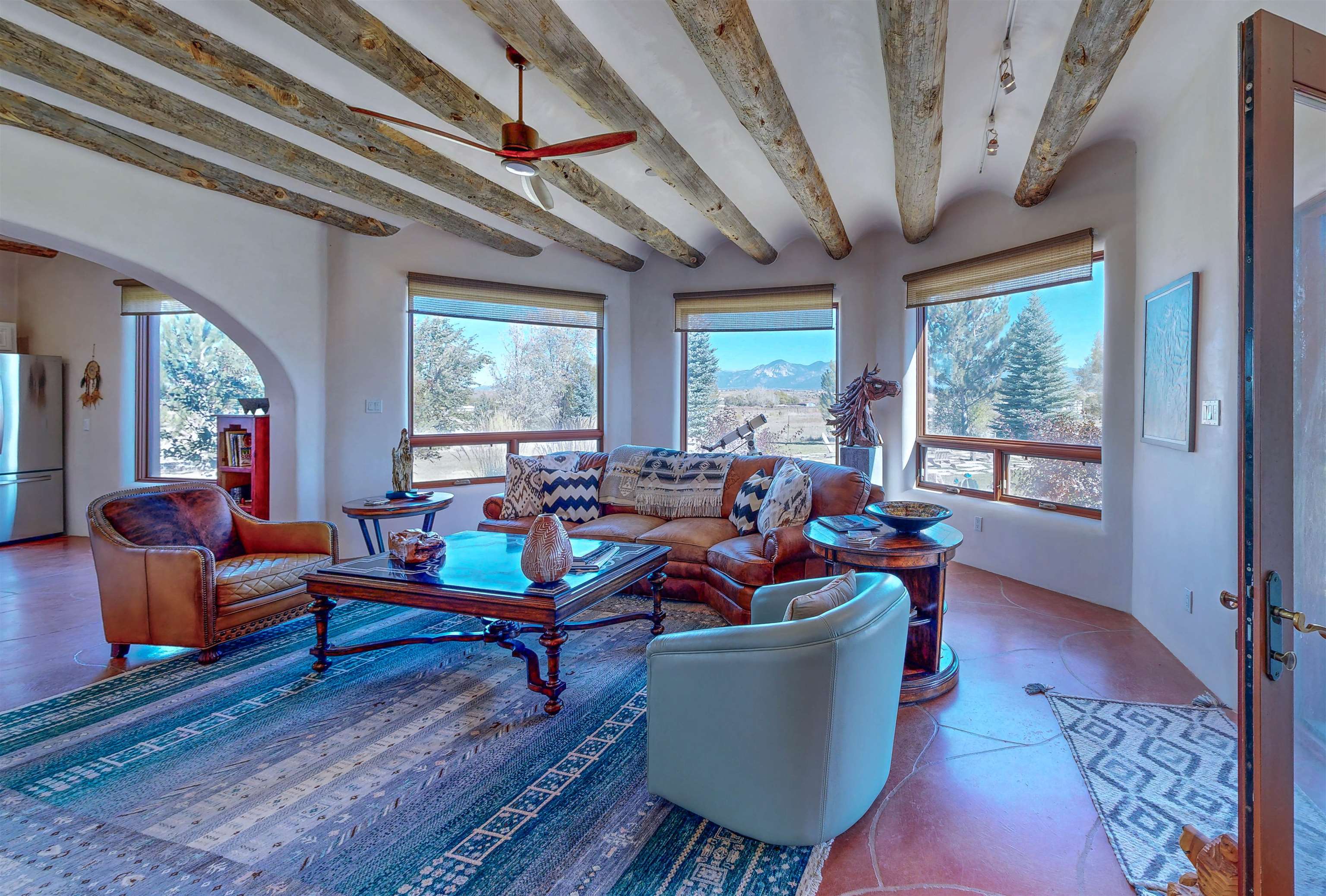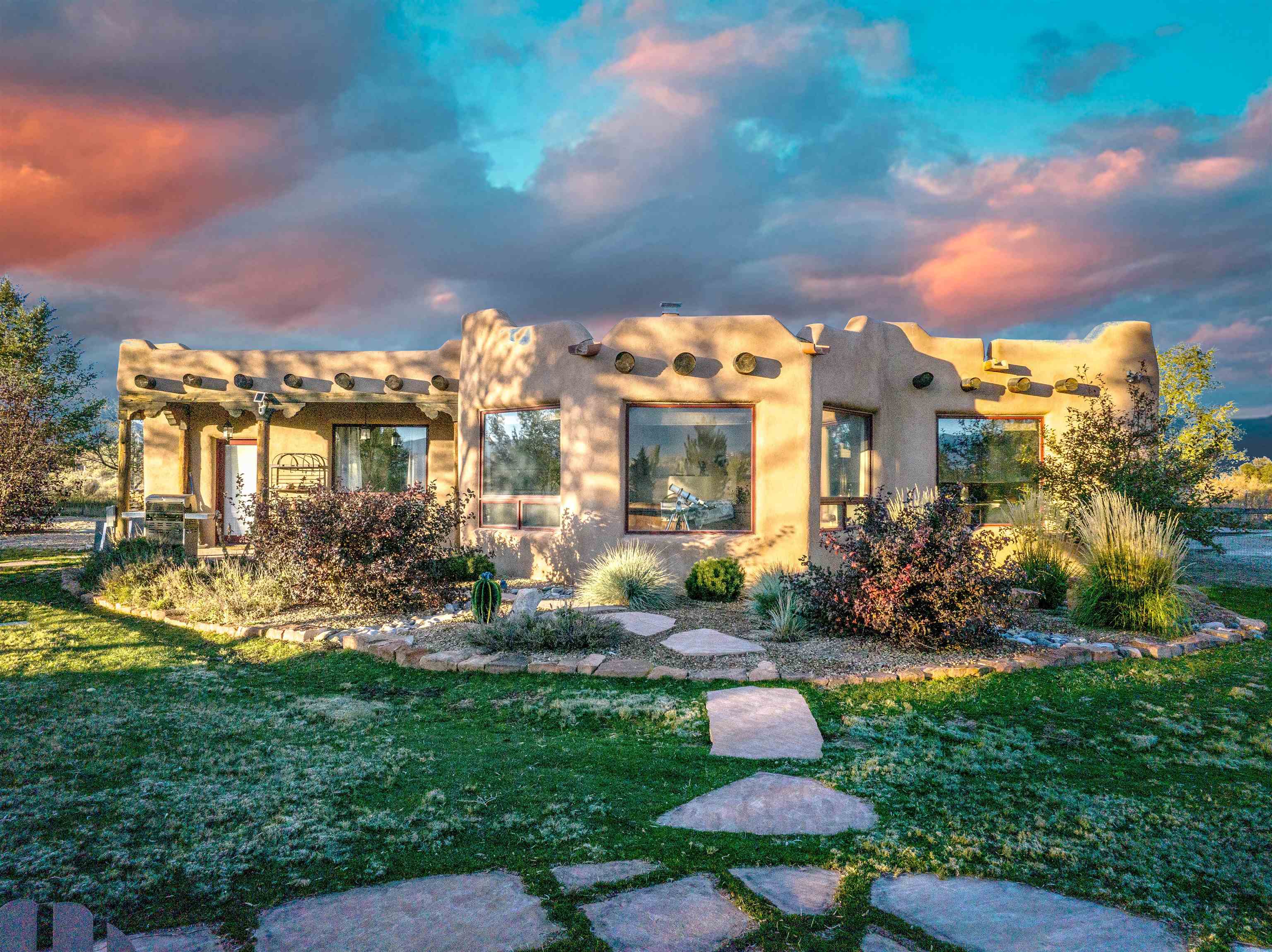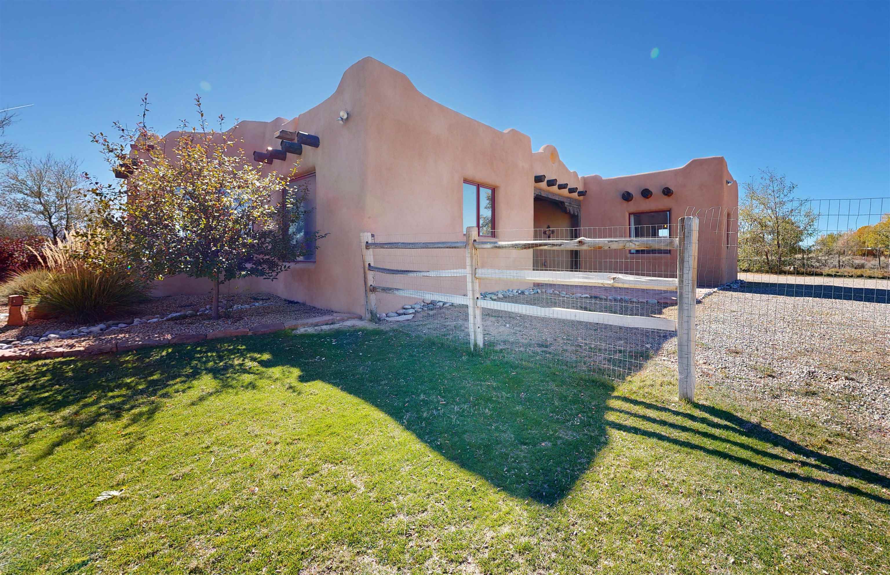 Welcome to Casa Vogue - timeless elegance and sophistication abound with this home designed by Nona Wesley, owner of Maya Designs Inc. of Taos, and built by Felipe Rodriguez, owner of 90 Degree Corners. This stunning three-bedroom, three-bathroom home with an additional office/study is being sold fully furnished with the absolute finest in elegance and comfort. You immediately enter through the hand carved double doors into an exquisite dining room with a stunning fireplace dividing the living room and dining room. There are very large picture windows with breathtaking views of Taos Mountain from the kitchen and living room areas, and admirable details in every room of the home. This home is perfect for entertaining with the open concept design, and with mountain views for starry nights, sunsets and ultimate privacy. This adobe constructed Pueblo-style home cannot be fabricated in today's environment, and the artistic details throughout each of the rooms are unmatched. If that is not enough, there are also water rights from the acequia running along the property. Only ten minutes to the Town of Taos, one still feels like you are miles away from the hustle and bustle. This is a true treasure, and it is definitely one not to miss. Check out the exterior drone video, and the interior and exterior video tours on the listing and then schedule your private showing today. You definitely will not regret it.