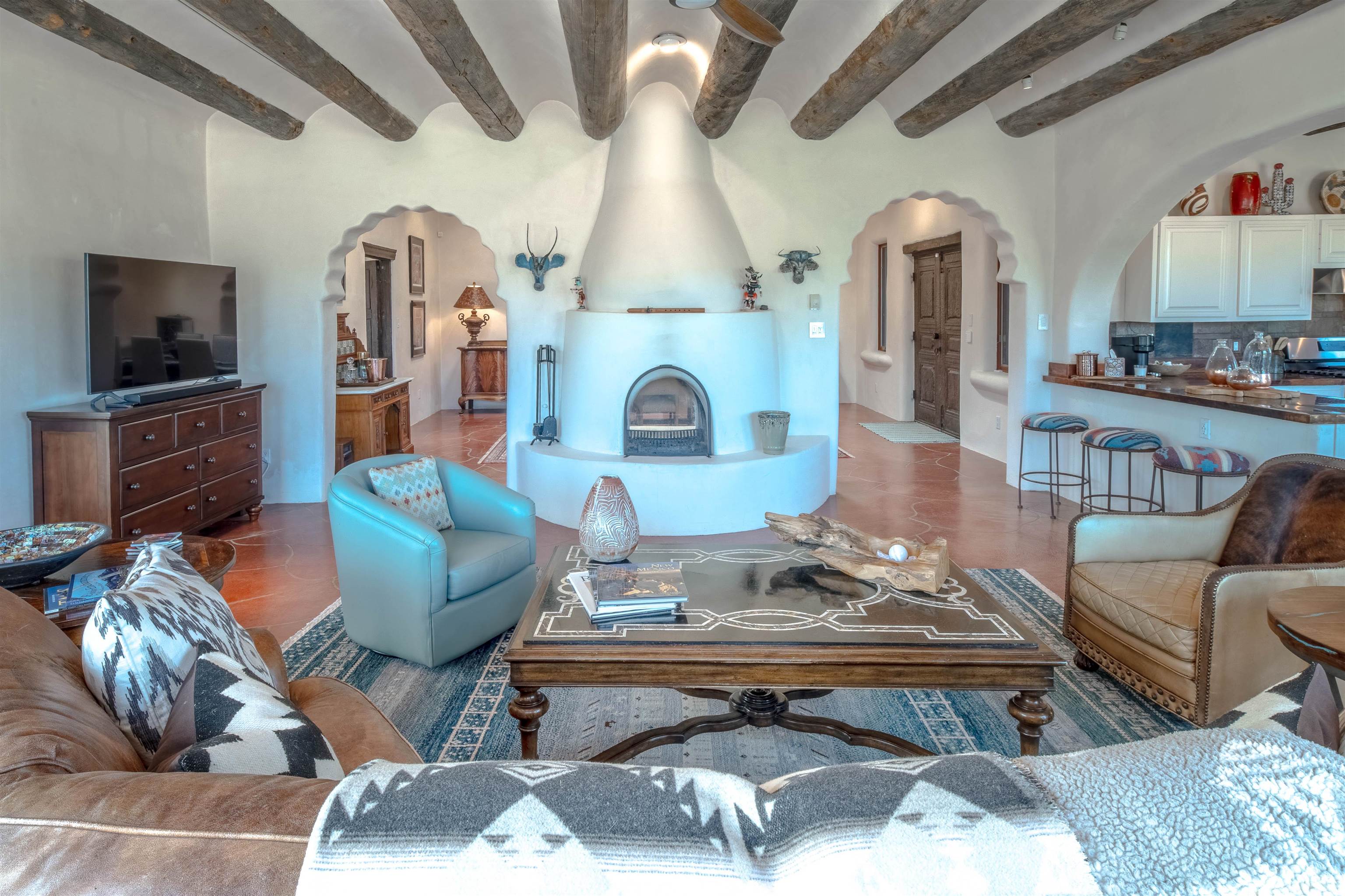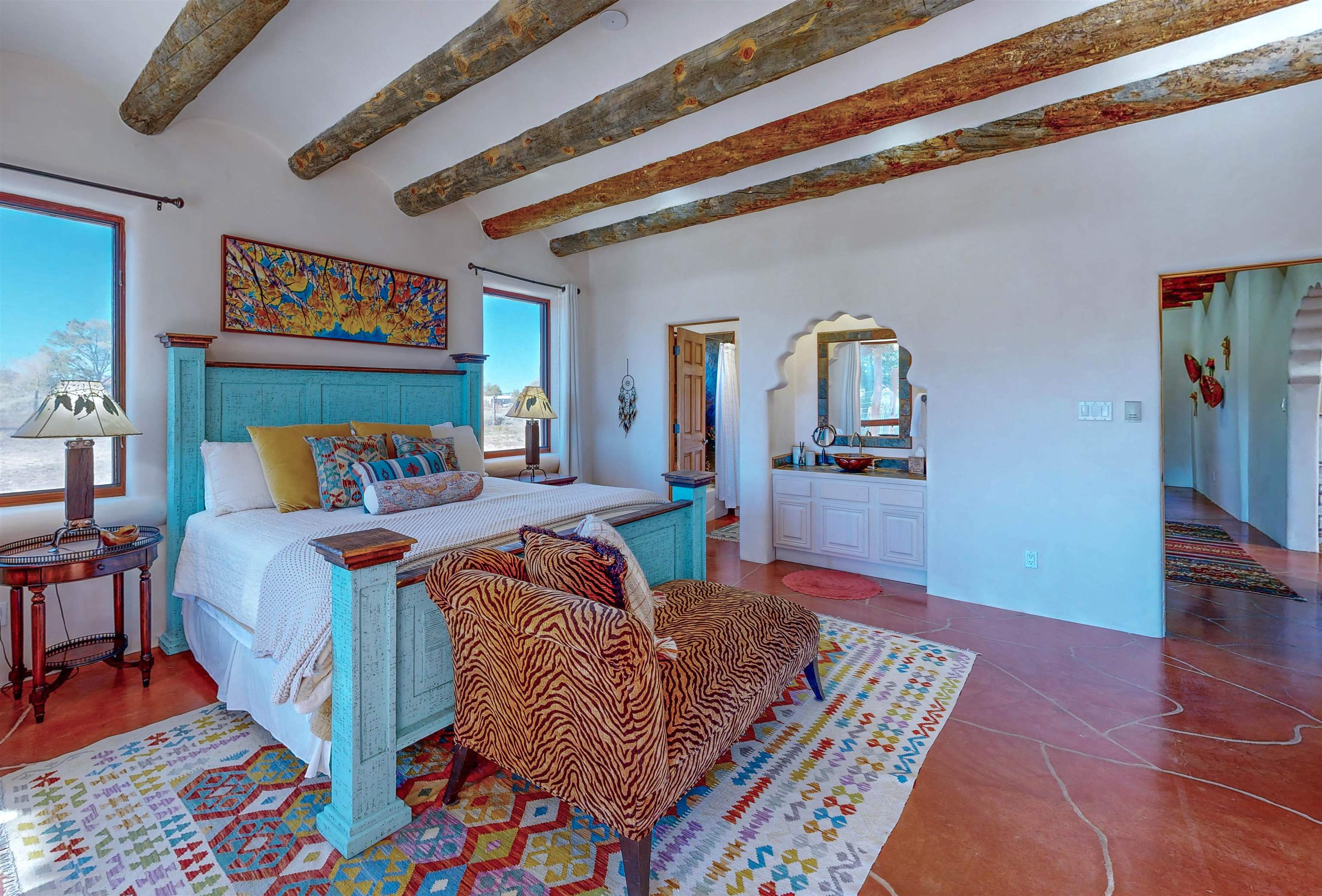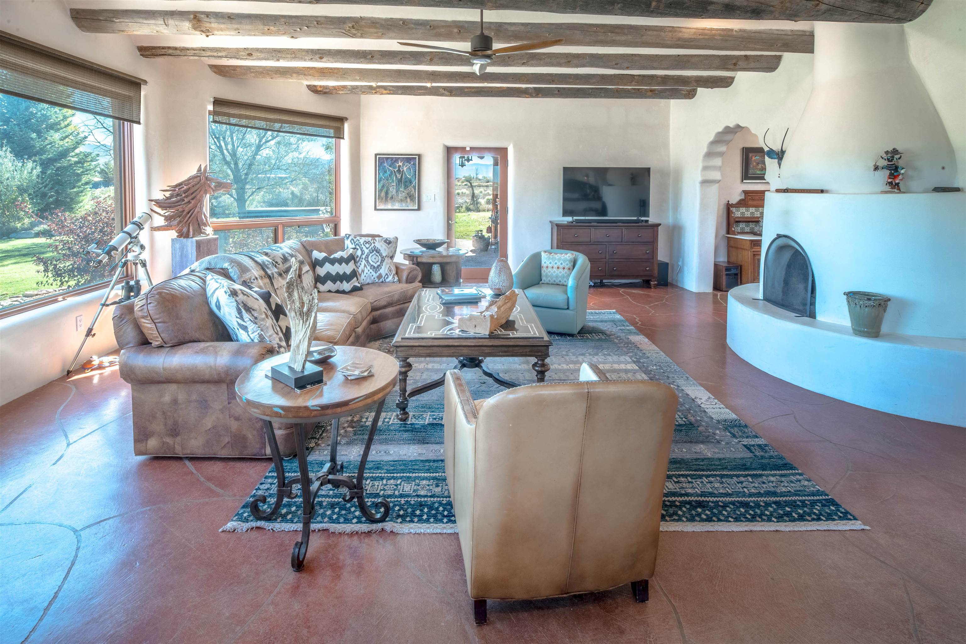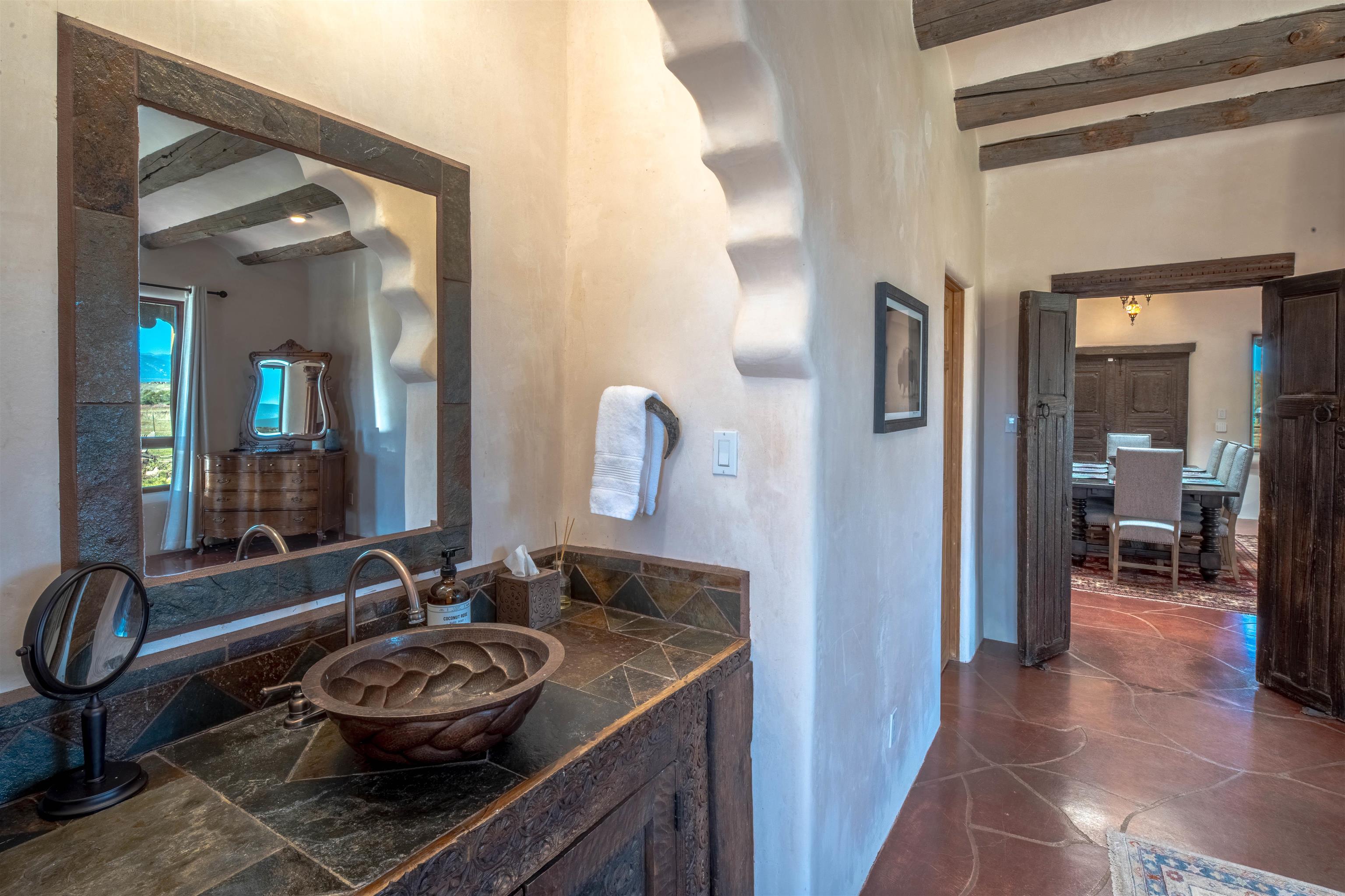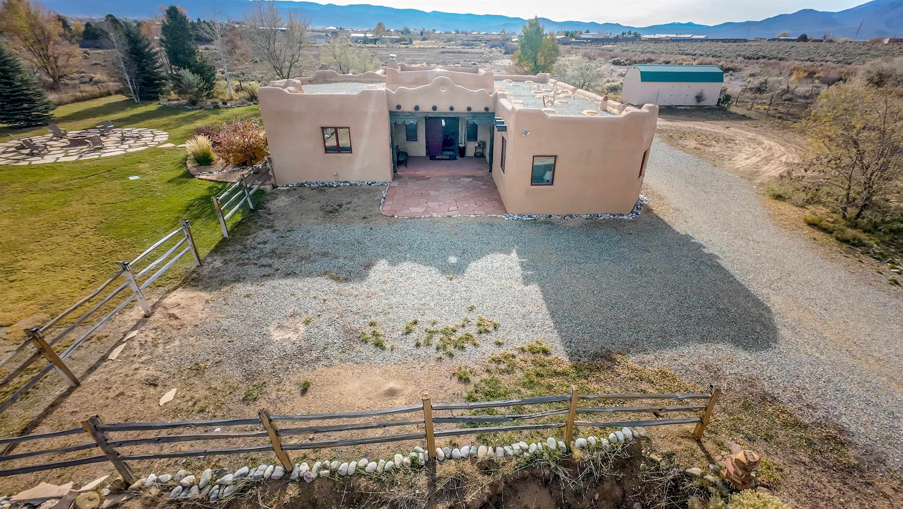 Welcome to Casa Vogue - timeless elegance and sophistication abound with this home designed by Nona Wesley, owner of Maya Designs Inc. of Taos, and built by Felipe Rodriguez, owner of 90 Degree Corners. This stunning three-bedroom, three-bathroom home with an additional office/study is being sold fully furnished with the absolute finest in elegance and comfort. You immediately enter through the hand carved double doors into an exquisite dining room with a stunning fireplace dividing the living room and dining room. There are very large picture windows with breathtaking views of Taos Mountain from the kitchen and living room areas, and admirable details in every room of the home. This home is perfect for entertaining with the open concept design, and with mountain views for starry nights, sunsets and ultimate privacy. This adobe constructed Pueblo-style home cannot be fabricated in today's environment, and the artistic details throughout each of the rooms are unmatched. If that is not enough, there are also water rights from the acequia running along the property. Only ten minutes to the Town of Taos, one still feels like you are miles away from the hustle and bustle. This is a true treasure, and it is definitely one not to miss. Check out the exterior drone video, and the interior and exterior video tours on the listing and then schedule your private showing today. You definitely will not regret it.