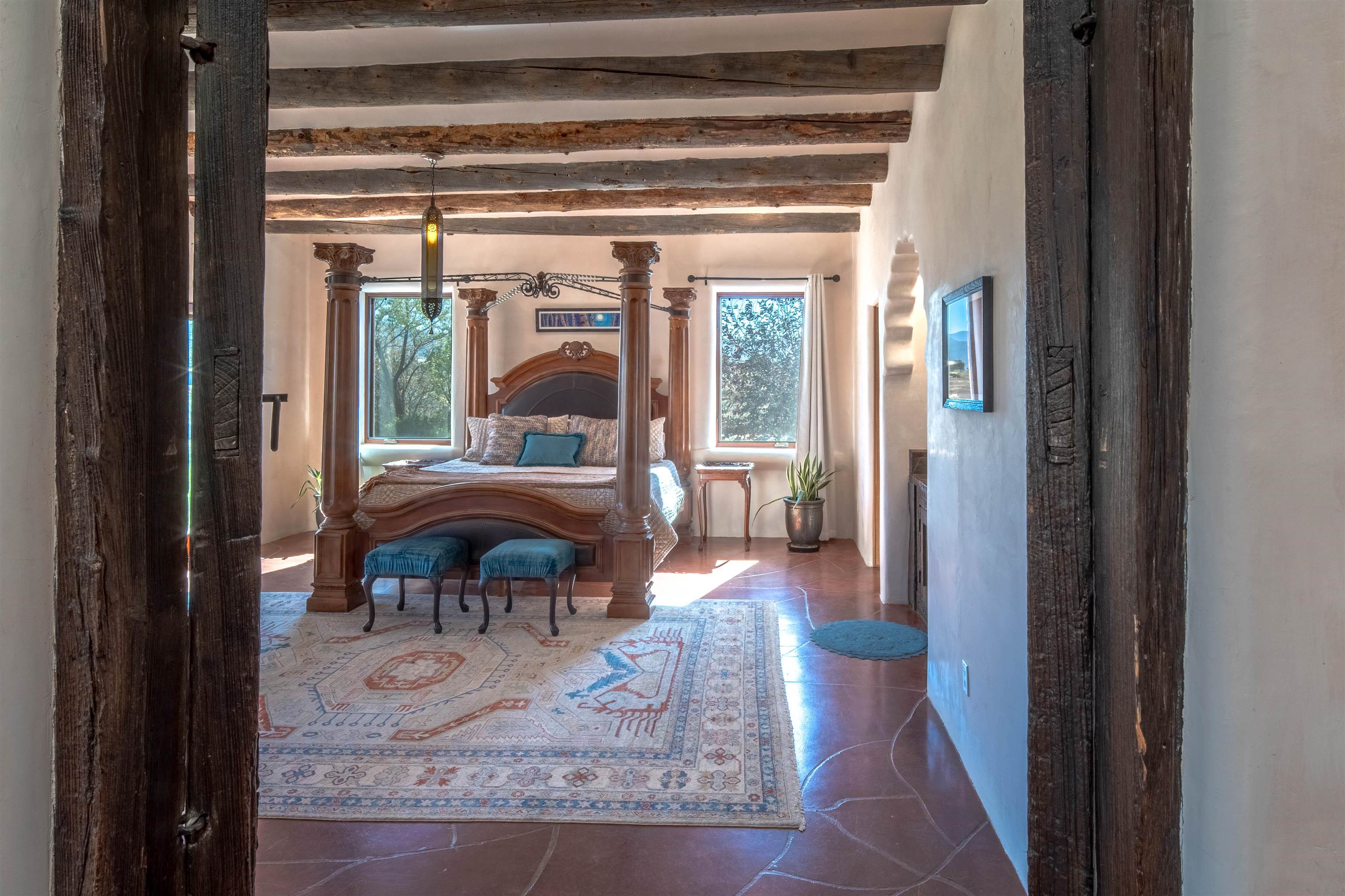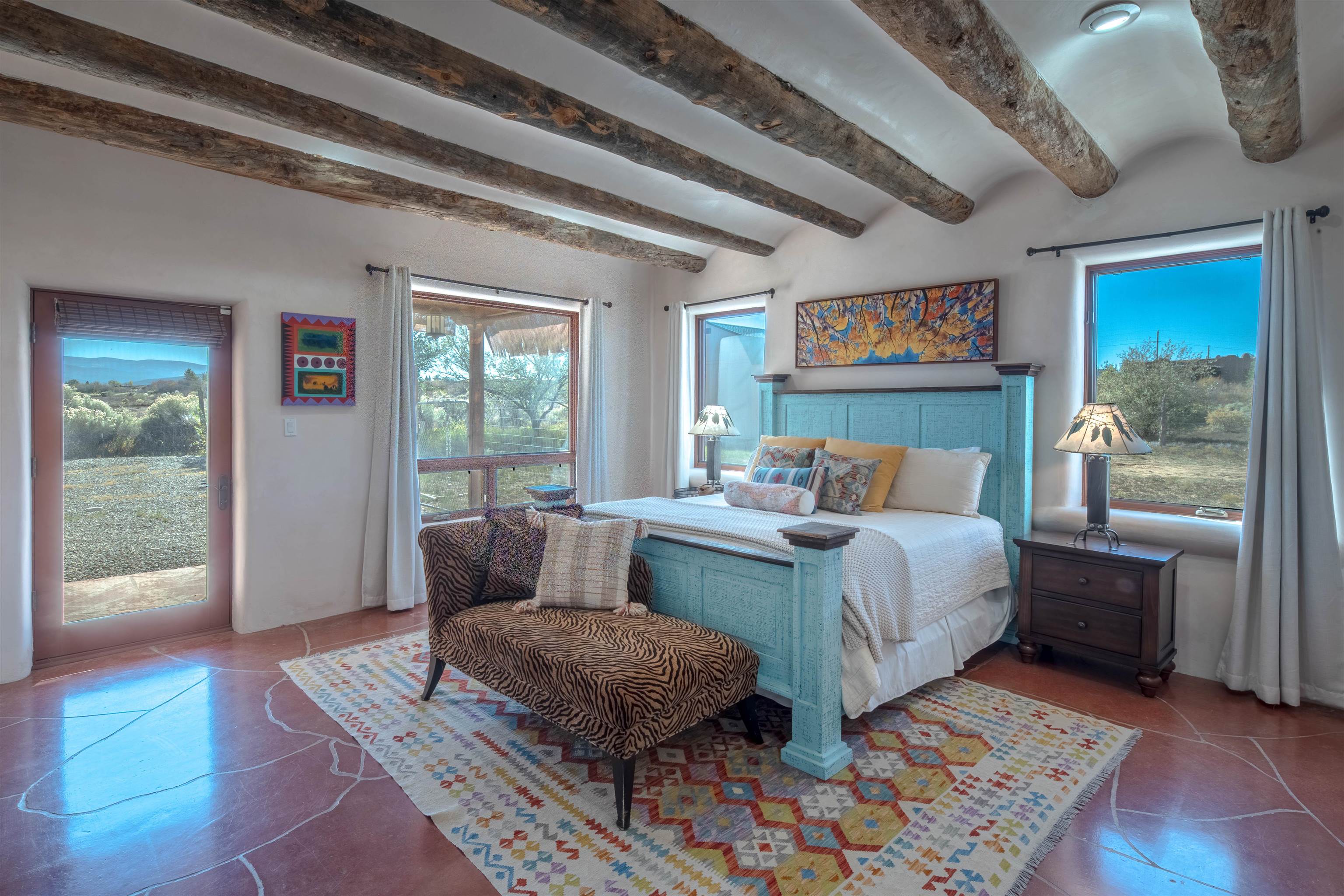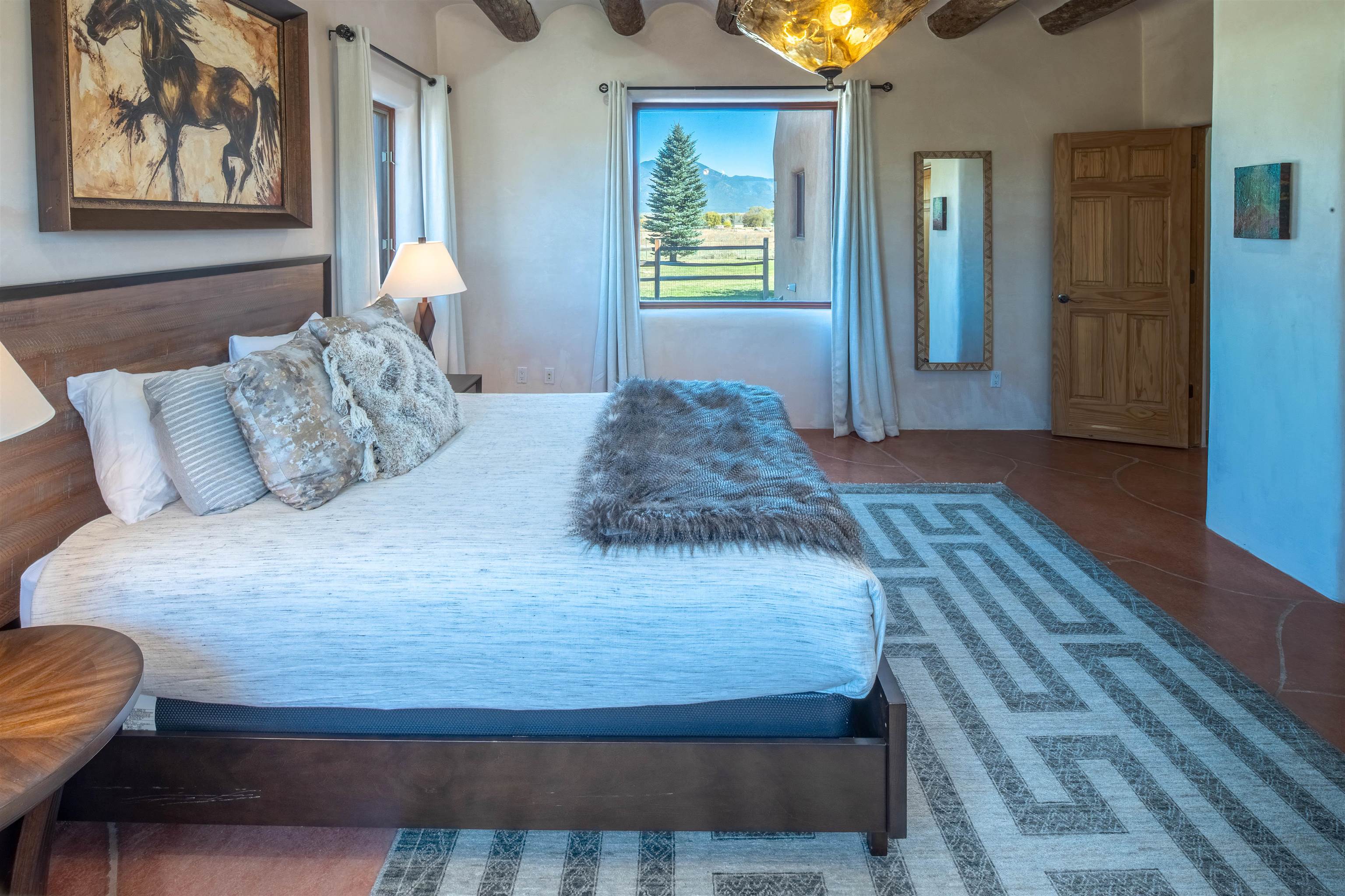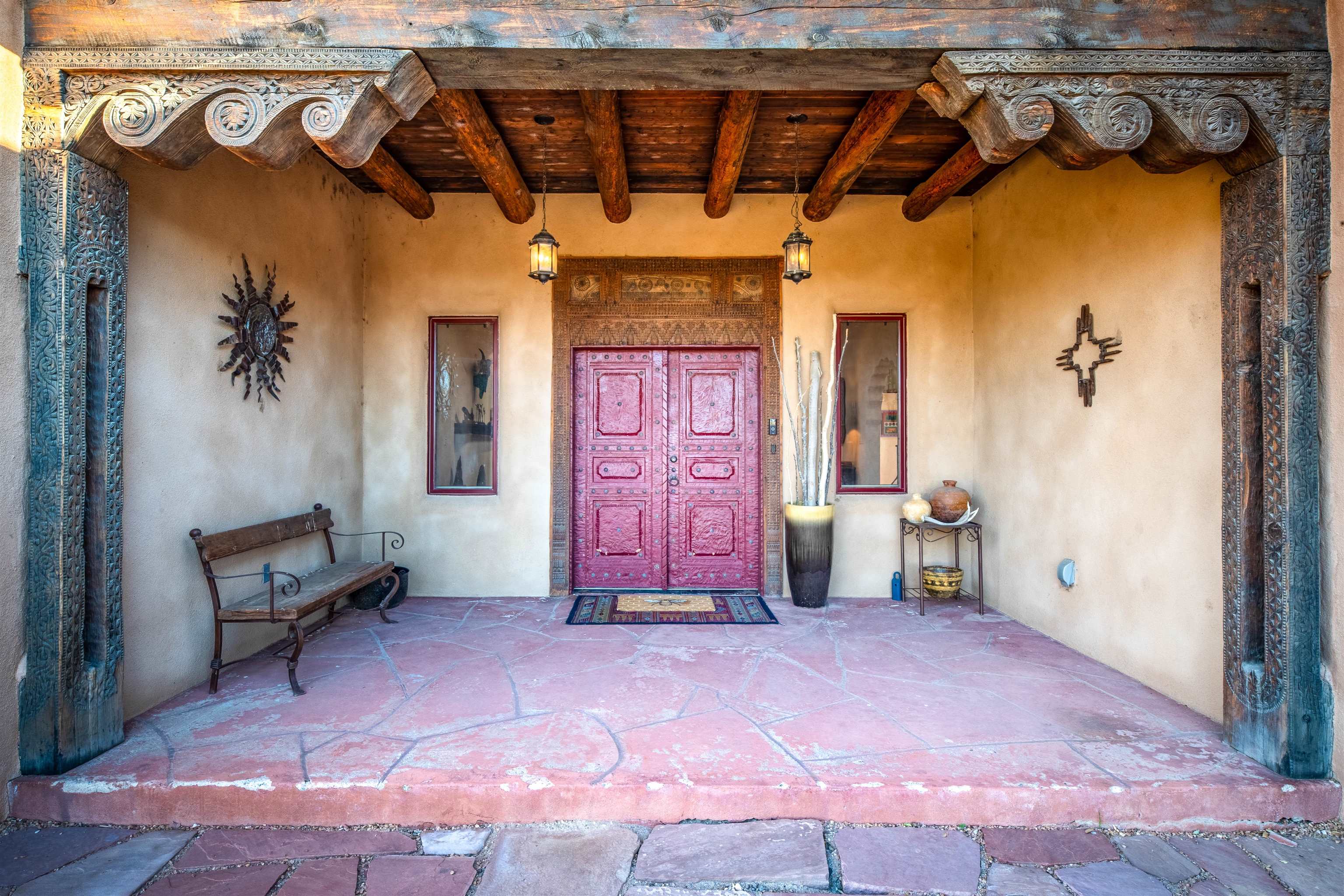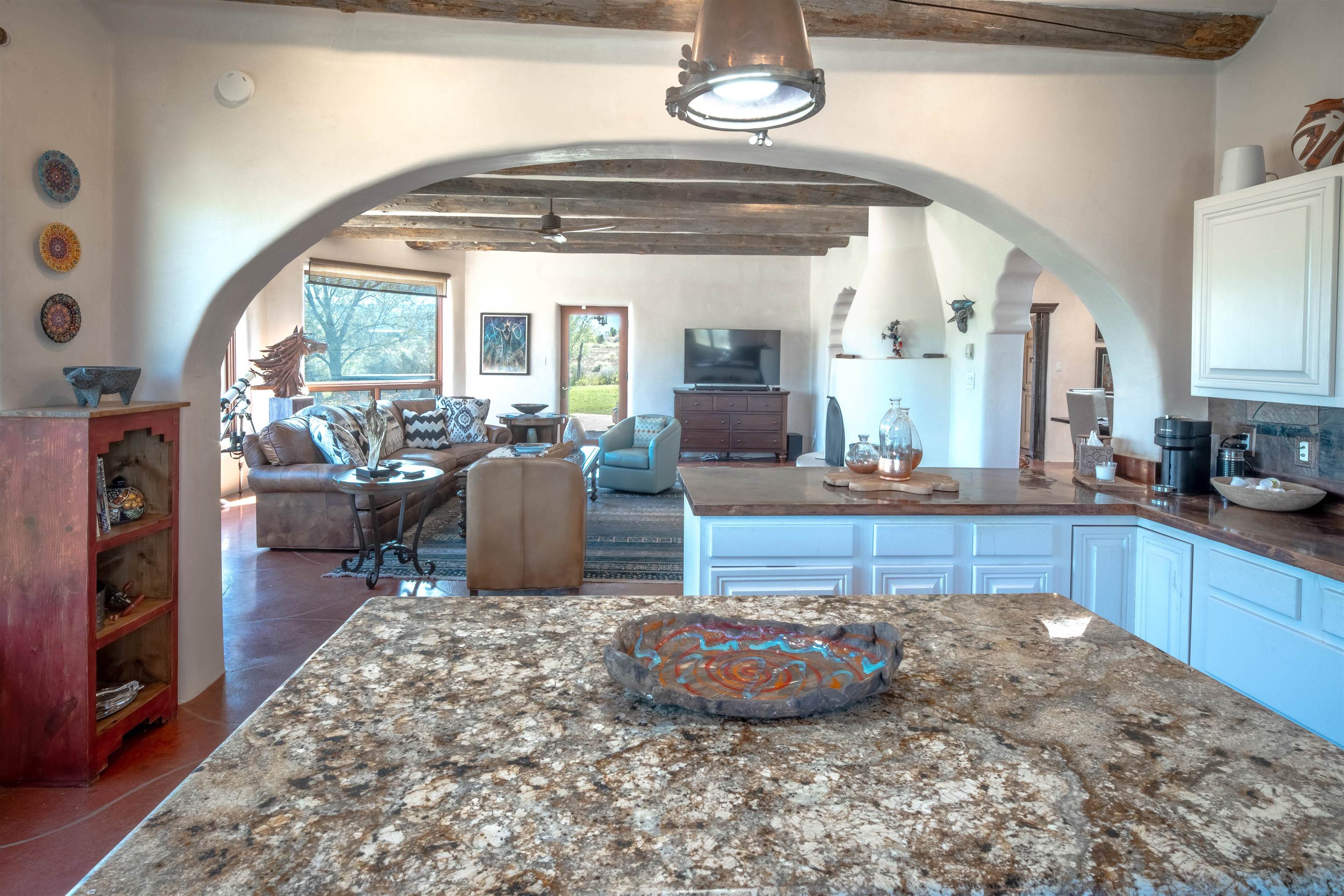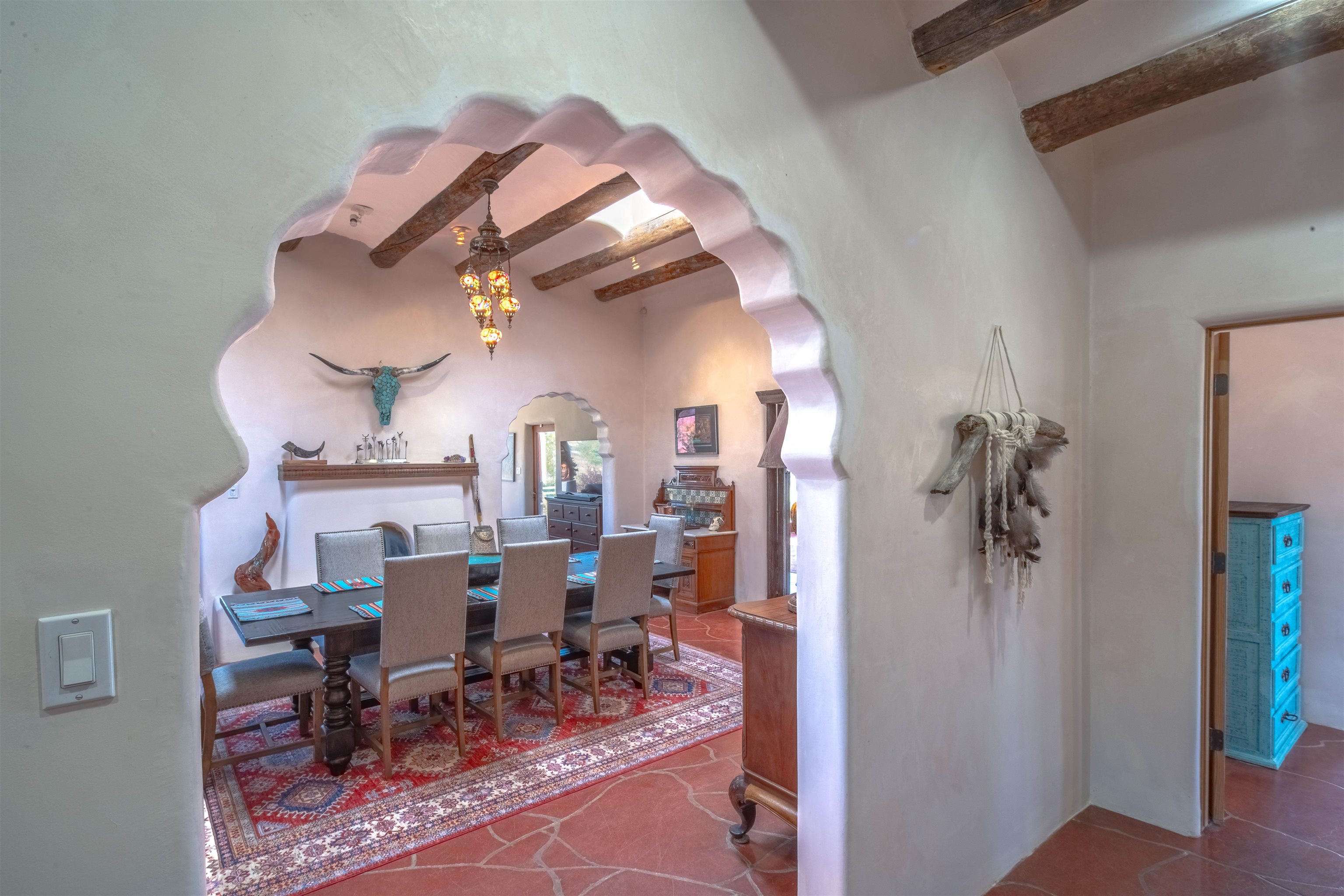Welcome to Casa Vogue - timeless elegance and sophistication abound with this home designed by Nona Wesley, owner of Maya Designs Inc. of Taos, and built by Felipe Rodriguez, owner of 90 Degree Corners. This stunning three-bedroom, three-bathroom home with an additional office/study is being sold fully furnished with the absolute finest in elegance and comfort. You immediately enter through the hand carved double doors into an exquisite dining room with a stunning fireplace dividing the living room and dining room. There are very large picture windows with breathtaking views of Taos Mountain from the kitchen and living room areas, and admirable details in every room of the home. This home is perfect for entertaining with the open concept design, and with mountain views for starry nights, sunsets and ultimate privacy. This adobe constructed Pueblo-style home cannot be fabricated in today's environment, and the artistic details throughout each of the rooms are unmatched. If that is not enough, there are also water rights from the acequia running along the property. Only ten minutes to the Town of Taos, one still feels like you are miles away from the hustle and bustle. This is a true treasure, and it is definitely one not to miss. Check out the exterior drone video, and the interior and exterior video tours on the listing and then schedule your private showing today. You definitely will not regret it.