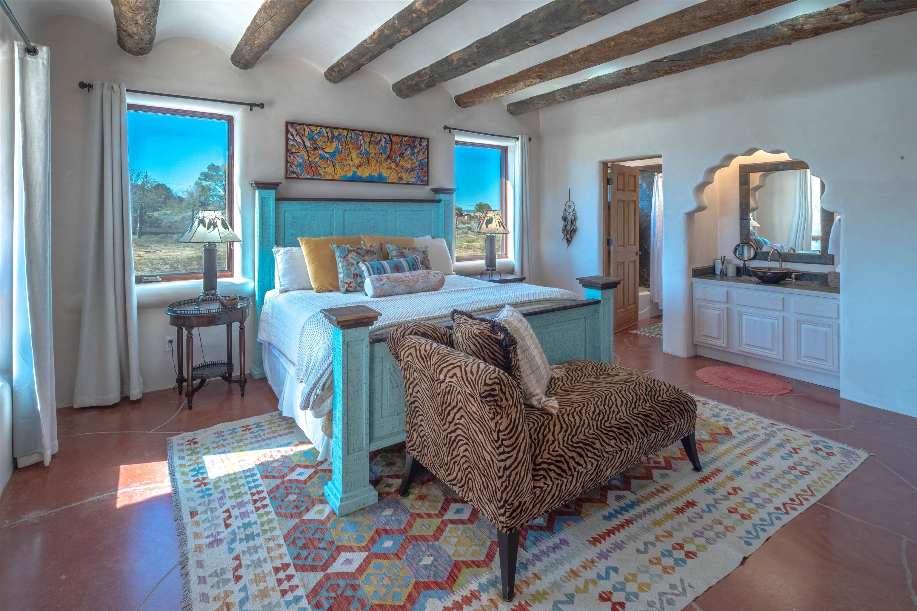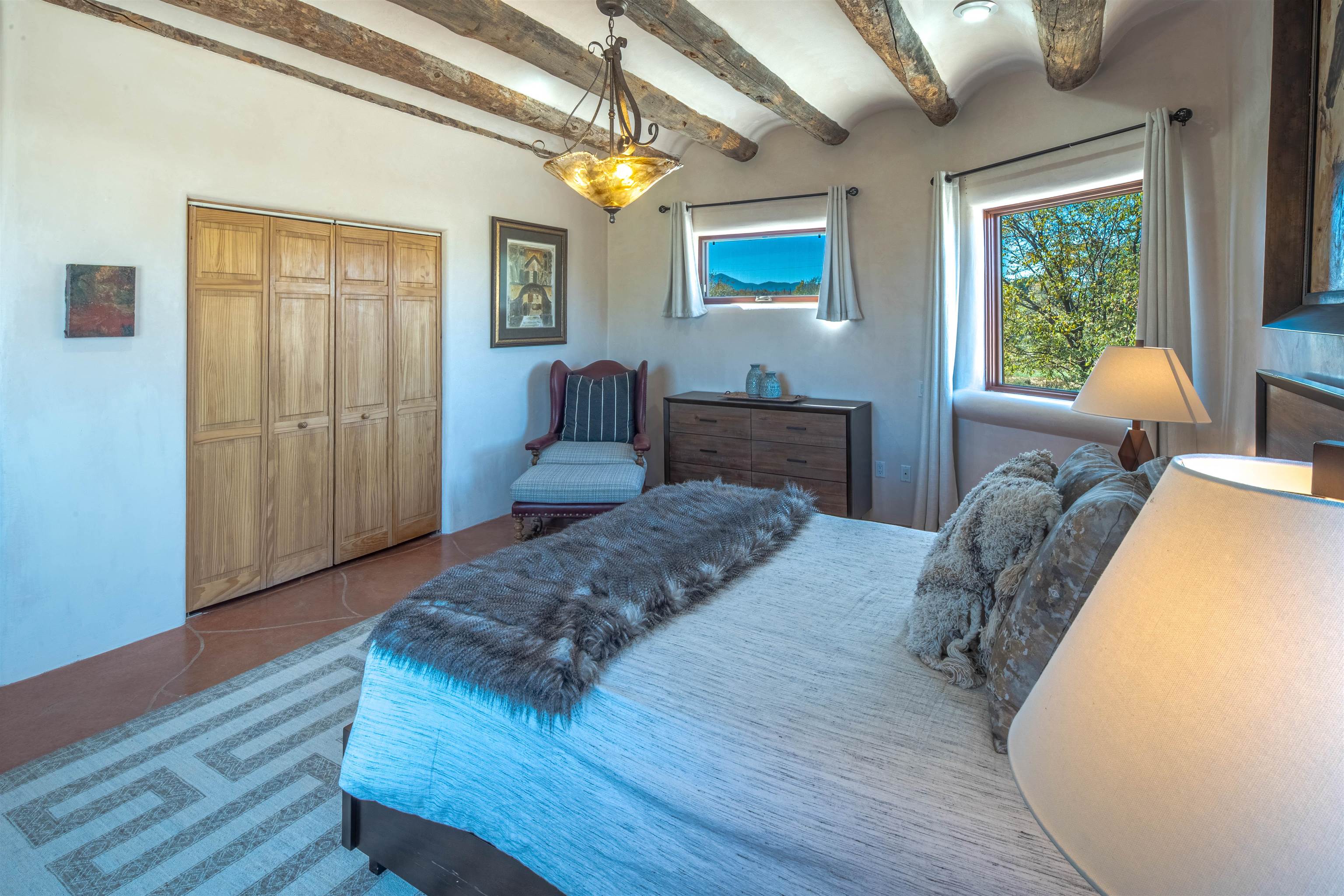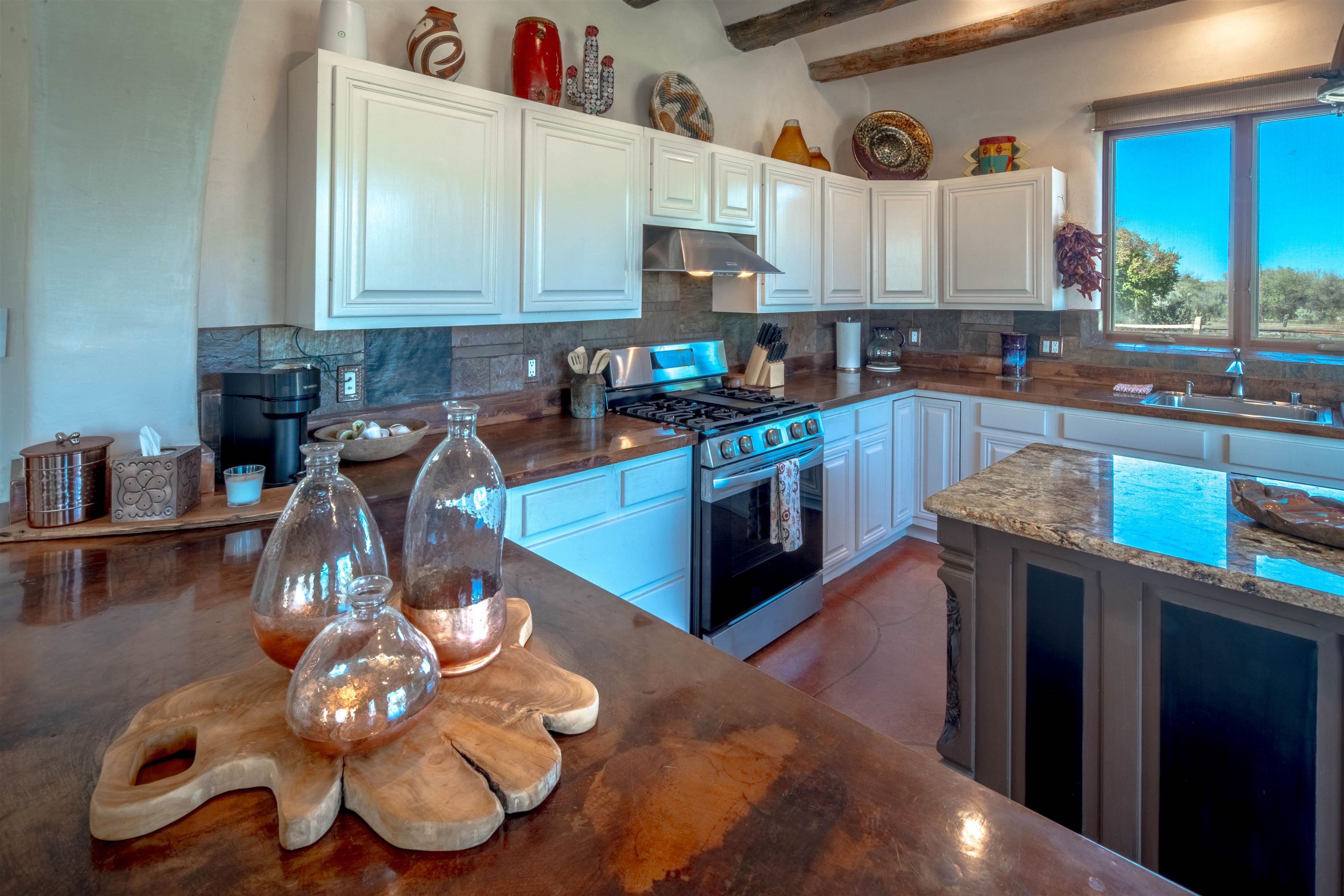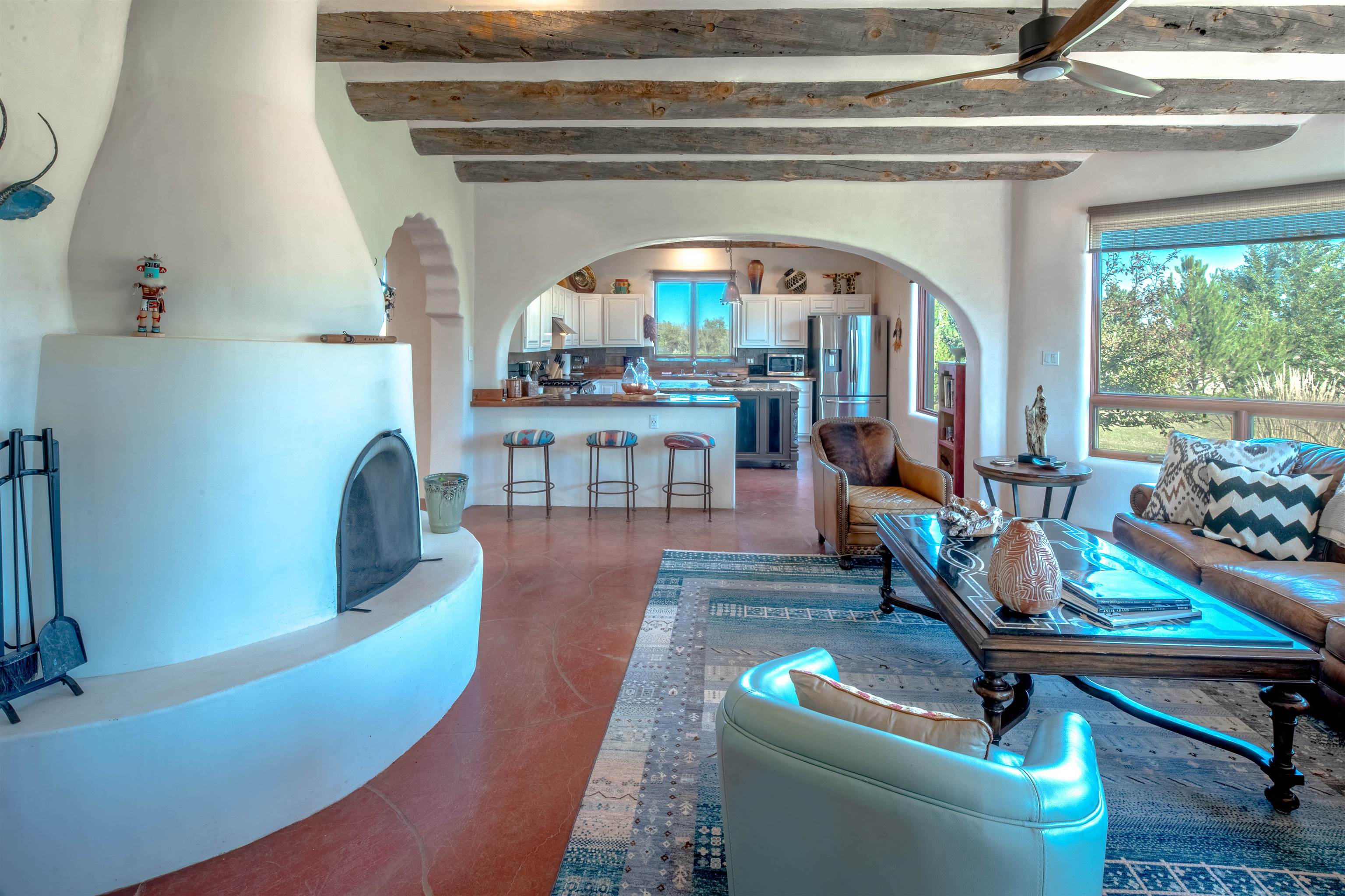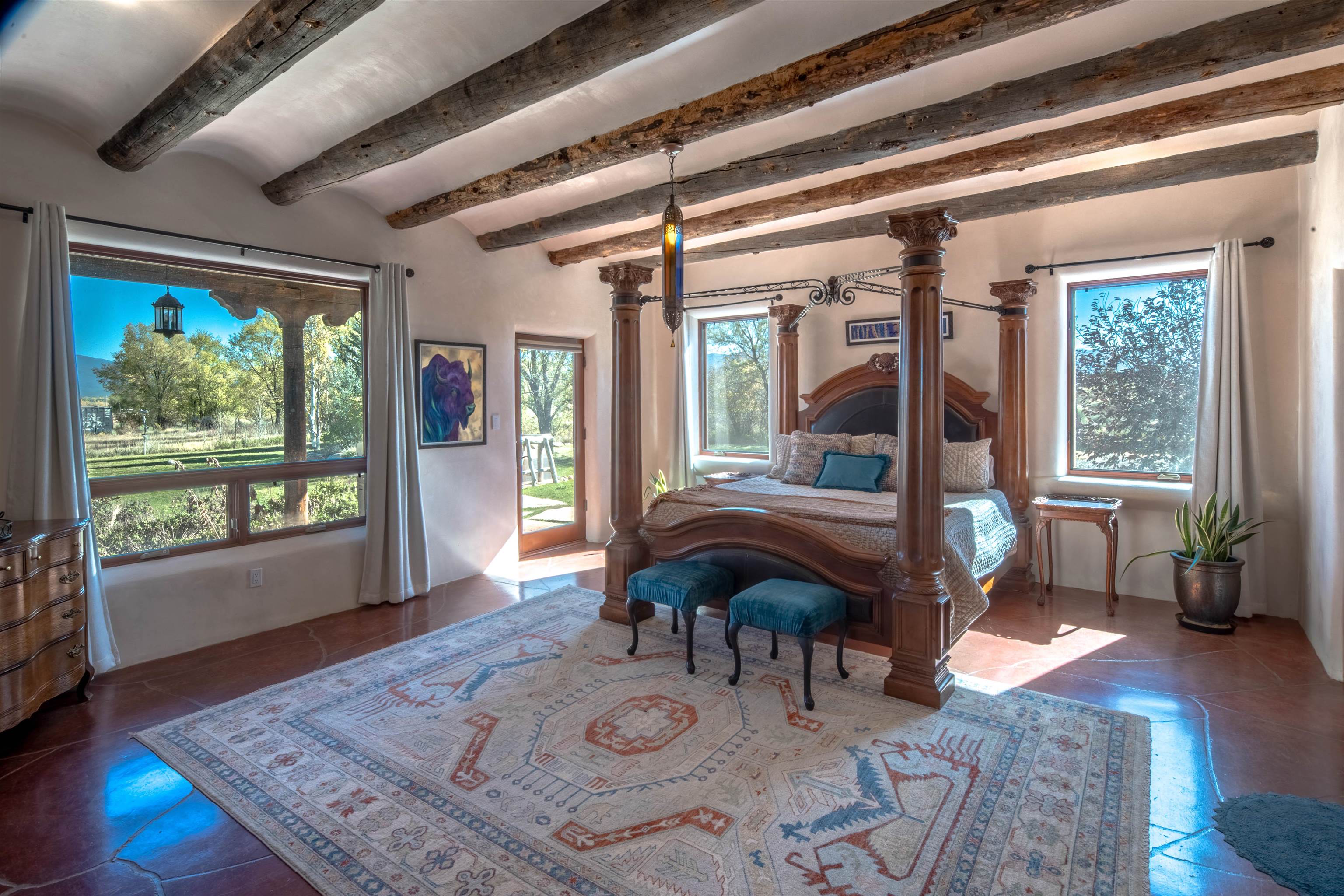 Welcome to Casa Vogue - timeless elegance and sophistication abound with this home designed by Nona Wesley, owner of Maya Designs Inc. of Taos, and built by Felipe Rodriguez, owner of 90 Degree Corners. This stunning three-bedroom, three-bathroom home with an additional office/study is being sold fully furnished with the absolute finest in elegance and comfort. You immediately enter through the hand carved double doors into an exquisite dining room with a stunning fireplace dividing the living room and dining room. There are very large picture windows with breathtaking views of Taos Mountain from the kitchen and living room areas, and admirable details in every room of the home. This home is perfect for entertaining with the open concept design, and with mountain views for starry nights, sunsets and ultimate privacy. This adobe constructed Pueblo-style home cannot be fabricated in today's environment, and the artistic details throughout each of the rooms are unmatched. If that is not enough, there are also water rights from the acequia running along the property. Only ten minutes to the Town of Taos, one still feels like you are miles away from the hustle and bustle. This is a true treasure, and it is definitely one not to miss. Check out the exterior drone video, and the interior and exterior video tours on the listing and then schedule your private showing today. You definitely will not regret it.
