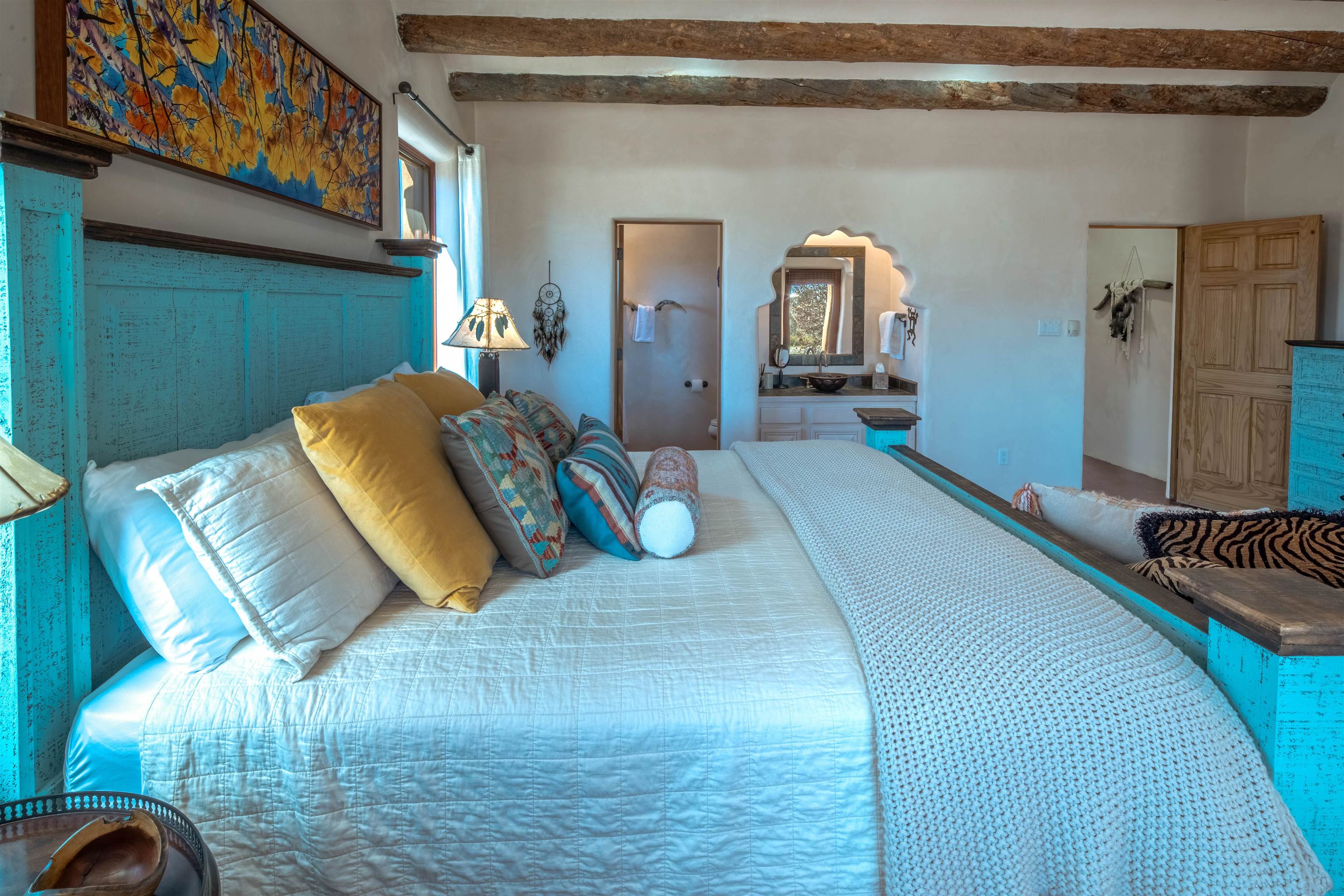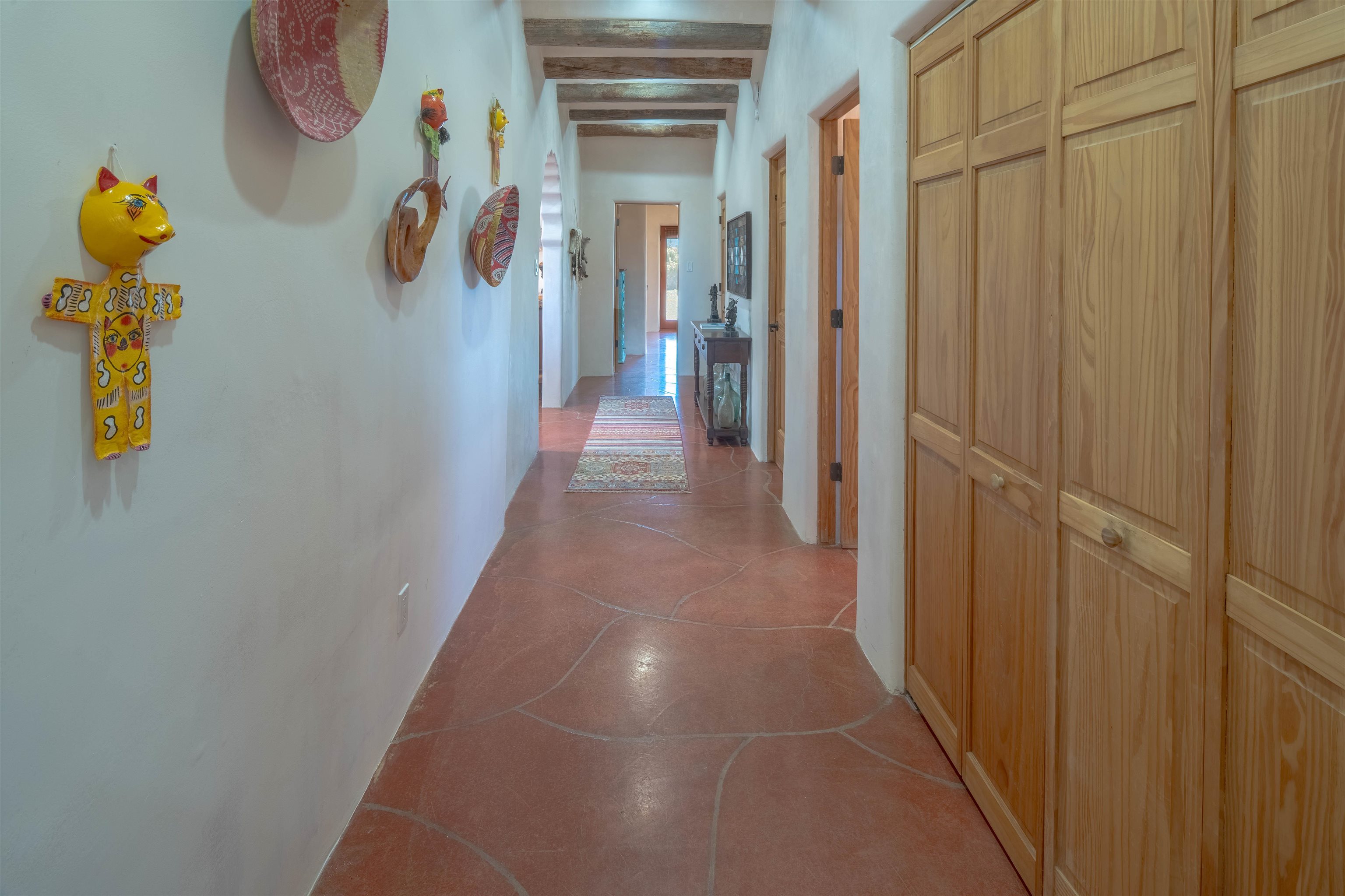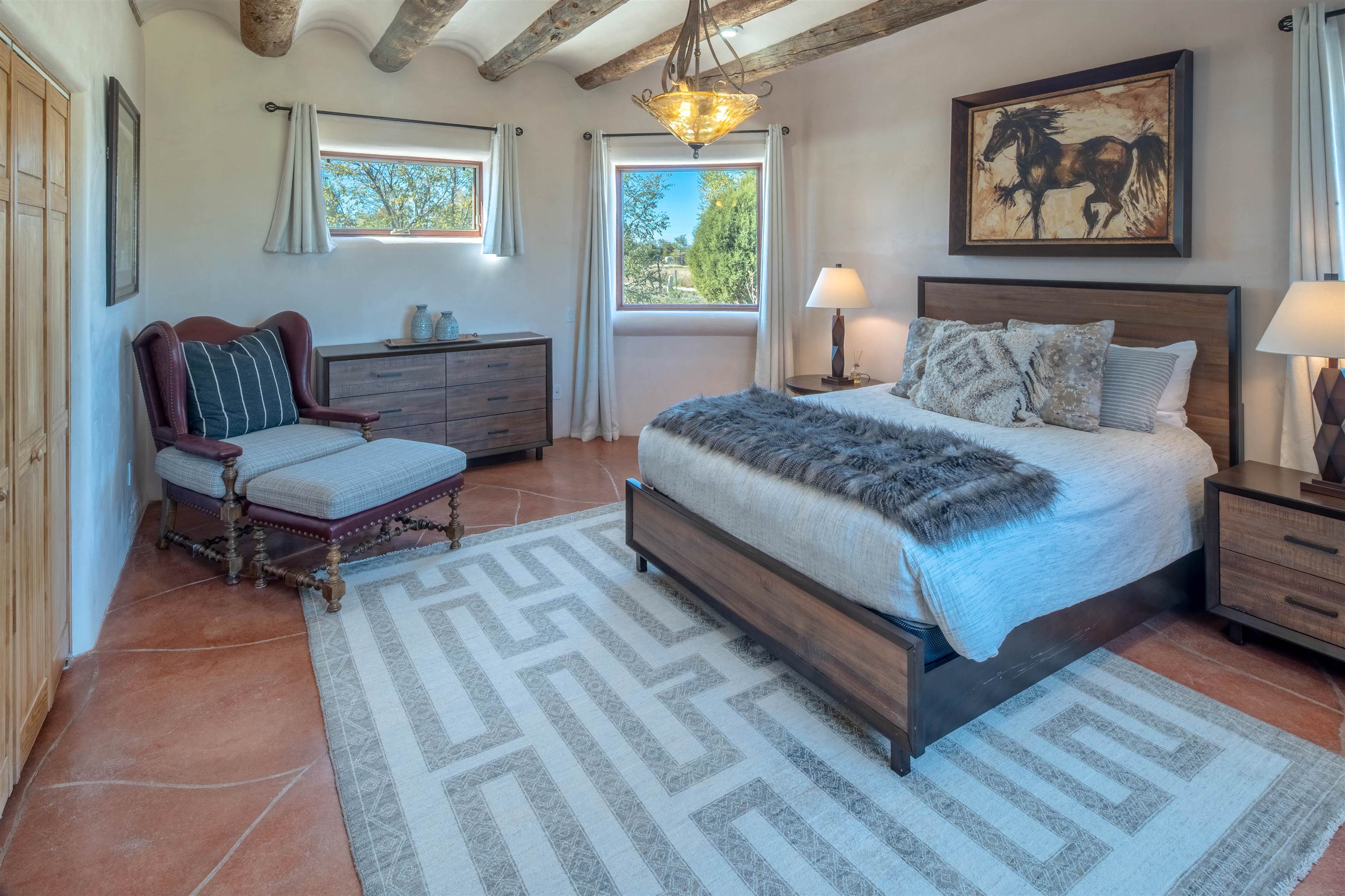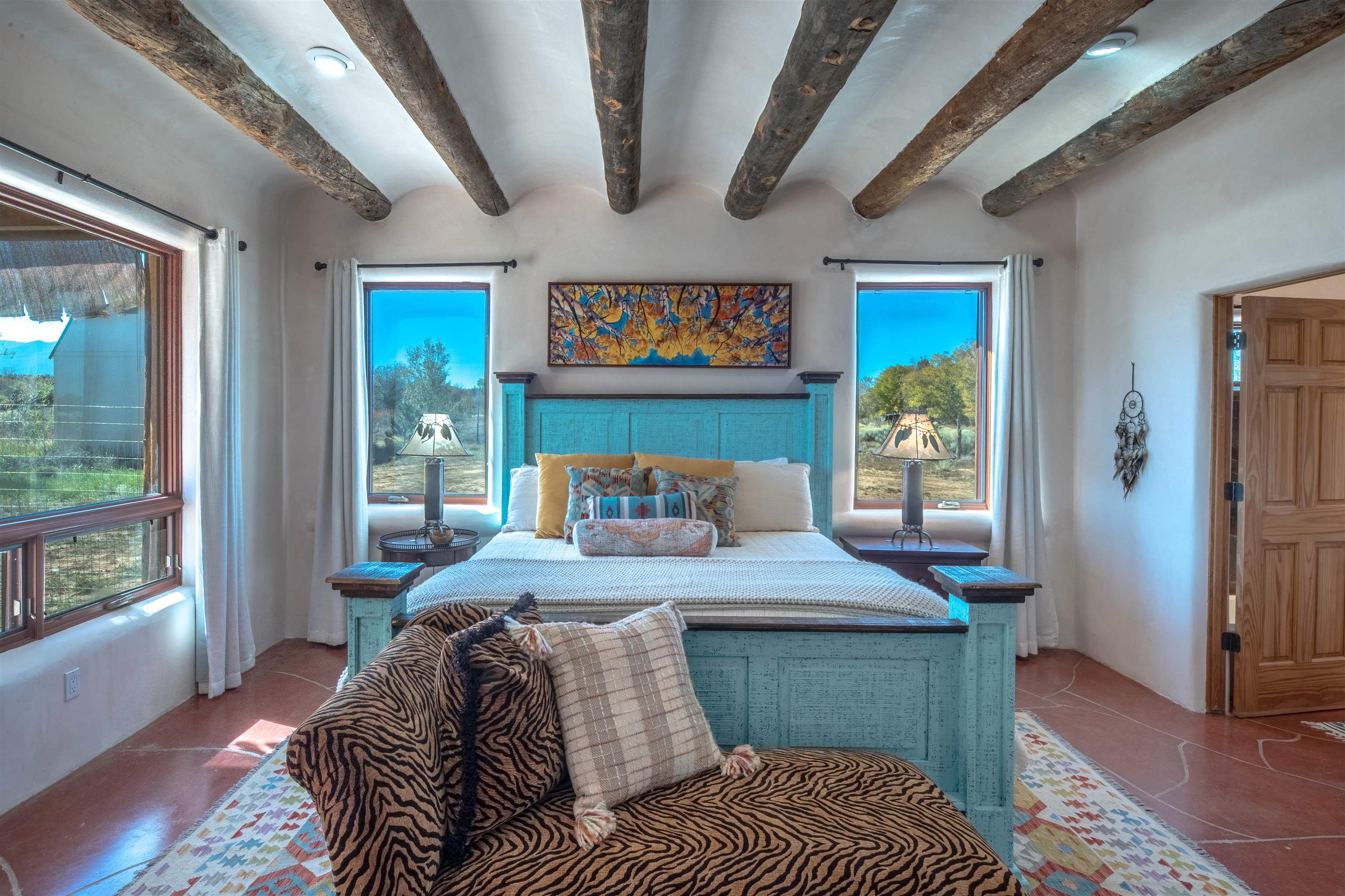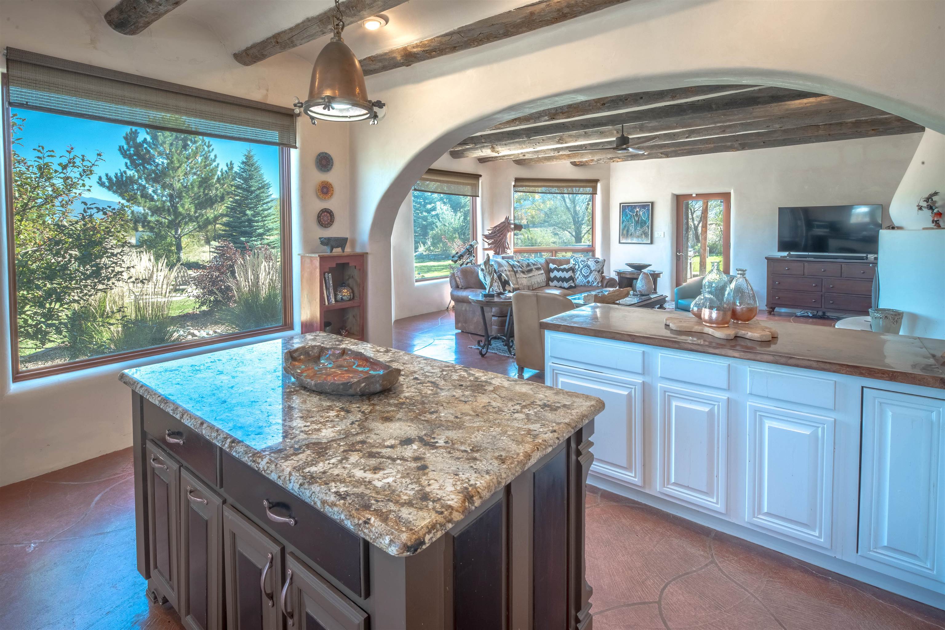 Welcome to Casa Vogue - timeless elegance and sophistication abound with this home designed by Nona Wesley, owner of Maya Designs Inc. of Taos, and built by Felipe Rodriguez, owner of 90 Degree Corners. This stunning three-bedroom, three-bathroom home with an additional office/study is being sold fully furnished with the absolute finest in elegance and comfort. You immediately enter through the hand carved double doors into an exquisite dining room with a stunning fireplace dividing the living room and dining room. There are very large picture windows with breathtaking views of Taos Mountain from the kitchen and living room areas, and admirable details in every room of the home. This home is perfect for entertaining with the open concept design, and with mountain views for starry nights, sunsets and ultimate privacy. This adobe constructed Pueblo-style home cannot be fabricated in today's environment, and the artistic details throughout each of the rooms are unmatched. If that is not enough, there are also water rights from the acequia running along the property. Only ten minutes to the Town of Taos, one still feels like you are miles away from the hustle and bustle. This is a true treasure, and it is definitely one not to miss. Check out the exterior drone video, and the interior and exterior video tours on the listing and then schedule your private showing today. You definitely will not regret it.