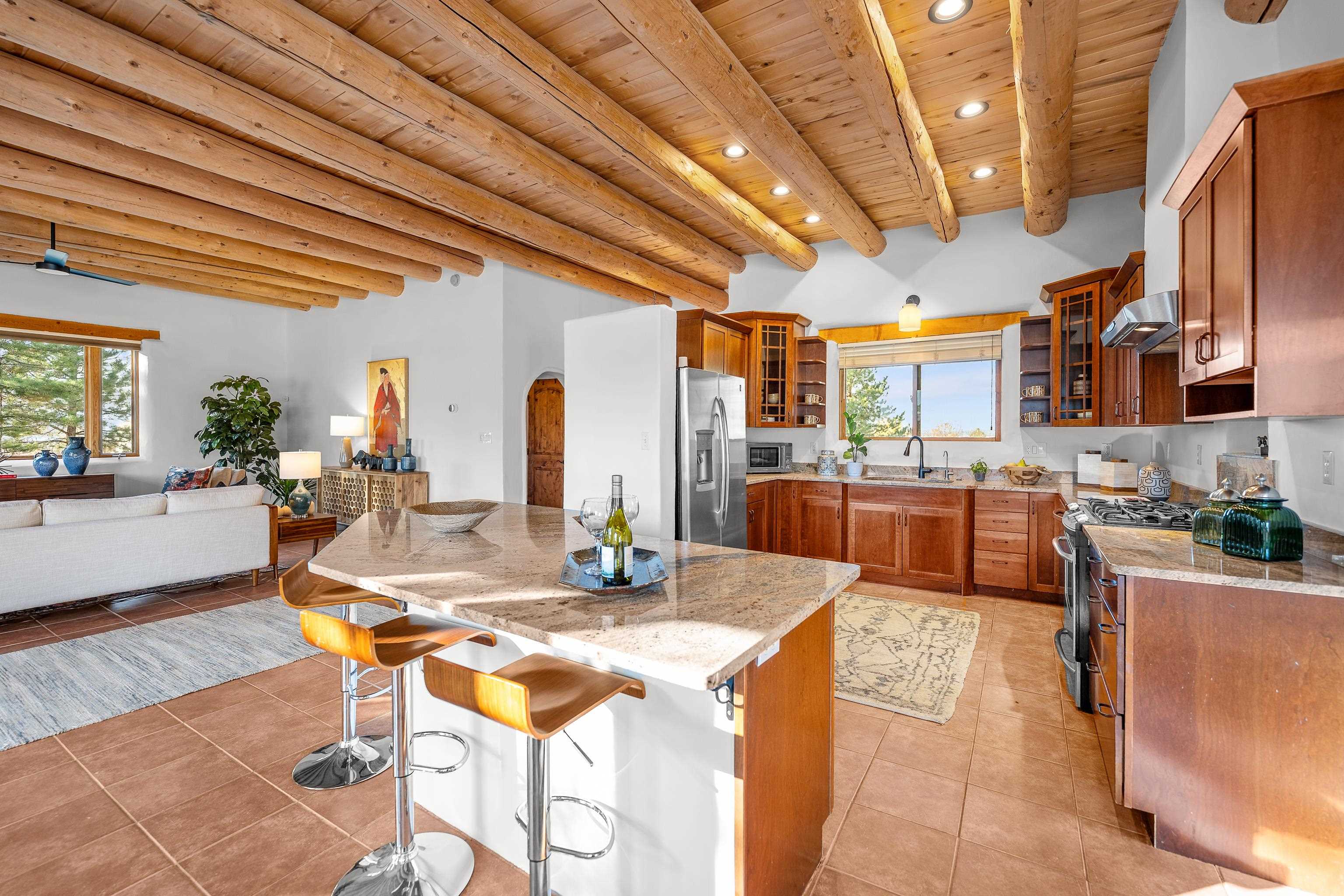 Nestled between Taos Mountain and the sweeping mesa, this inviting adobe-style home blends classic Northern New Mexico craftsmanship with modern comfort. Viga beam ceilings, Saltillo tile floors, and plaster walls create a warm, grounded atmosphere throughout the light-filled interior. The open-concept living area features a southwestern-style fireplace and picture windows that frame stunning mountain views, while the adjoining kitchen offers granite countertops, stainless steel appliances, and generous workspace for everyday living or entertaining. Two spacious bedroom suites--one upstairs, one down--provide privacy and flexibility for guests, remote work, or multi-generational living. The third bedroom and full bath complete the thoughtful layout. Step out to the covered patio or upper deck to watch the sunrise over Taos Mountain and set across the high desert sky. The fenced acre includes mature trees, open space for gardens or pets, and the security of a private well and acequia water rights. Located just a mile from Arroyo Seco's cafs and market, and fifteen minutes from Taos Ski Valley or the Taos Plaza, this property offers both serenity and convenience--an authentic Northern New Mexico retreat built to stand the test of time.