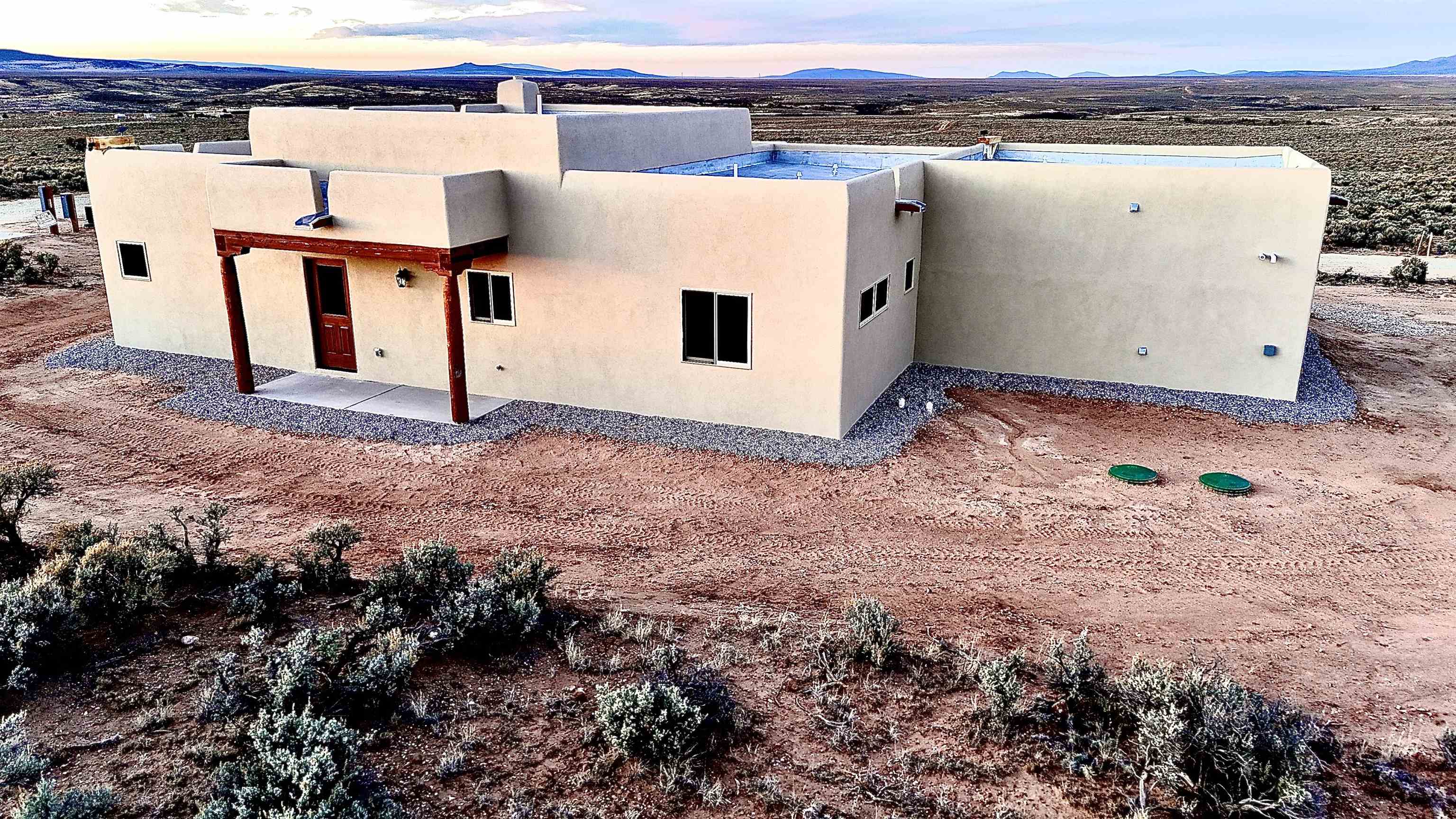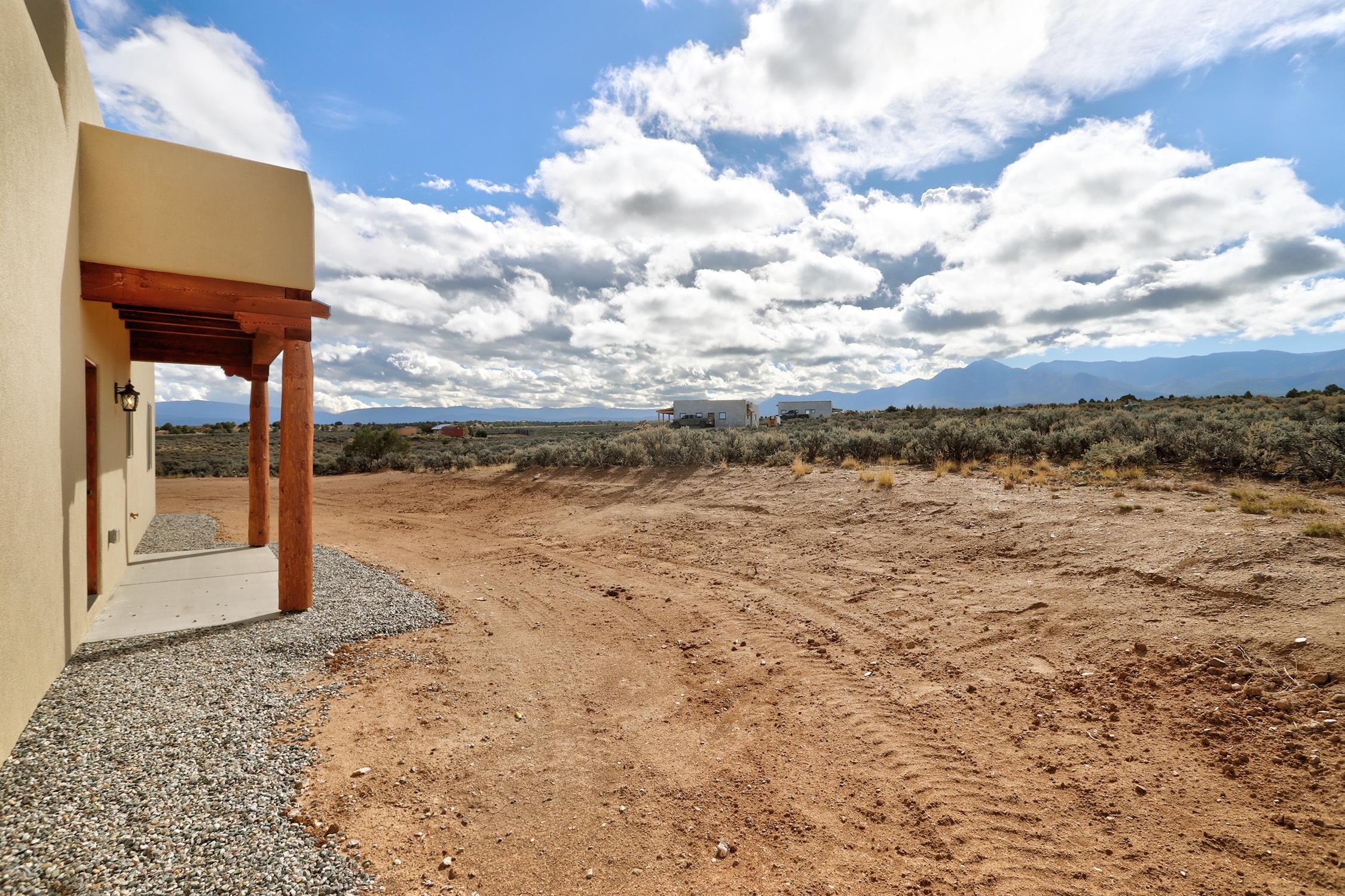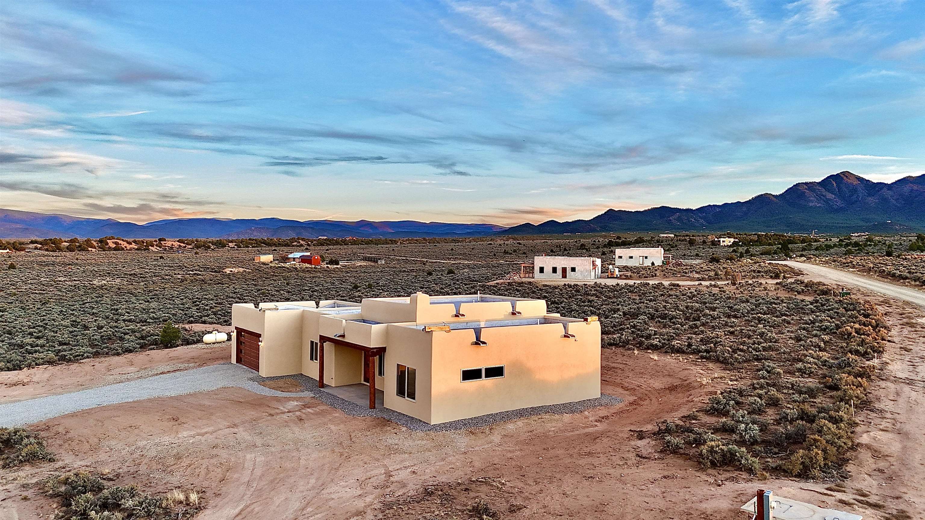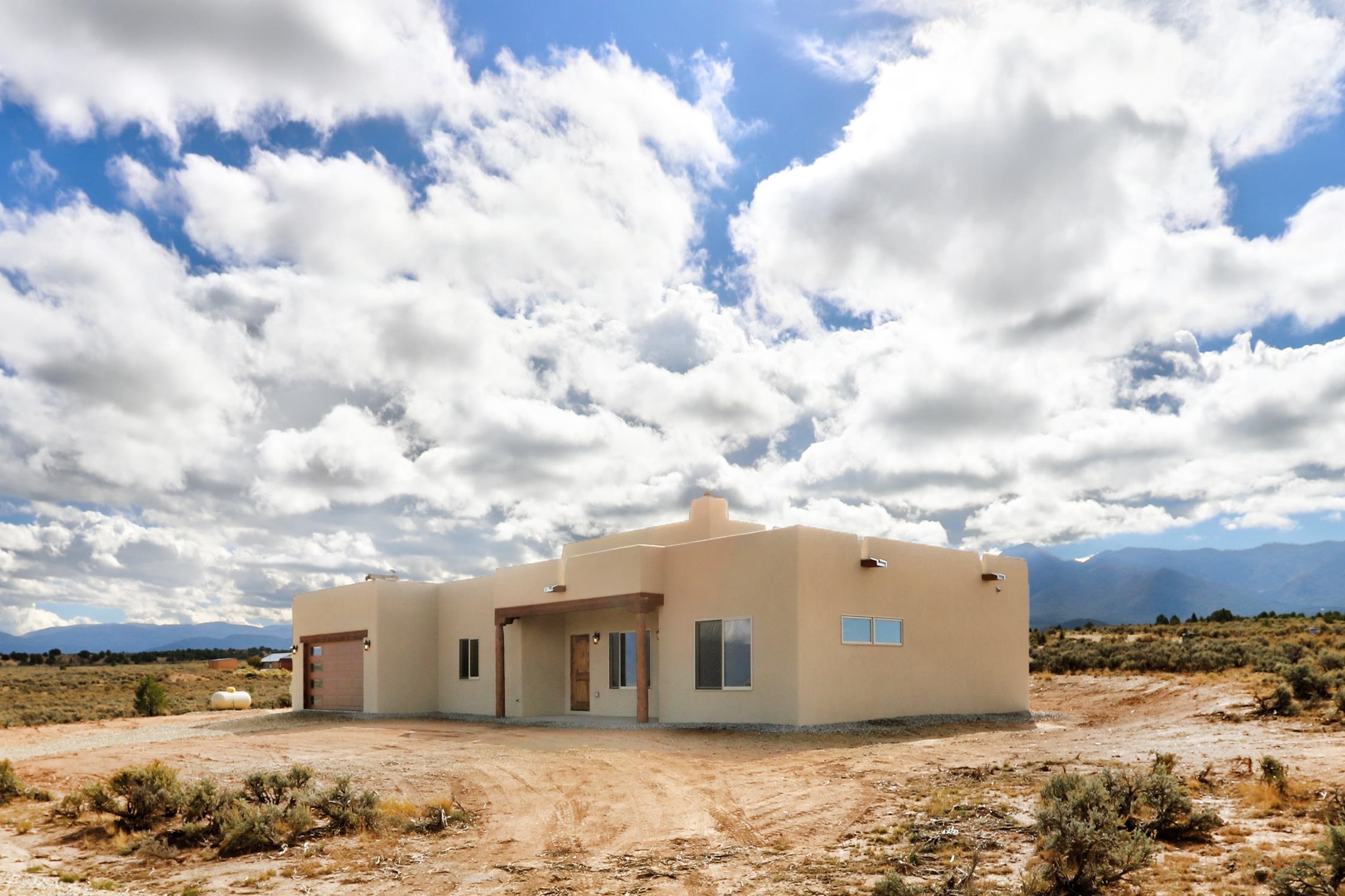 Tranquil, peaceful, and absolutely stunning 2025 Southwest Pueblo-style home for sale near the hiking trails at the end of town! Superb quality with an extra 4" of concrete footings and extra rebar to ensure a solid foundation and structural integrity of the home. The home is 1,517 square feet of heated living space with an extra 500 square feet of heated space in the garage. Can easily be converted to a studio with another garage added. Utilities include: a shared well (5 homes), septic, electric, and propane. Radiant heat throughout the home for warm floors on a snowy day. A southwest fireplace in the living room for ambiance and roasting marshmallows on those cold, blizzardy nights! Vigas in the main living space to complement the high ceilings. Custom details throughout - gorgeous handmade Talavera tiles used for the backsplash in the kitchen and bathroom, and accents in the showers and sinks. Matching mirrors above each sink for a well thought-out design flow throughout the home. Light green tiled countertops in the kitchen to forest green tiles in the bathrooms. Custom shower glass doors in each shower with no step but a gentle slope accommodating little ones, pups, elders, or those who may be easily clumsy! Handmade Saltillo tiles throughout. A well-balanced color palette with neutrals to bright reds, yellows, orange, dark blues and an overall green tone that feels refreshing and warm. RV hook-ups behind the home, an electric car plug-in added in the garage. Photos capture the elegance, while the virtual tour captures artistic touch. 3D walkthrough and floor plan are added as a bonus to the listing for you to experience the home if you're not able to see it right away. Last but not least, the expansive views in almost all directions will always remind you that the mountains are home! A simple yet heart-wrenching reminder of what makes Taos so special and why we all love it so much! *Four Pinon trees to be added to the property* See here for 3D rendering: https://tours.dragonfly360imaging.com/299473