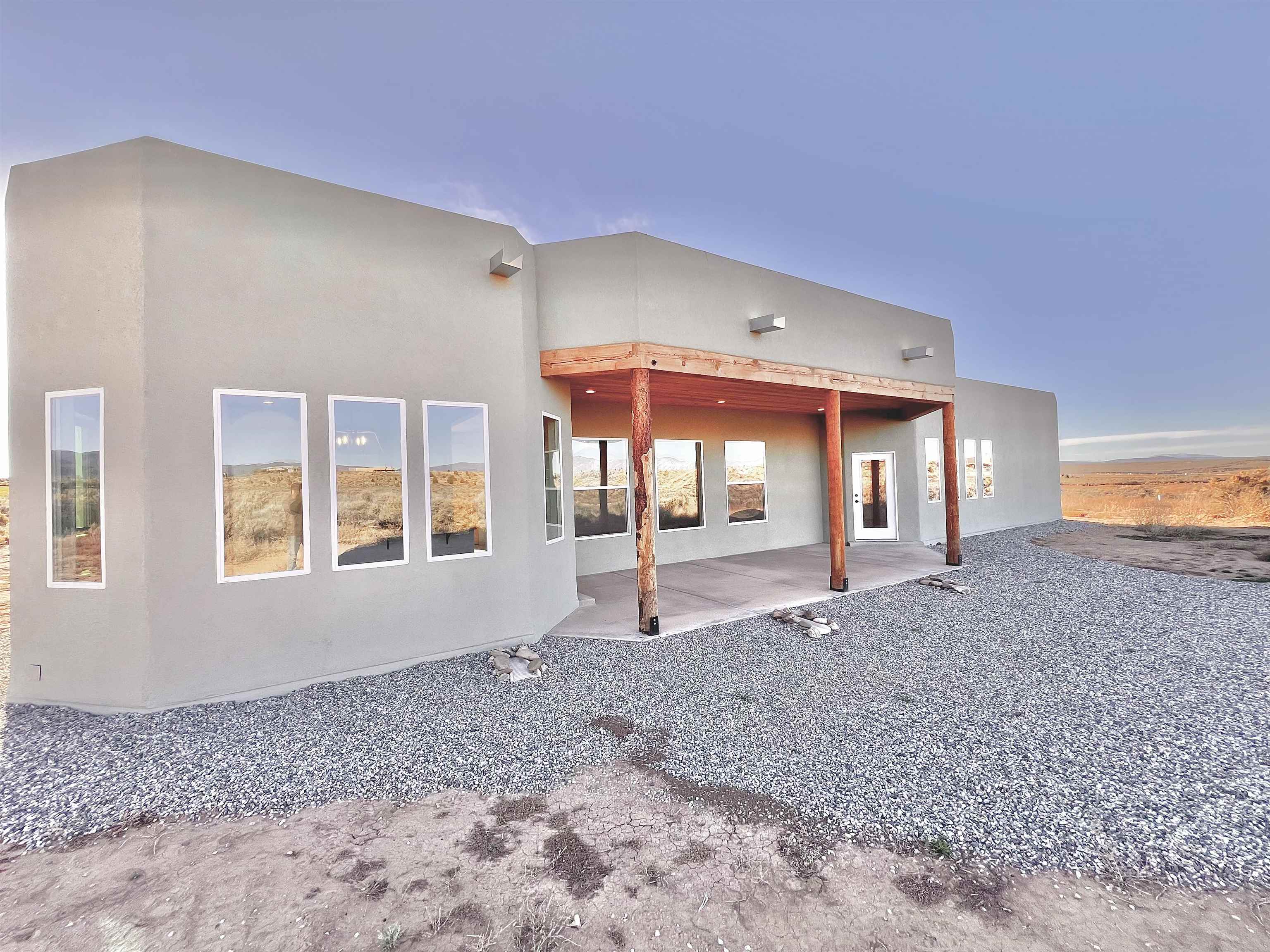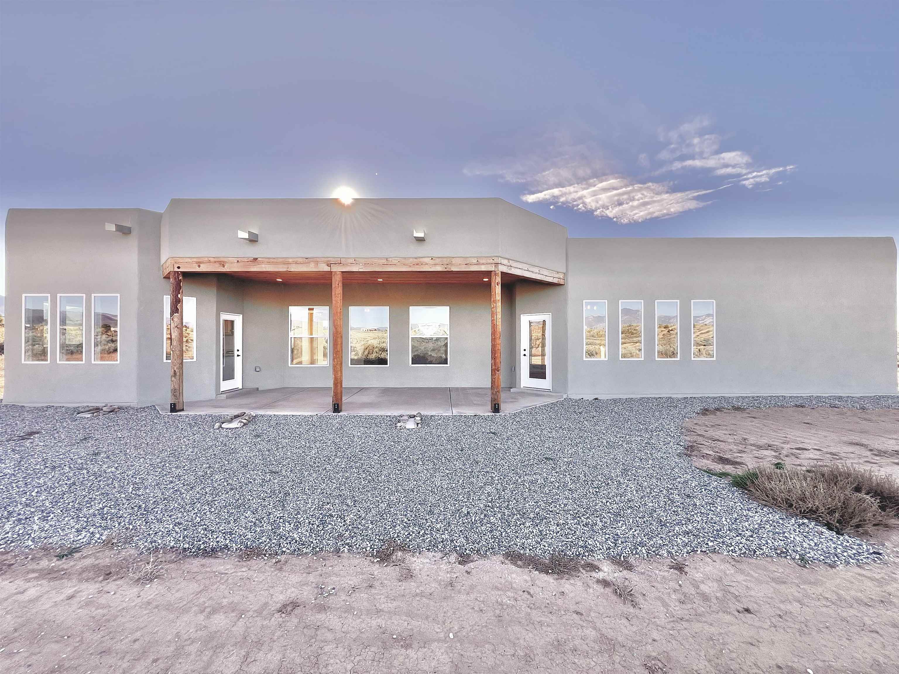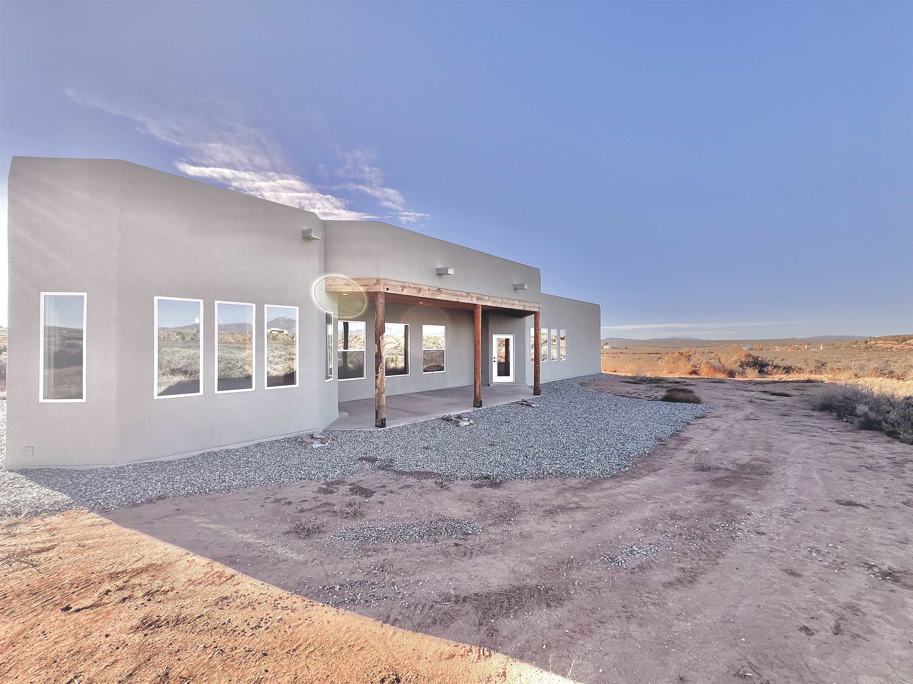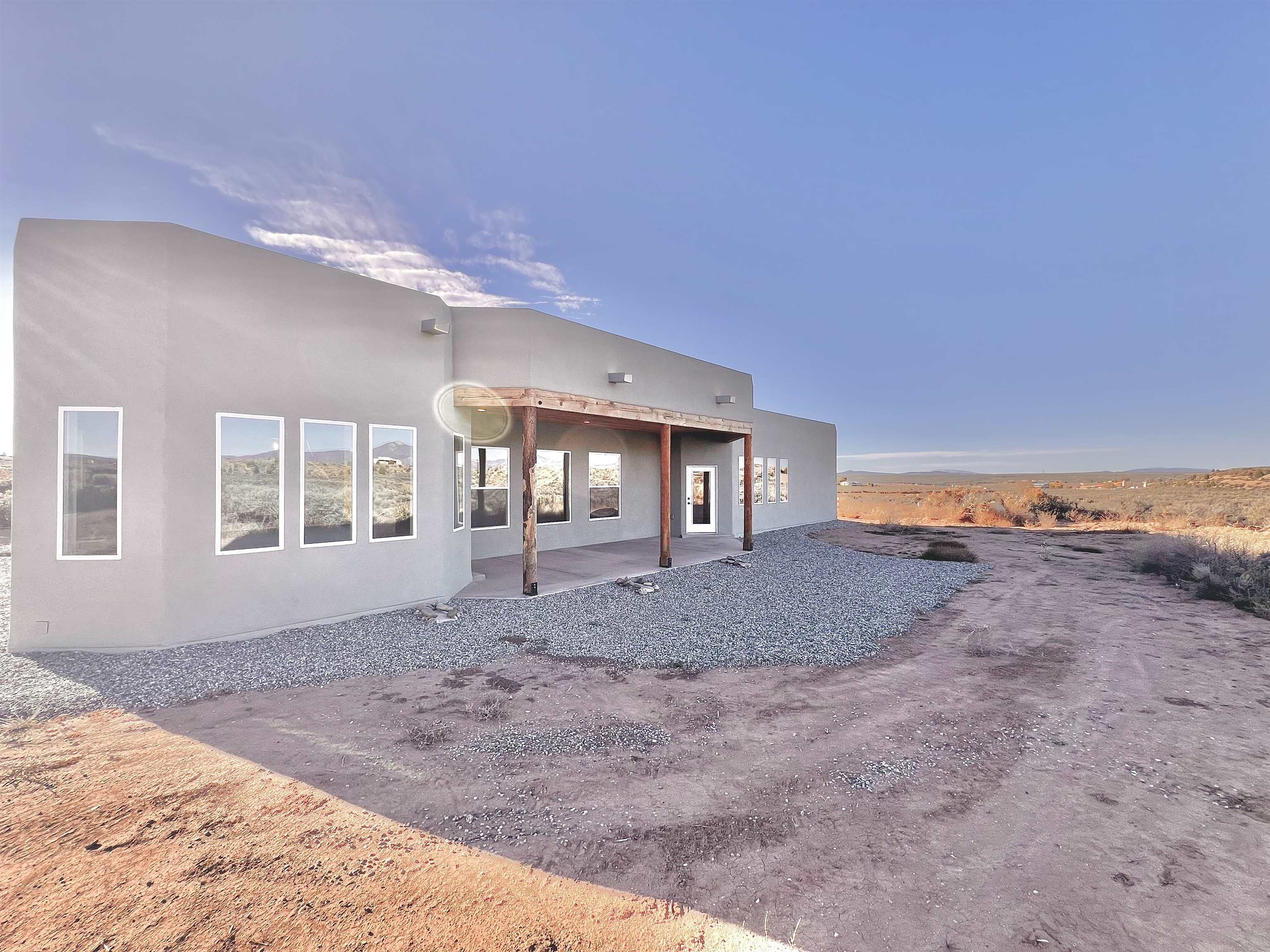 Discover a rare opportunity to enjoy golf-course living without the constraints of HOA dues or restrictive covenants. Positioned along the outskirts of the 3rd fairway at the renowned Taos Country Club Golf Course, this newly built custom residence captures the essence of upscale desert living--serene, sophisticated, and surrounded by breathtaking natural beauty. Set on 1.27 expansive acres, the home offers unobstructed panoramic views of the Sangre de Cristo Mountains, the dramatic Taos Valley, and the rugged Rio Pueblo Gorge. Outdoor enthusiasts will appreciate immediate access to world-class hiking, biking, and the nearby UNM Taos Klauer Campus--all while enjoying the ease of a quick southbound drive toward Santa Fe. Crafted in an elegant pueblo-inspired architectural style, the home showcases impeccable workmanship and timeless Southwestern design. Inside, 2,430 square feet of refined living space features hand-laid tile floors, tongue-and-groove and beam ceilings, Diamond Finish plaster walls, and select-pine custom cabinetry. High ceilings and strategically placed windows flood the interior with natural light, capturing sunrise, sunset, and mountain vistas from multiple rooms. The gourmet kitchen serves as the heart of the home, appointed with granite countertops, a high-tech gas range with built-in air-fryer, and large picture windows framing unforgettable views. The living room is equally inviting, anchored by a beautifully designed fireplace that adds warmth and ambiance to the space. With four bedrooms and two and a half baths, the home thoughtfully balances luxury with functionality. The primary suite features privacy and comfort, while the additional bedrooms, elegantly carpeted, provide versatility for family or guests. The residence is engineered for year-round comfort with central heating, refrigerated air, a TPO roof with attic insulation, and a tankless water heater for efficiency. Modern convenience continues with smart-home technology that allows remote control of the garage doors, climate systems, and water heater. An oversized two-car garage with an insulated 8' x 16' door ensures vehicles and gear are protected from the elements, completing this exceptional property. Experience luxury, privacy, and panoramic beauty--without compromise. Schedule your private viewing and discover a home that stands apart in one of Taos's most coveted settings.