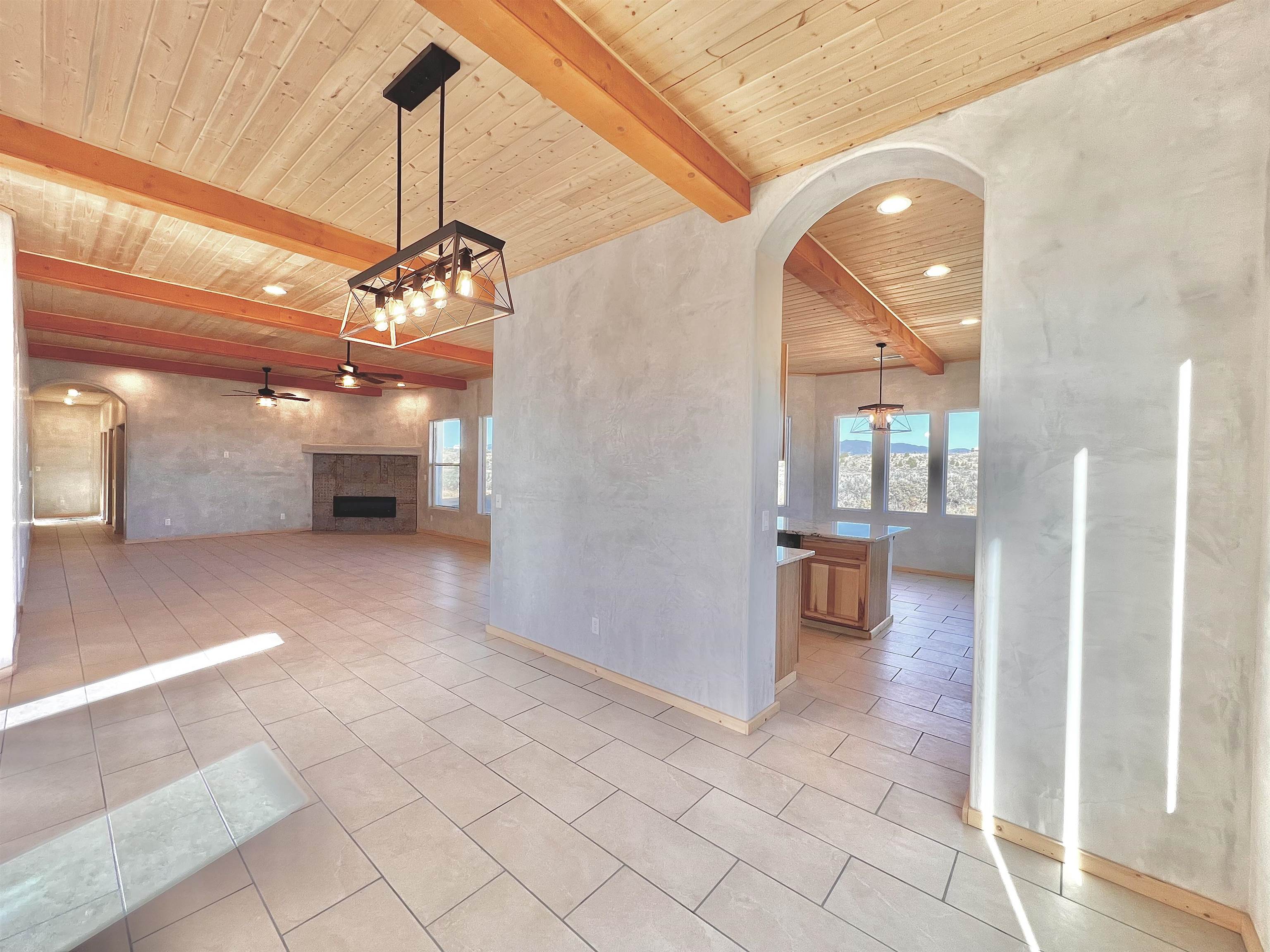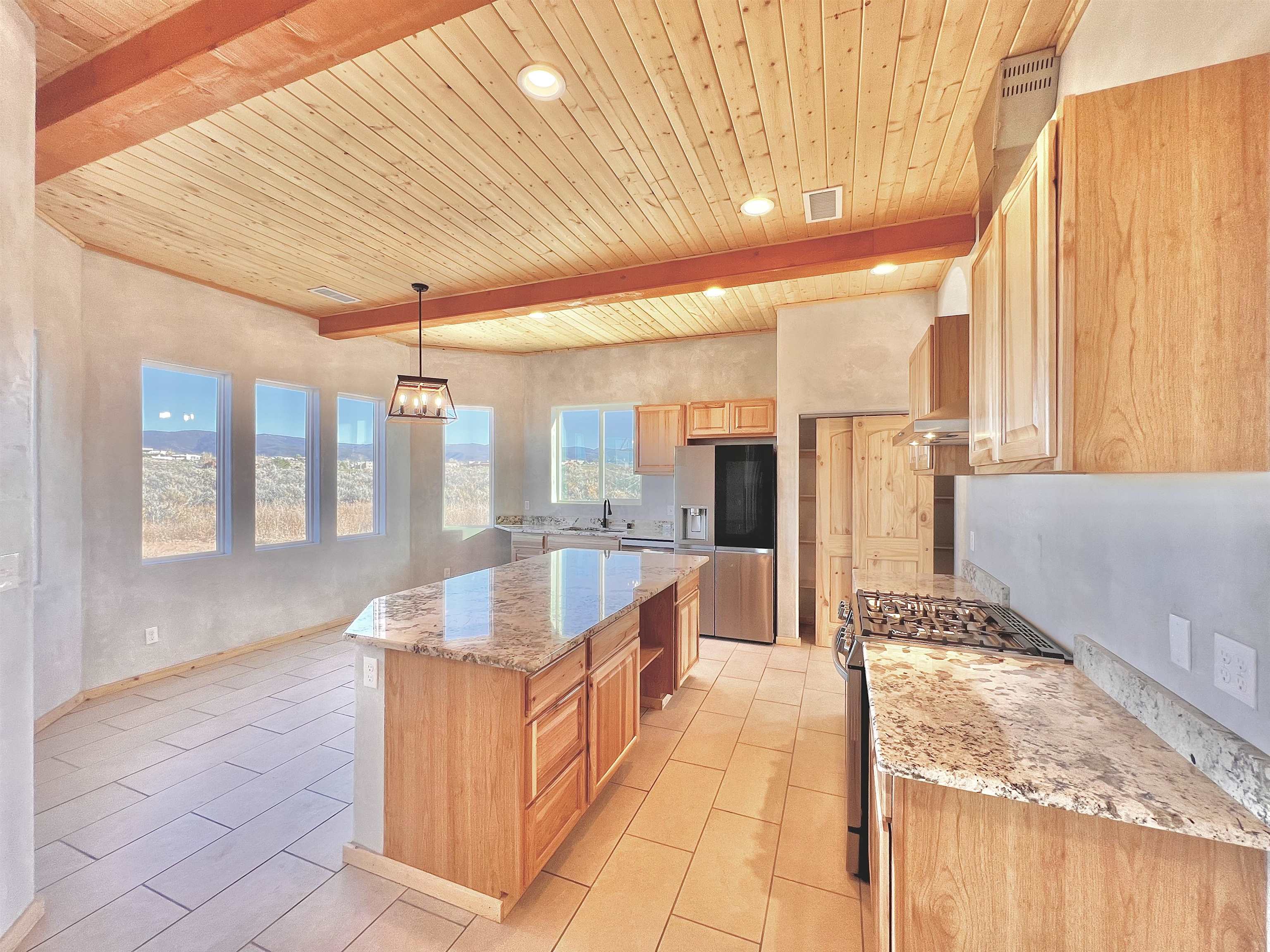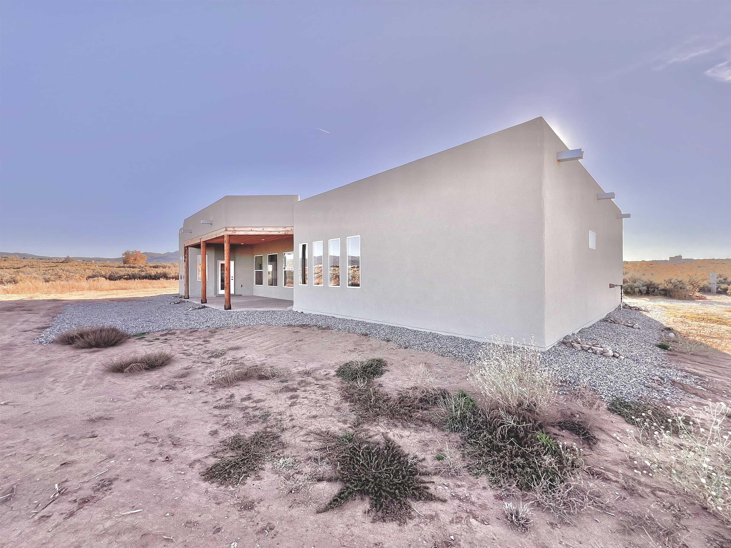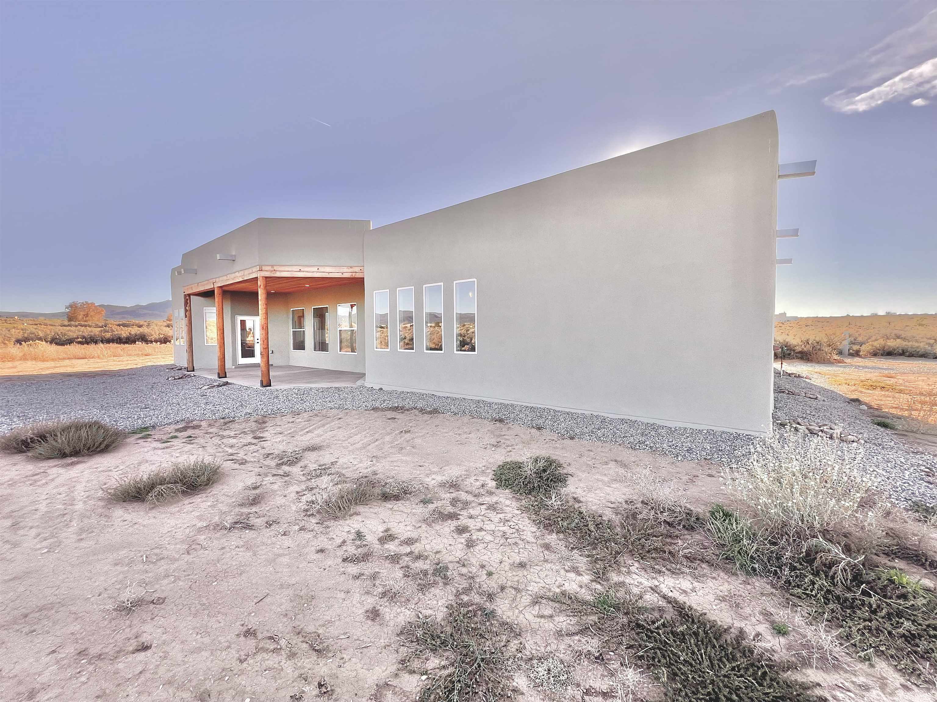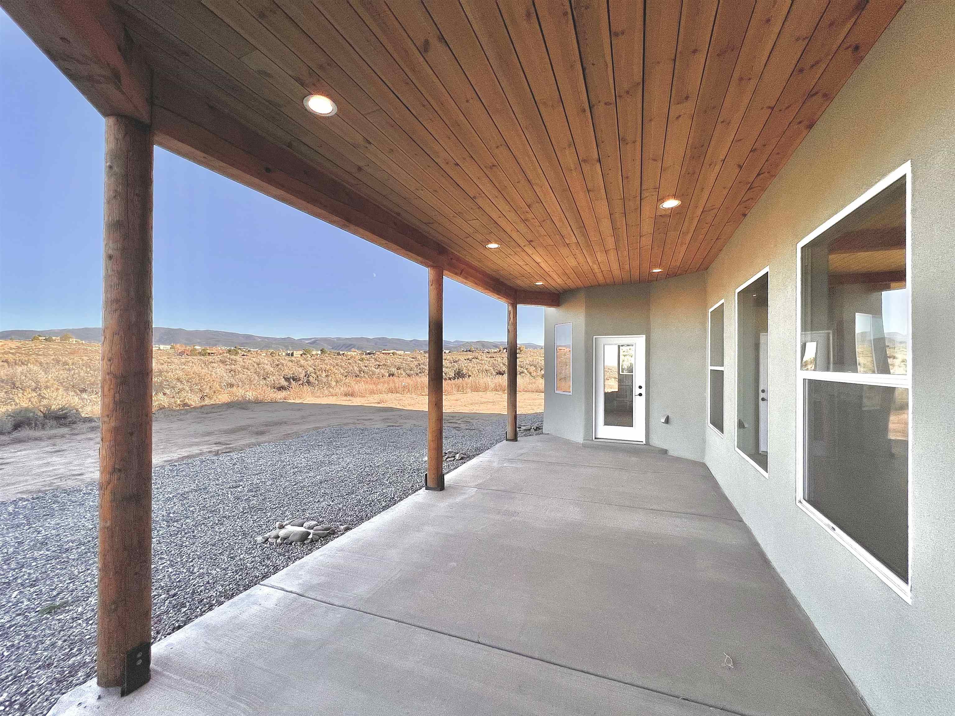Discover a rare opportunity to enjoy golf-course living without the constraints of HOA dues or restrictive covenants. Positioned along the outskirts of the 3rd fairway at the renowned Taos Country Club Golf Course, this newly built custom residence captures the essence of upscale desert living--serene, sophisticated, and surrounded by breathtaking natural beauty. Set on 1.27 expansive acres, the home offers unobstructed panoramic views of the Sangre de Cristo Mountains, the dramatic Taos Valley, and the rugged Rio Pueblo Gorge. Outdoor enthusiasts will appreciate immediate access to world-class hiking, biking, and the nearby UNM Taos Klauer Campus--all while enjoying the ease of a quick southbound drive toward Santa Fe. Crafted in an elegant pueblo-inspired architectural style, the home showcases impeccable workmanship and timeless Southwestern design. Inside, 2,430 square feet of refined living space features hand-laid tile floors, tongue-and-groove and beam ceilings, Diamond Finish plaster walls, and select-pine custom cabinetry. High ceilings and strategically placed windows flood the interior with natural light, capturing sunrise, sunset, and mountain vistas from multiple rooms. The gourmet kitchen serves as the heart of the home, appointed with granite countertops, a high-tech gas range with built-in air-fryer, and large picture windows framing unforgettable views. The living room is equally inviting, anchored by a beautifully designed fireplace that adds warmth and ambiance to the space. With four bedrooms and two and a half baths, the home thoughtfully balances luxury with functionality. The primary suite features privacy and comfort, while the additional bedrooms, elegantly carpeted, provide versatility for family or guests. The residence is engineered for year-round comfort with central heating, refrigerated air, a TPO roof with attic insulation, and a tankless water heater for efficiency. Modern convenience continues with smart-home technology that allows remote control of the garage doors, climate systems, and water heater. An oversized two-car garage with an insulated 8' x 16' door ensures vehicles and gear are protected from the elements, completing this exceptional property. Experience luxury, privacy, and panoramic beauty--without compromise. Schedule your private viewing and discover a home that stands apart in one of Taos's most coveted settings.