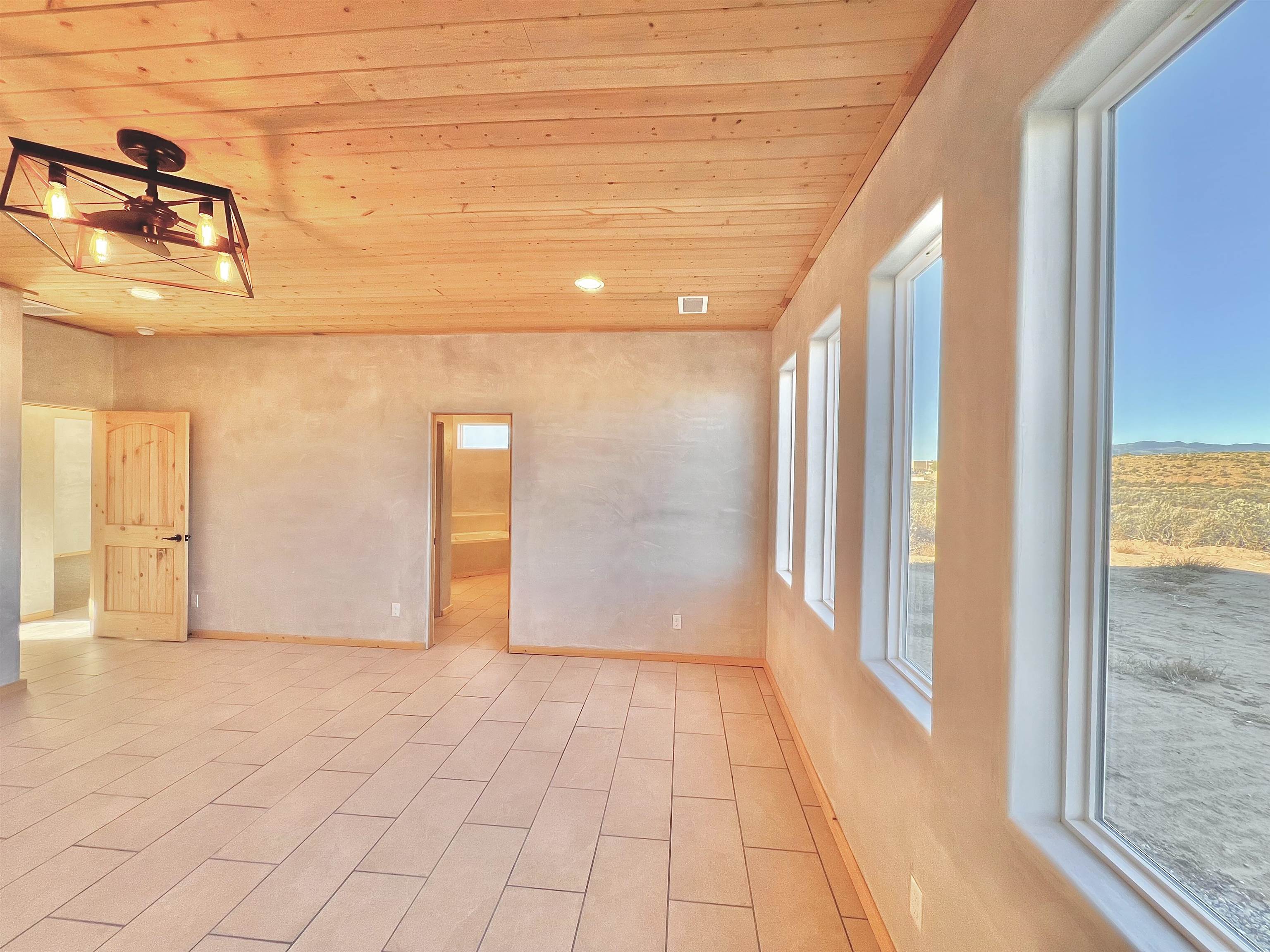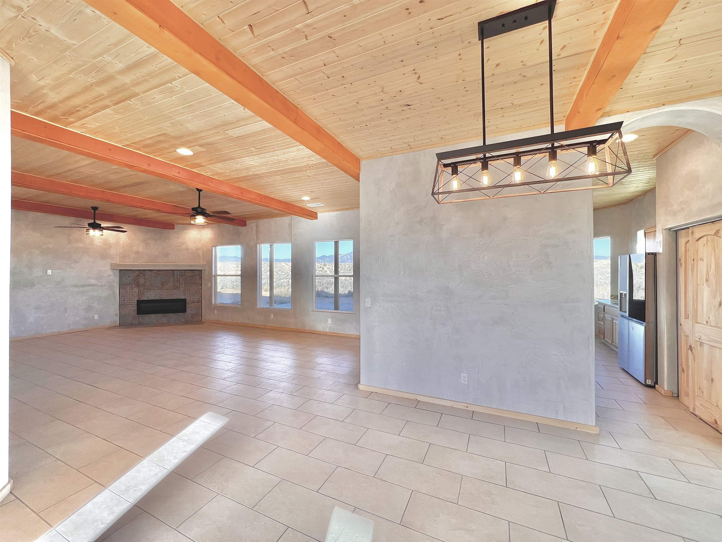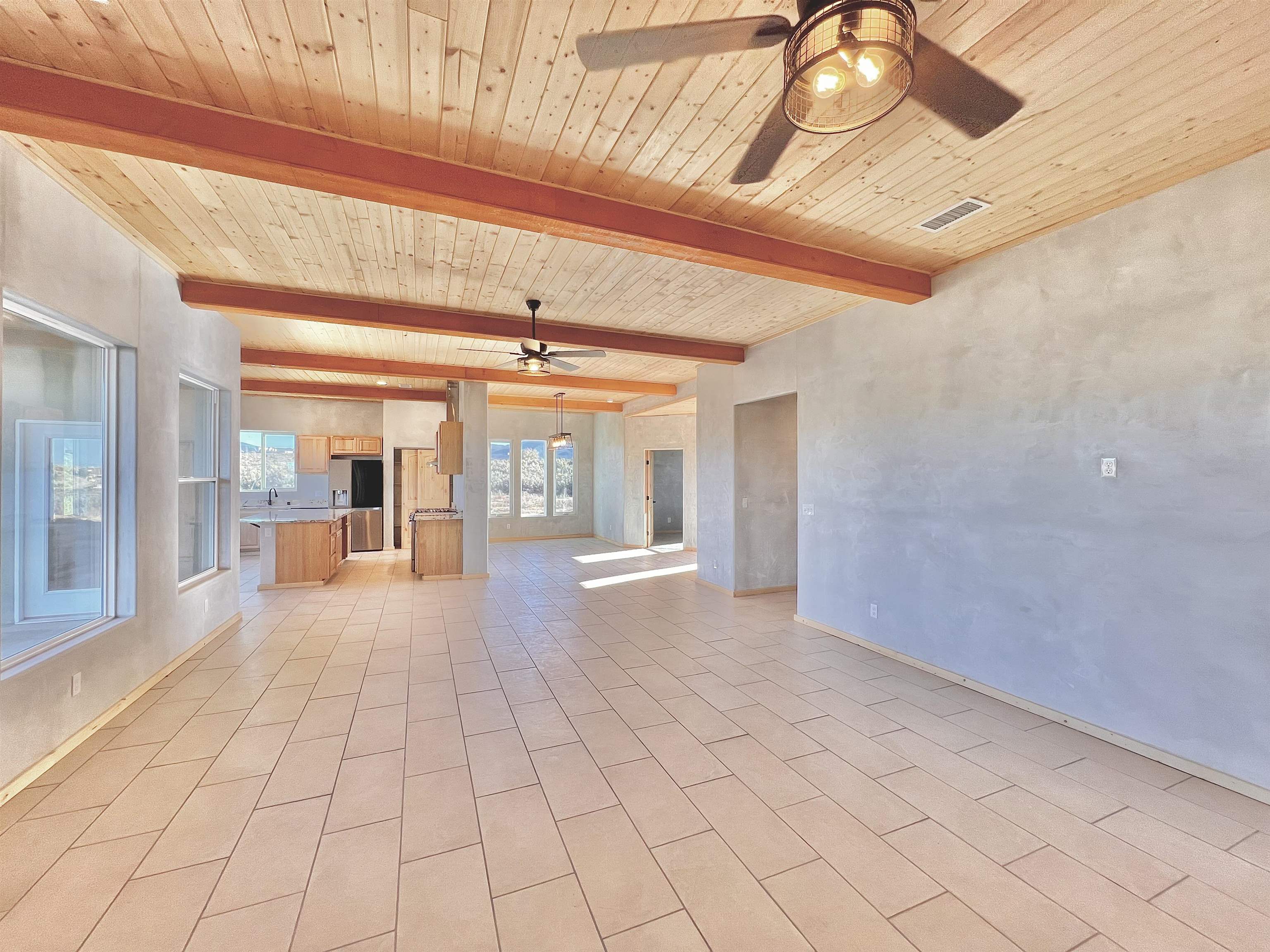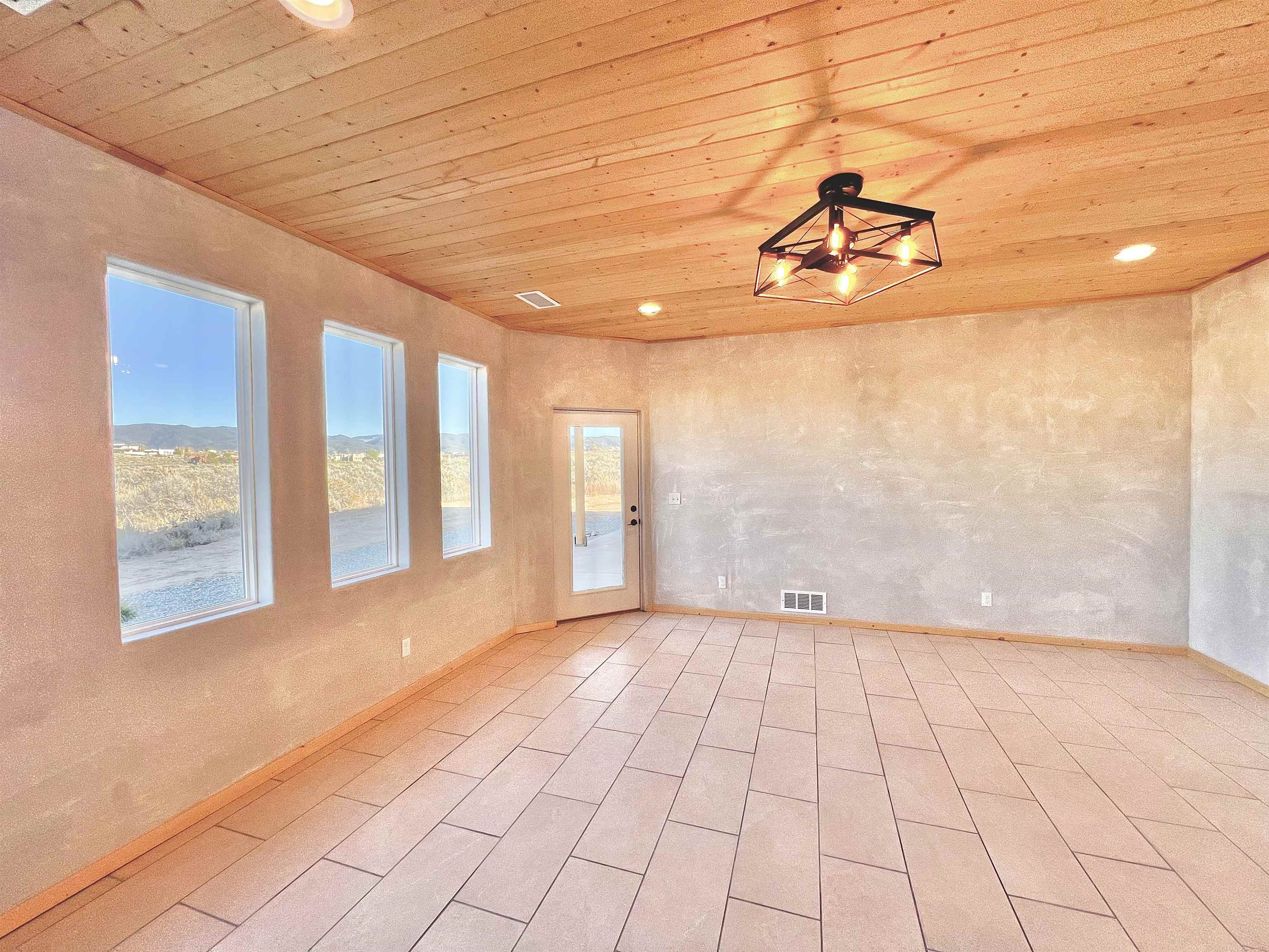 Discover a rare opportunity to enjoy golf-course living without the constraints of HOA dues or restrictive covenants. Positioned along the outskirts of the 3rd fairway at the renowned Taos Country Club Golf Course, this newly built custom residence captures the essence of upscale desert living--serene, sophisticated, and surrounded by breathtaking natural beauty. Set on 1.27 expansive acres, the home offers unobstructed panoramic views of the Sangre de Cristo Mountains, the dramatic Taos Valley, and the rugged Rio Pueblo Gorge. Outdoor enthusiasts will appreciate immediate access to world-class hiking, biking, and the nearby UNM Taos Klauer Campus--all while enjoying the ease of a quick southbound drive toward Santa Fe. Crafted in an elegant pueblo-inspired architectural style, the home showcases impeccable workmanship and timeless Southwestern design. Inside, 2,430 square feet of refined living space features hand-laid tile floors, tongue-and-groove and beam ceilings, Diamond Finish plaster walls, and select-pine custom cabinetry. High ceilings and strategically placed windows flood the interior with natural light, capturing sunrise, sunset, and mountain vistas from multiple rooms. The gourmet kitchen serves as the heart of the home, appointed with granite countertops, a high-tech gas range with built-in air-fryer, and large picture windows framing unforgettable views. The living room is equally inviting, anchored by a beautifully designed fireplace that adds warmth and ambiance to the space. With four bedrooms and two and a half baths, the home thoughtfully balances luxury with functionality. The primary suite features privacy and comfort, while the additional bedrooms, elegantly carpeted, provide versatility for family or guests. The residence is engineered for year-round comfort with central heating, refrigerated air, a TPO roof with attic insulation, and a tankless water heater for efficiency. Modern convenience continues with smart-home technology that allows remote control of the garage doors, climate systems, and water heater. An oversized two-car garage with an insulated 8' x 16' door ensures vehicles and gear are protected from the elements, completing this exceptional property. Experience luxury, privacy, and panoramic beauty--without compromise. Schedule your private viewing and discover a home that stands apart in one of Taos's most coveted settings.