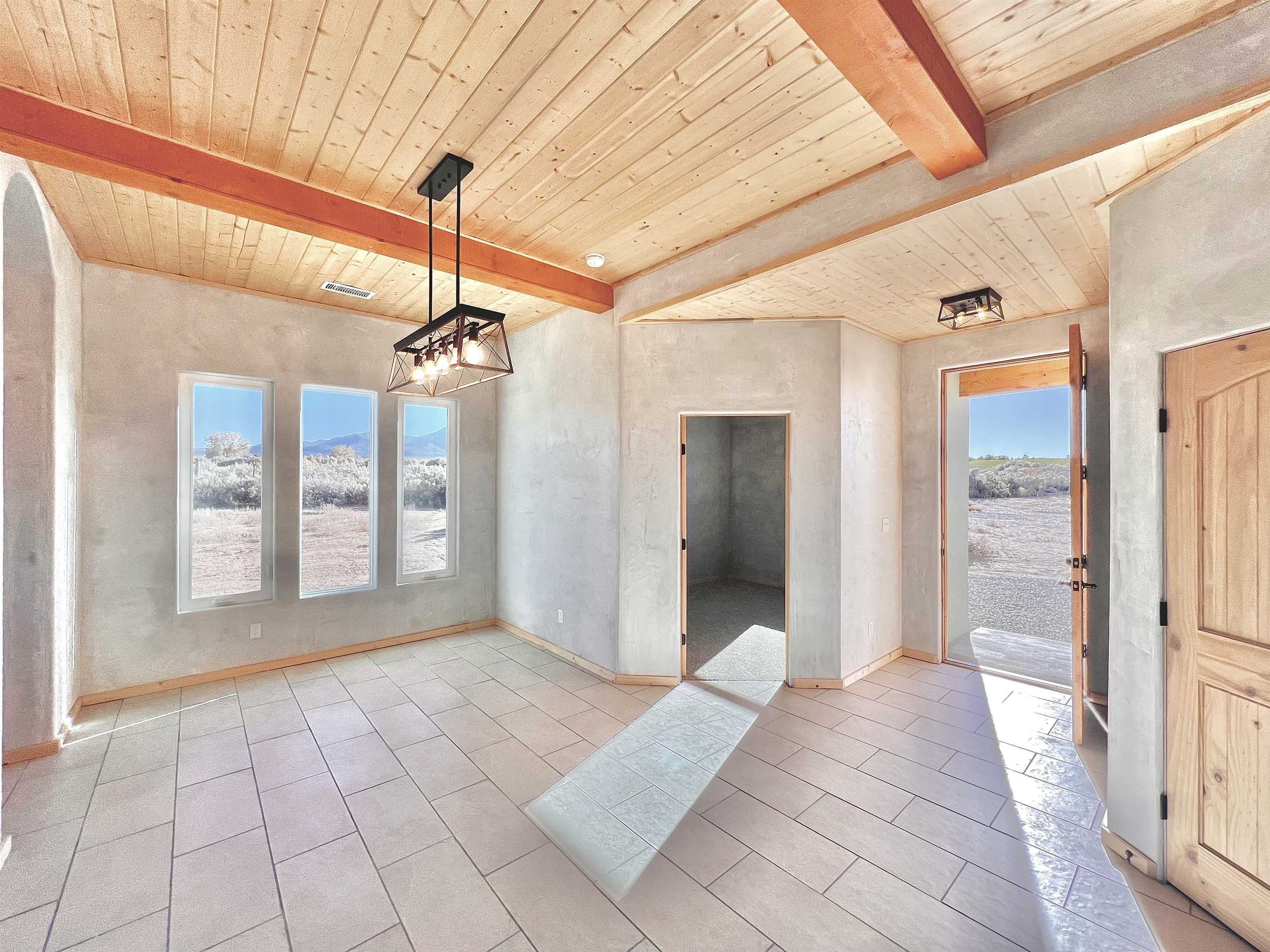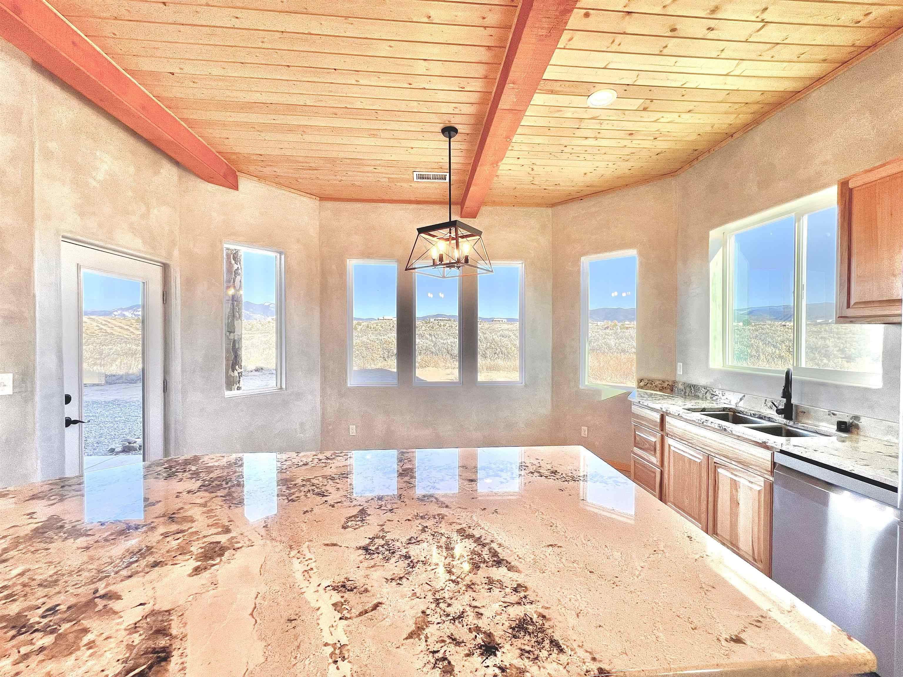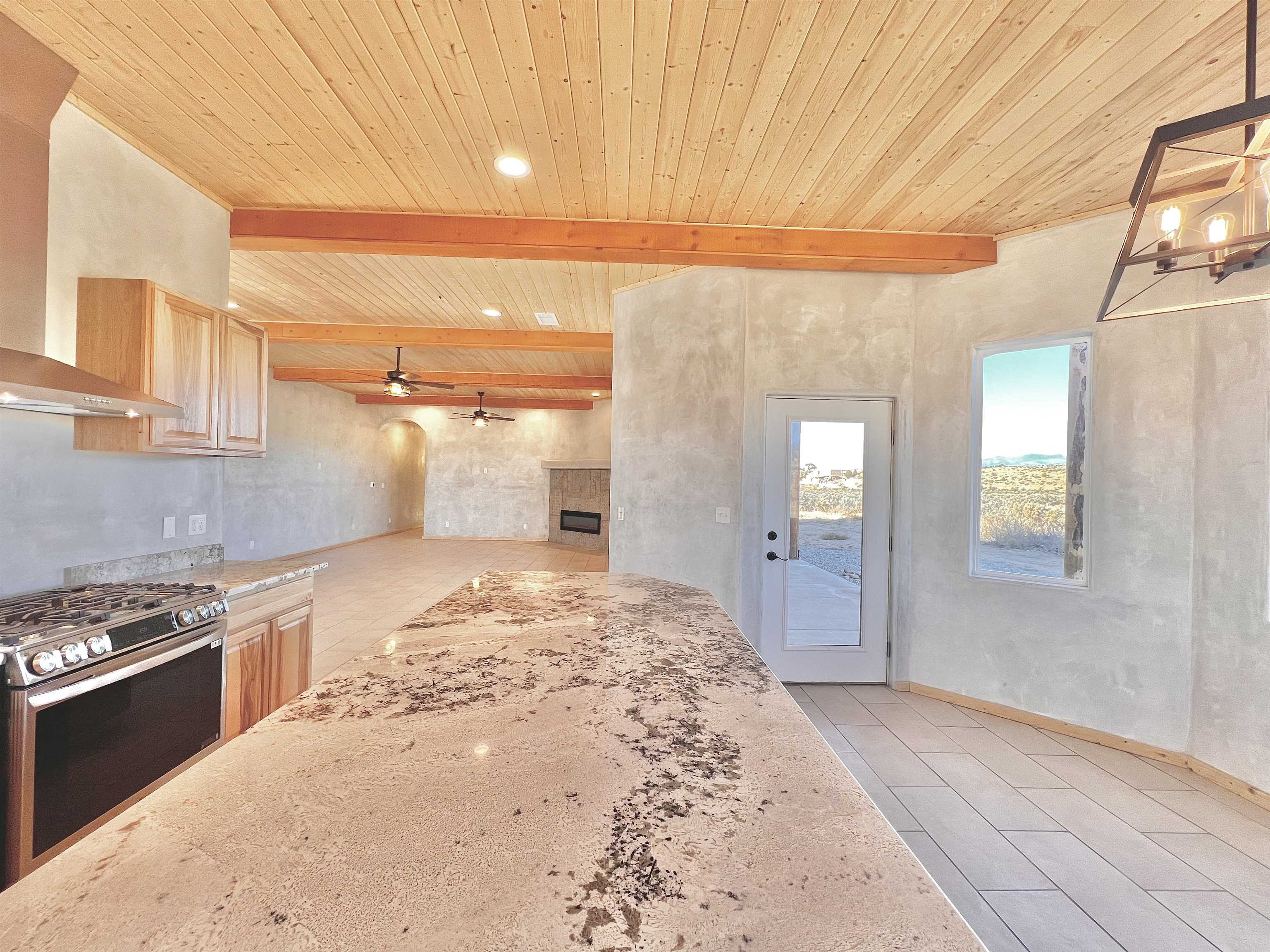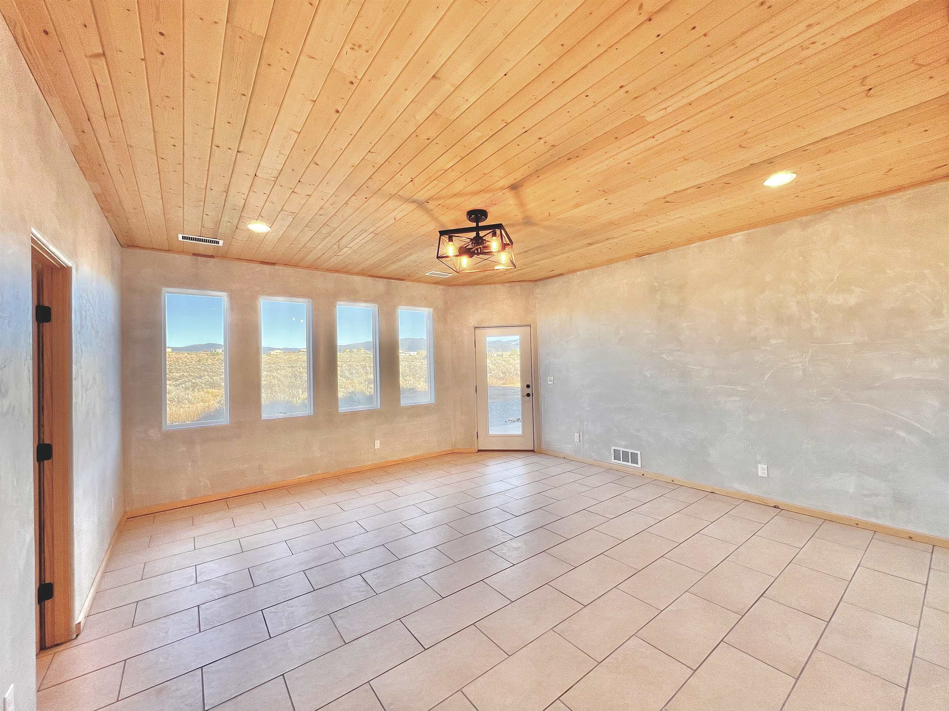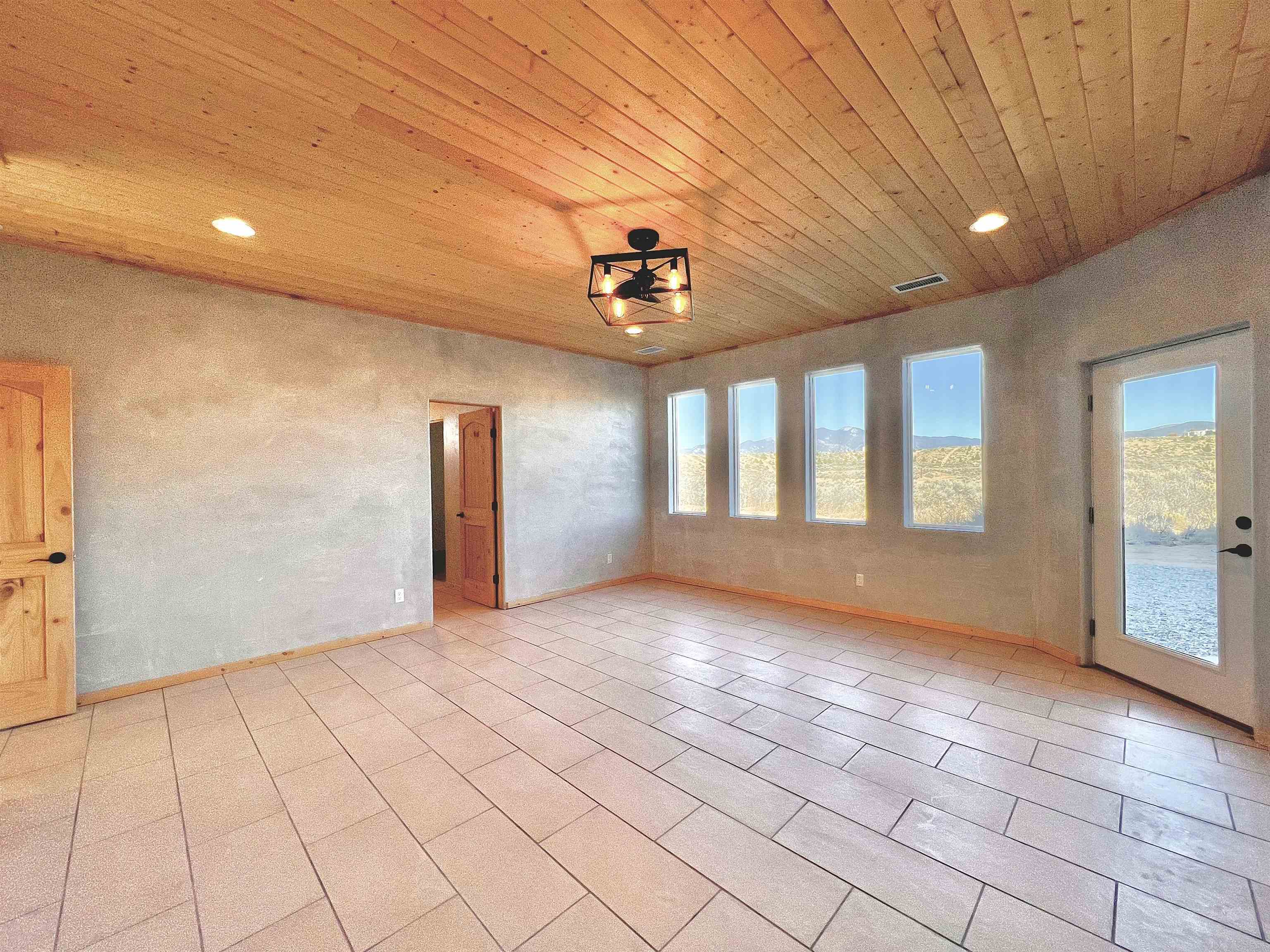 Discover a rare opportunity to enjoy golf-course living without the constraints of HOA dues or restrictive covenants. Positioned along the outskirts of the 3rd fairway at the renowned Taos Country Club Golf Course, this newly built custom residence captures the essence of upscale desert living--serene, sophisticated, and surrounded by breathtaking natural beauty. Set on 1.27 expansive acres, the home offers unobstructed panoramic views of the Sangre de Cristo Mountains, the dramatic Taos Valley, and the rugged Rio Pueblo Gorge. Outdoor enthusiasts will appreciate immediate access to world-class hiking, biking, and the nearby UNM Taos Klauer Campus--all while enjoying the ease of a quick southbound drive toward Santa Fe. Crafted in an elegant pueblo-inspired architectural style, the home showcases impeccable workmanship and timeless Southwestern design. Inside, 2,430 square feet of refined living space features hand-laid tile floors, tongue-and-groove and beam ceilings, Diamond Finish plaster walls, and select-pine custom cabinetry. High ceilings and strategically placed windows flood the interior with natural light, capturing sunrise, sunset, and mountain vistas from multiple rooms. The gourmet kitchen serves as the heart of the home, appointed with granite countertops, a high-tech gas range with built-in air-fryer, and large picture windows framing unforgettable views. The living room is equally inviting, anchored by a beautifully designed fireplace that adds warmth and ambiance to the space. With four bedrooms and two and a half baths, the home thoughtfully balances luxury with functionality. The primary suite features privacy and comfort, while the additional bedrooms, elegantly carpeted, provide versatility for family or guests. The residence is engineered for year-round comfort with central heating, refrigerated air, a TPO roof with attic insulation, and a tankless water heater for efficiency. Modern convenience continues with smart-home technology that allows remote control of the garage doors, climate systems, and water heater. An oversized two-car garage with an insulated 8' x 16' door ensures vehicles and gear are protected from the elements, completing this exceptional property. Experience luxury, privacy, and panoramic beauty--without compromise. Schedule your private viewing and discover a home that stands apart in one of Taos's most coveted settings.