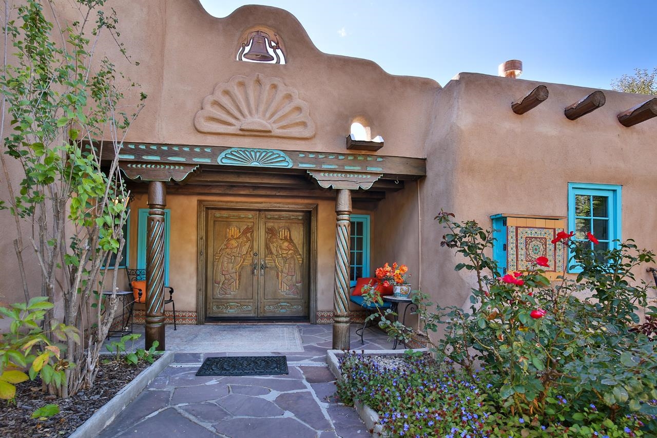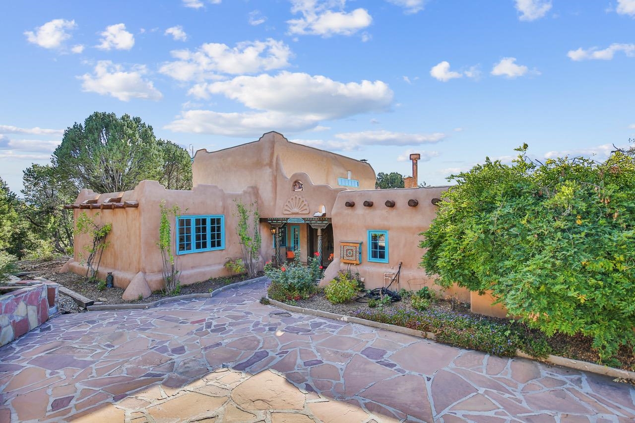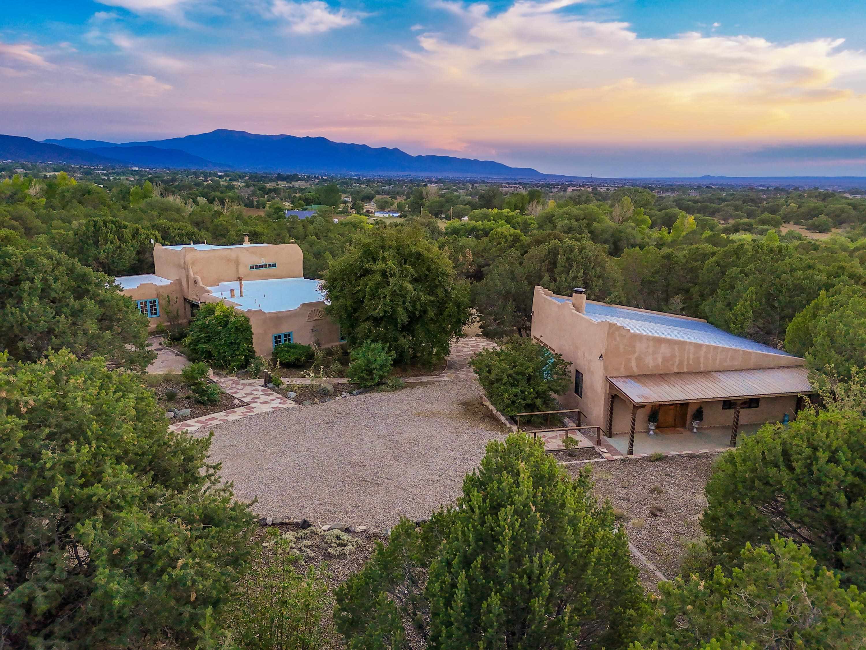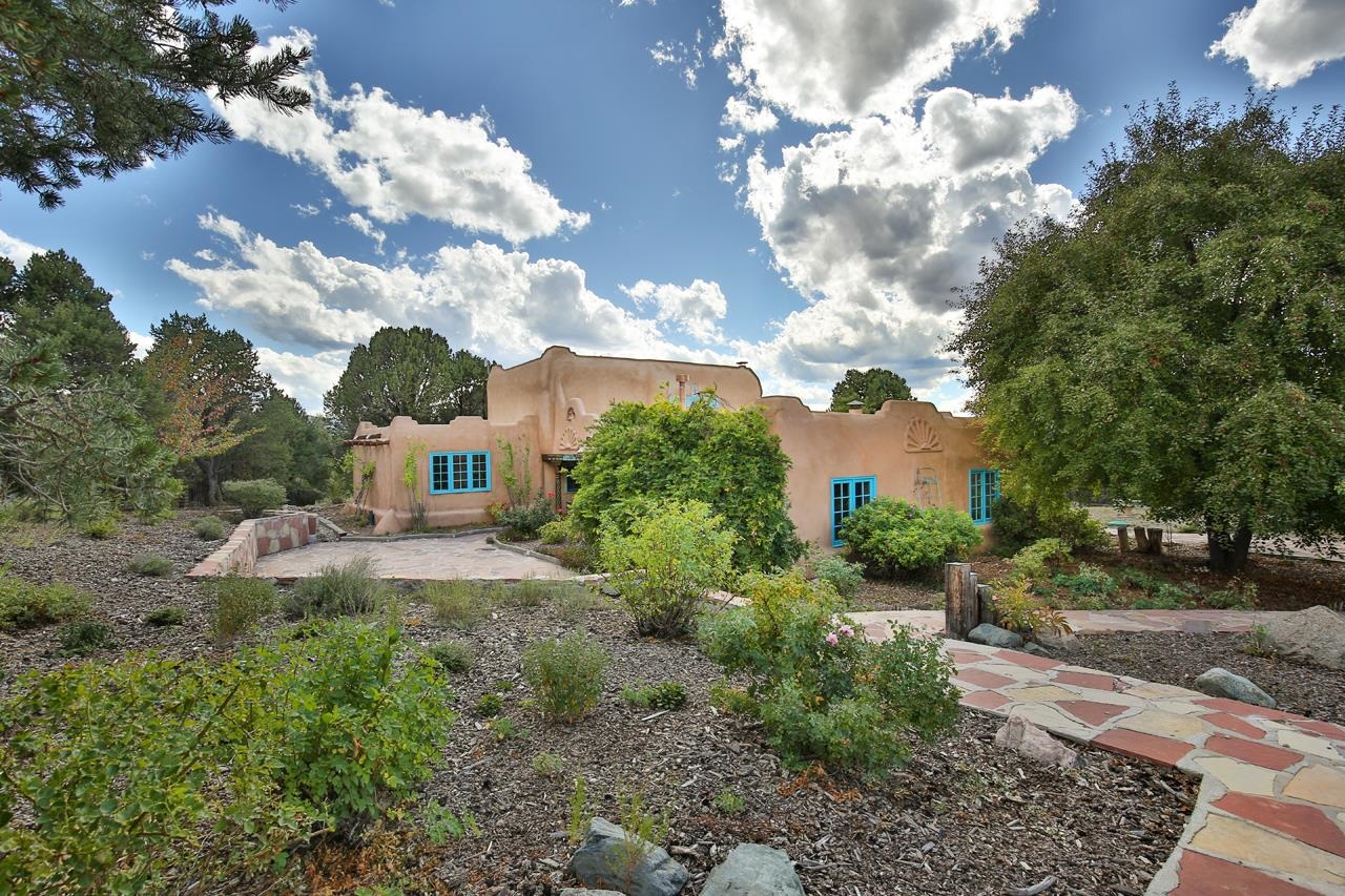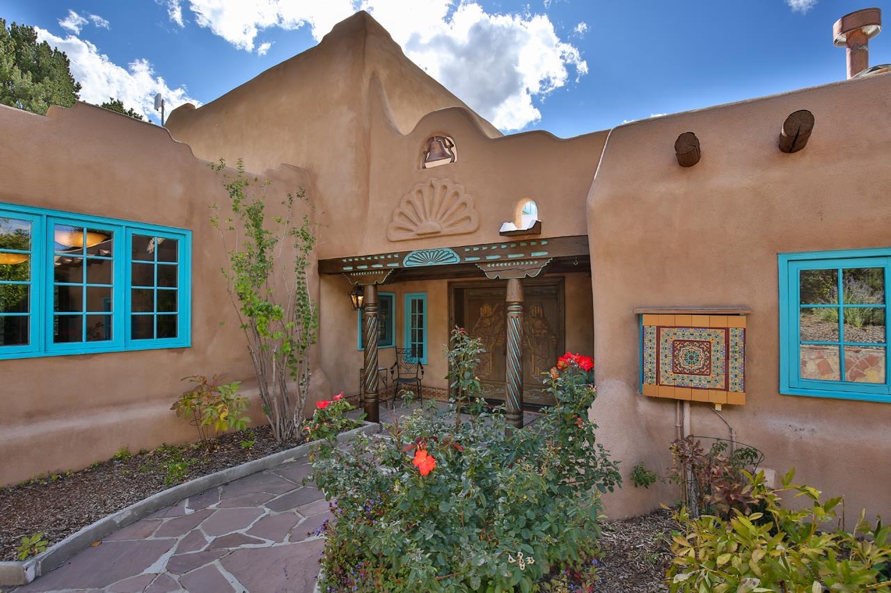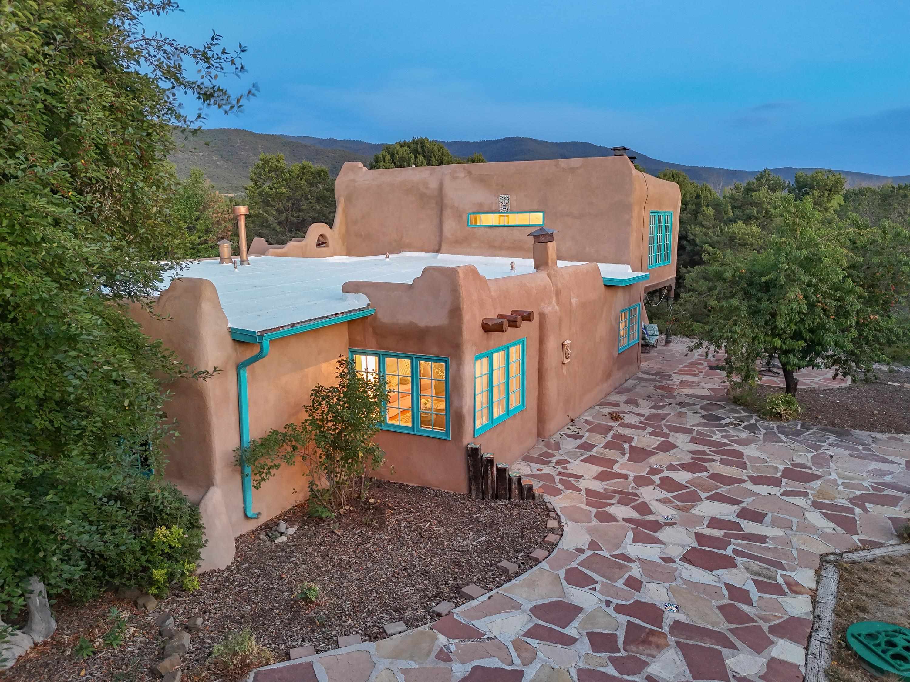 Set amidst the pinon- juniper woodland of the Canon foothills, this beautiful two story, 2400 sq ft, 3 bed and 2 bath adobe home exudes another era - a time when craftsmanship and care reigned supreme. Warm Saltillo tile, rounded plaster walls, large light-filled, mullioned windows, coved ceilings, one-of-a-kind, hand-carved doors in every room, 3 kiva style fireplaces, elaborate tilework throughout - all this just 5 minutes from Taos Plaza. Secluded behind a heavy wooden gates this 1 acre compound comes with a detached dance studio, a 1-car garage and flag stone walkways that lead to terraced gardens. Built in 1975, this lovely home has been lovingly maintained and updated and expanded over the years. Walking down past a giant wisteria, you pass beds of roses and native perennials and then you enter through those dramatic unforgettable front doors with the intaglio images of a Matachine dancer over the classic Zia sun (carved by Mark Romero). The bright foyer with coved vigas leads to living room centered around a fireplace with nichos and a long banco. The murals on this floor by Taos artist Linda Kimmons. The guest wing with two spacious bedrooms is past the living room. Head In the other direction to get to the well-appointed kitchen where ample oak cabinets are wrapped around a tile clad island that will be the hang out spot of the home. Beyond is the dining room with its own kiva style fireplace and French doors leading out to the west facing patio where you can entertain al fresco to those famous Taos sunsets and colorful skies. Up a couple of steps from the kitchen is a library with built in shelves and another way to slip out to the southside gardens. Up the stairs with the elaborately carved balustrade you arrive at the 580 sq ft primary suite with windows facing werst and giving you views of el Pedernal and the Jemez mountains. The spacious bedroom leads to a dressing area and then to a sumptuous bath centered around a jetted tub and separate shower with windows looking over the valley below. Detached from the house is mirror-walled dance studio with a sprung-oak floor where the owner offered flamenco classes and recitals. And attached to that is the single car garage with lots of storage in back. Come take a look at this one of a kind, jewelbox of a home that takes you away from a life of bland.