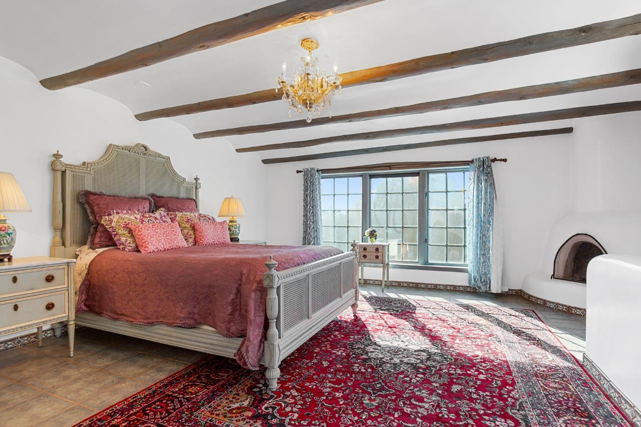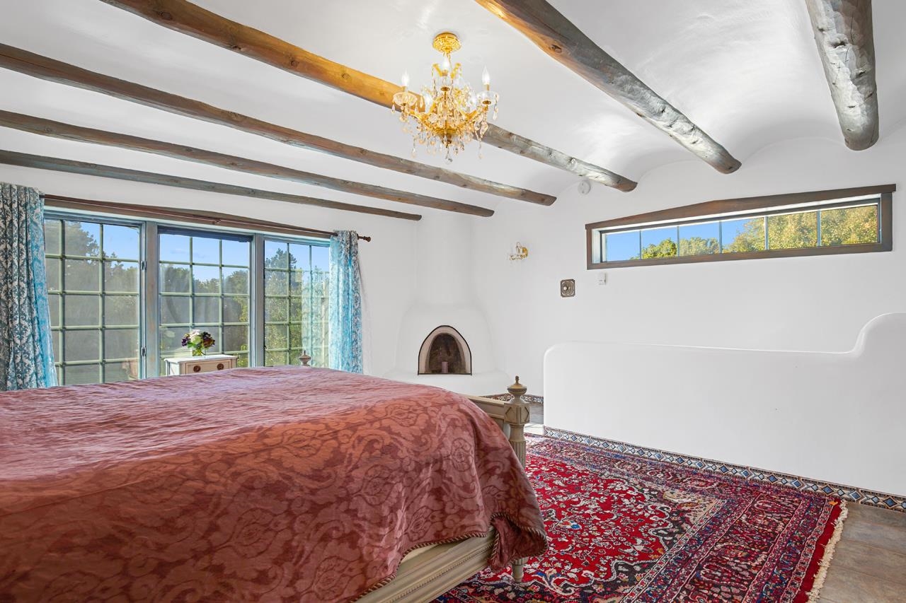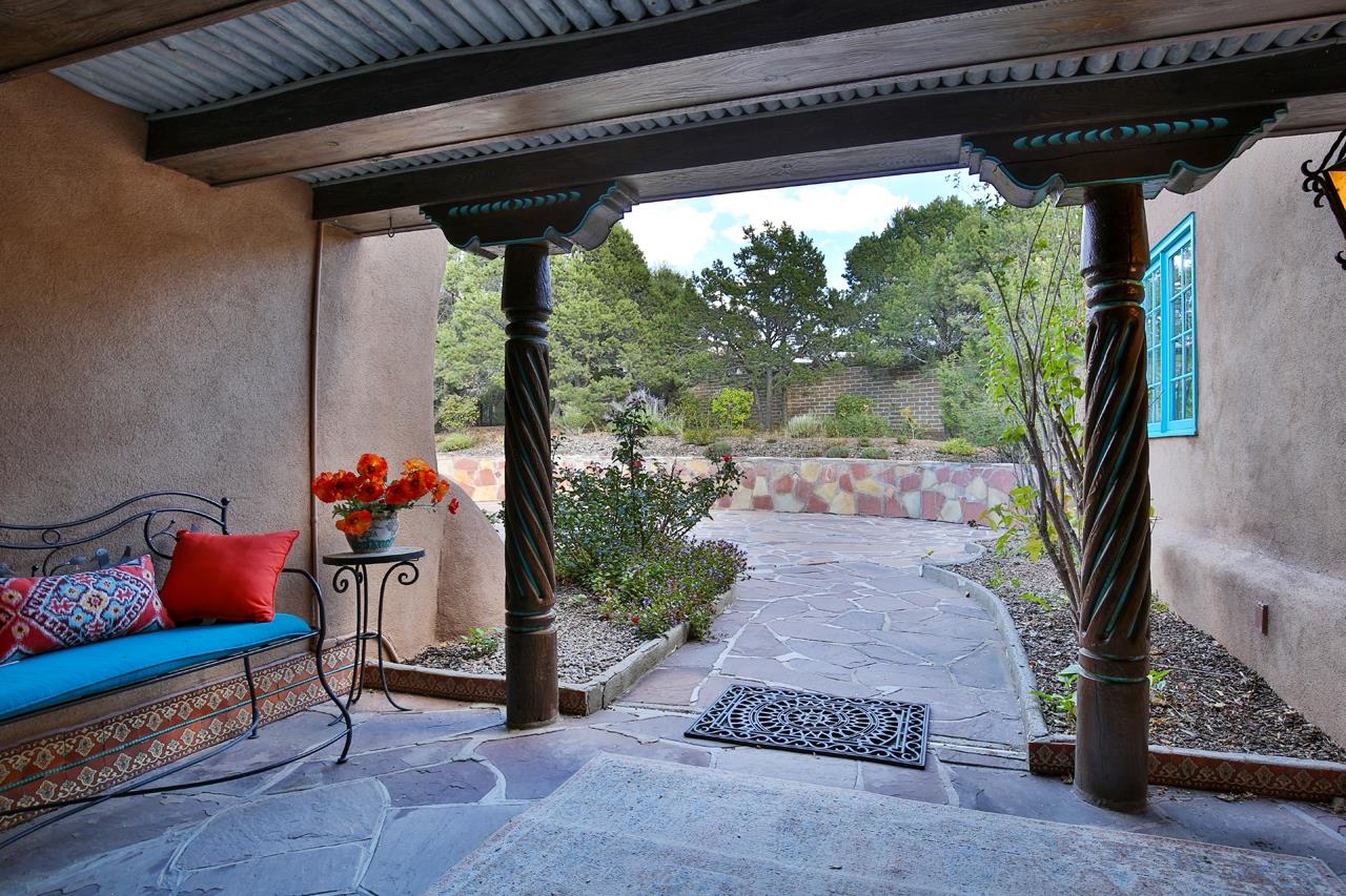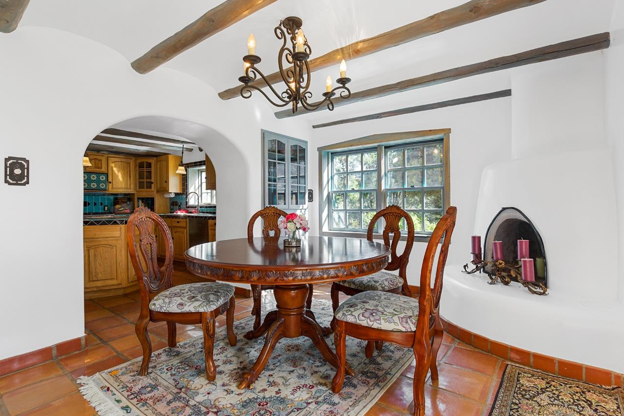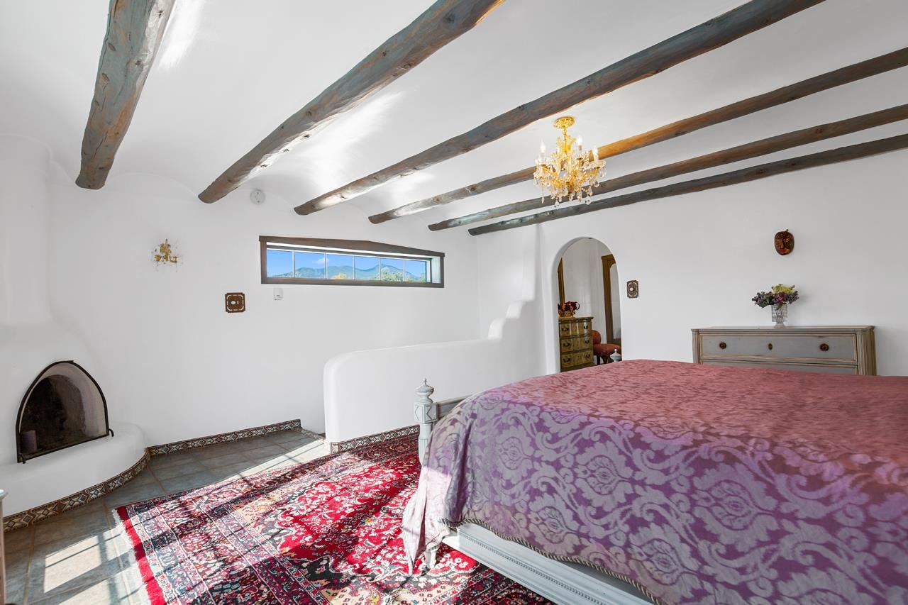 Set amidst the pinon- juniper woodland of the Canon foothills, this beautiful two story, 2400 sq ft, 3 bed and 2 bath adobe home exudes another era - a time when craftsmanship and care reigned supreme. Warm Saltillo tile, rounded plaster walls, large light-filled, mullioned windows, coved ceilings, one-of-a-kind, hand-carved doors in every room, 3 kiva style fireplaces, elaborate tilework throughout - all this just 5 minutes from Taos Plaza. Secluded behind a heavy wooden gates this 1 acre compound comes with a detached dance studio, a 1-car garage and flag stone walkways that lead to terraced gardens. Built in 1975, this lovely home has been lovingly maintained and updated and expanded over the years. Walking down past a giant wisteria, you pass beds of roses and native perennials and then you enter through those dramatic unforgettable front doors with the intaglio images of a Matachine dancer over the classic Zia sun (carved by Mark Romero). The bright foyer with coved vigas leads to living room centered around a fireplace with nichos and a long banco. The murals on this floor by Taos artist Linda Kimmons. The guest wing with two spacious bedrooms is past the living room. Head In the other direction to get to the well-appointed kitchen where ample oak cabinets are wrapped around a tile clad island that will be the hang out spot of the home. Beyond is the dining room with its own kiva style fireplace and French doors leading out to the west facing patio where you can entertain al fresco to those famous Taos sunsets and colorful skies. Up a couple of steps from the kitchen is a library with built in shelves and another way to slip out to the southside gardens. Up the stairs with the elaborately carved balustrade you arrive at the 580 sq ft primary suite with windows facing werst and giving you views of el Pedernal and the Jemez mountains. The spacious bedroom leads to a dressing area and then to a sumptuous bath centered around a jetted tub and separate shower with windows looking over the valley below. Detached from the house is mirror-walled dance studio with a sprung-oak floor where the owner offered flamenco classes and recitals. And attached to that is the single car garage with lots of storage in back. Come take a look at this one of a kind, jewelbox of a home that takes you away from a life of bland.