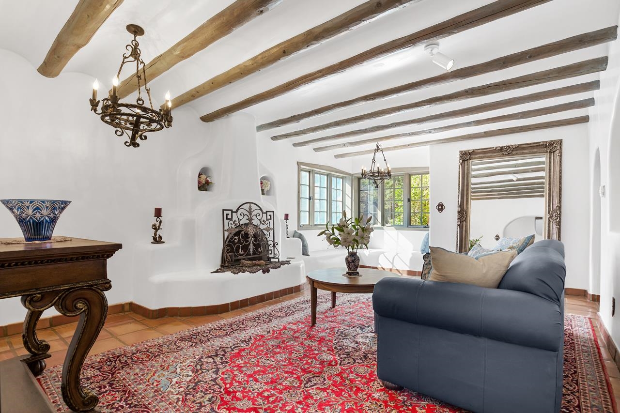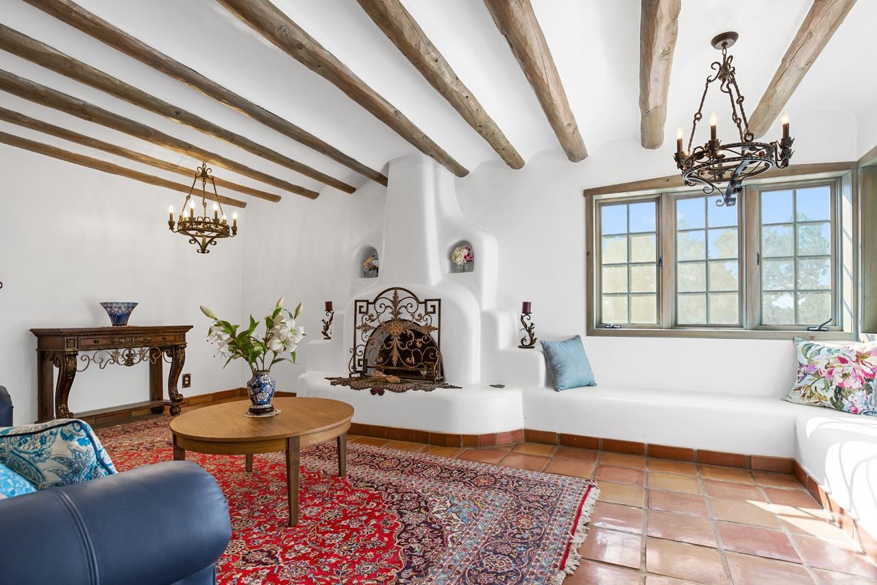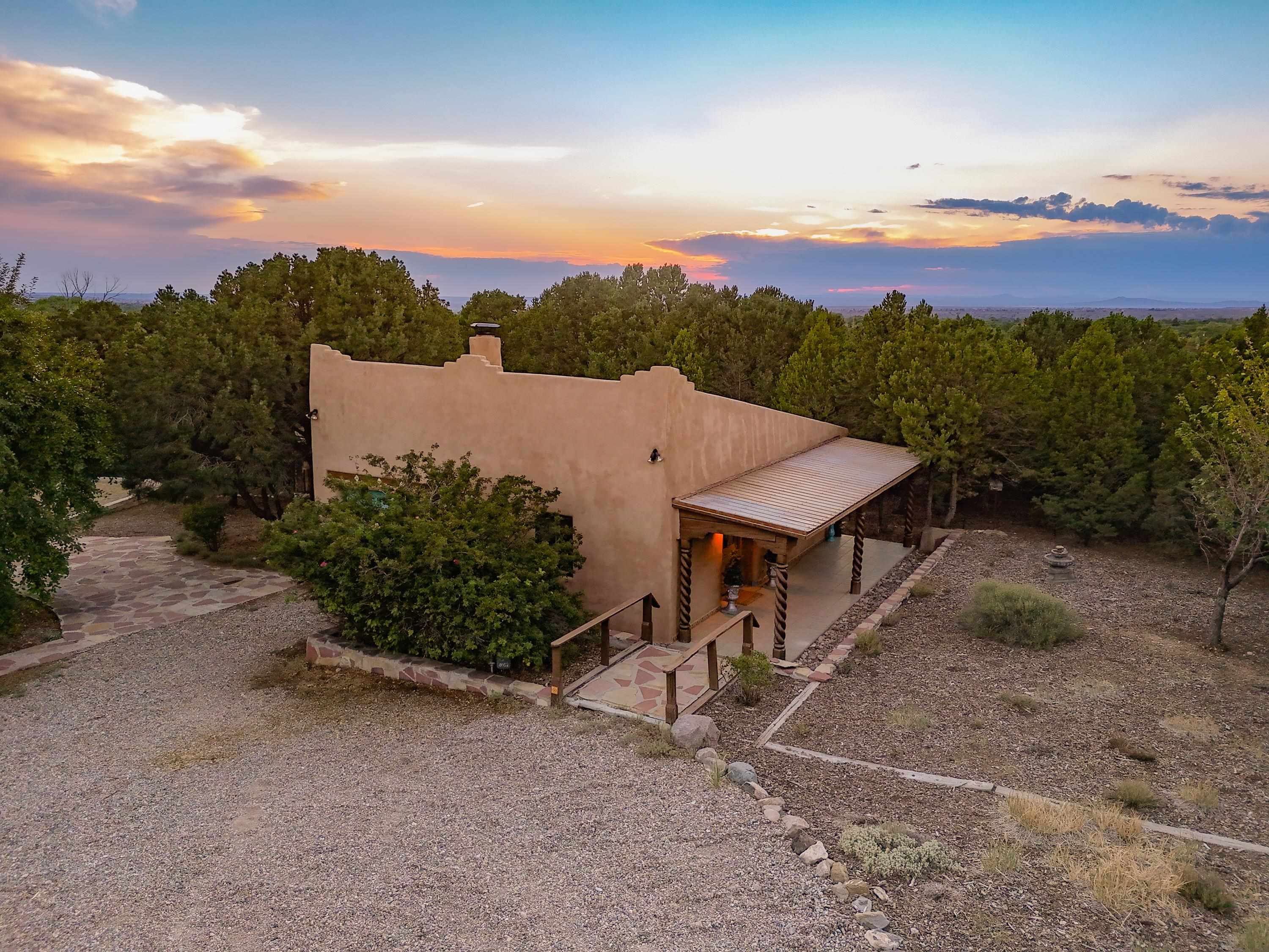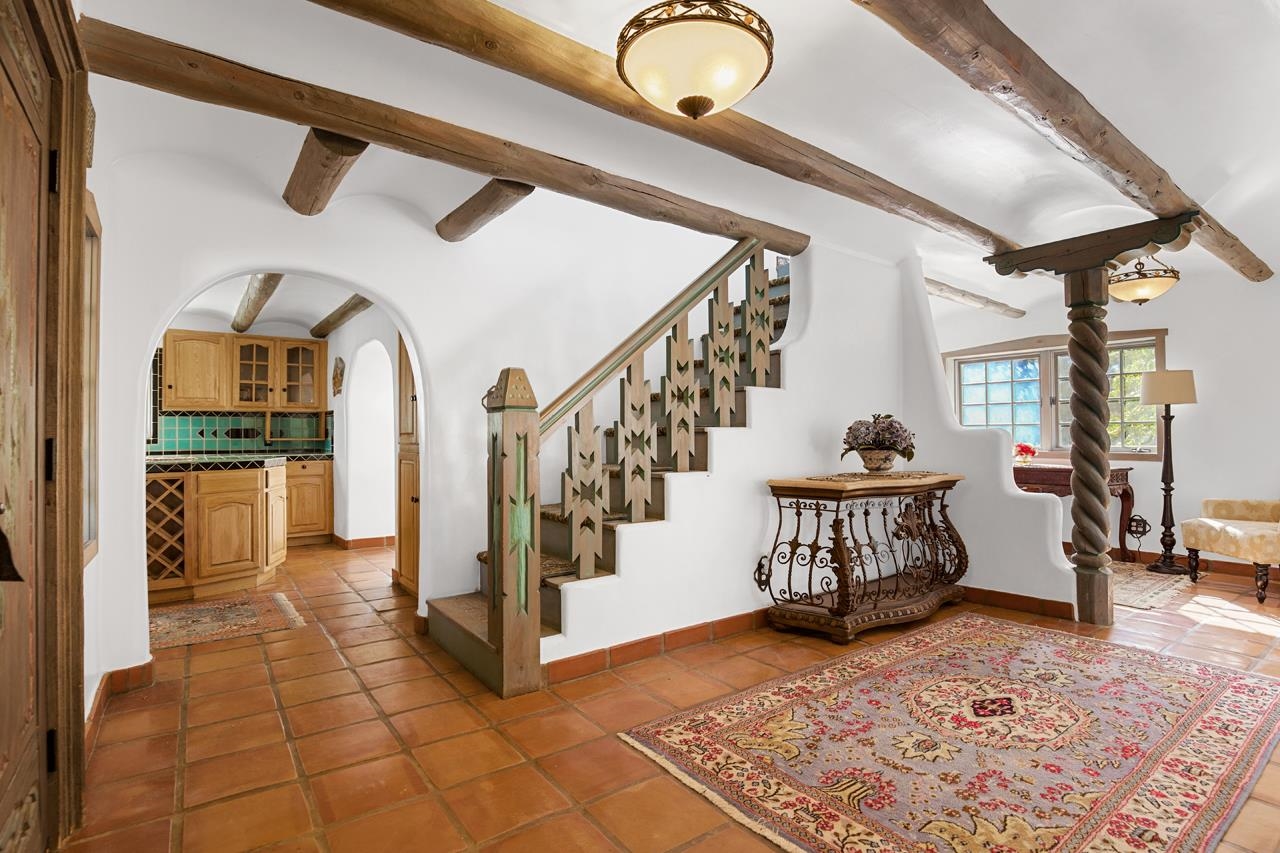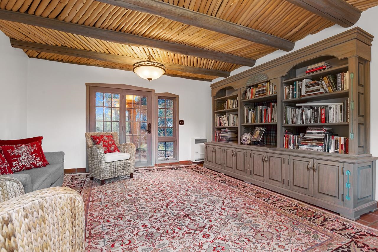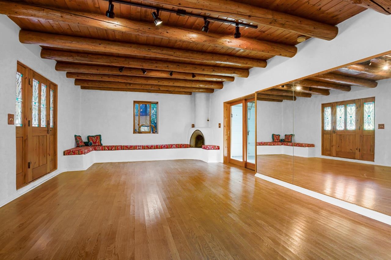 Set amidst the pinon- juniper woodland of the Canon foothills, this beautiful two story, 2400 sq ft, 3 bed and 2 bath adobe home exudes another era - a time when craftsmanship and care reigned supreme. Warm Saltillo tile, rounded plaster walls, large light-filled, mullioned windows, coved ceilings, one-of-a-kind, hand-carved doors in every room, 3 kiva style fireplaces, elaborate tilework throughout - all this just 5 minutes from Taos Plaza. Secluded behind a heavy wooden gates this 1 acre compound comes with a detached dance studio, a 1-car garage and flag stone walkways that lead to terraced gardens. Built in 1975, this lovely home has been lovingly maintained and updated and expanded over the years. Walking down past a giant wisteria, you pass beds of roses and native perennials and then you enter through those dramatic unforgettable front doors with the intaglio images of a Matachine dancer over the classic Zia sun (carved by Mark Romero). The bright foyer with coved vigas leads to living room centered around a fireplace with nichos and a long banco. The murals on this floor by Taos artist Linda Kimmons. The guest wing with two spacious bedrooms is past the living room. Head In the other direction to get to the well-appointed kitchen where ample oak cabinets are wrapped around a tile clad island that will be the hang out spot of the home. Beyond is the dining room with its own kiva style fireplace and French doors leading out to the west facing patio where you can entertain al fresco to those famous Taos sunsets and colorful skies. Up a couple of steps from the kitchen is a library with built in shelves and another way to slip out to the southside gardens. Up the stairs with the elaborately carved balustrade you arrive at the 580 sq ft primary suite with windows facing werst and giving you views of el Pedernal and the Jemez mountains. The spacious bedroom leads to a dressing area and then to a sumptuous bath centered around a jetted tub and separate shower with windows looking over the valley below. Detached from the house is mirror-walled dance studio with a sprung-oak floor where the owner offered flamenco classes and recitals. And attached to that is the single car garage with lots of storage in back. Come take a look at this one of a kind, jewelbox of a home that takes you away from a life of bland.