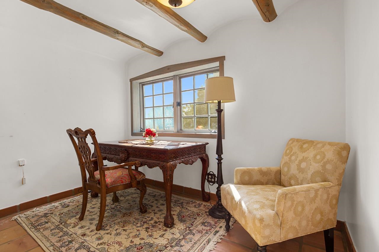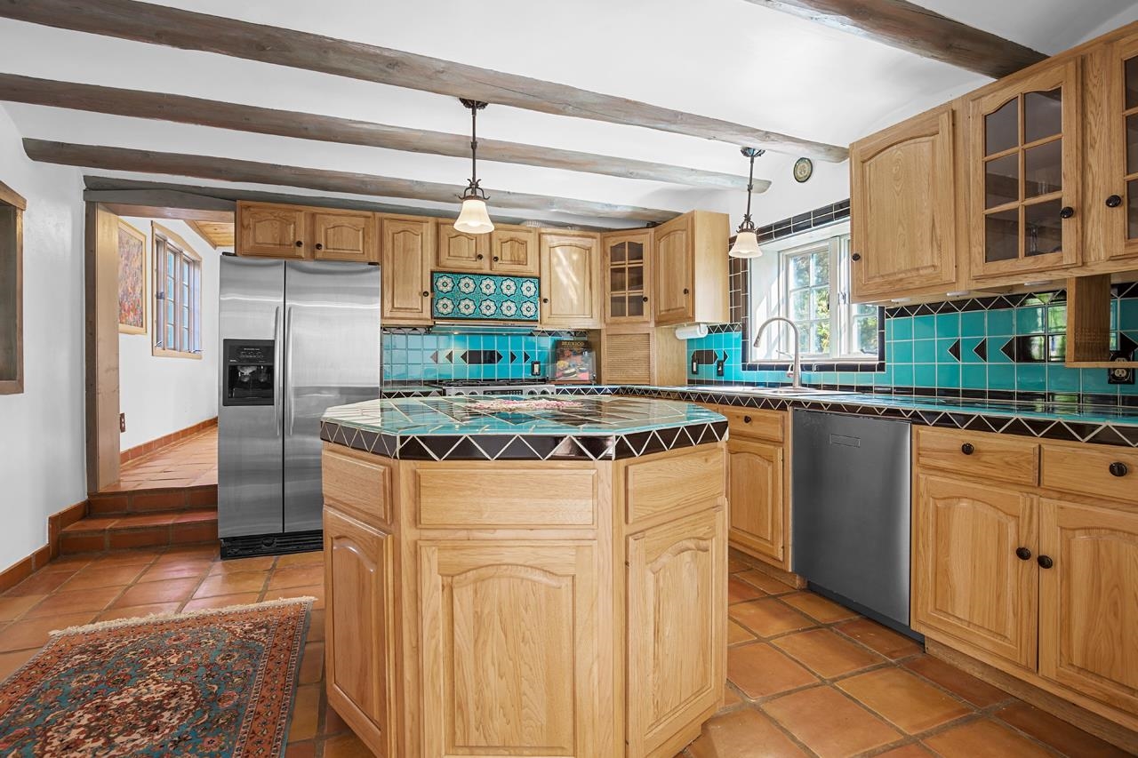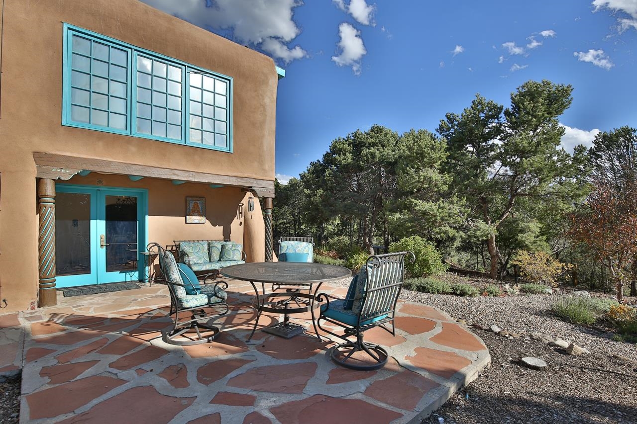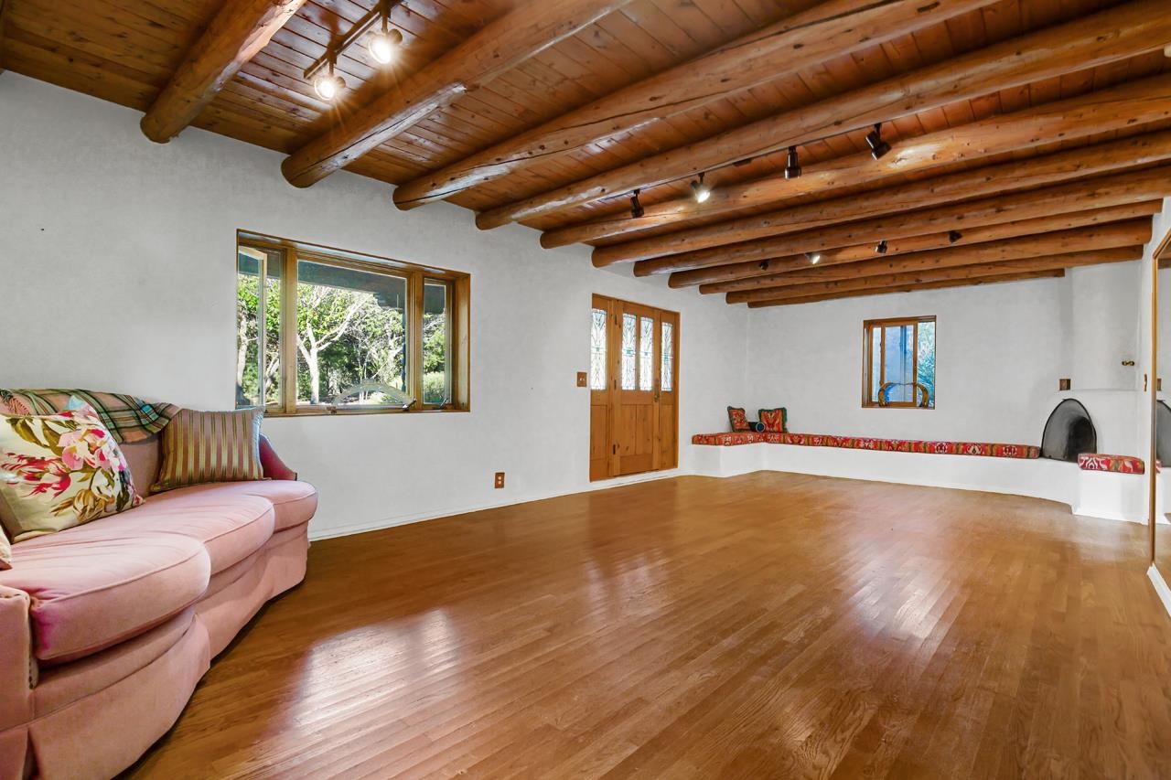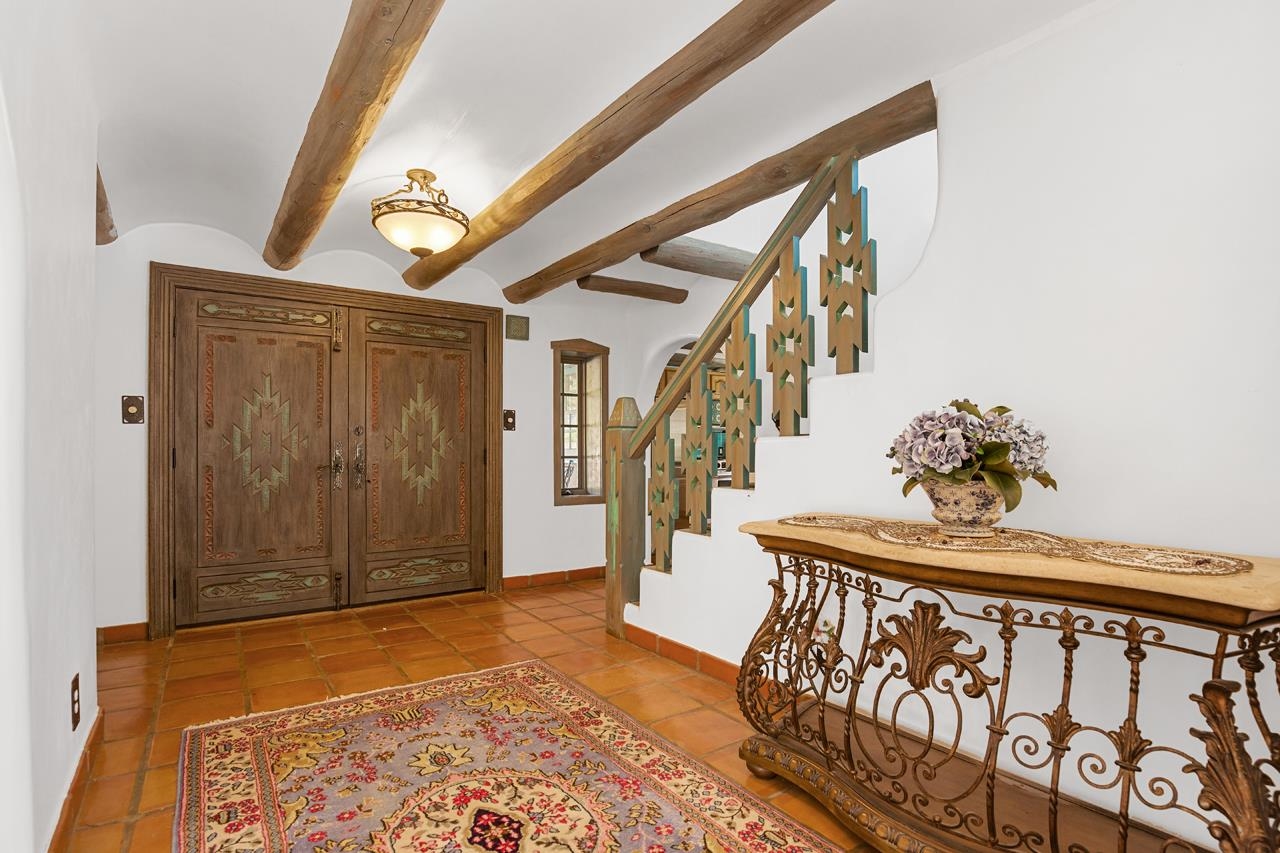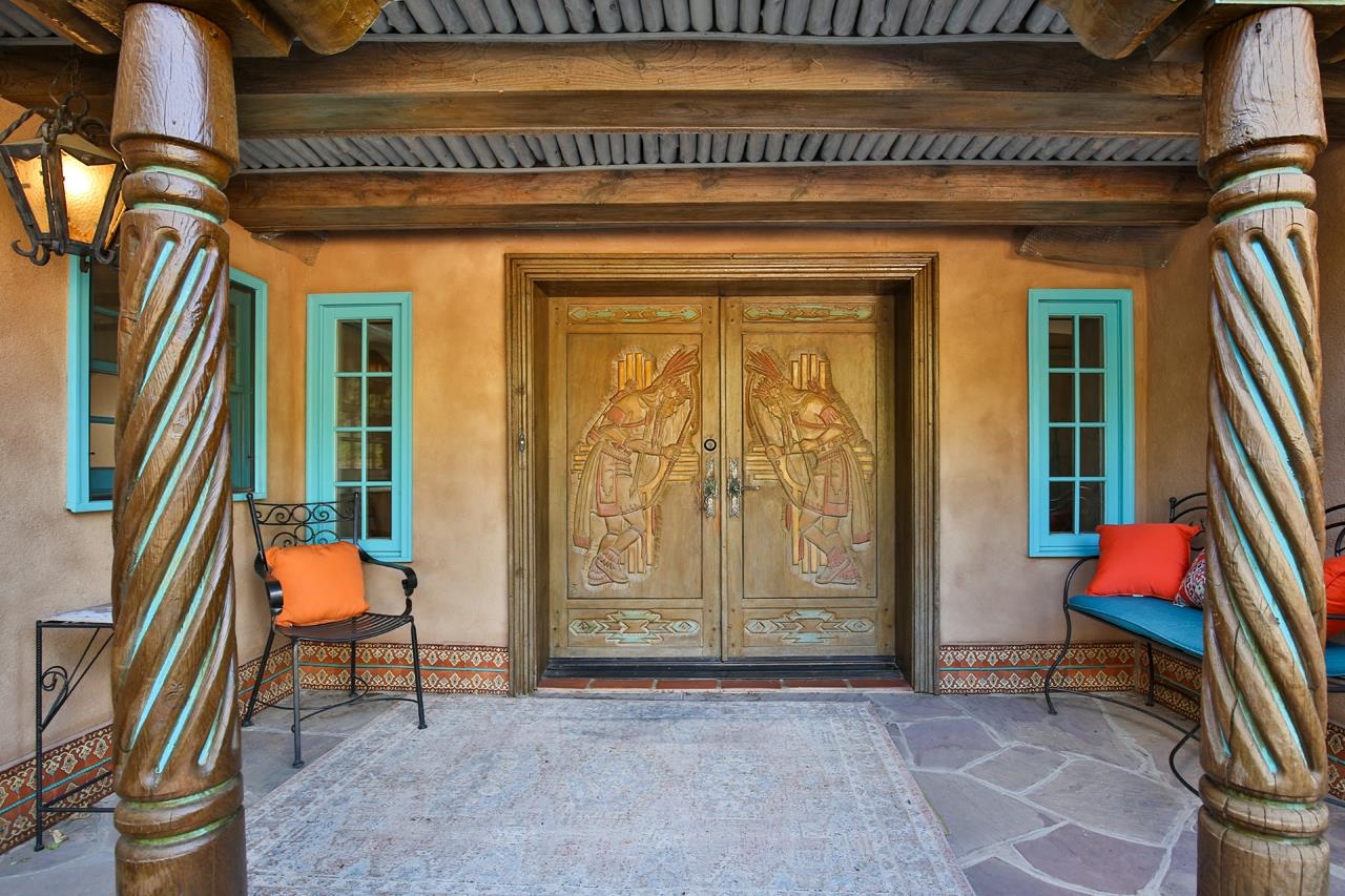Set amidst the pinon- juniper woodland of the Canon foothills, this beautiful two story, 2400 sq ft, 3 bed and 2 bath adobe home exudes another era - a time when craftsmanship and care reigned supreme. Warm Saltillo tile, rounded plaster walls, large light-filled, mullioned windows, coved ceilings, one-of-a-kind, hand-carved doors in every room, 3 kiva style fireplaces, elaborate tilework throughout - all this just 5 minutes from Taos Plaza. Secluded behind a heavy wooden gates this 1 acre compound comes with a detached dance studio, a 1-car garage and flag stone walkways that lead to terraced gardens. Built in 1975, this lovely home has been lovingly maintained and updated and expanded over the years. Walking down past a giant wisteria, you pass beds of roses and native perennials and then you enter through those dramatic unforgettable front doors with the intaglio images of a Matachine dancer over the classic Zia sun (carved by Mark Romero). The bright foyer with coved vigas leads to living room centered around a fireplace with nichos and a long banco. The murals on this floor by Taos artist Linda Kimmons. The guest wing with two spacious bedrooms is past the living room. Head In the other direction to get to the well-appointed kitchen where ample oak cabinets are wrapped around a tile clad island that will be the hang out spot of the home. Beyond is the dining room with its own kiva style fireplace and French doors leading out to the west facing patio where you can entertain al fresco to those famous Taos sunsets and colorful skies. Up a couple of steps from the kitchen is a library with built in shelves and another way to slip out to the southside gardens. Up the stairs with the elaborately carved balustrade you arrive at the 580 sq ft primary suite with windows facing werst and giving you views of el Pedernal and the Jemez mountains. The spacious bedroom leads to a dressing area and then to a sumptuous bath centered around a jetted tub and separate shower with windows looking over the valley below. Detached from the house is mirror-walled dance studio with a sprung-oak floor where the owner offered flamenco classes and recitals. And attached to that is the single car garage with lots of storage in back. Come take a look at this one of a kind, jewelbox of a home that takes you away from a life of bland.