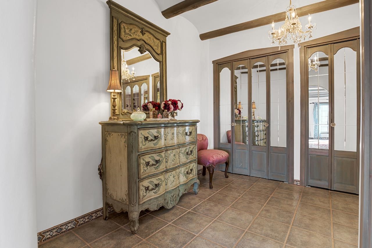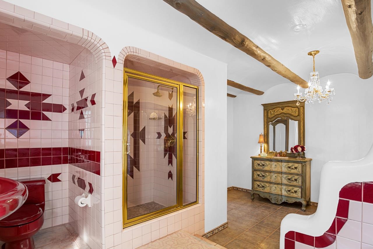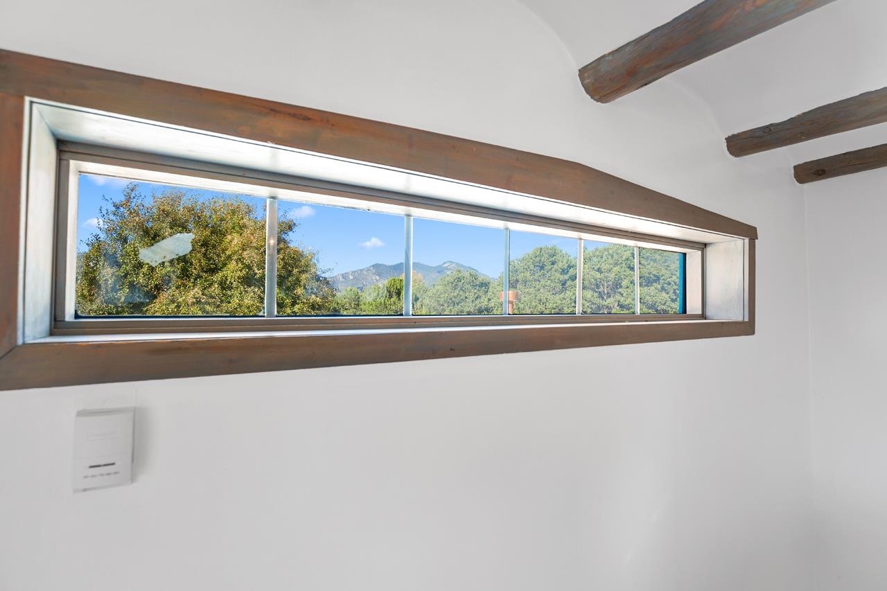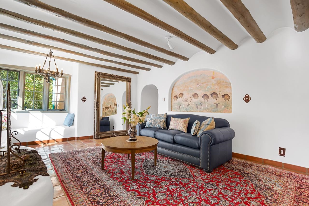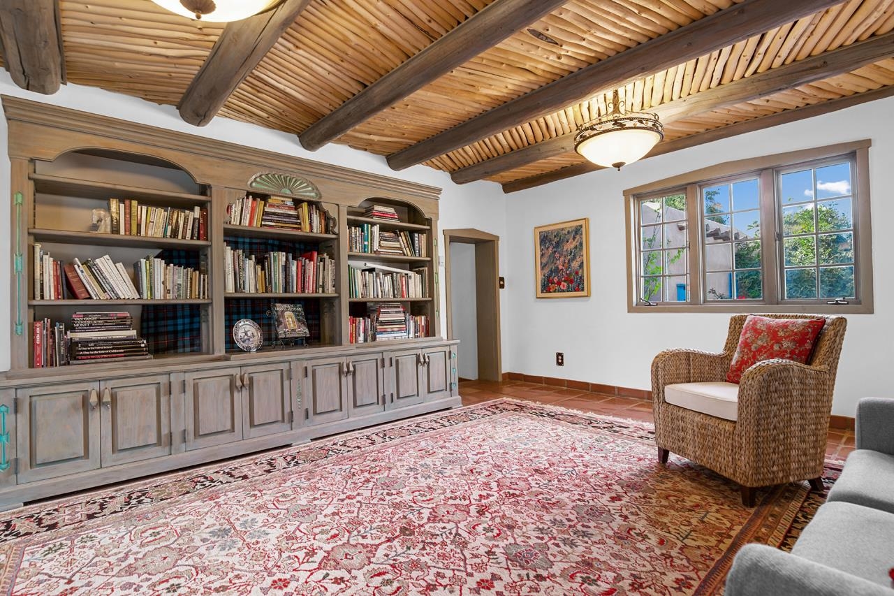 Set amidst the pinon- juniper woodland of the Canon foothills, this beautiful two story, 2400 sq ft, 3 bed and 2 bath adobe home exudes another era - a time when craftsmanship and care reigned supreme. Warm Saltillo tile, rounded plaster walls, large light-filled, mullioned windows, coved ceilings, one-of-a-kind, hand-carved doors in every room, 3 kiva style fireplaces, elaborate tilework throughout - all this just 5 minutes from Taos Plaza. Secluded behind a heavy wooden gates this 1 acre compound comes with a detached dance studio, a 1-car garage and flag stone walkways that lead to terraced gardens. Built in 1975, this lovely home has been lovingly maintained and updated and expanded over the years. Walking down past a giant wisteria, you pass beds of roses and native perennials and then you enter through those dramatic unforgettable front doors with the intaglio images of a Matachine dancer over the classic Zia sun (carved by Mark Romero). The bright foyer with coved vigas leads to living room centered around a fireplace with nichos and a long banco. The murals on this floor by Taos artist Linda Kimmons. The guest wing with two spacious bedrooms is past the living room. Head In the other direction to get to the well-appointed kitchen where ample oak cabinets are wrapped around a tile clad island that will be the hang out spot of the home. Beyond is the dining room with its own kiva style fireplace and French doors leading out to the west facing patio where you can entertain al fresco to those famous Taos sunsets and colorful skies. Up a couple of steps from the kitchen is a library with built in shelves and another way to slip out to the southside gardens. Up the stairs with the elaborately carved balustrade you arrive at the 580 sq ft primary suite with windows facing werst and giving you views of el Pedernal and the Jemez mountains. The spacious bedroom leads to a dressing area and then to a sumptuous bath centered around a jetted tub and separate shower with windows looking over the valley below. Detached from the house is mirror-walled dance studio with a sprung-oak floor where the owner offered flamenco classes and recitals. And attached to that is the single car garage with lots of storage in back. Come take a look at this one of a kind, jewelbox of a home that takes you away from a life of bland.