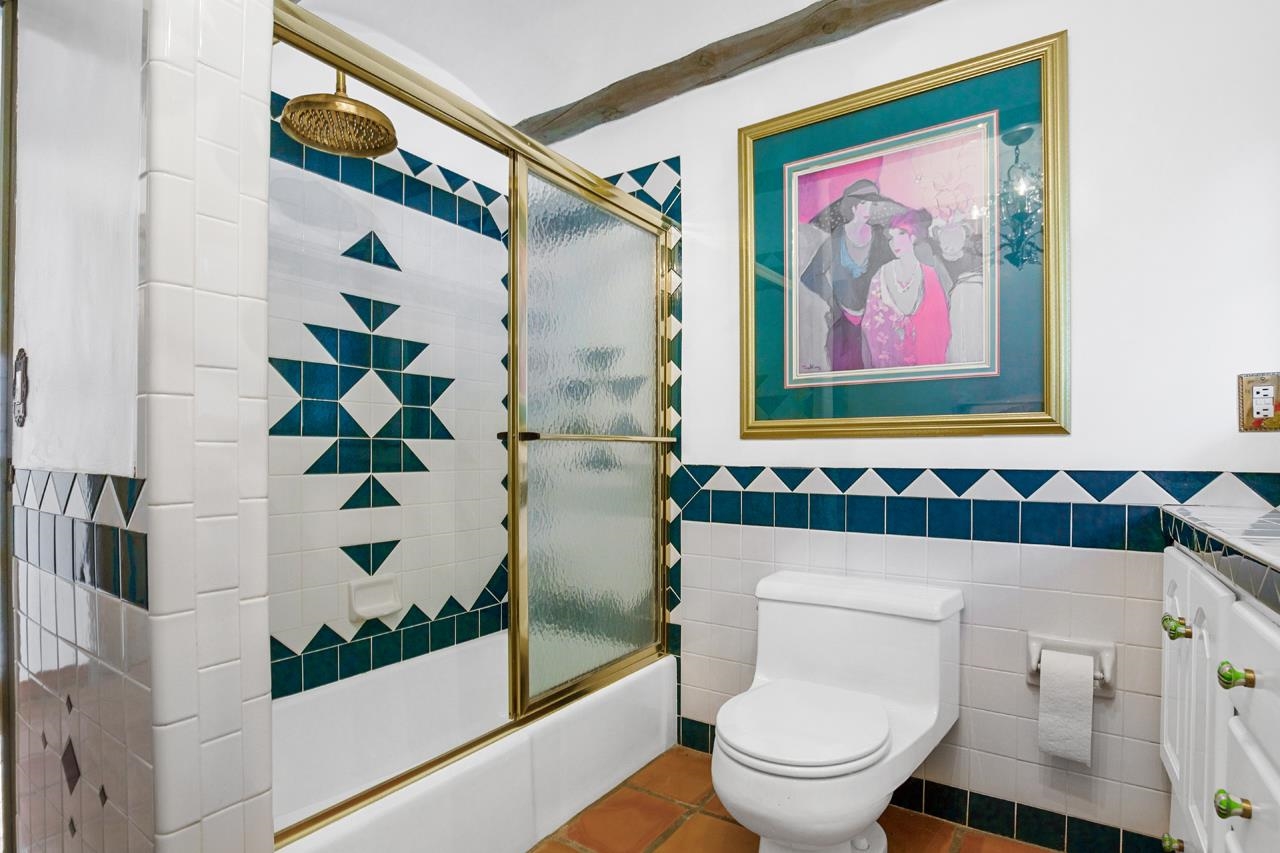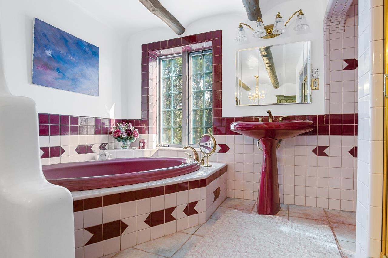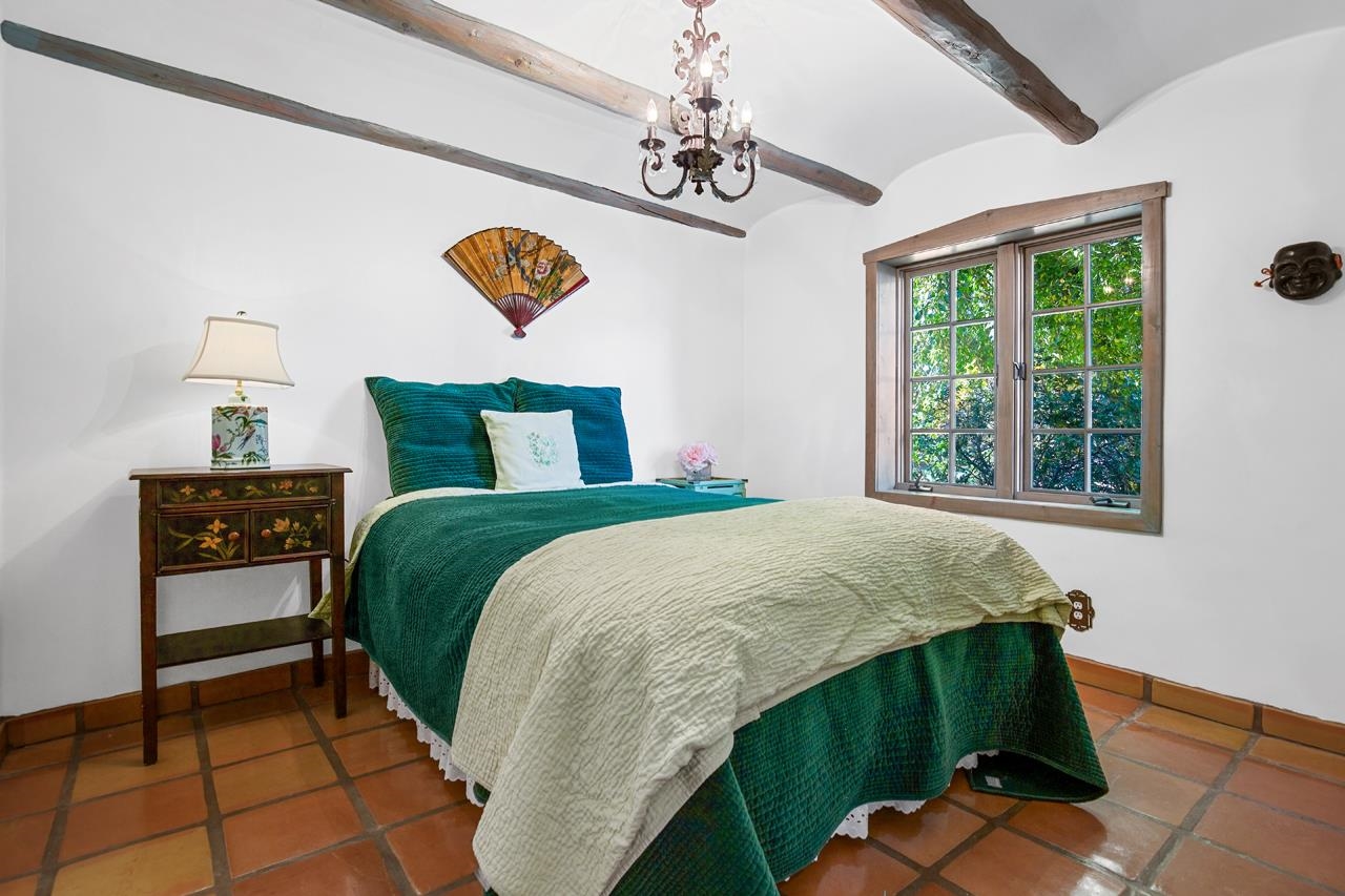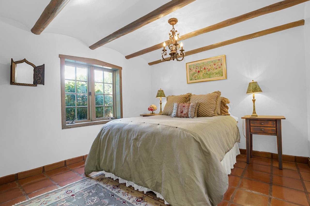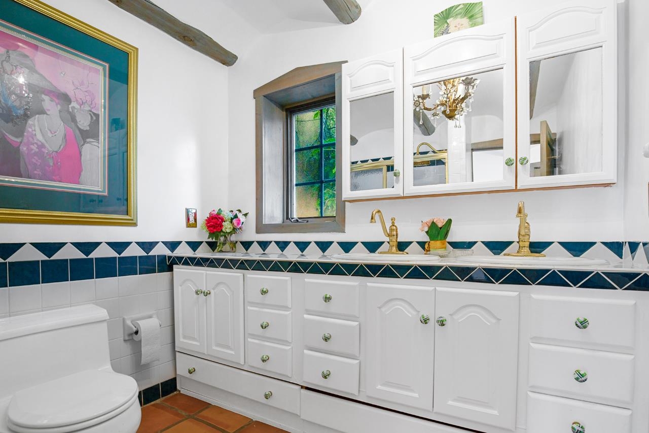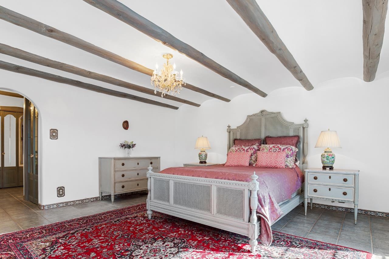 Set amidst the pinon- juniper woodland of the Canon foothills, this beautiful two story, 2400 sq ft, 3 bed and 2 bath adobe home exudes another era - a time when craftsmanship and care reigned supreme. Warm Saltillo tile, rounded plaster walls, large light-filled, mullioned windows, coved ceilings, one-of-a-kind, hand-carved doors in every room, 3 kiva style fireplaces, elaborate tilework throughout - all this just 5 minutes from Taos Plaza. Secluded behind a heavy wooden gates this 1 acre compound comes with a detached dance studio, a 1-car garage and flag stone walkways that lead to terraced gardens. Built in 1975, this lovely home has been lovingly maintained and updated and expanded over the years. Walking down past a giant wisteria, you pass beds of roses and native perennials and then you enter through those dramatic unforgettable front doors with the intaglio images of a Matachine dancer over the classic Zia sun (carved by Mark Romero). The bright foyer with coved vigas leads to living room centered around a fireplace with nichos and a long banco. The murals on this floor by Taos artist Linda Kimmons. The guest wing with two spacious bedrooms is past the living room. Head In the other direction to get to the well-appointed kitchen where ample oak cabinets are wrapped around a tile clad island that will be the hang out spot of the home. Beyond is the dining room with its own kiva style fireplace and French doors leading out to the west facing patio where you can entertain al fresco to those famous Taos sunsets and colorful skies. Up a couple of steps from the kitchen is a library with built in shelves and another way to slip out to the southside gardens. Up the stairs with the elaborately carved balustrade you arrive at the 580 sq ft primary suite with windows facing werst and giving you views of el Pedernal and the Jemez mountains. The spacious bedroom leads to a dressing area and then to a sumptuous bath centered around a jetted tub and separate shower with windows looking over the valley below. Detached from the house is mirror-walled dance studio with a sprung-oak floor where the owner offered flamenco classes and recitals. And attached to that is the single car garage with lots of storage in back. Come take a look at this one of a kind, jewelbox of a home that takes you away from a life of bland.