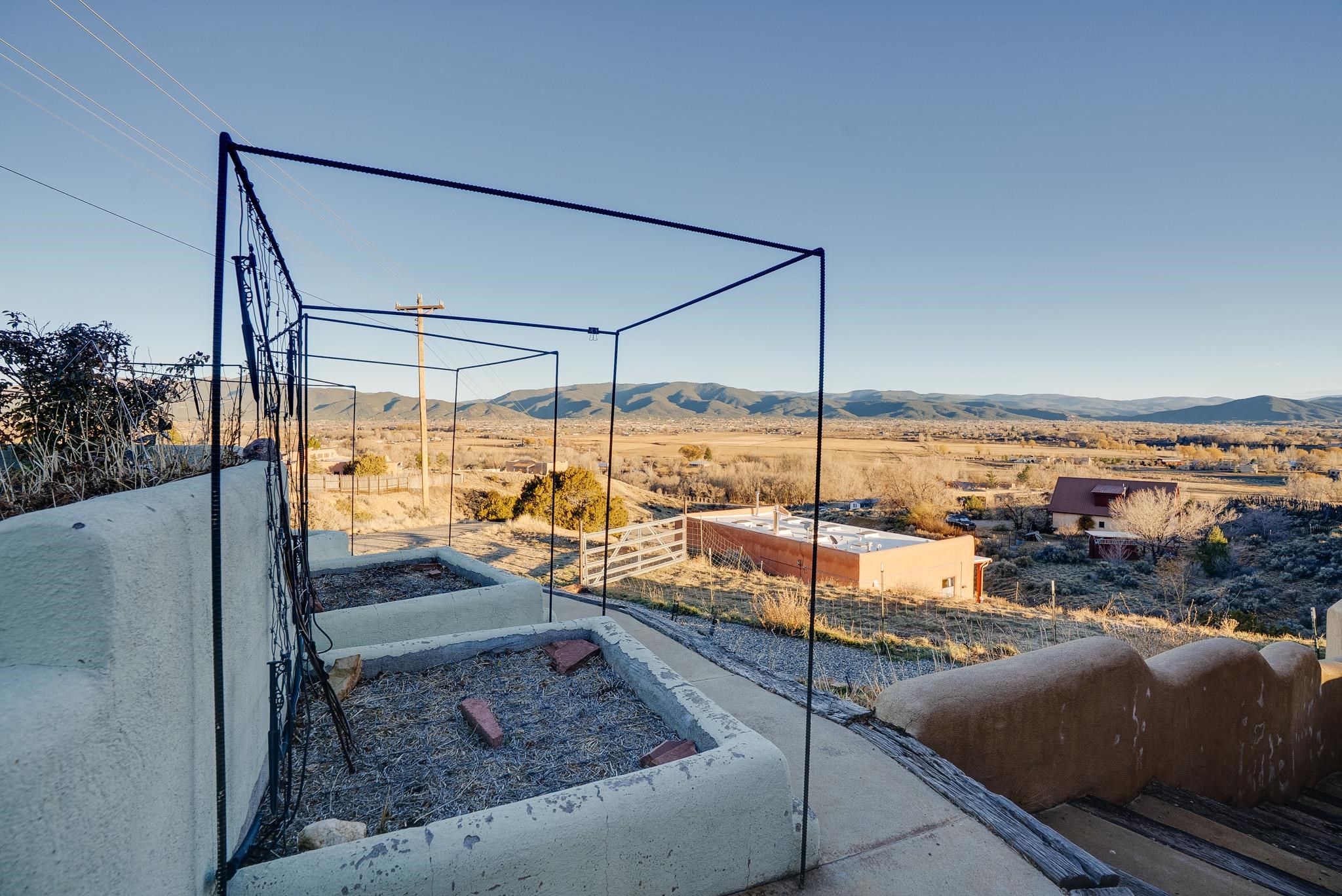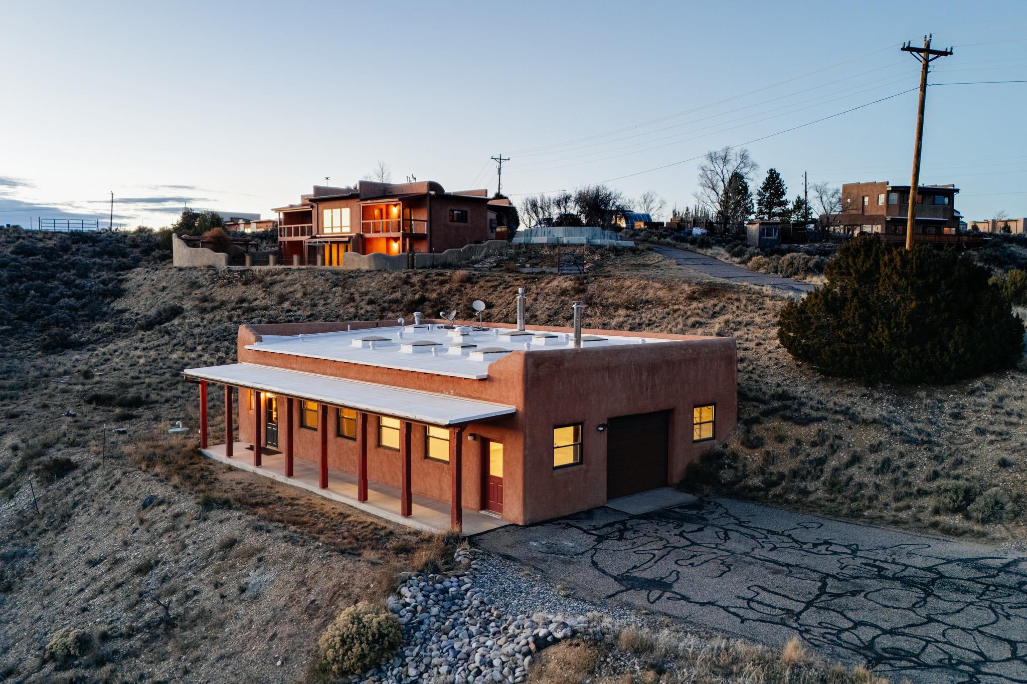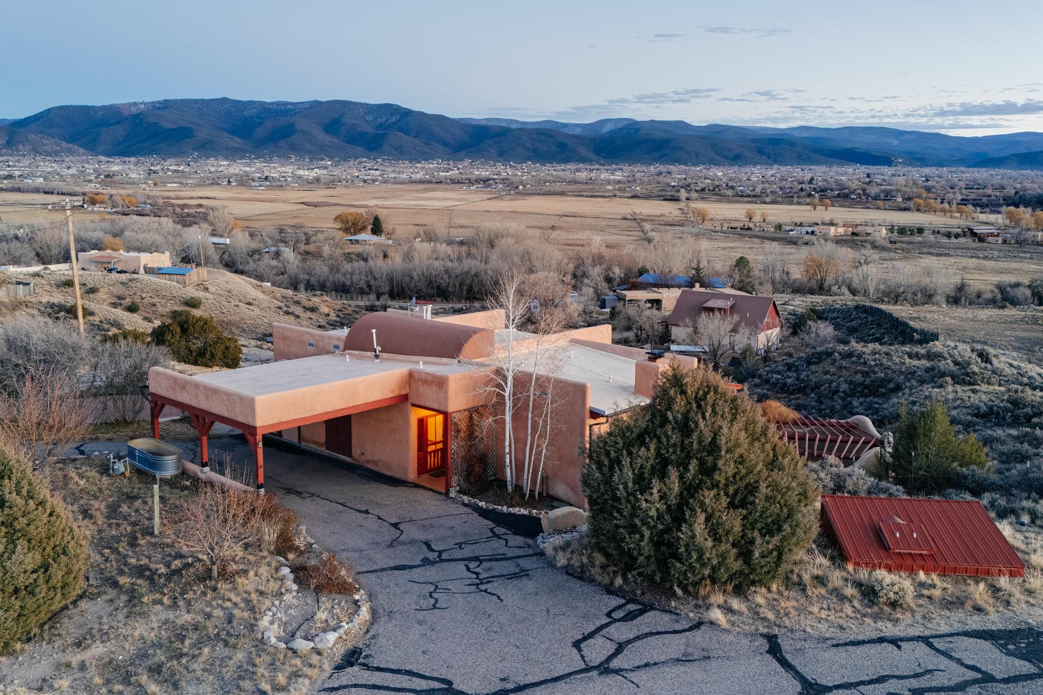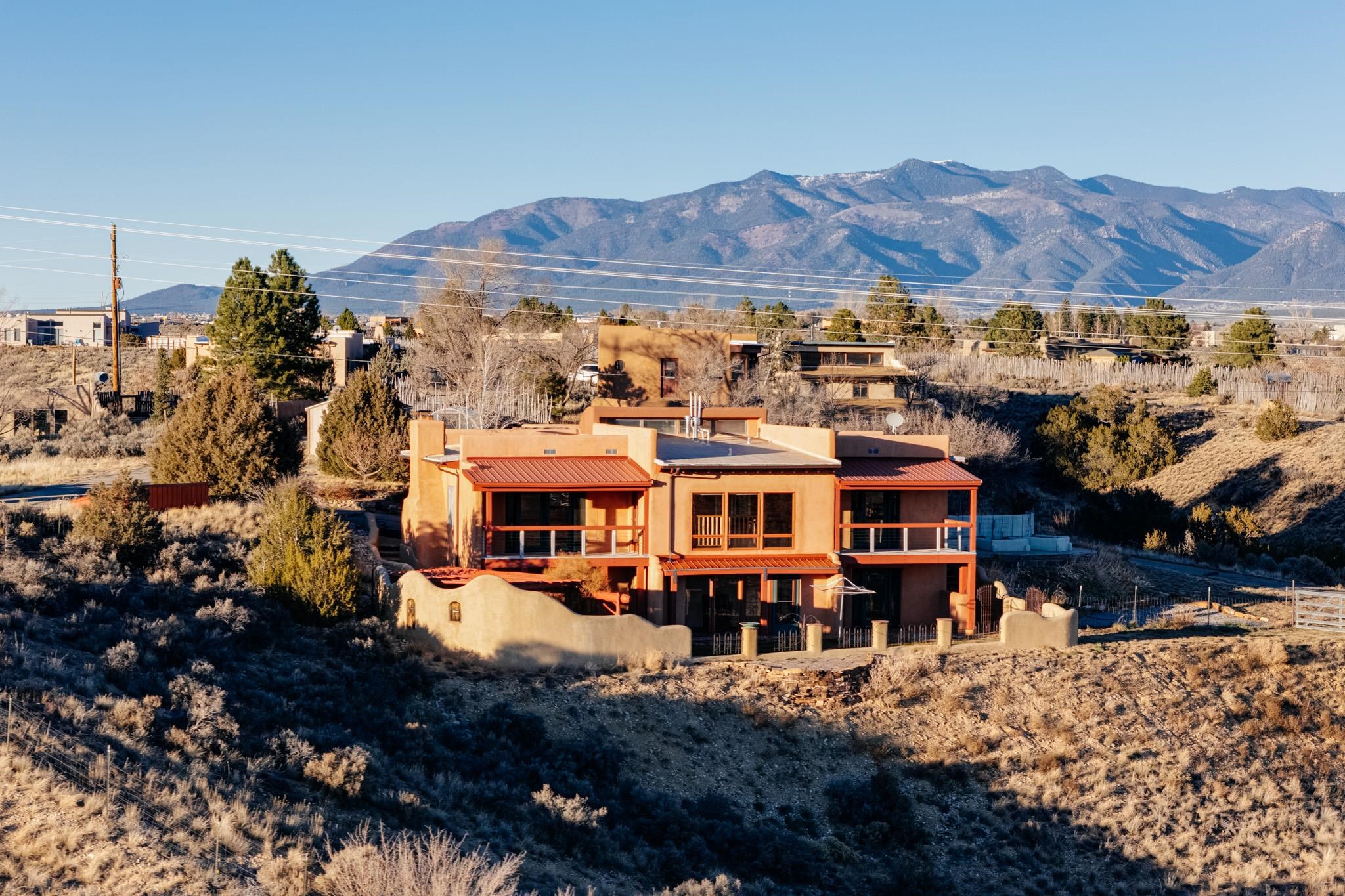 Views, Location, and Space, this property has it all! Perched on 1.67 acres along a ridge top, 9 Cerro Ventoso offers sweeping panoramas of the Taos Valley and the Sangre de Cristo Mountains, along with beautifully maintained living spaces and exceptional versatility. The main home spans two levels with 3 bedrooms, 2 bathrooms, and 2,228 sq ft of heated living space. Large window walls in the dining area frame ever-changing mountain views, creating a stunning backdrop for every meal. The living room features a cozy wood-burning fireplace with a custom heatilator for added warmth and efficiency. Thoughtful craftsmanship is found throughout, including hand-forged iron hardware, gates, and artistic details. Two spacious balconies capture the landscape from above, while the lower level opens directly onto a lush green lawn. A charming pergola provides the perfect space for sunset gatherings, alfresco dining, or peaceful sunrise coffee. A short walk down the paved driveway leads to the workshop and guest apartment. The 819 sq ft workshop is a dream for creatives or hobbyists, equipped with a wood stove, gas heat, two 220 outlets, an industrial exhaust fan, built-in racks, an electric door, and near-soundproof walls. Attached, yet with its own private entrance, is the 849 sq. ft. apartment, offering a full kitchen, bathroom, and two large rooms (each with generous closets). Its industrial aesthetic reflects its origins as part of the workshop, making it an ideal rental, studio, or guest space. Utilities include natural gas to the main home, with propane serving the workshop and apartment. The property is on a shared well with 10 Cerro Ventoso and features two 2,500-gallon cisterns for water catchment, used to irrigate the lawn, plants, and landscaping. Priced well below a recent appraisal, this property is an exceptional value. Schedule a showing to experience the views and versatility of 9 Cerro Ventoso in person.